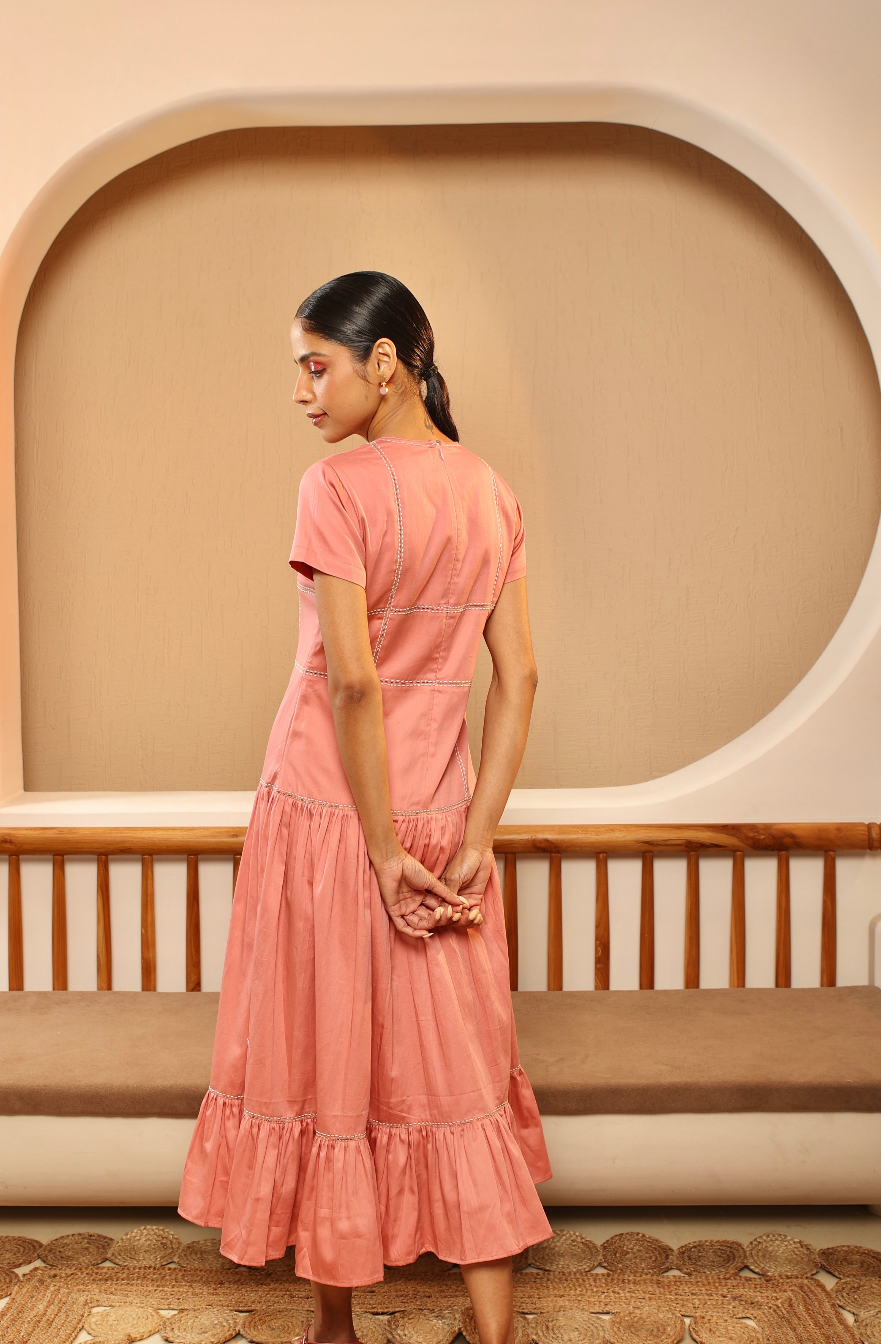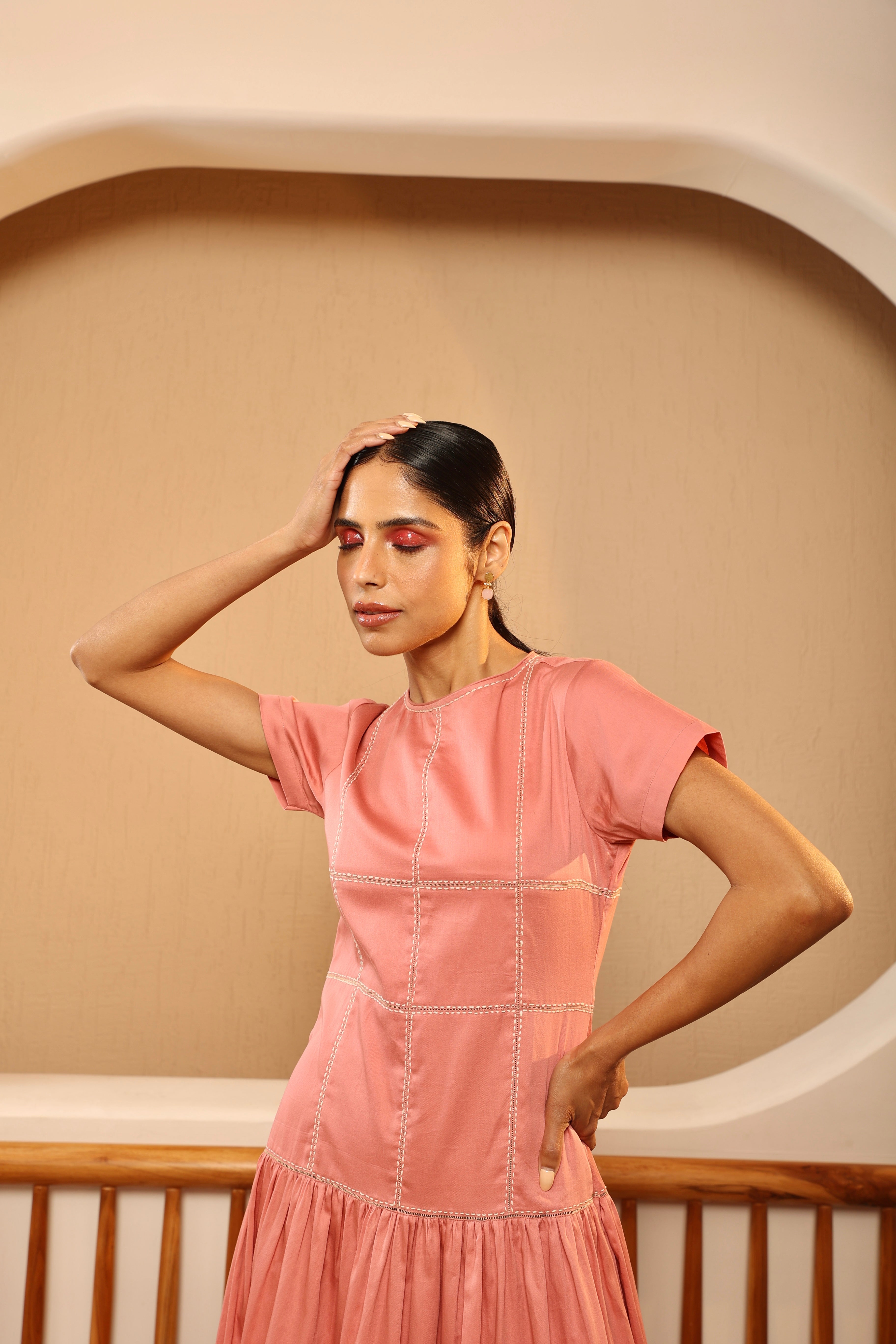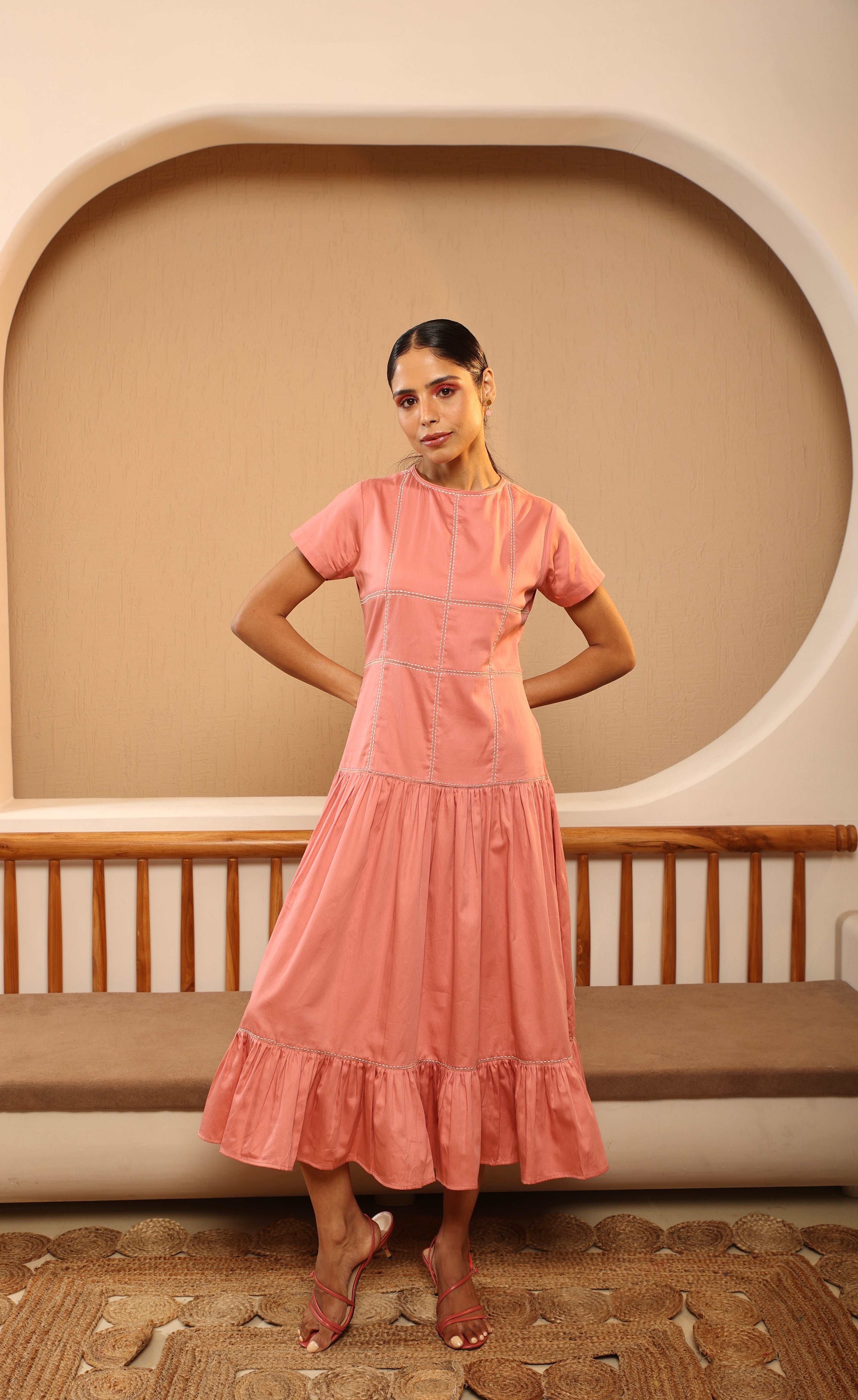 The Blush Dash Embroidered Midi features short sleeves and a round neckline. The dress has a straight fitted bodice with machine embroidered seam details, and a gathered skirt with a ruffle hem. It is further embellished with hand embroidery to highlight the seam details. It has a relaxed fit that flares out from the waist, creating a graceful and flowing silhouette. The fabric is medium-weight and butter soft on the skin. It features a back zipper. Perfect for Sunday brunch!