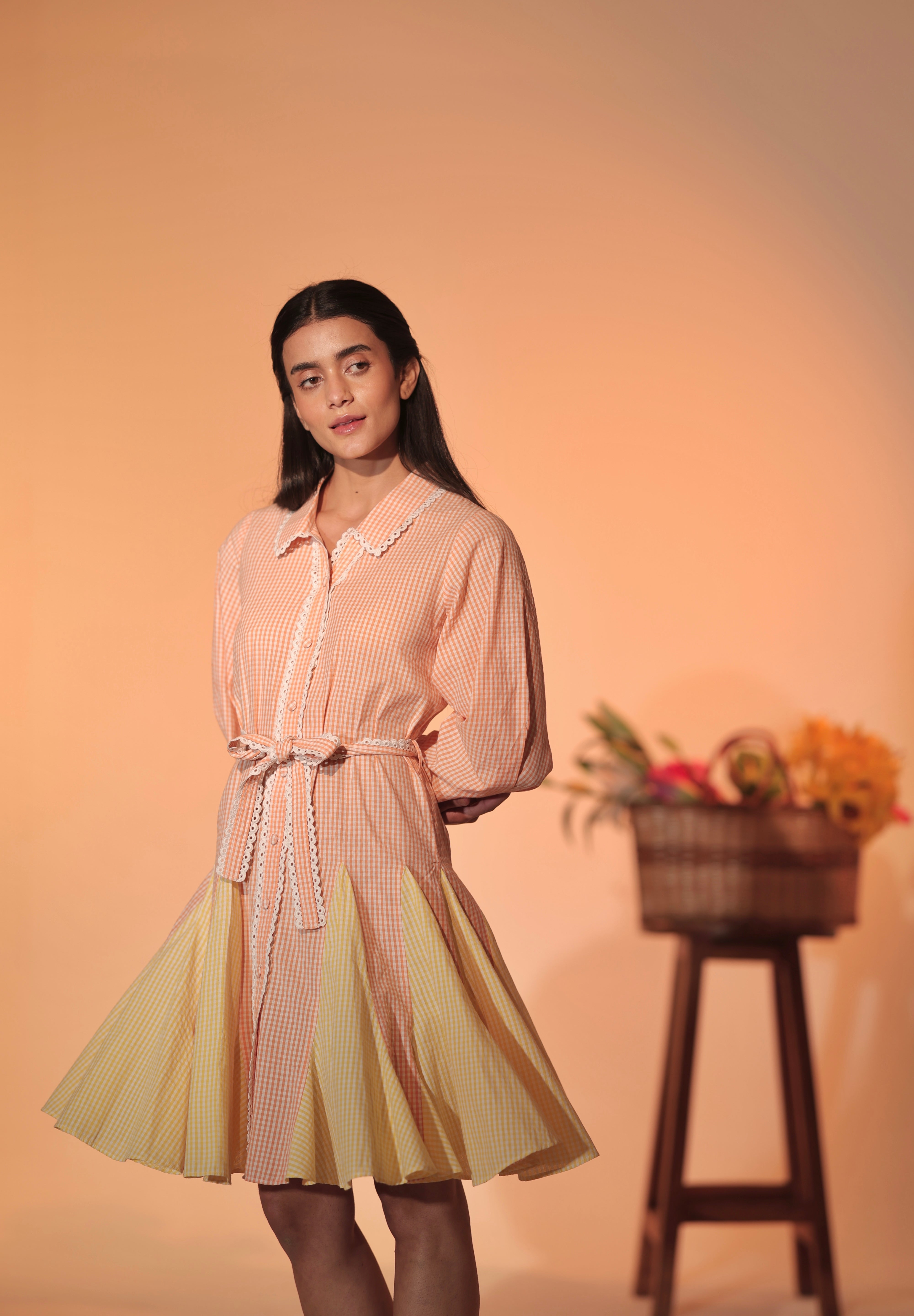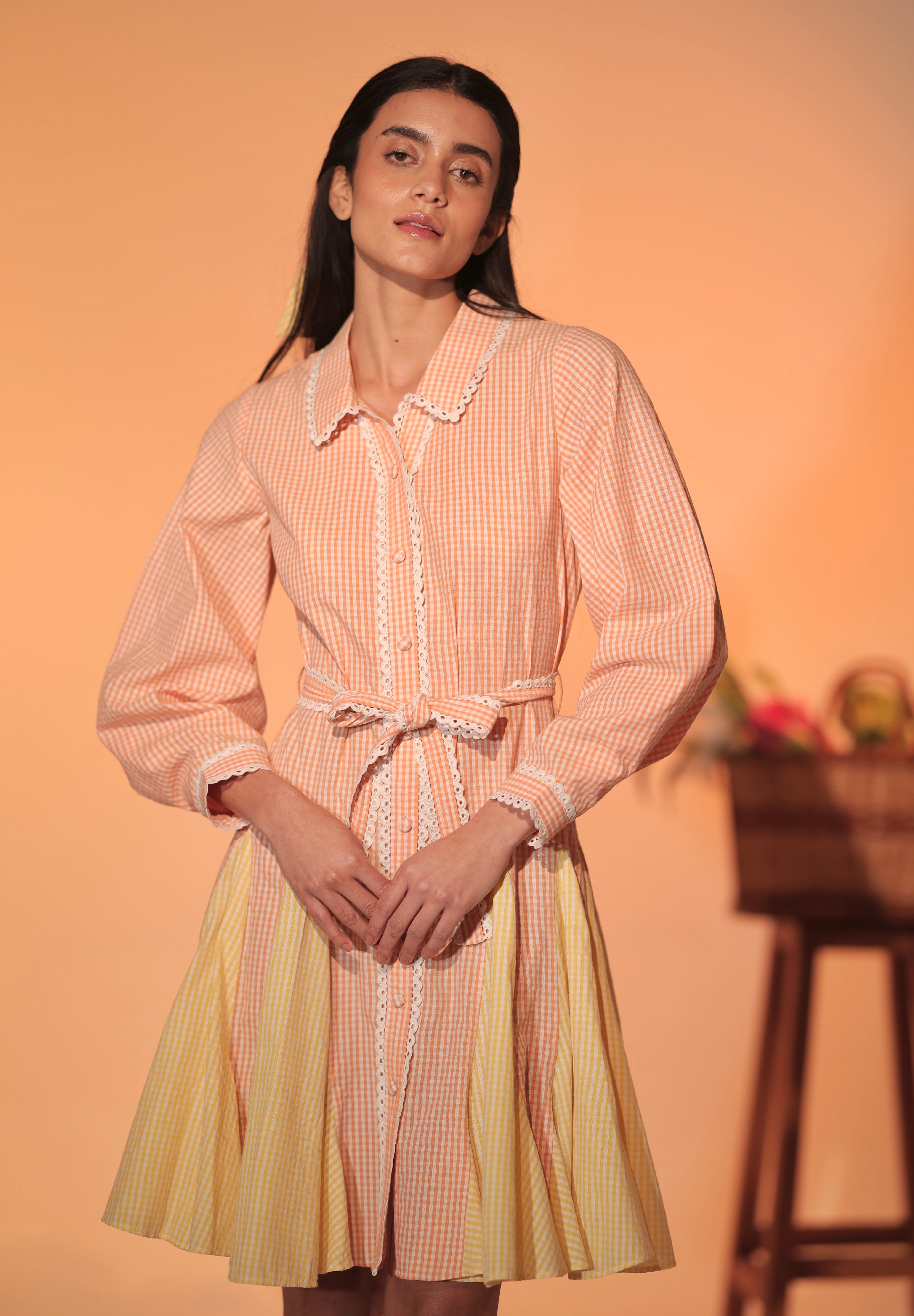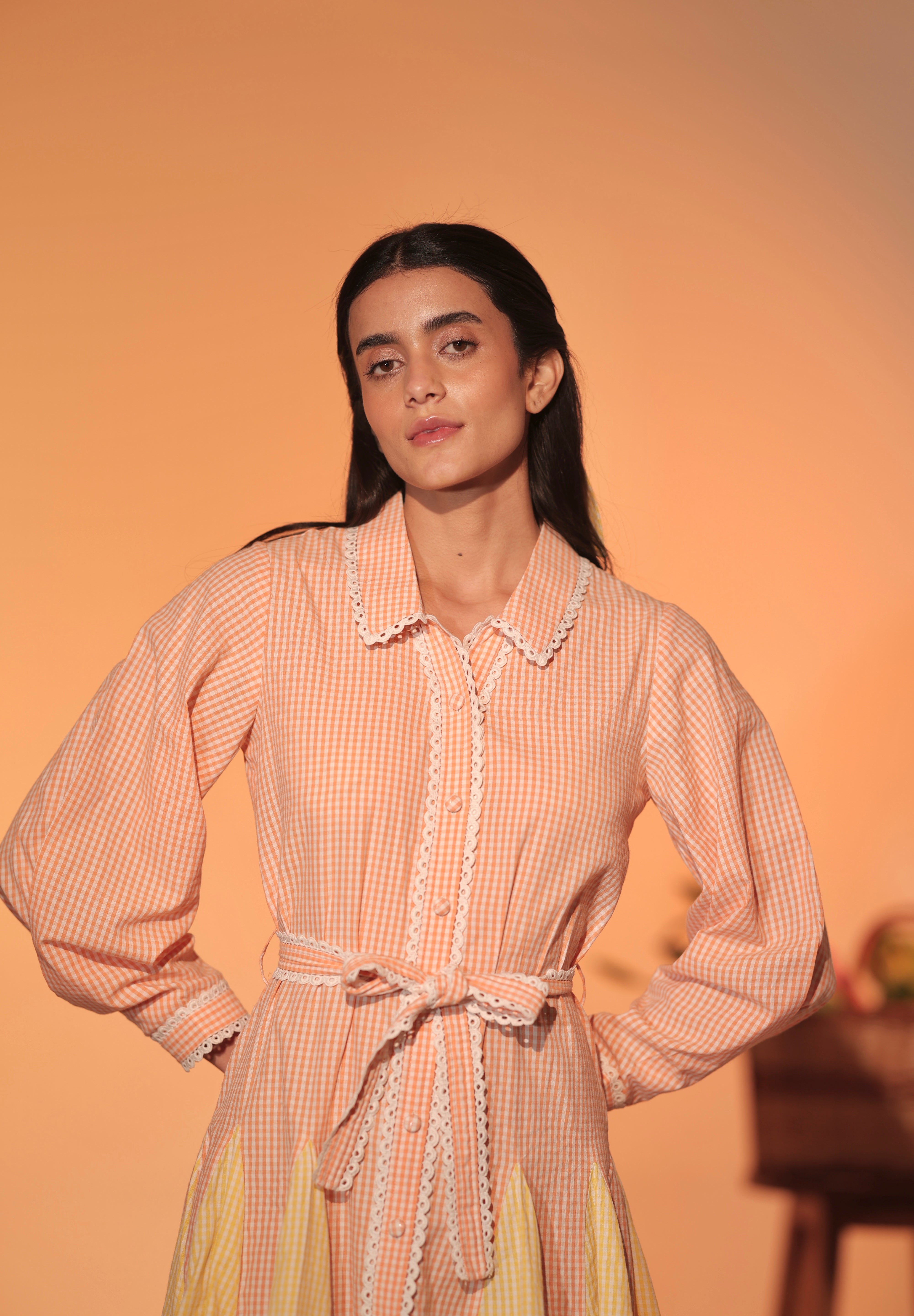 Flowing like a gentle breeze through the orchard, this shirt dress offers timeless gingham charm with a refreshing twist. With intricate lace trimmings, and flared contrast panels creating an effortless silhouette. The belted waist flatters and defines, making this the perfect choice for sun-dappled days. It has matching cloth buttons running down the front, making it easy to wear!