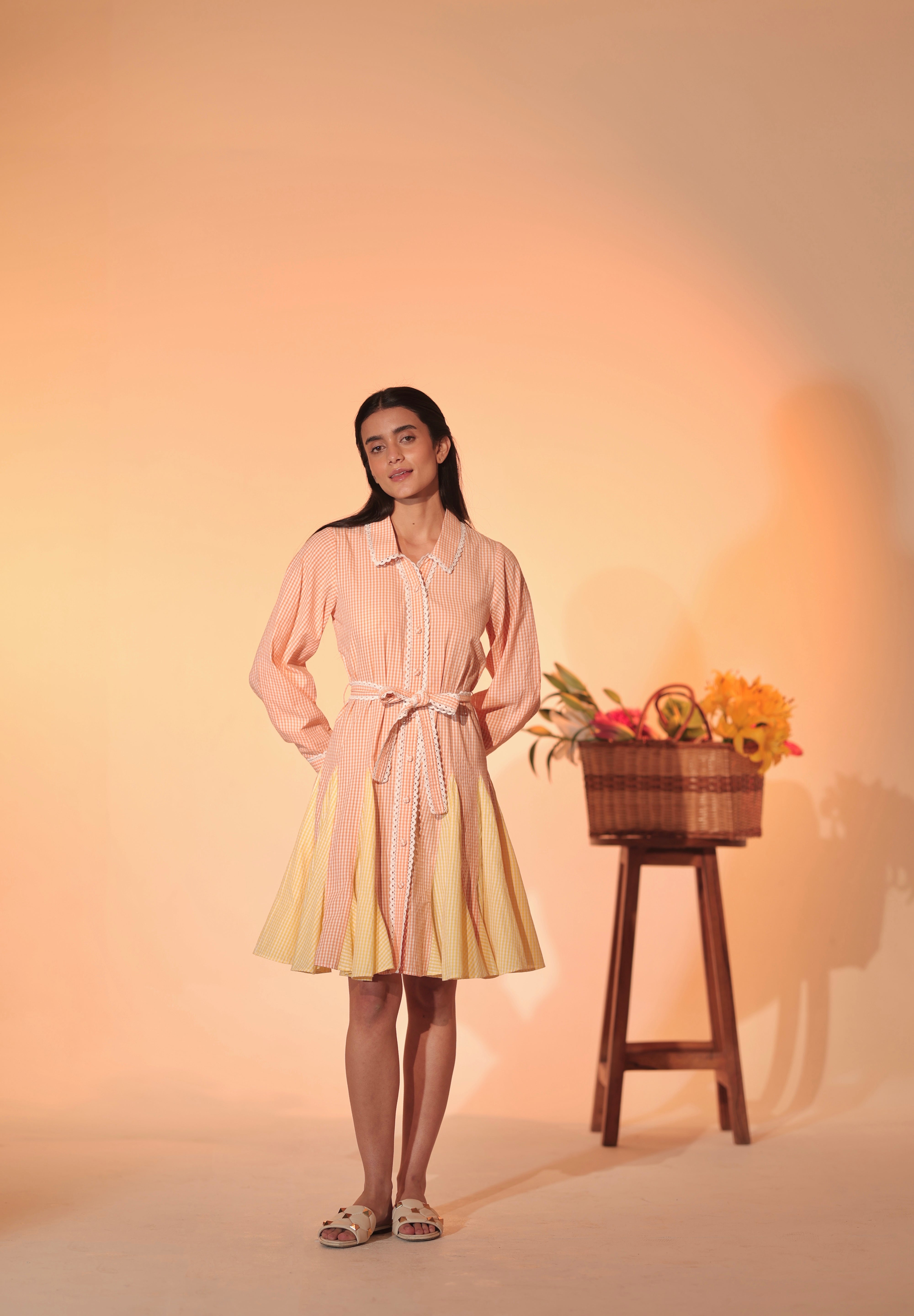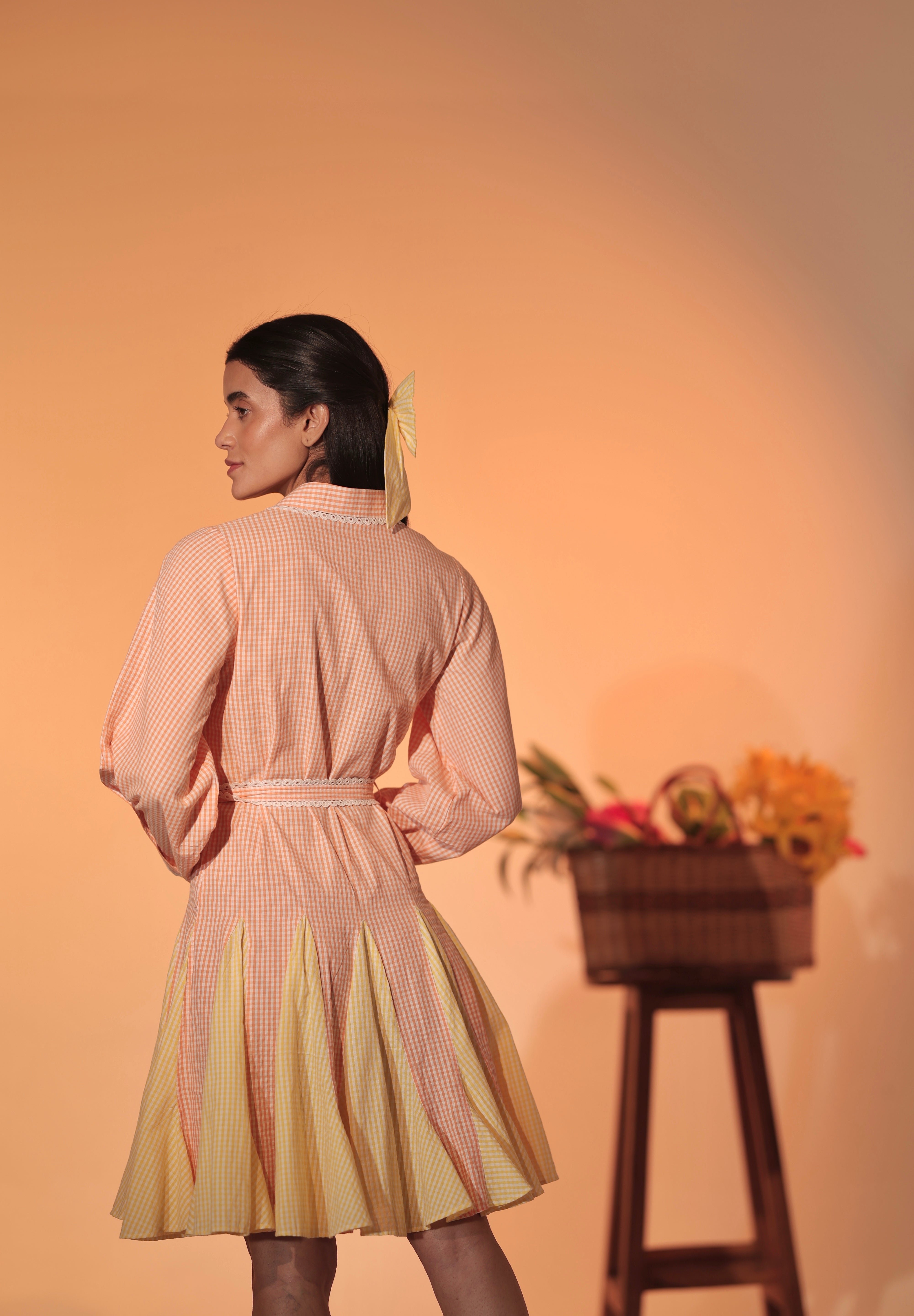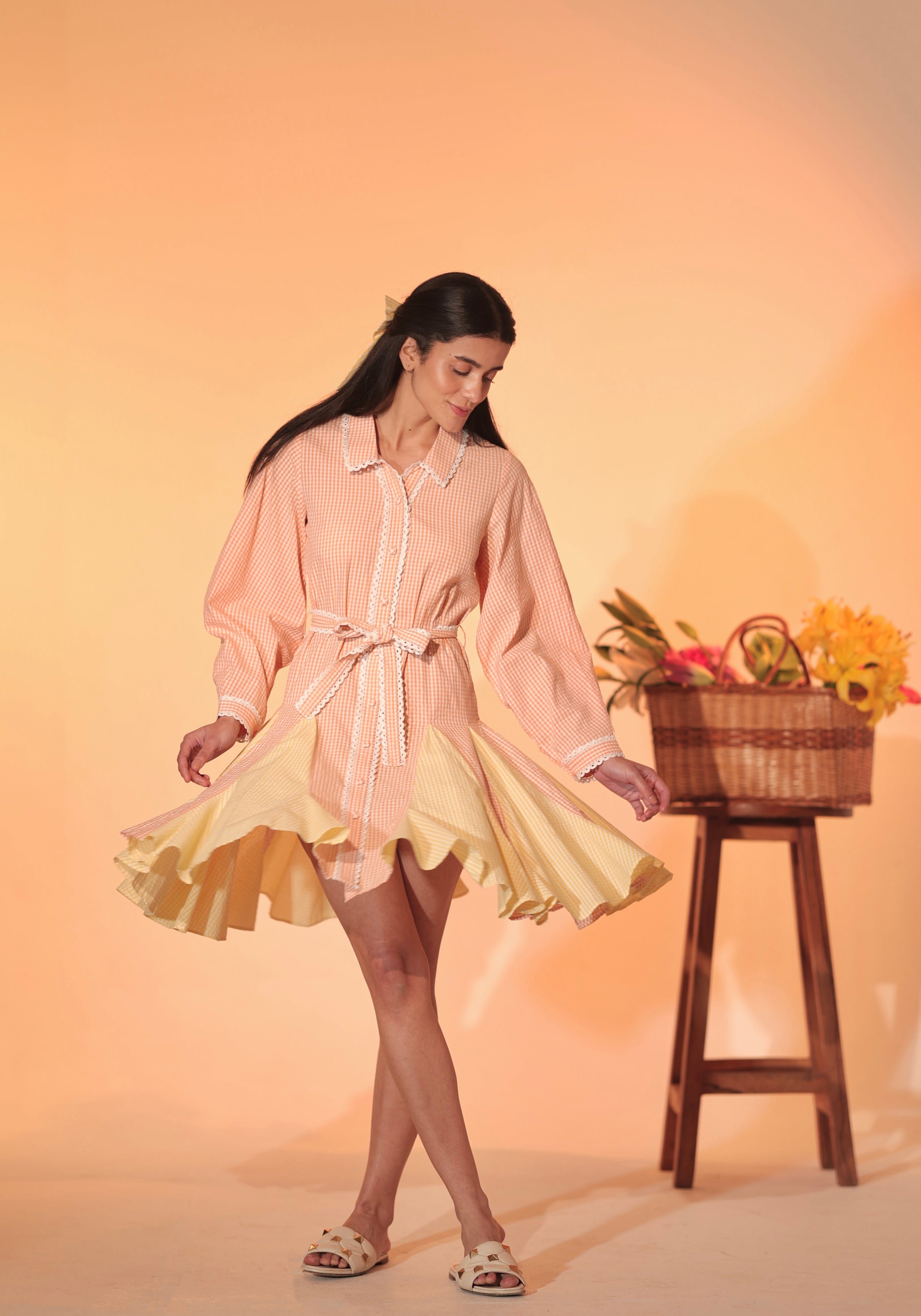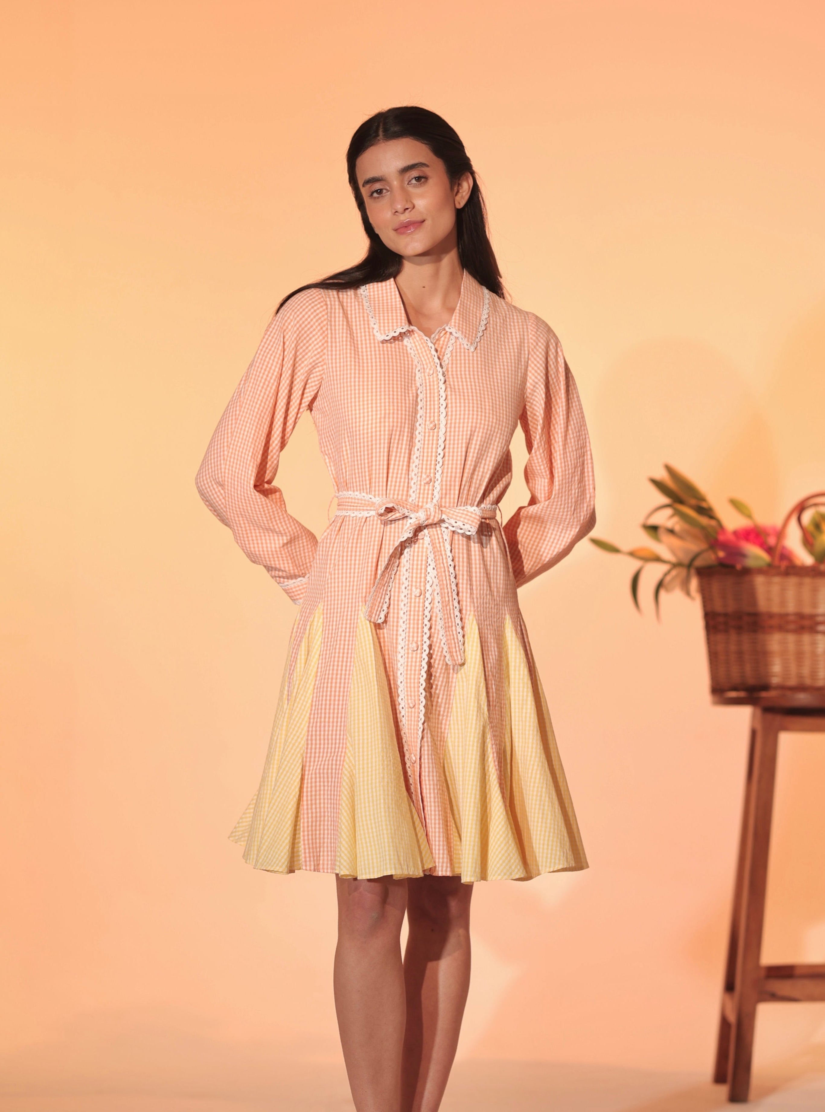 Flowing like a gentle breeze through the orchard, this shirt dress offers timeless gingham charm with a refreshing twist. With intricate lace trimmings, and flared contrast panels creating an effortless silhouette. The belted waist flatters and defines, making this the perfect choice for sun-dappled days. It has matching cloth buttons running down the front, making it easy to wear!