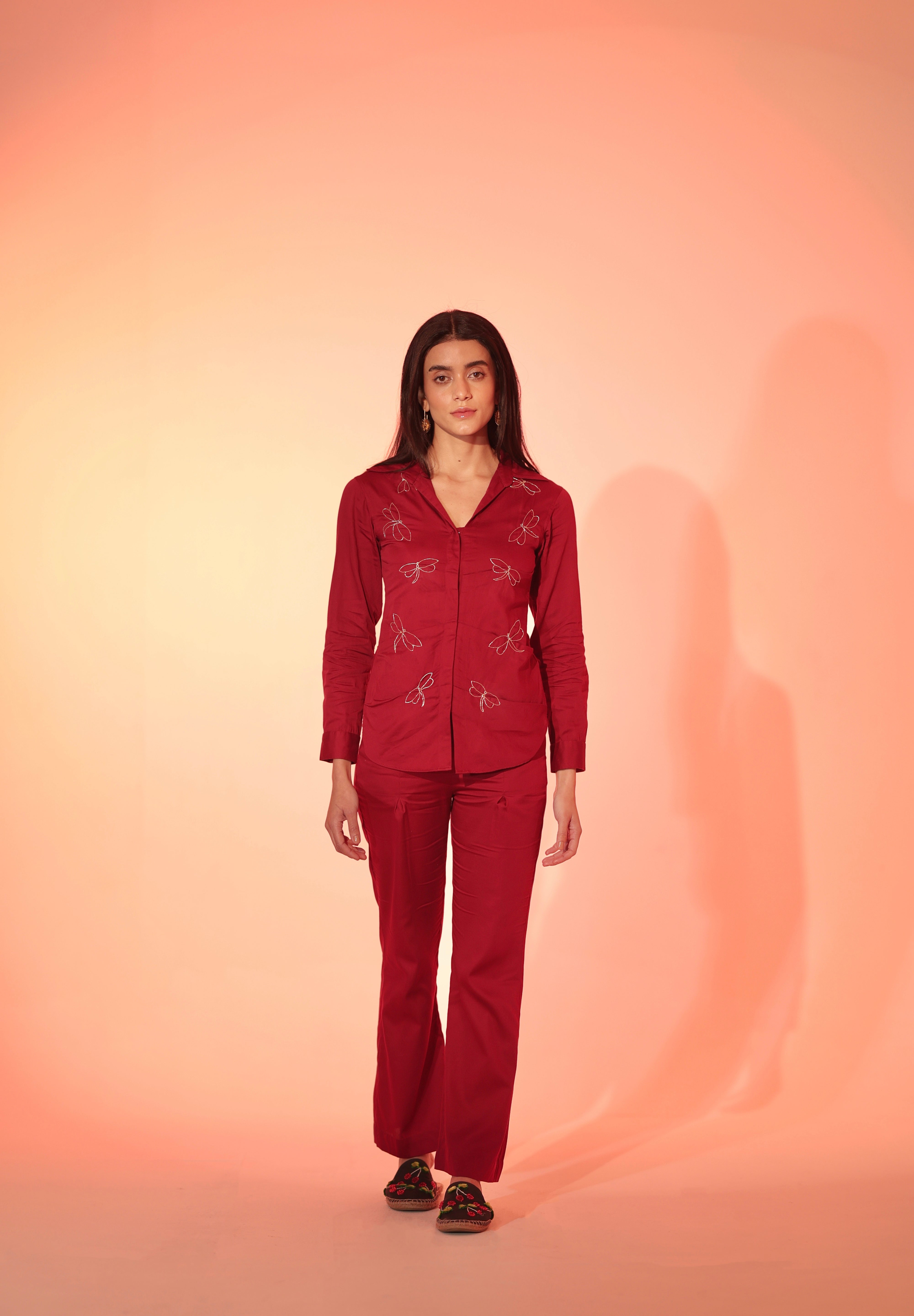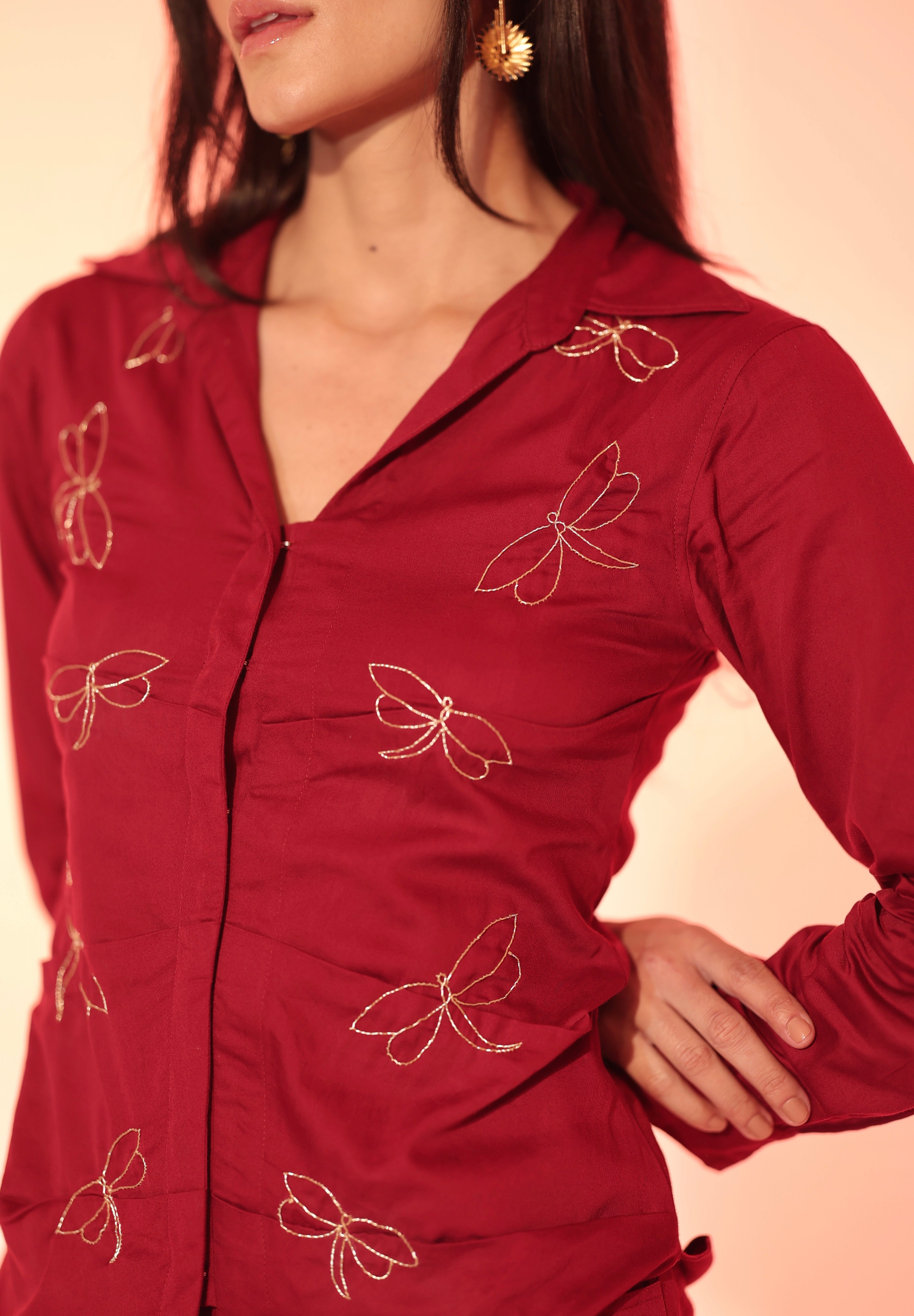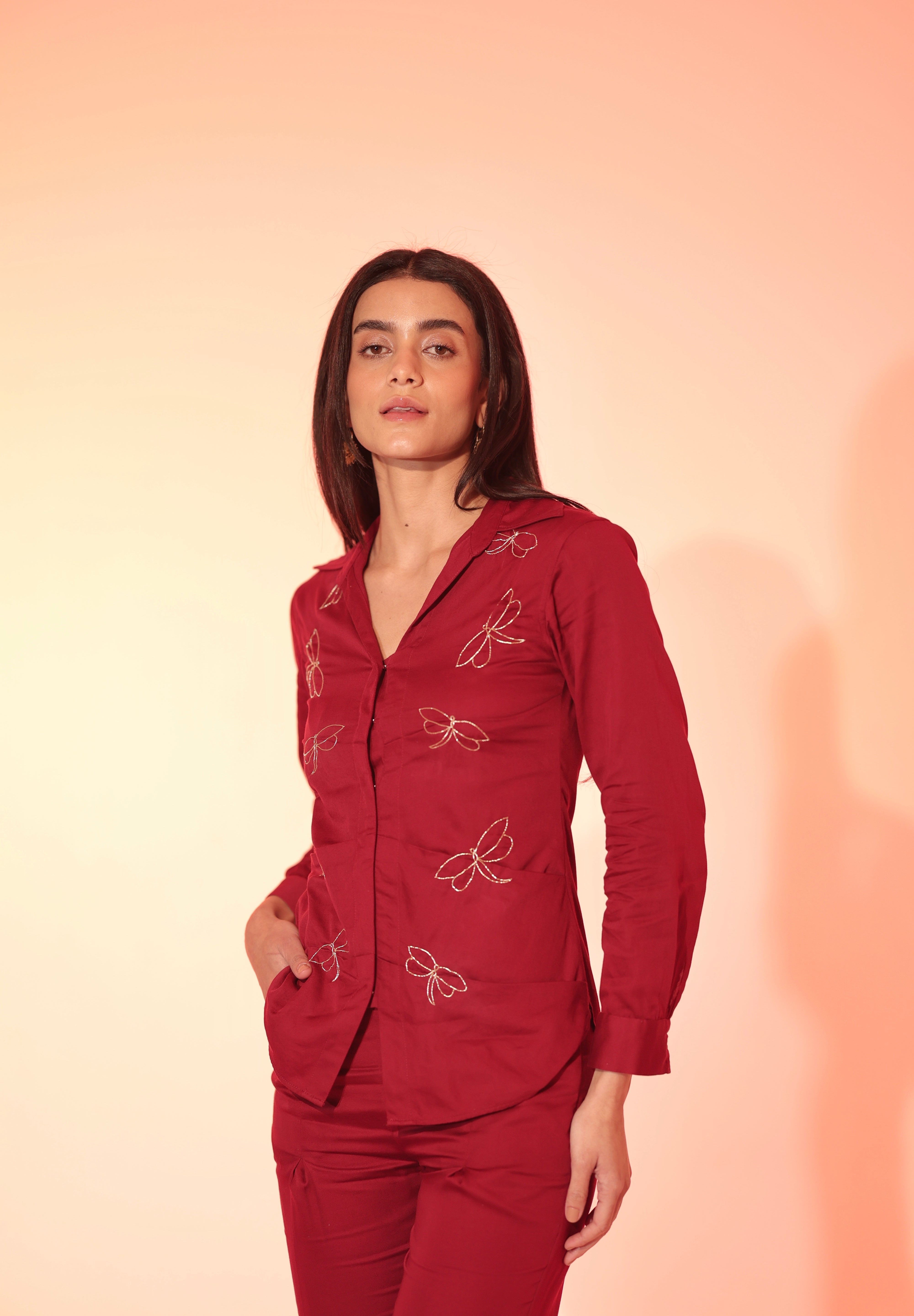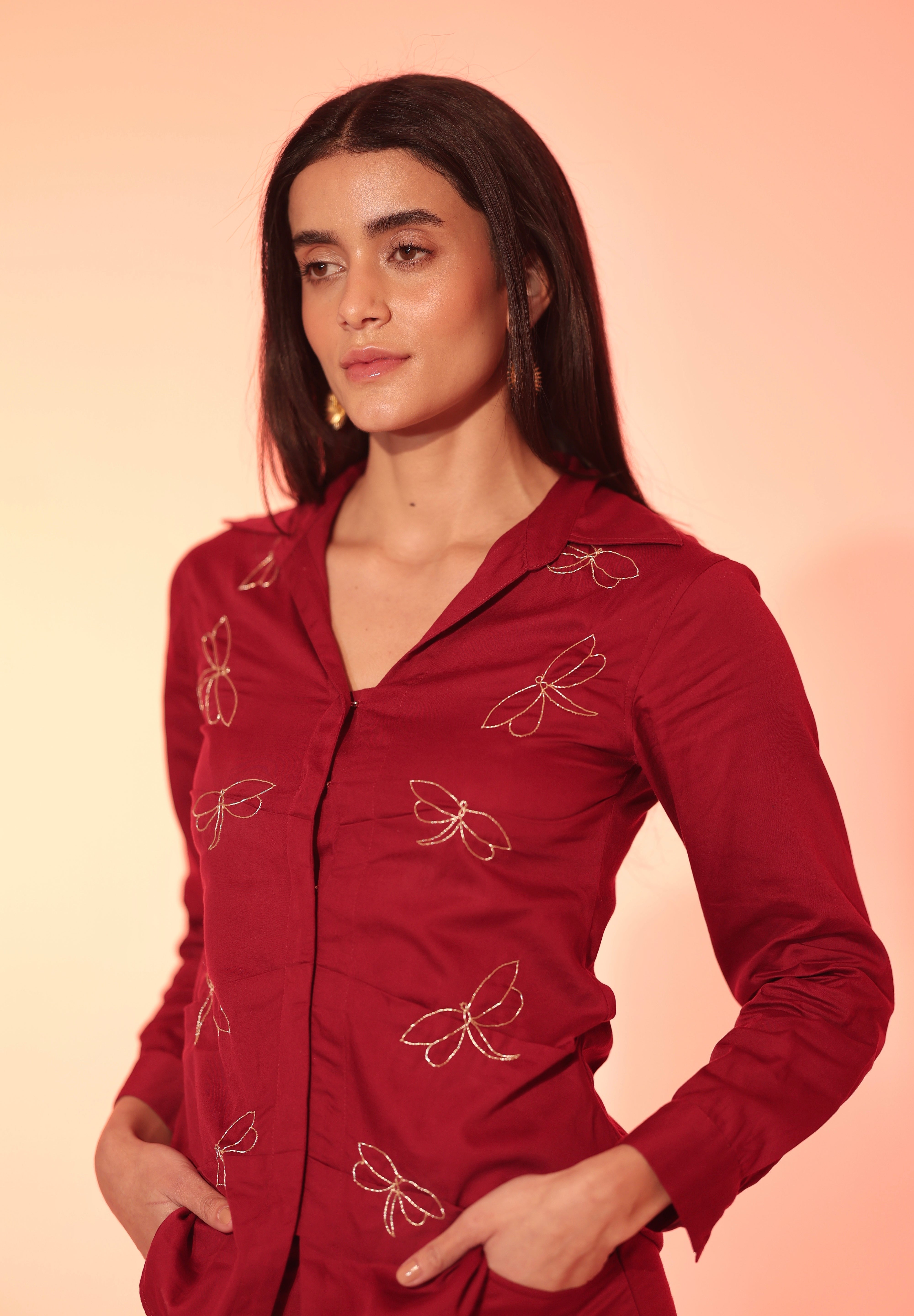 The bold Burgundy Firefly Shirt is creatively constructed, with embroidered fireflies dancing across the bodice. The piece channels the energy of a crimson garden at dusk, merging structure with whimsical movement. The shirt has hook and eye closures down the front. Pair it with our matching high waisted pleated pants for an elevated and chic look!