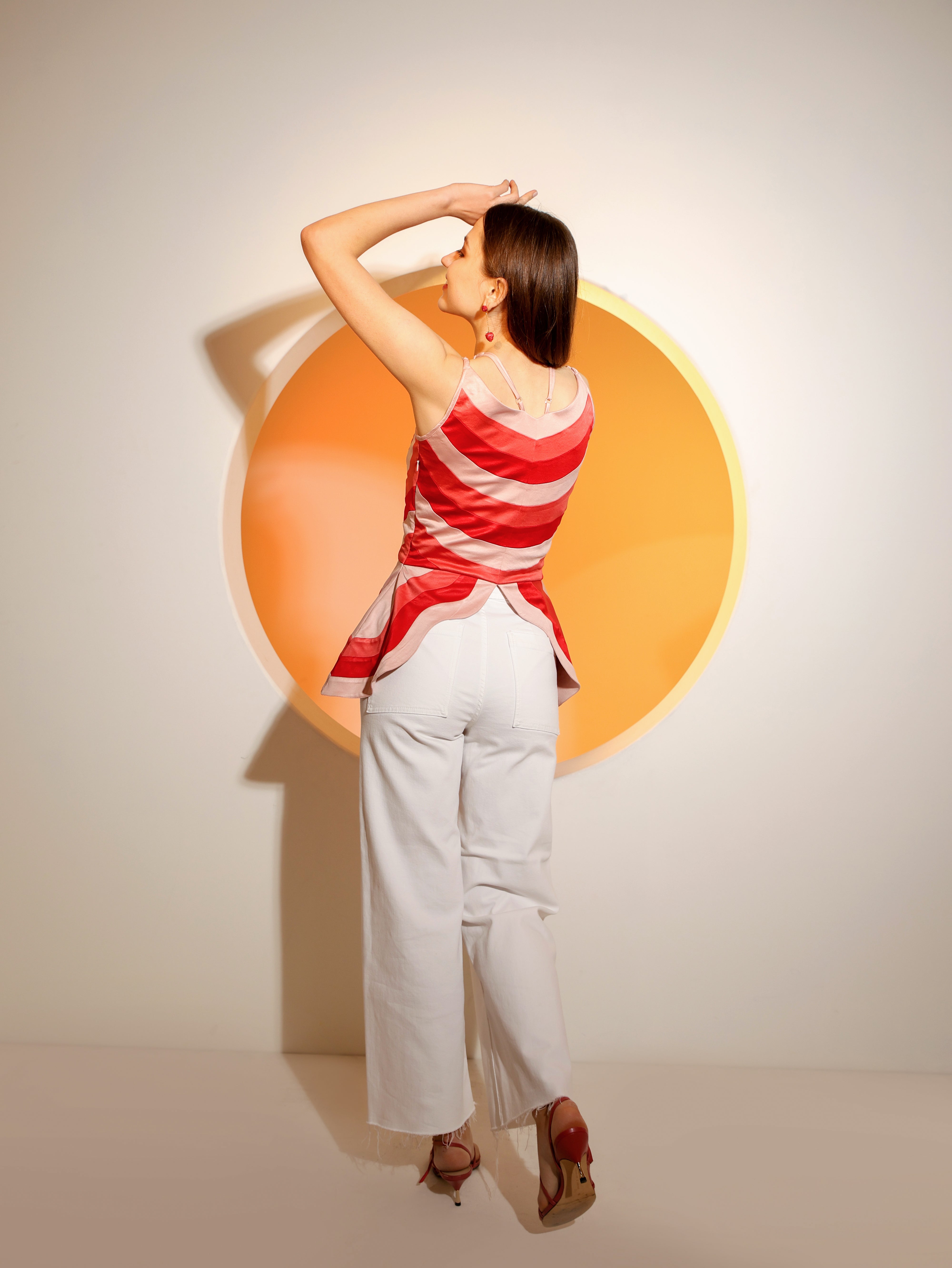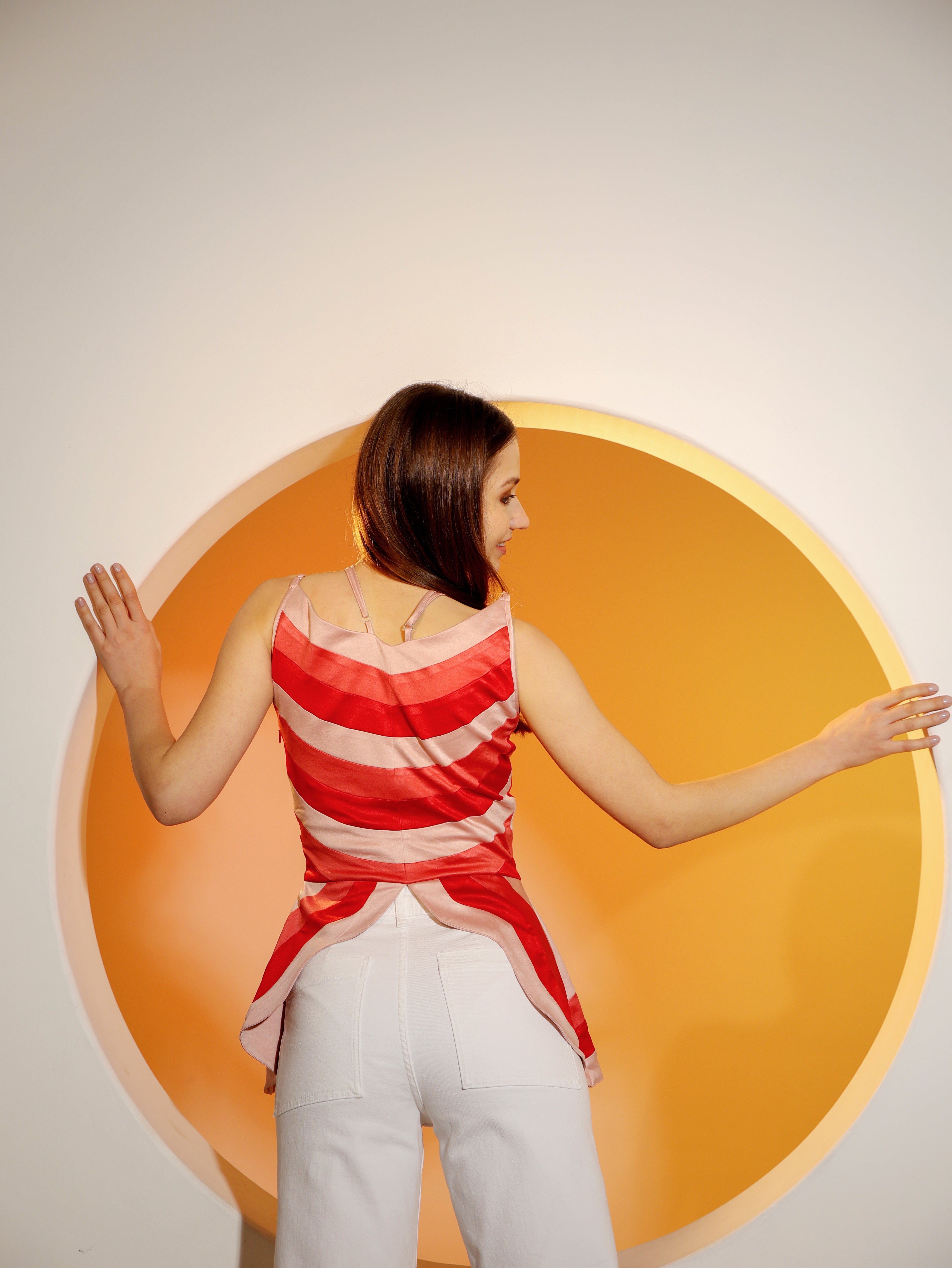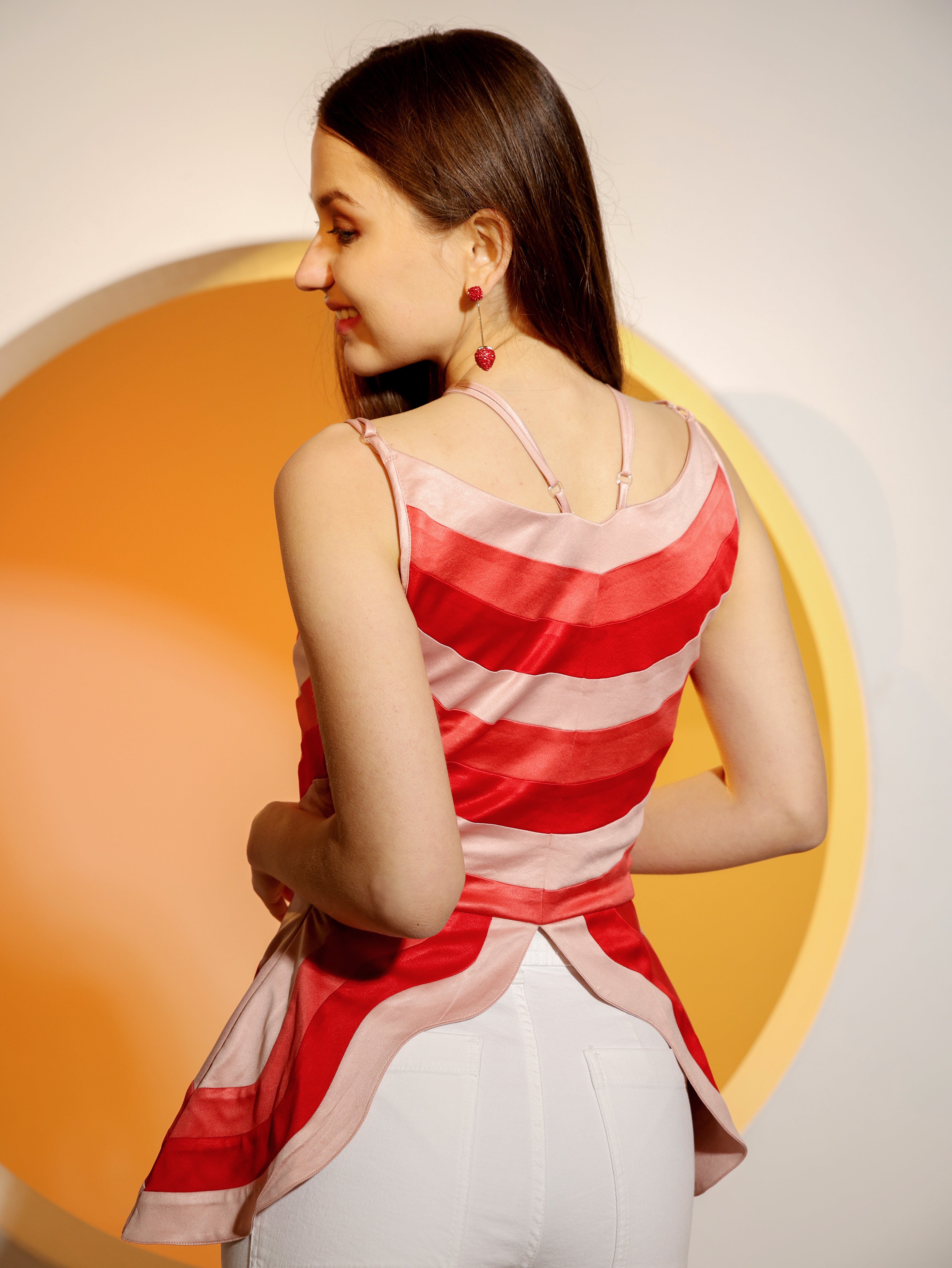The Butterfly Panel Top is carefully constructed to form the most flattering silhouette for you. With panels in shades of pink and red, it is romantic and whimsical. It has a side zipper and adjustable straps.
