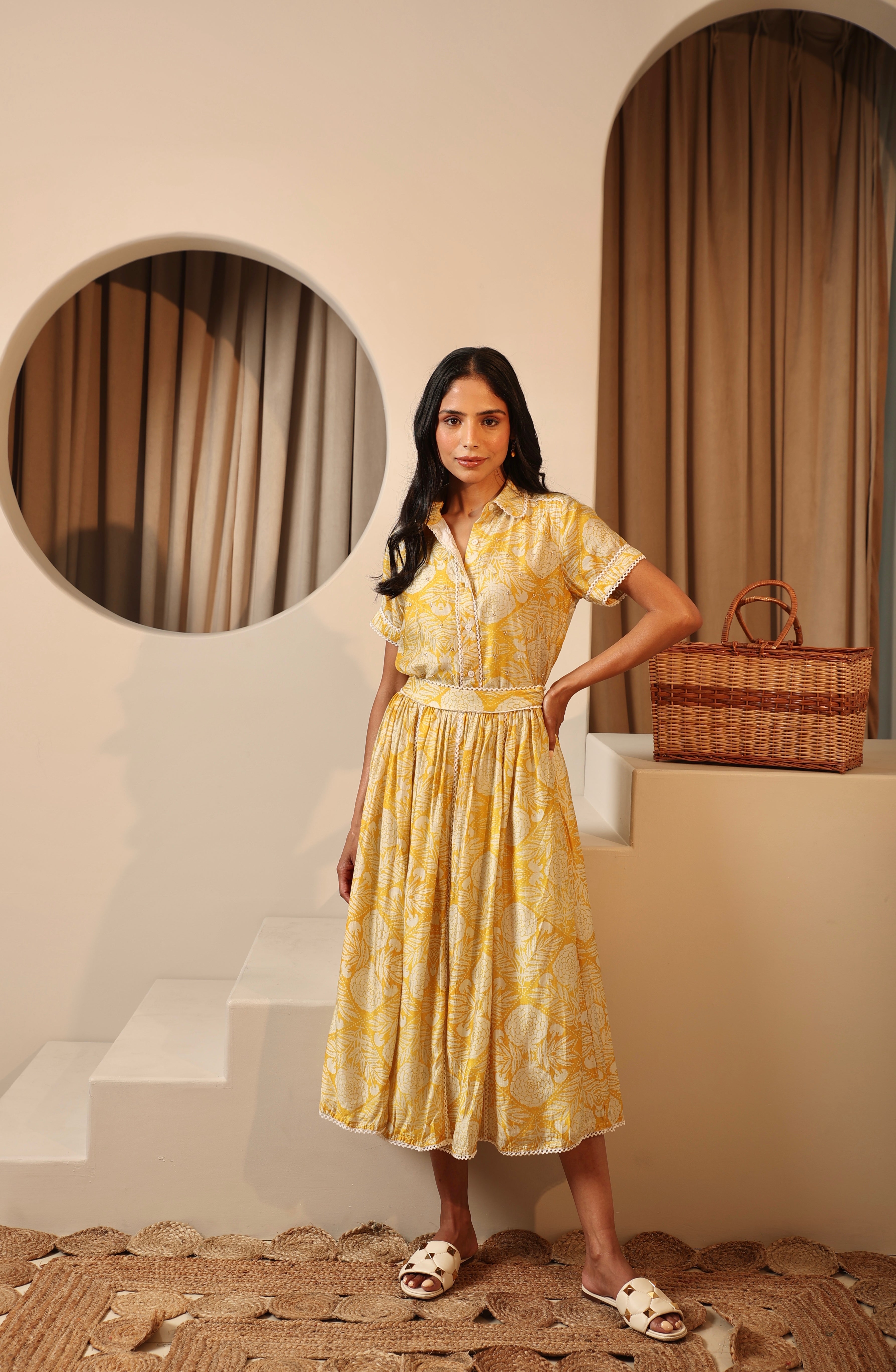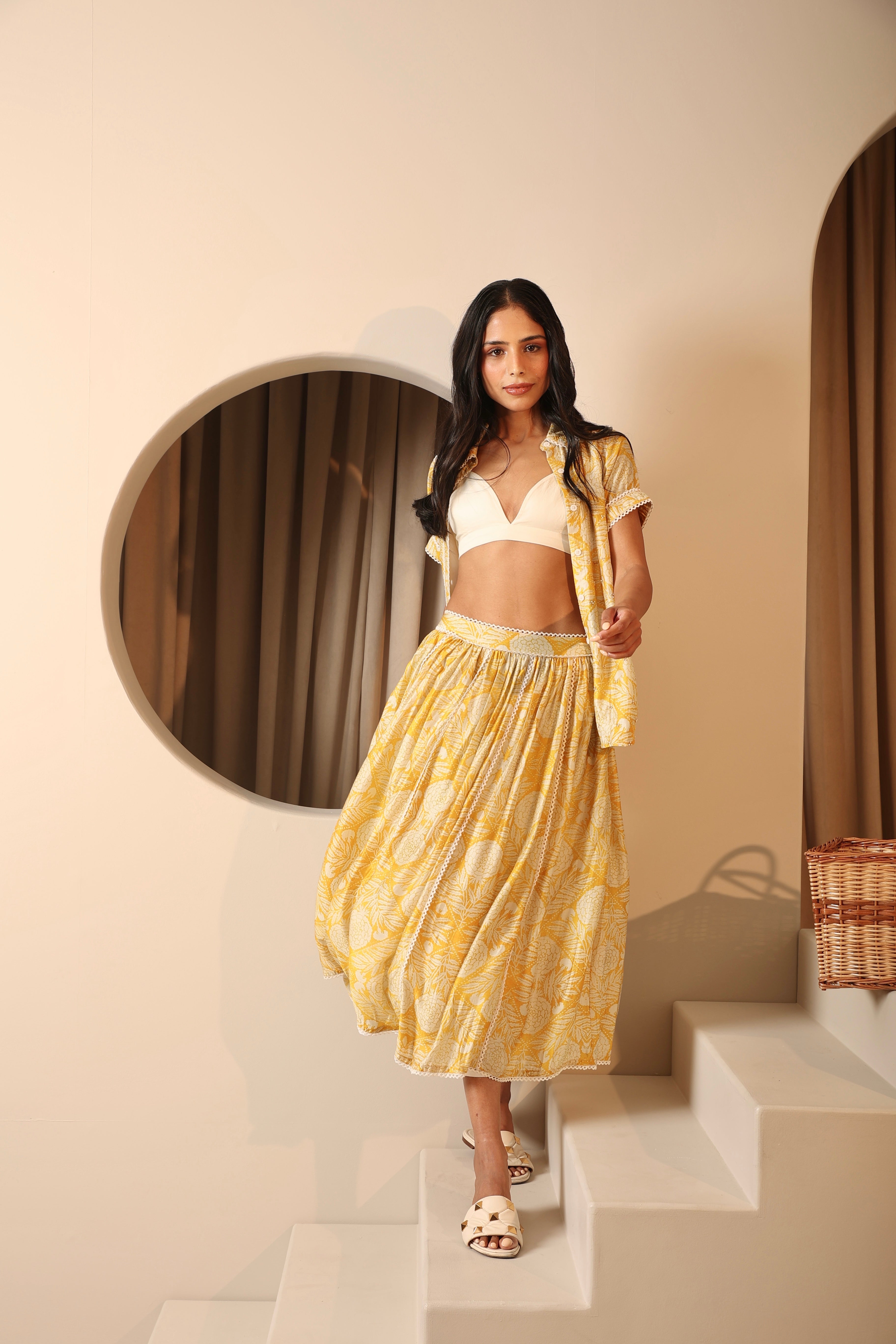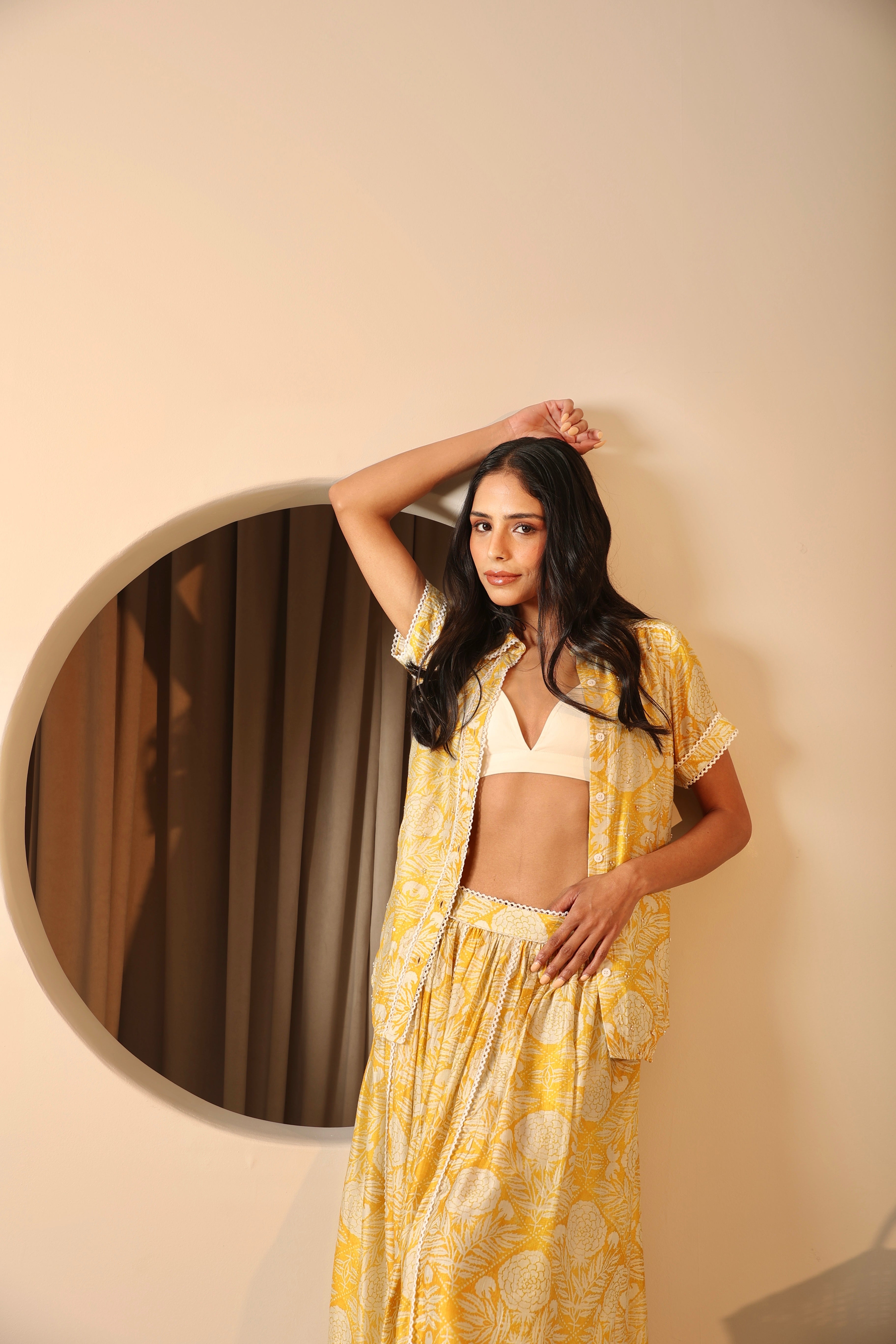 The Canary Printed Set includes a midi skirt and a shirt. The skirt and shirt feature a bright yellow base with a white floral pattern. The midi skirt falls in flattering drapes on the body and has a waistband and a side zipper. The shirt has a classic collared neckline, short sleeves, and button-down front. It also features delicate sequin and pearl beadwork. With delicate lace trims, the outfit exudes luxury, comfort and elegance! The fabric is soft and light with a comfortable lining. Perfect for a beach vacation, and easy to style as separates to create different fun looks! Buy it as a set or as separates.