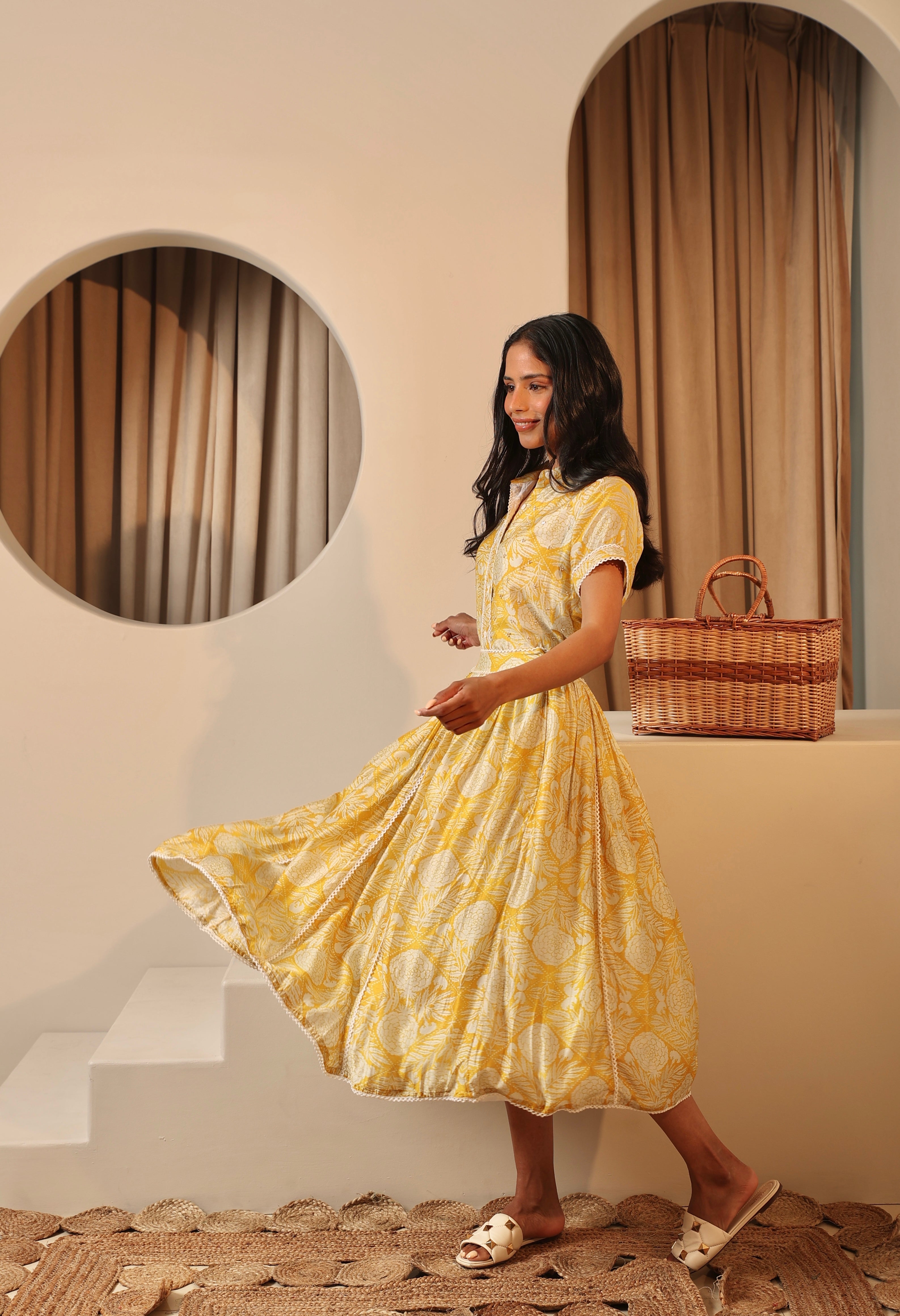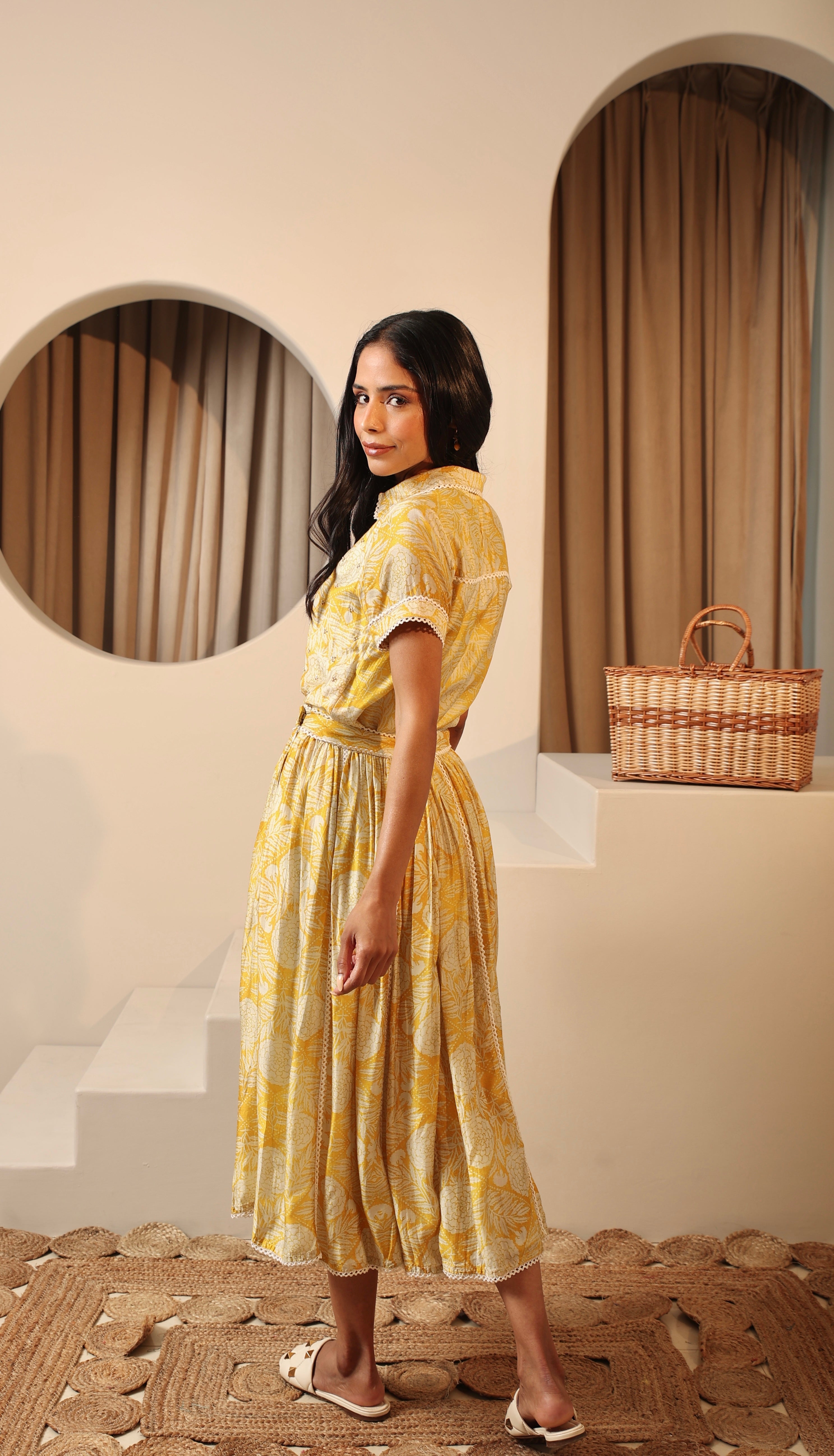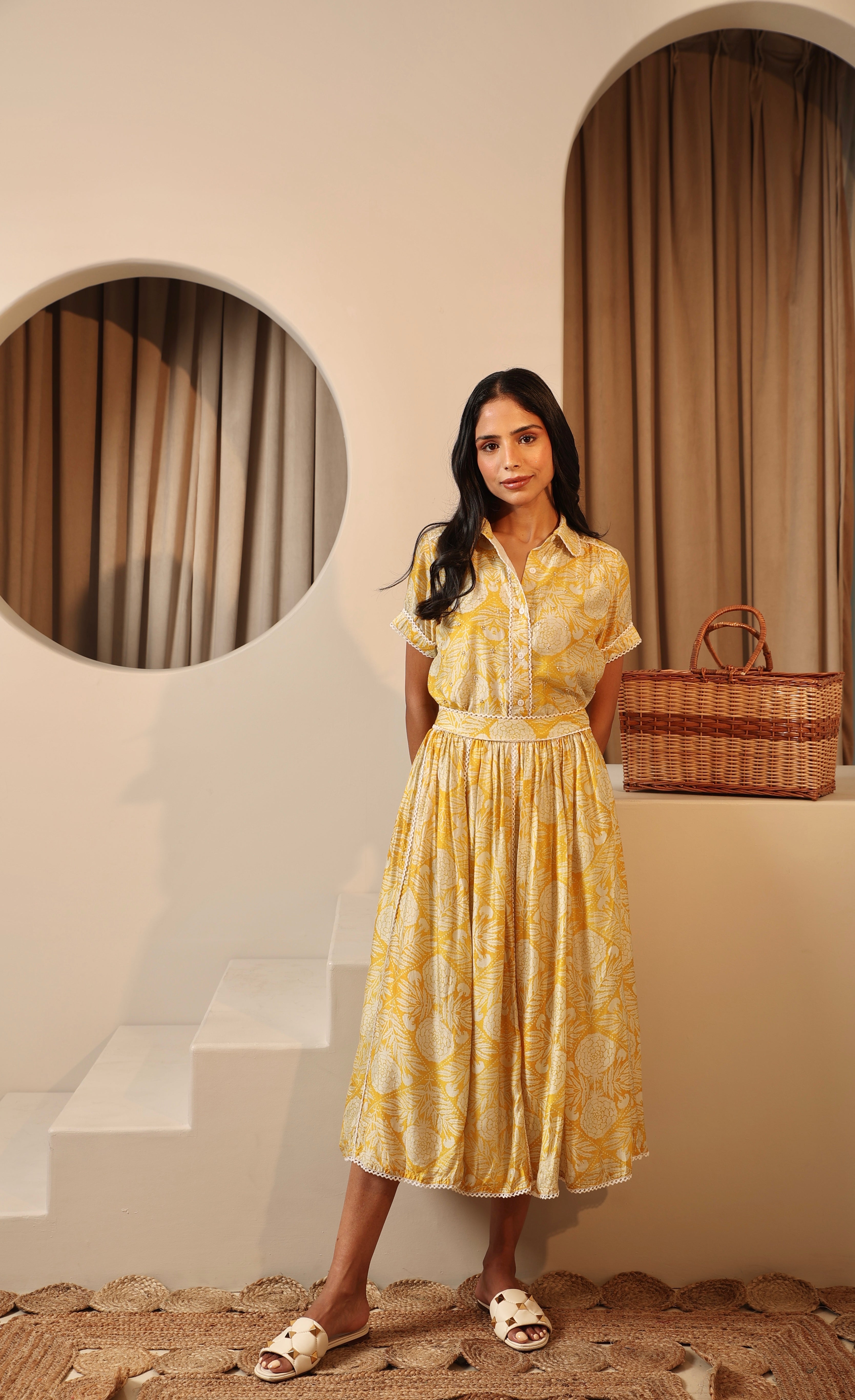 The Canary Printed Set includes a midi skirt and a shirt. The skirt and shirt feature a bright yellow base with a white floral pattern. The midi skirt falls in flattering drapes on the body and has a waistband and a side zipper. The shirt has a classic collared neckline, short sleeves, and button-down front. It also features delicate sequin and pearl beadwork. With delicate lace trims, the outfit exudes luxury, comfort and elegance! The fabric is soft and light with a comfortable lining. Perfect for a beach vacation, and easy to style as separates to create different fun looks! Buy it as a set or as separates.