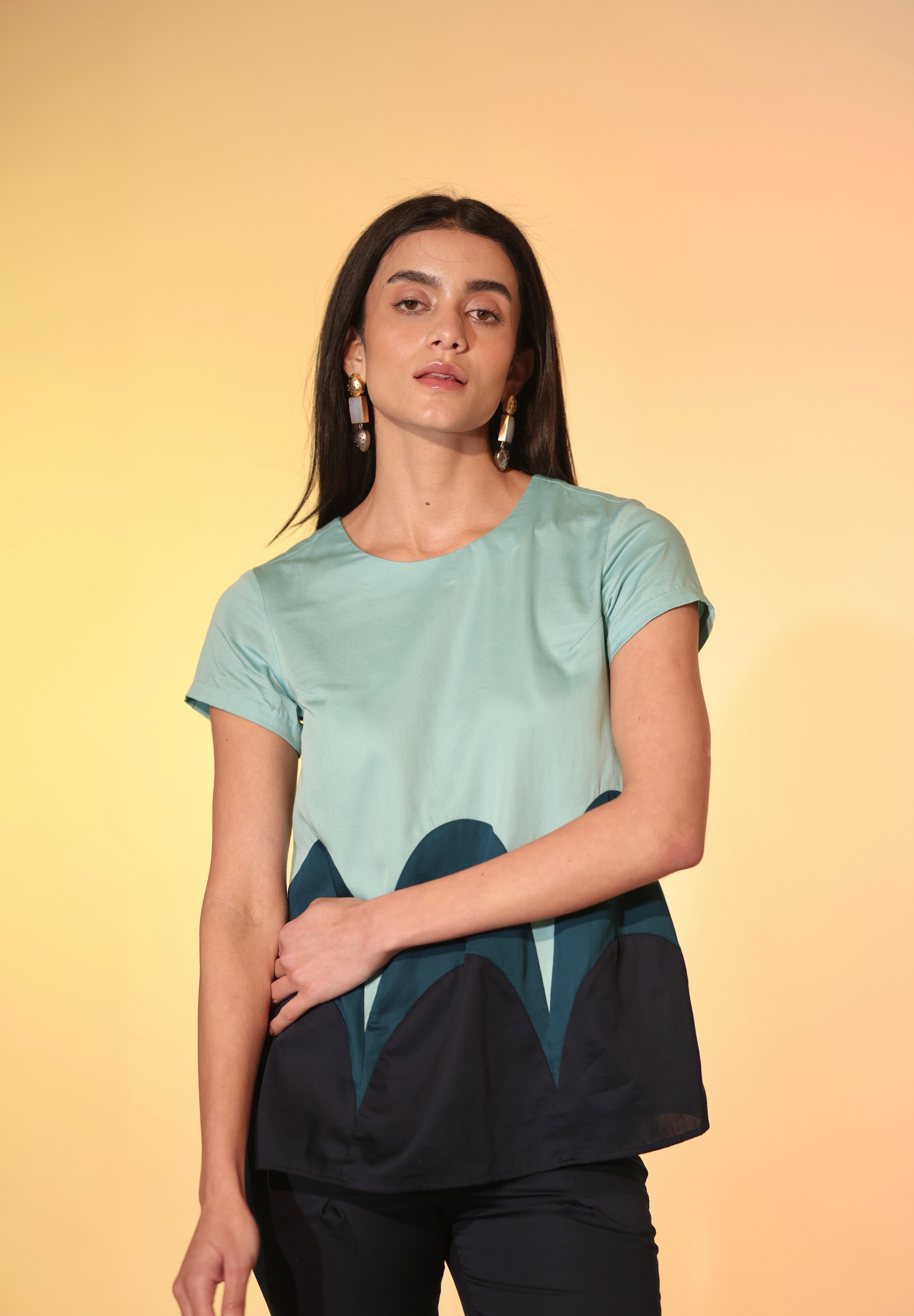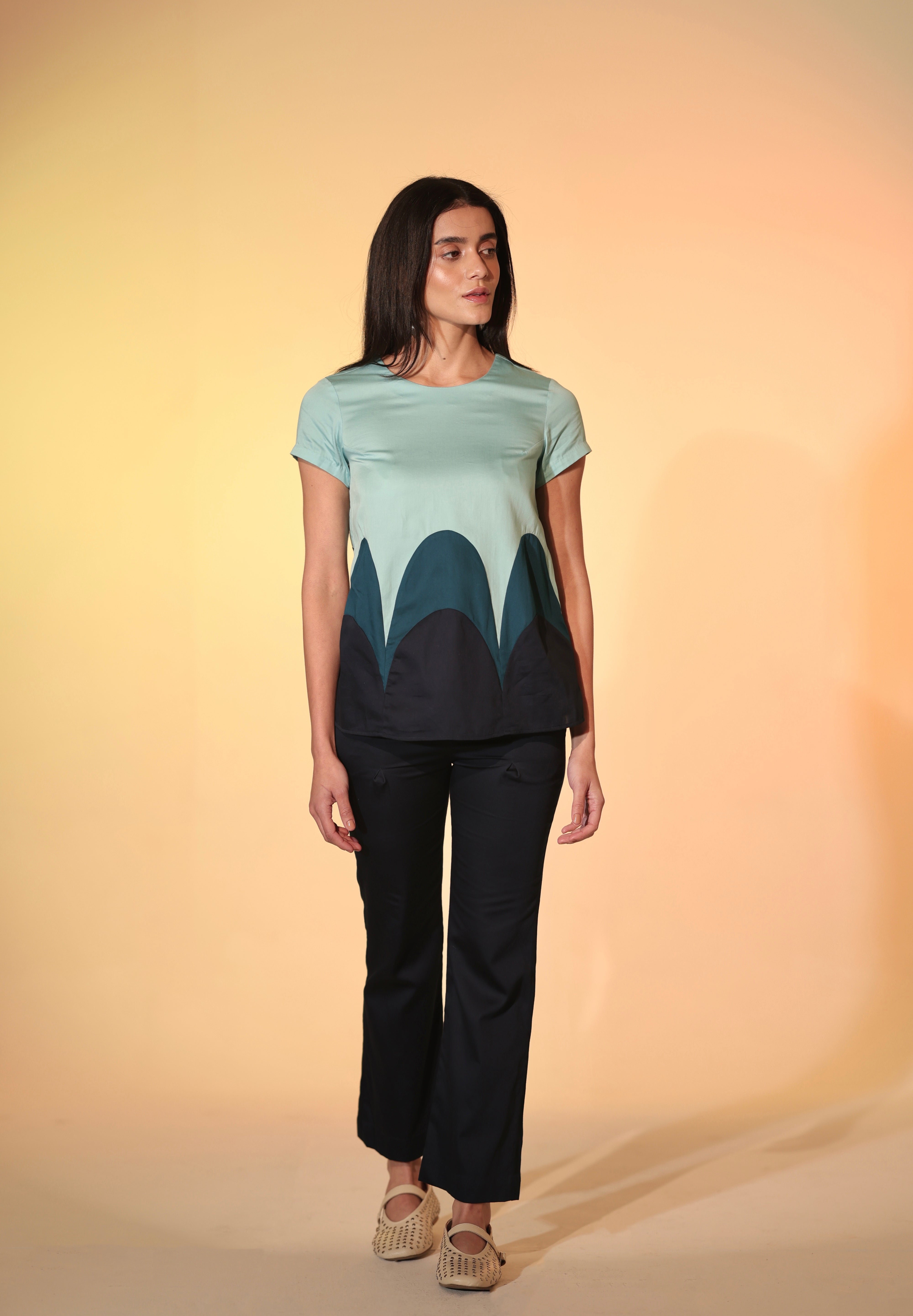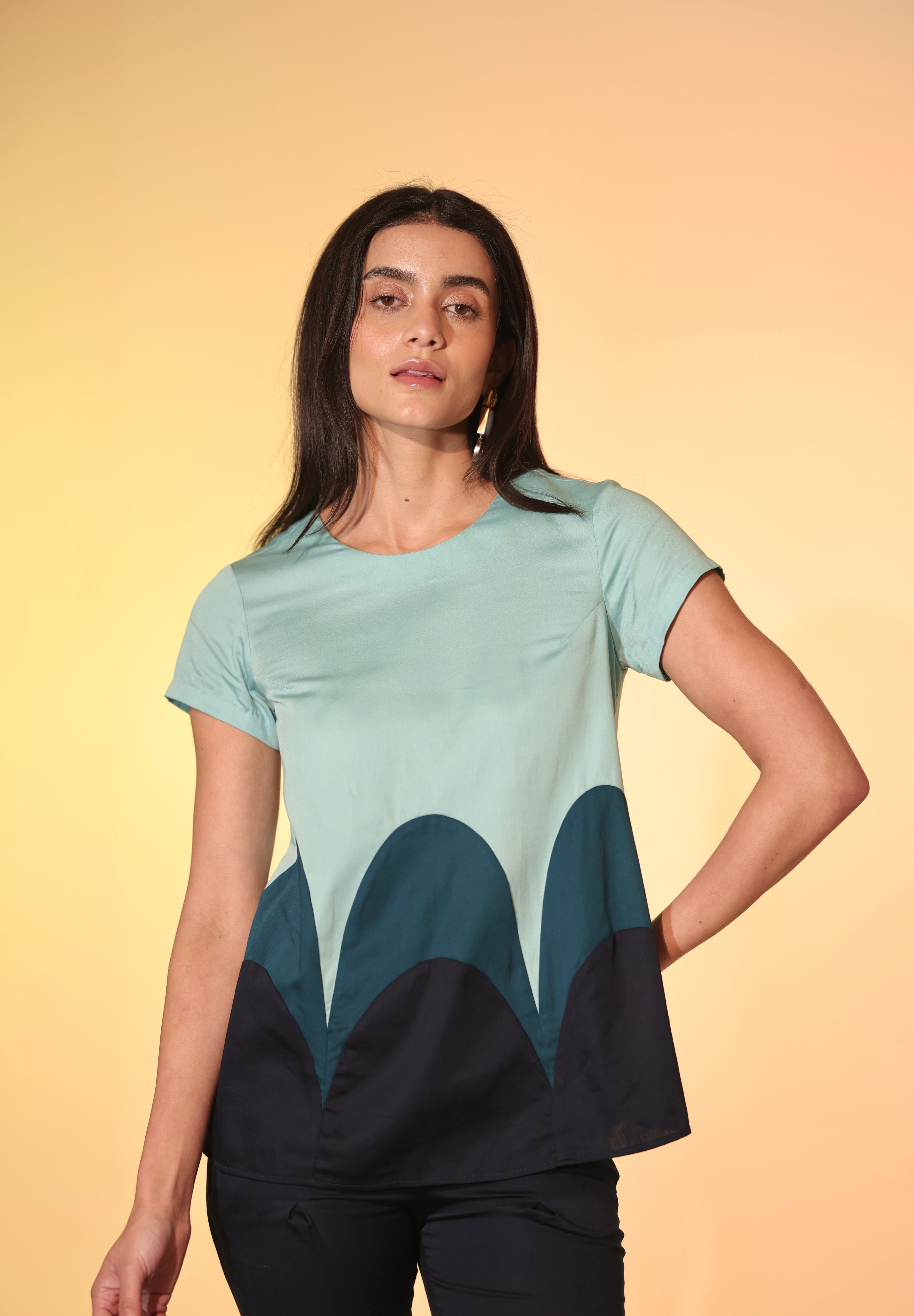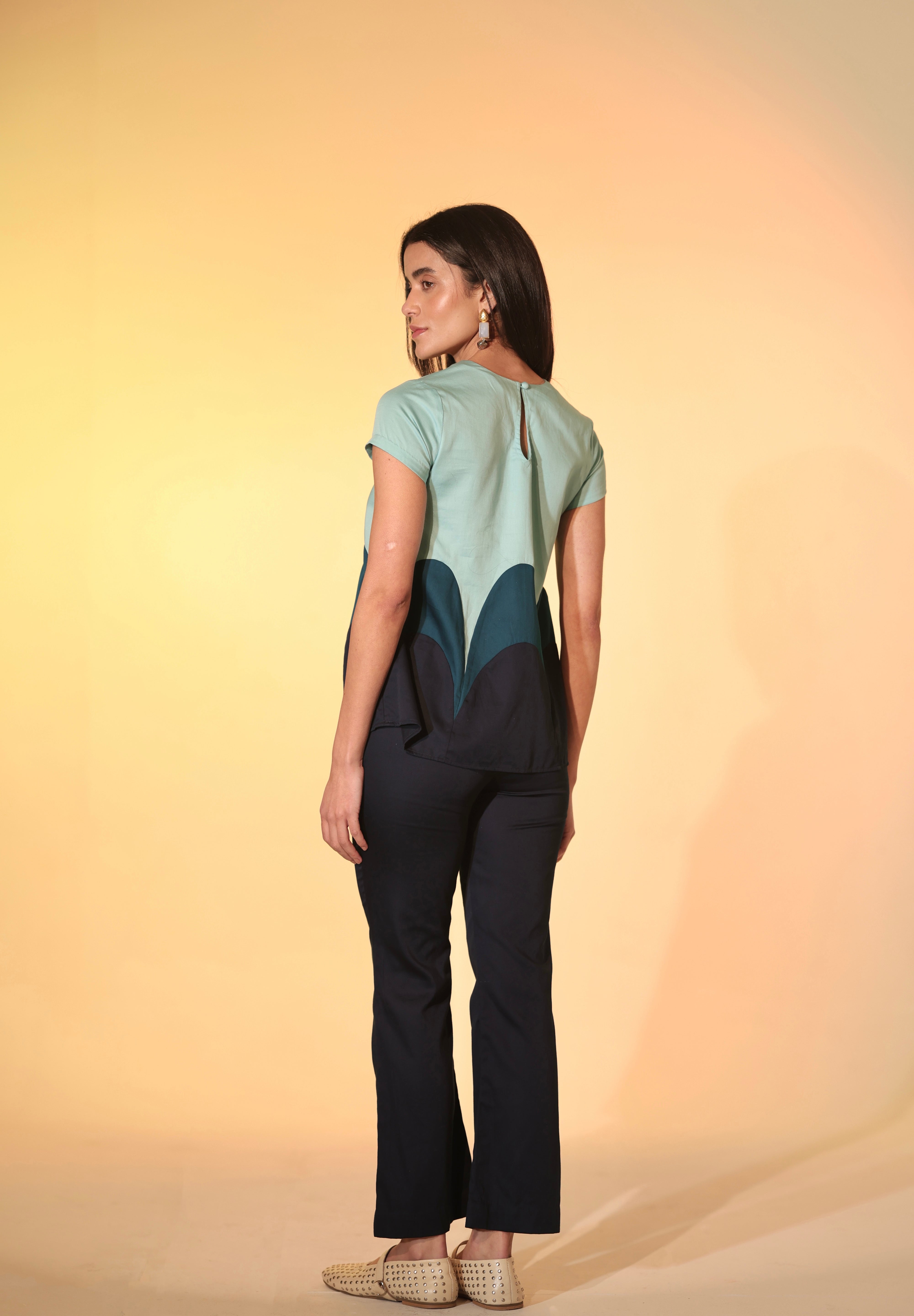 The Candy Tiered Co-ord consists of a vibrant blue top with layered scalloped panels, paired with matching fitted navy pants. The silhouette of the top has short sleeves with a round neckline, A-line body and features a keyhole and cloth button at the back. The cotton satin fabric is butter soft to the skin. This co-ord set is a chic choice for casual elegance. Perfect for workdays or coffee dates!