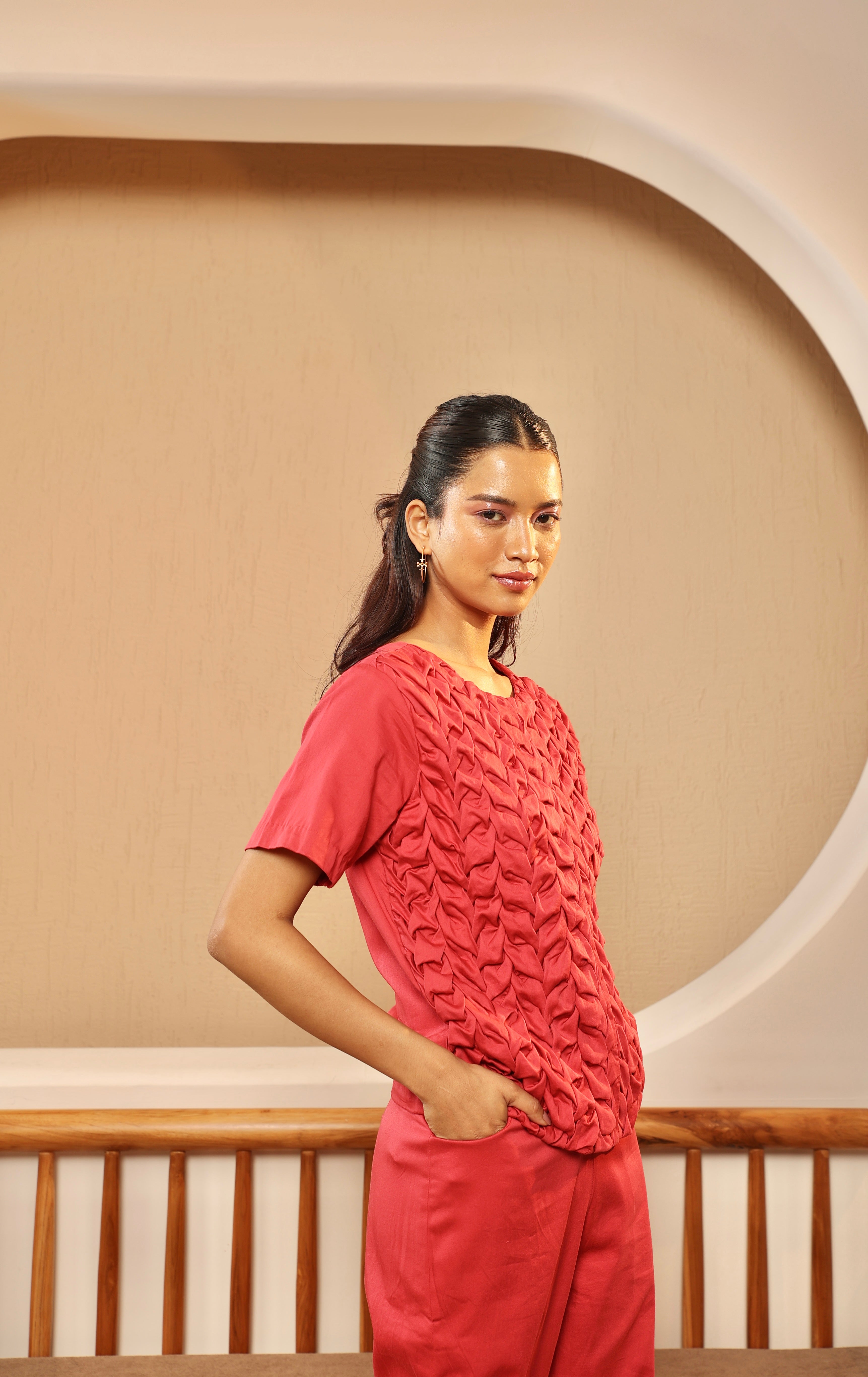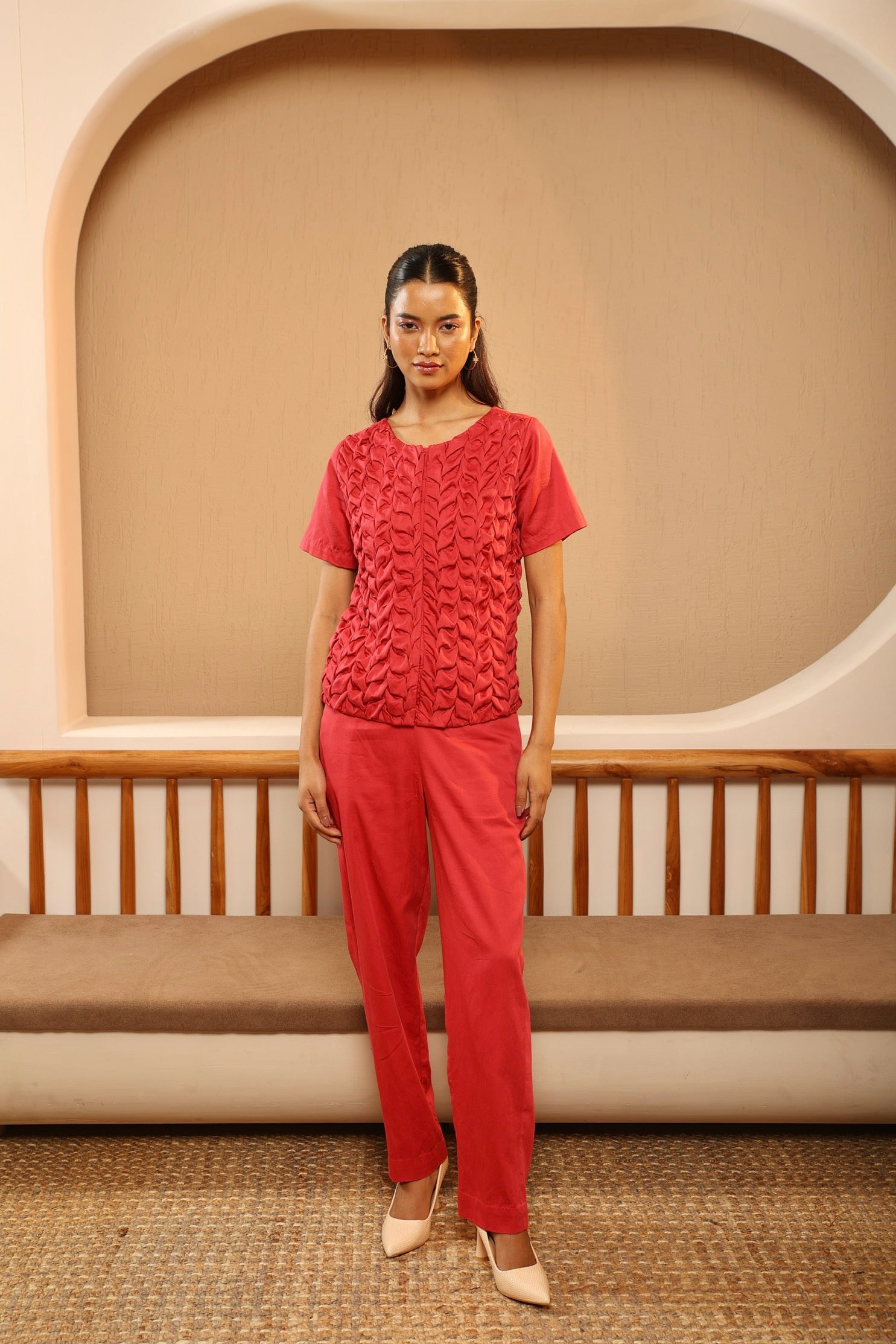 The Crimson Smocked Set includes The Crimson Smocked Shirt and The Crimson Straight Pants. The shirt has meticulous, hand sewn smocking, creating a 3D pattern throughout the body. It has short sleeves with a round neckline and a straight silhouette. The fabric is soft on the skin, creating both visual interest and structure. It features hook & eye closures on the front. Paired with our matching Crimson Straight Pants, it creates the most comfortable yet chic summer outfit! Buy it as a set or as separates.