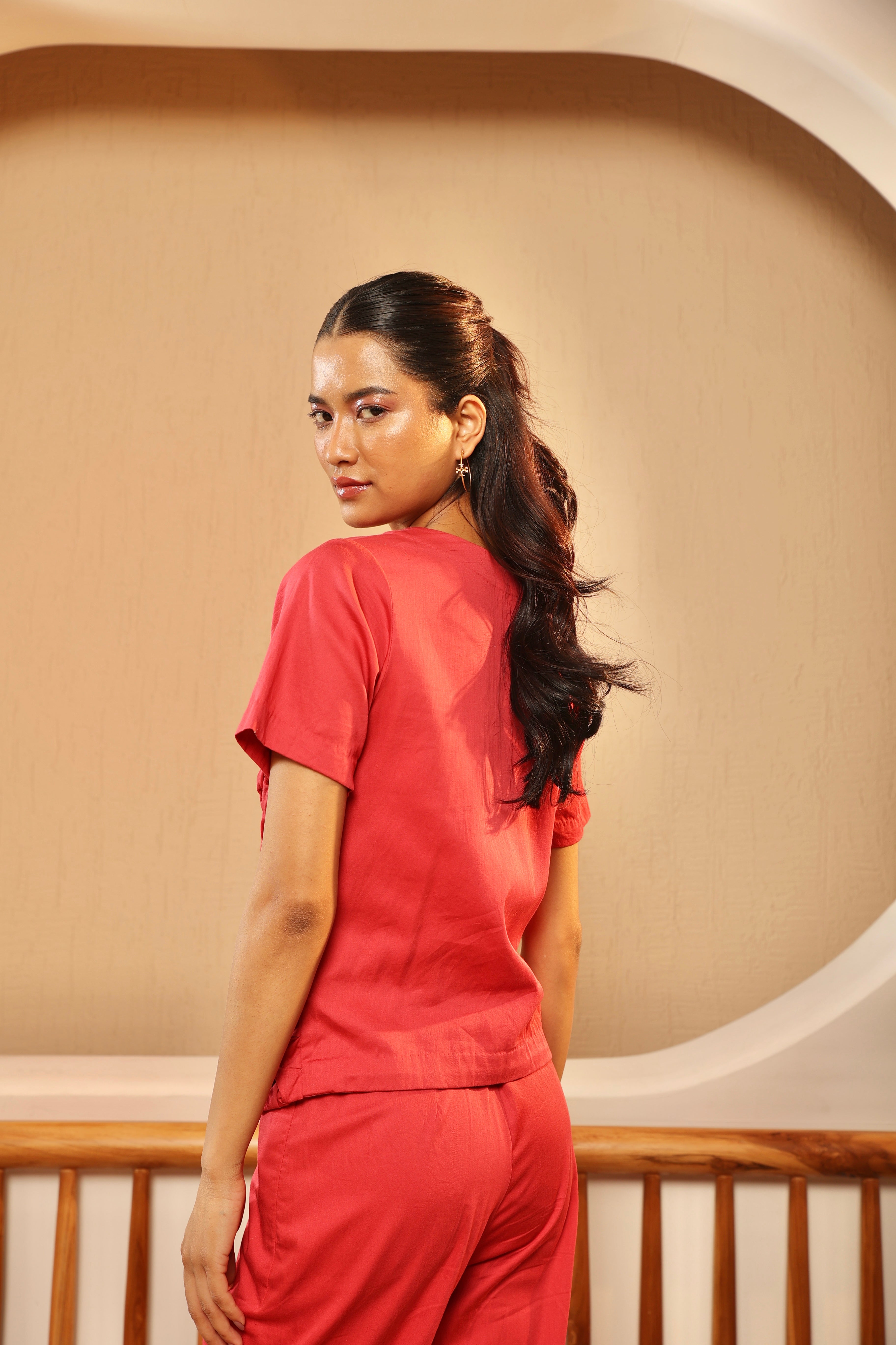 The Crimson Smocked Shirt has meticulous, hand sewn smocking, creating a 3D pattern throughout the body. It has cap sleeves with a round neckline and a straight silhouette. The fabric is soft on the skin, creating both visual interest and structure. It features hook & eye closures on the front.