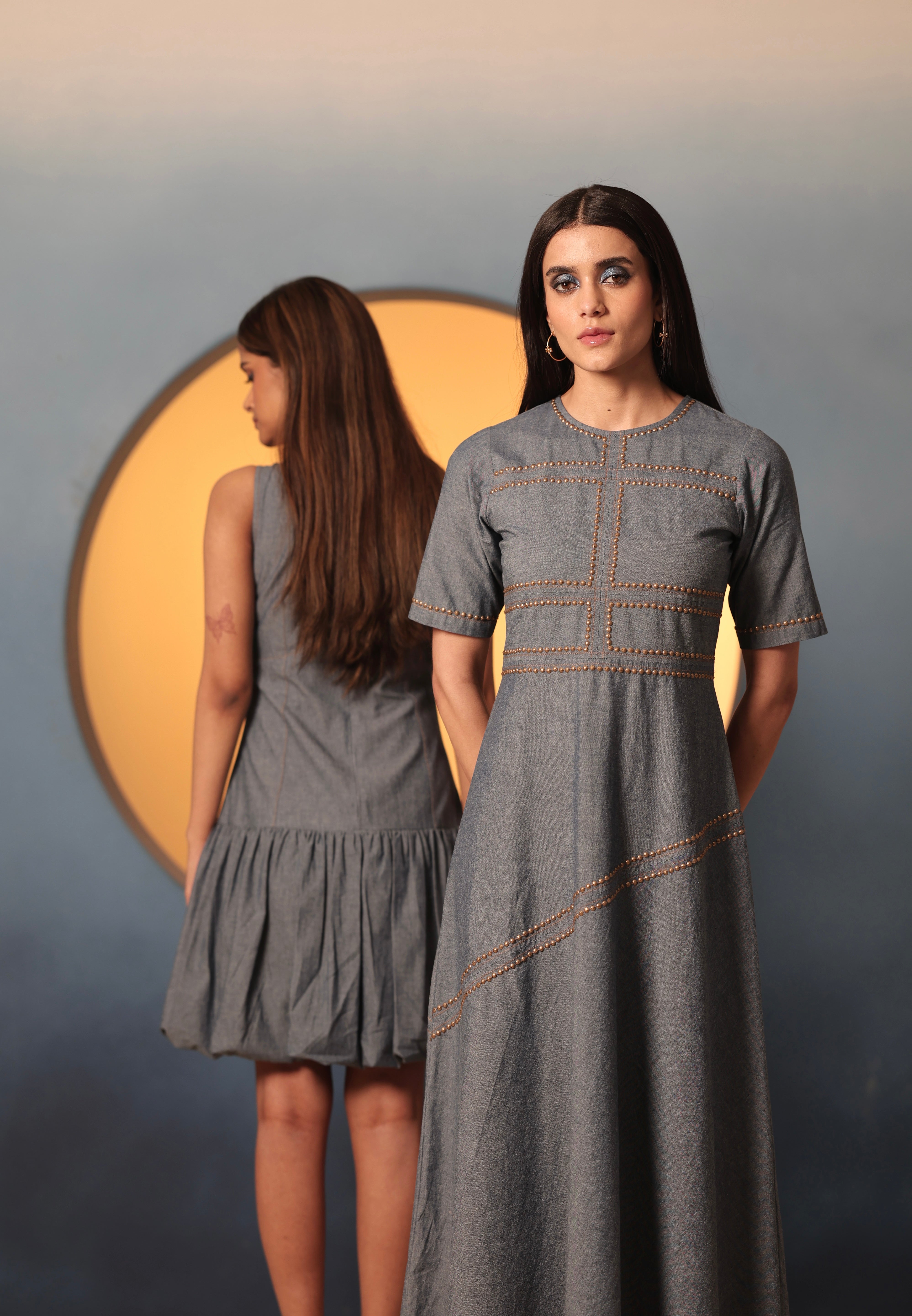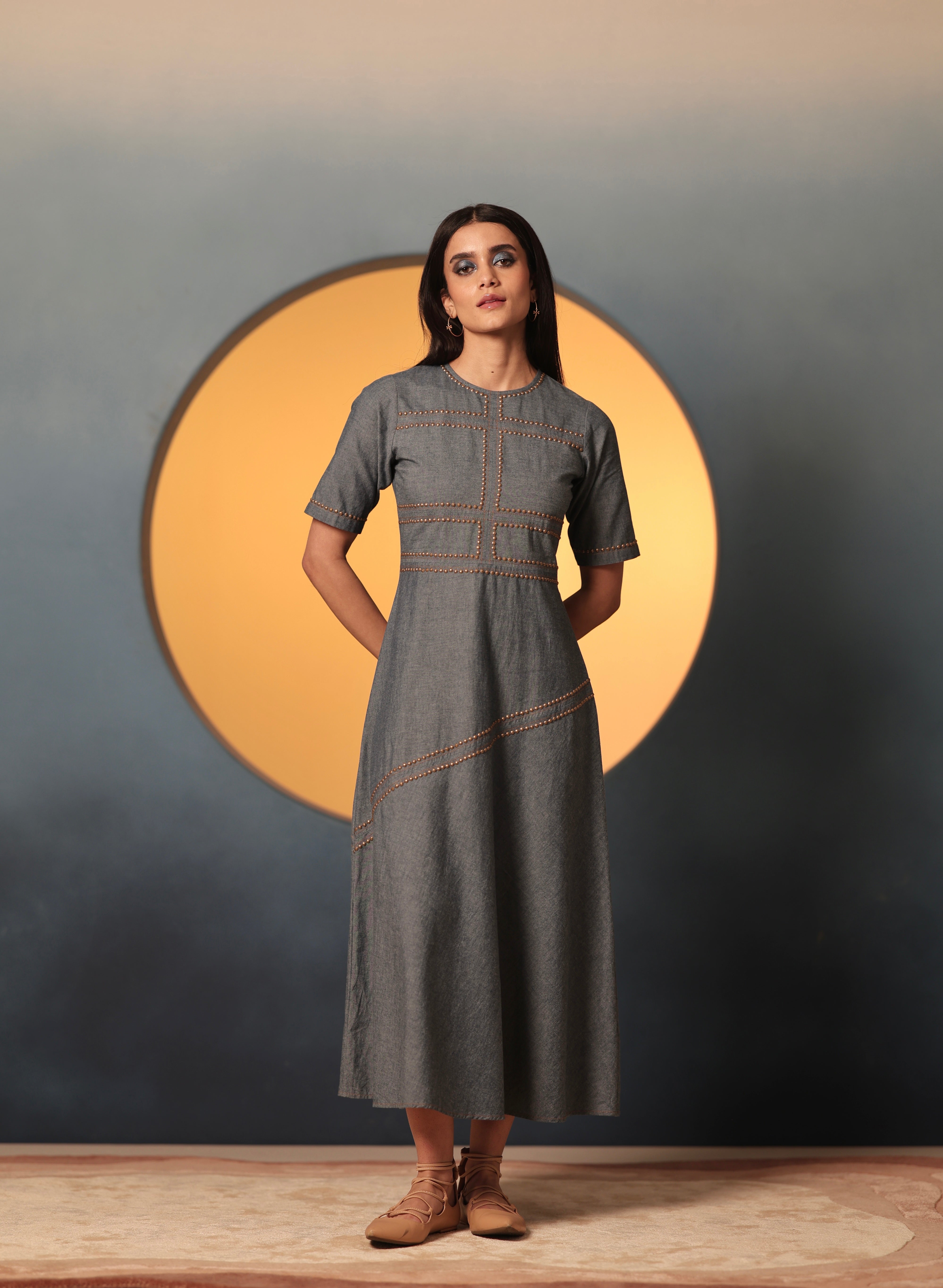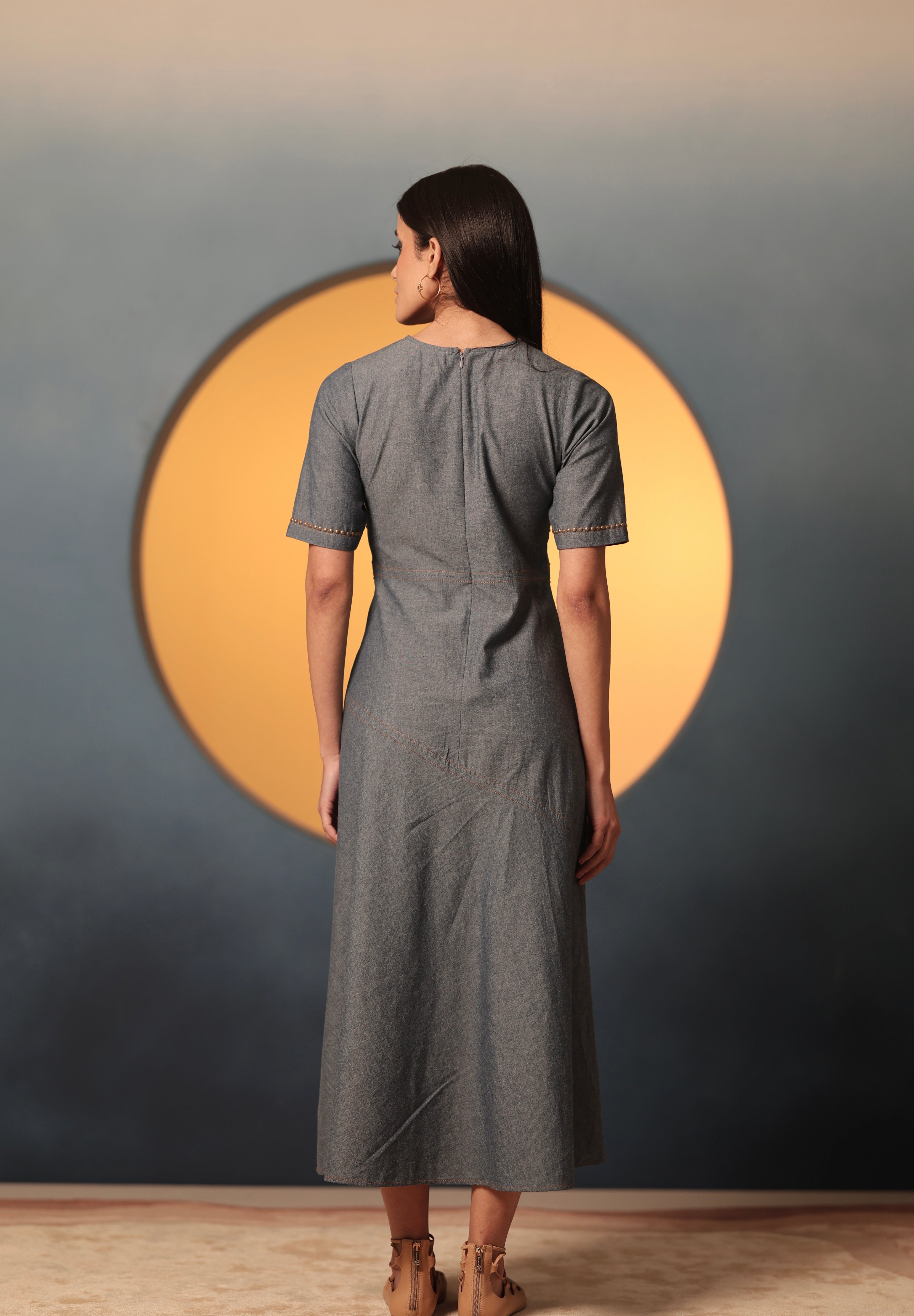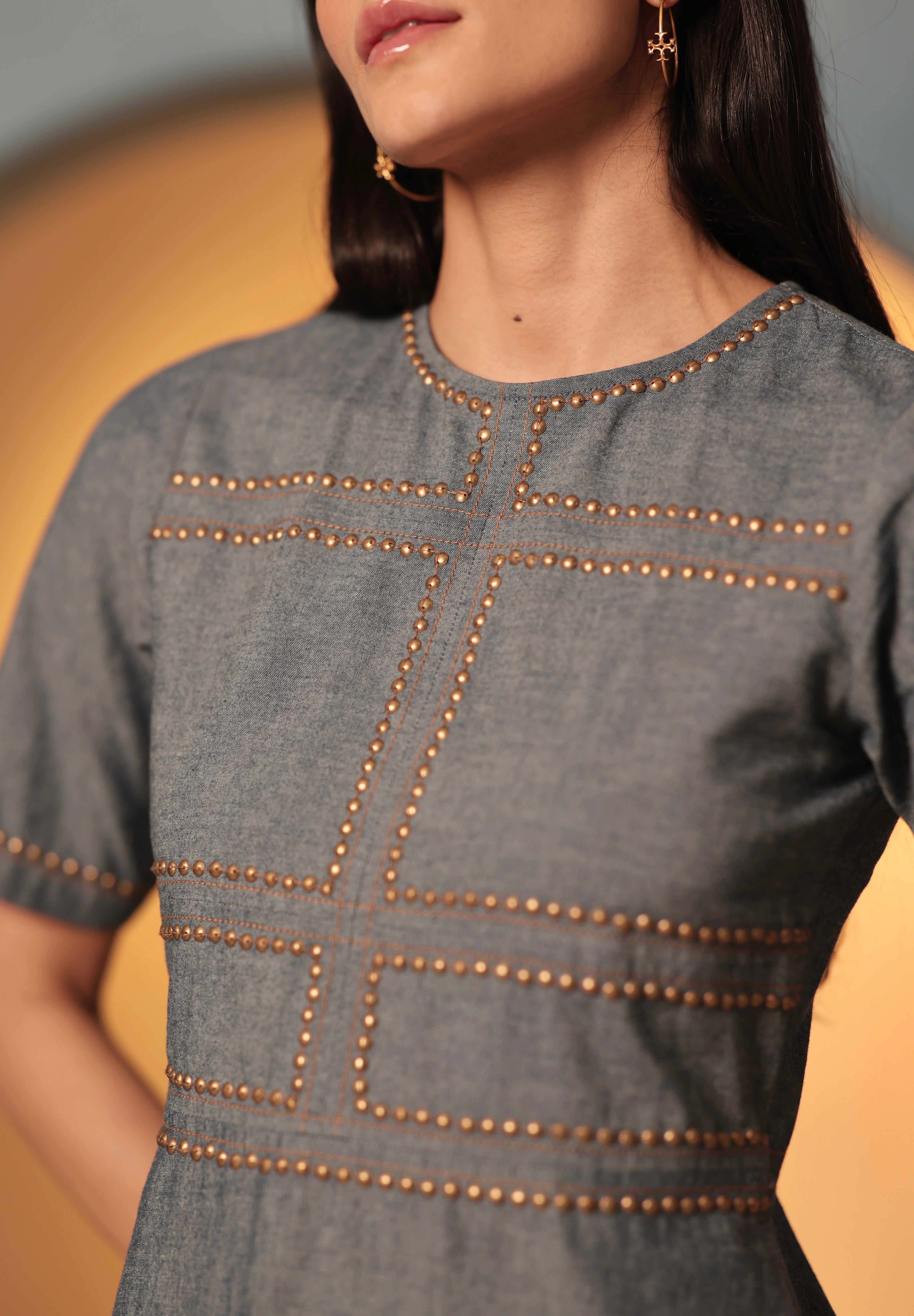 The Denim Bias Studded Midi is oh-so chic. It features a round neckline, a fitted bodice with a back zipper and a flared bias skirt. The grid-like bodice is hand adorned with metallic studs. The denim is soft to the skin, while adding structure and form. It makes for a casual yet polished look - get yours now!
