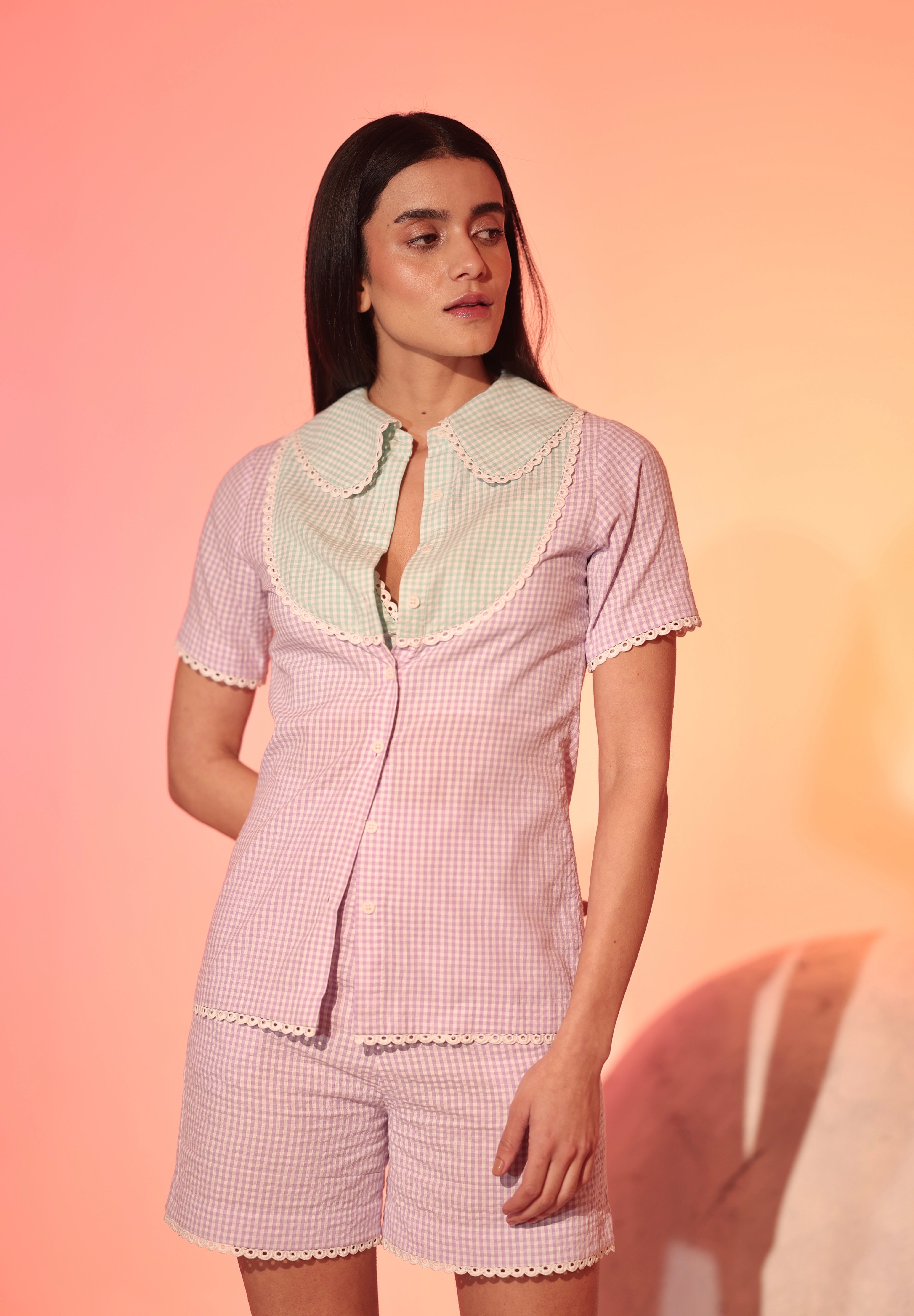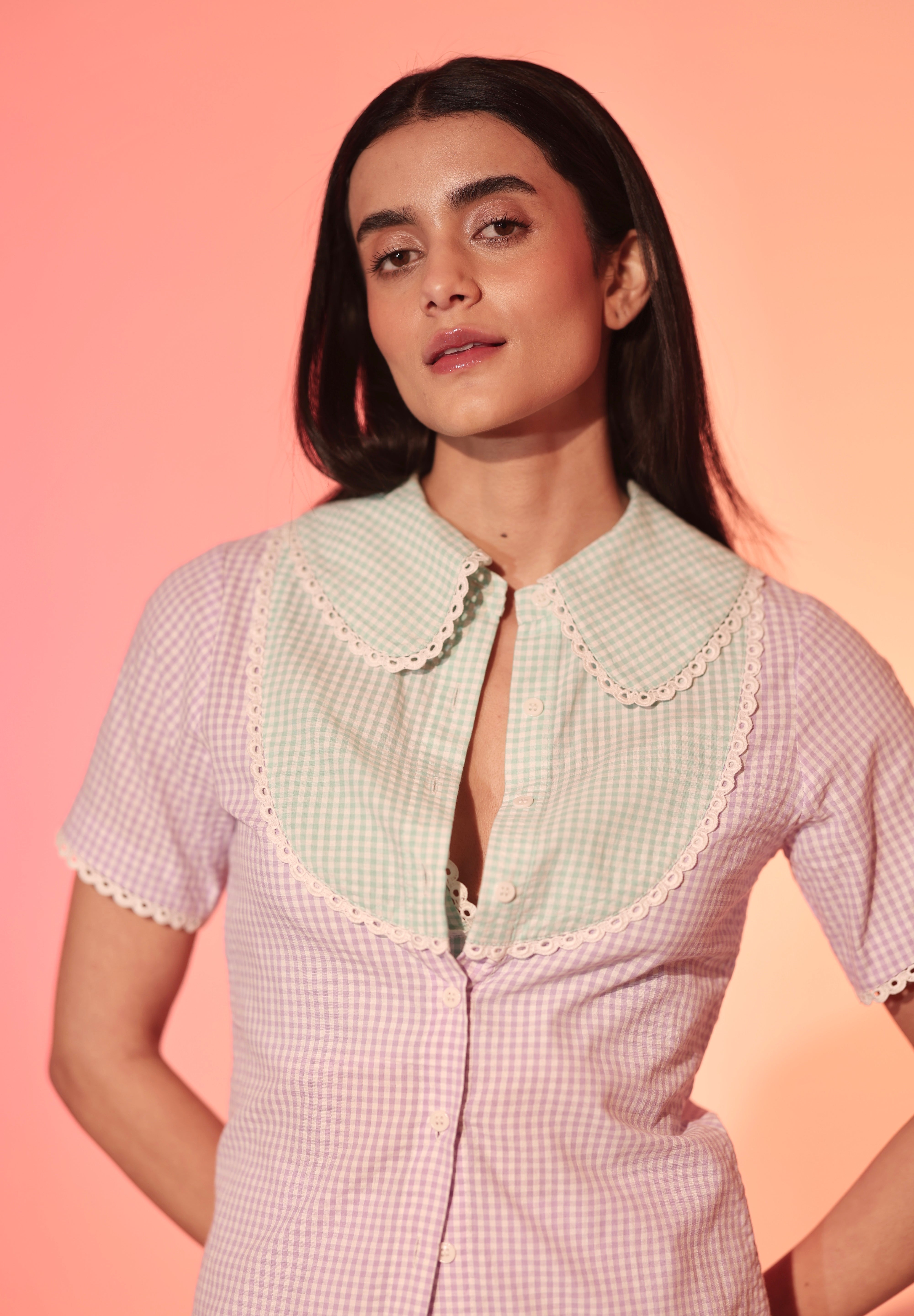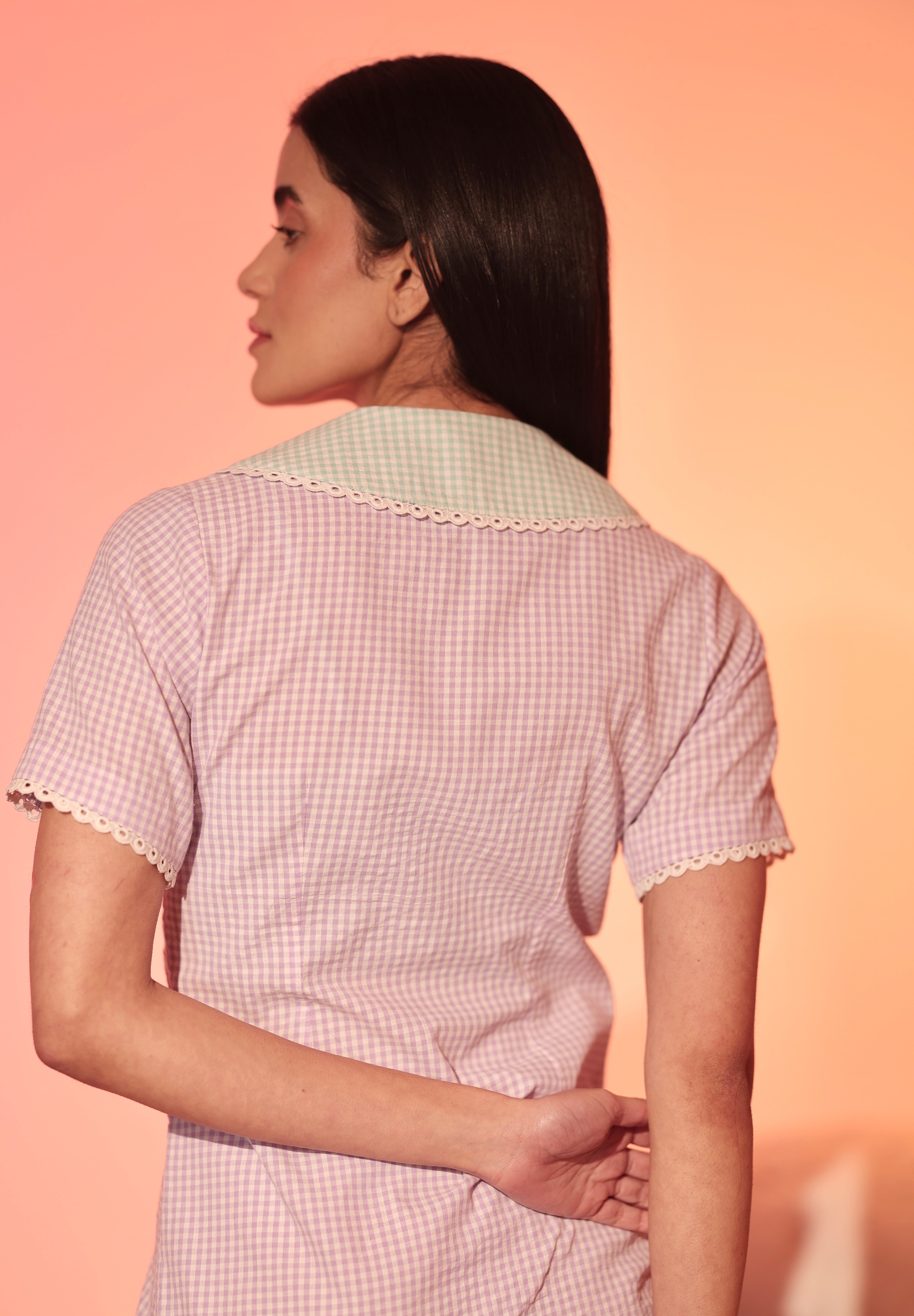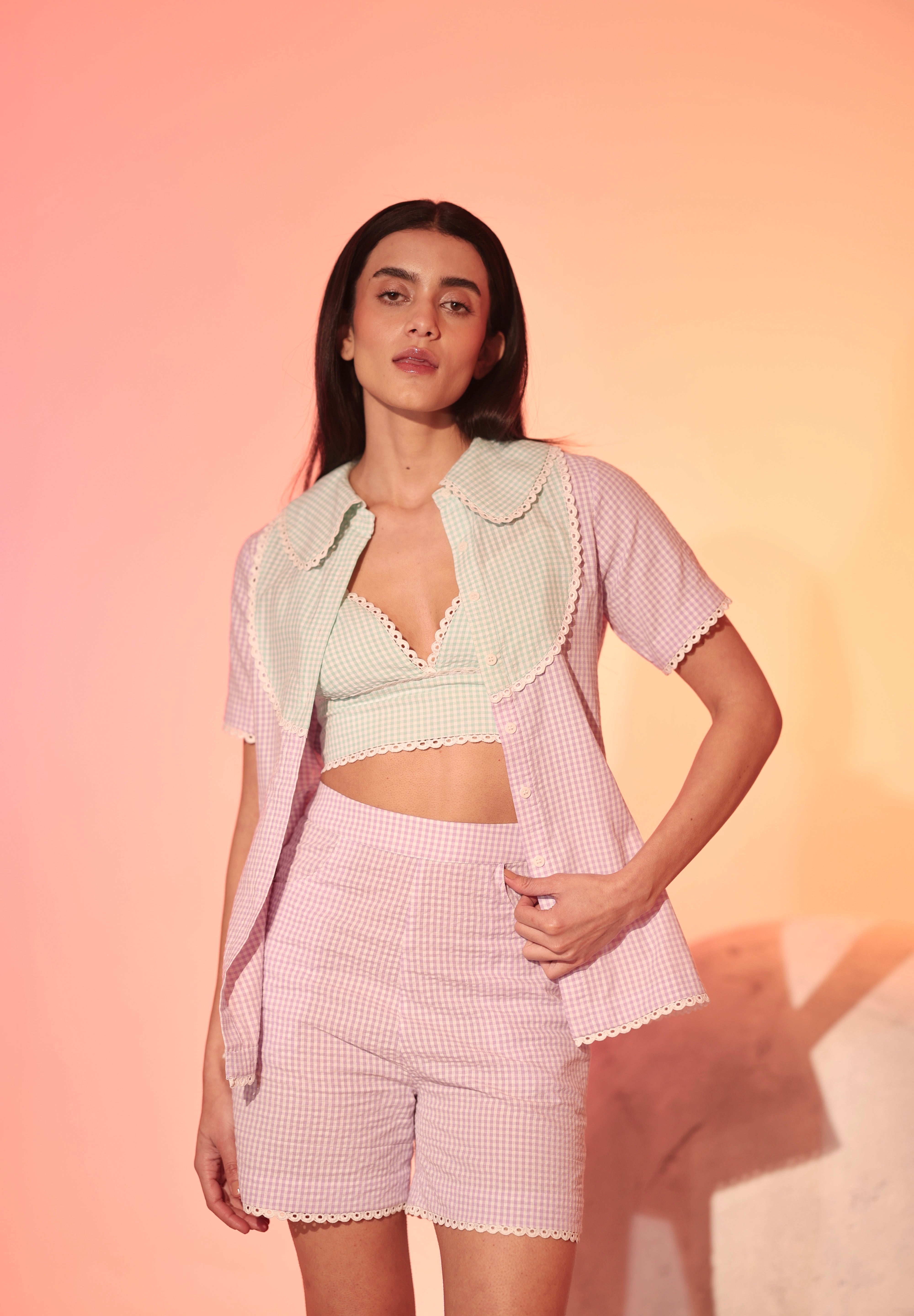 A whimsical twist on a classic, this gingham shirt features a striking, rounded sage collar against lavender tones, The lace details evoke the sparkle of early morning dewdrops resting on petals. Effortlessly chic, this piece brings a touch of nostalgia and comfort to the garden of curiosities. It has buttons down the front. Pair it with our high-waisted Lilac Lace Shorts and Dewdrop Lace Bralette for a fun casual ensemble. The Dewdrop Lace Bralette features a smocked back for a comfortable fit, and adjustable straps.