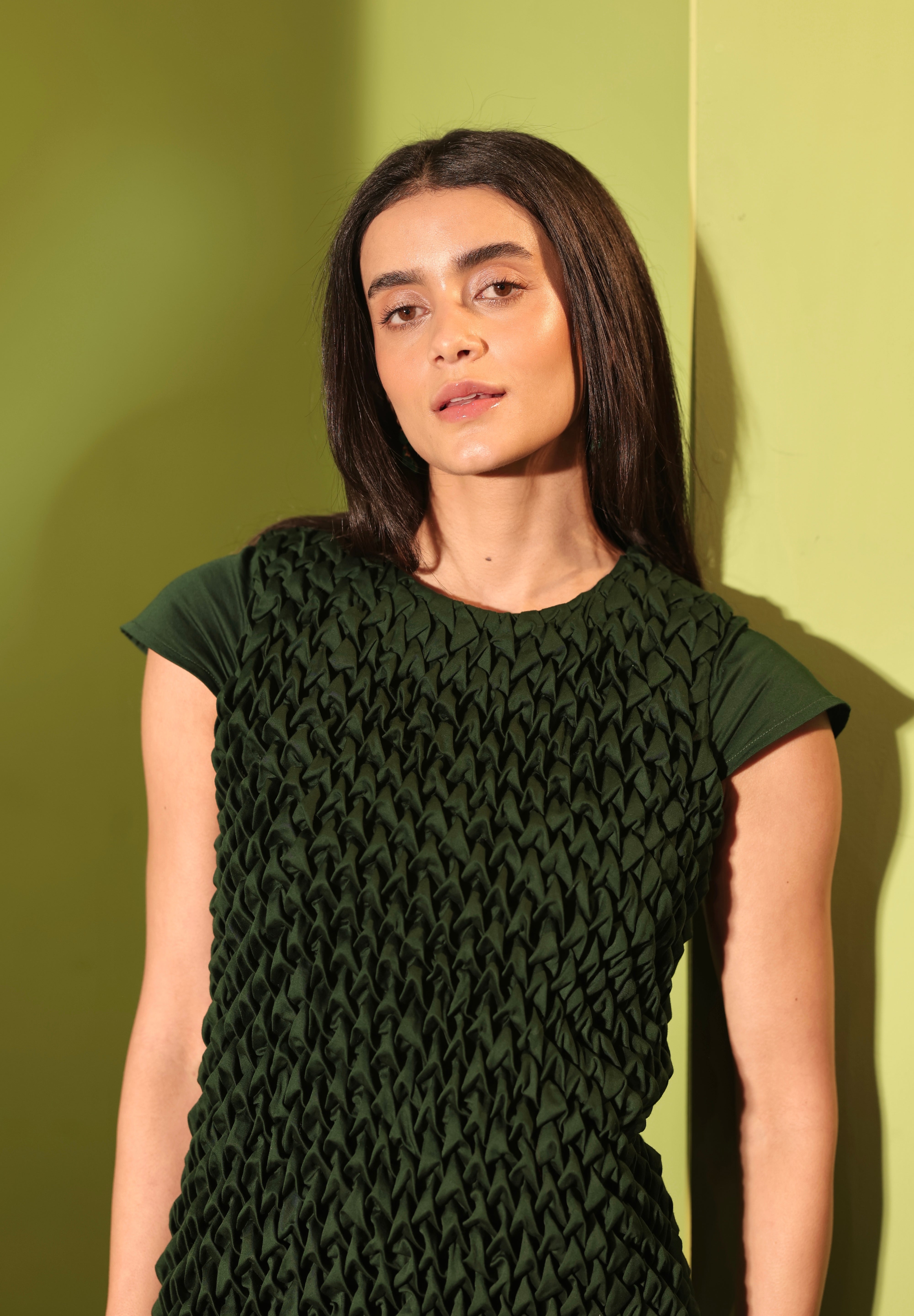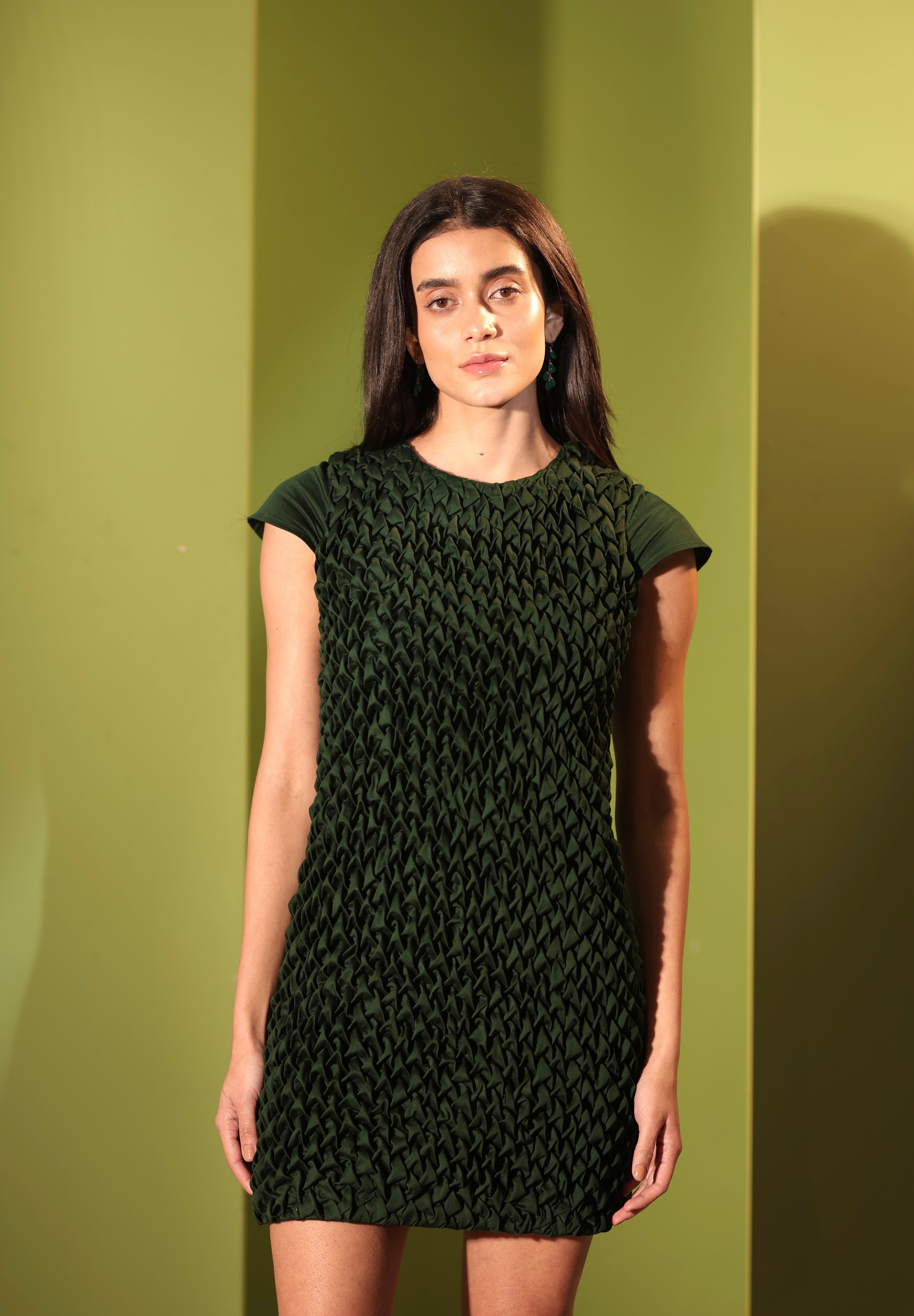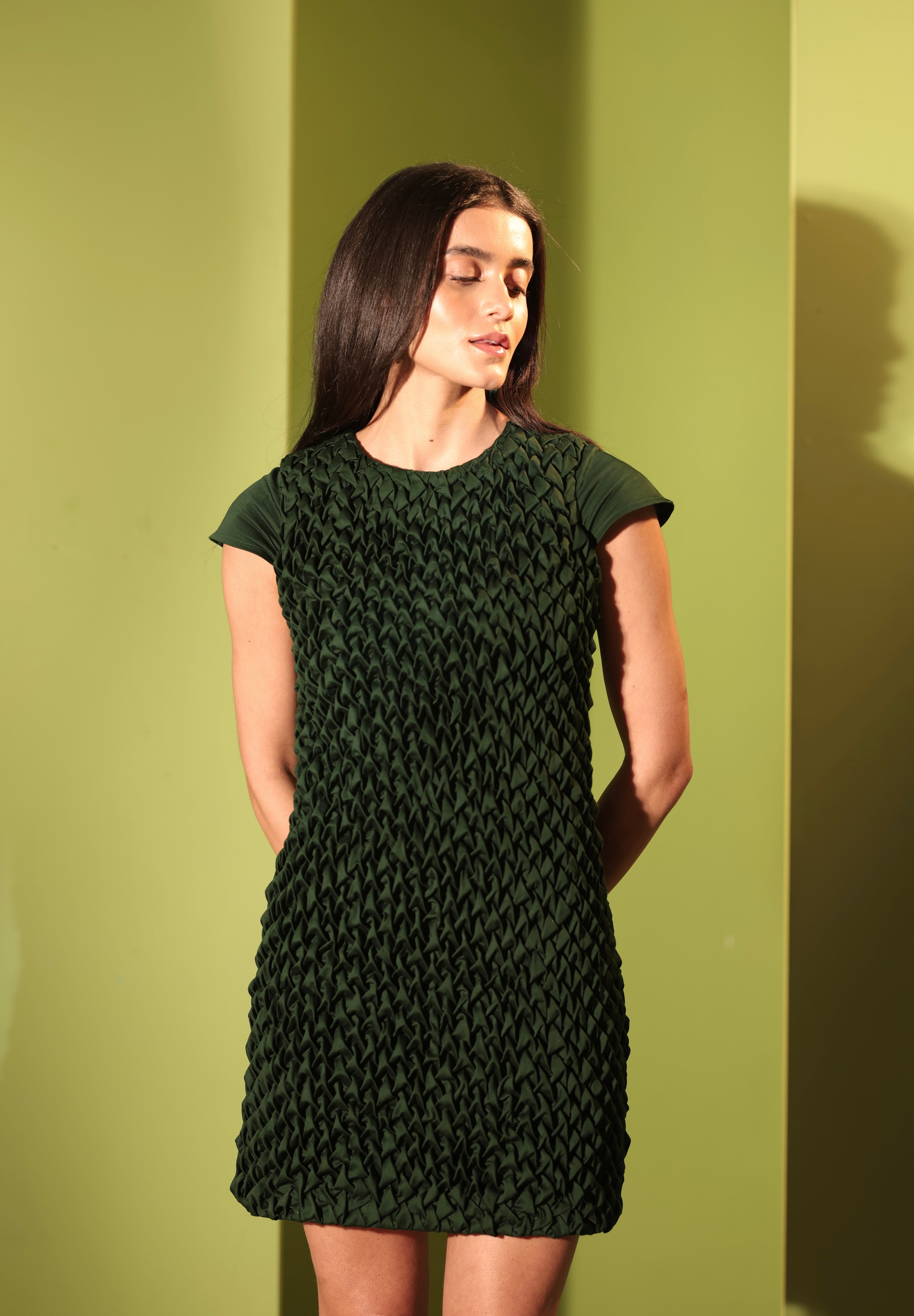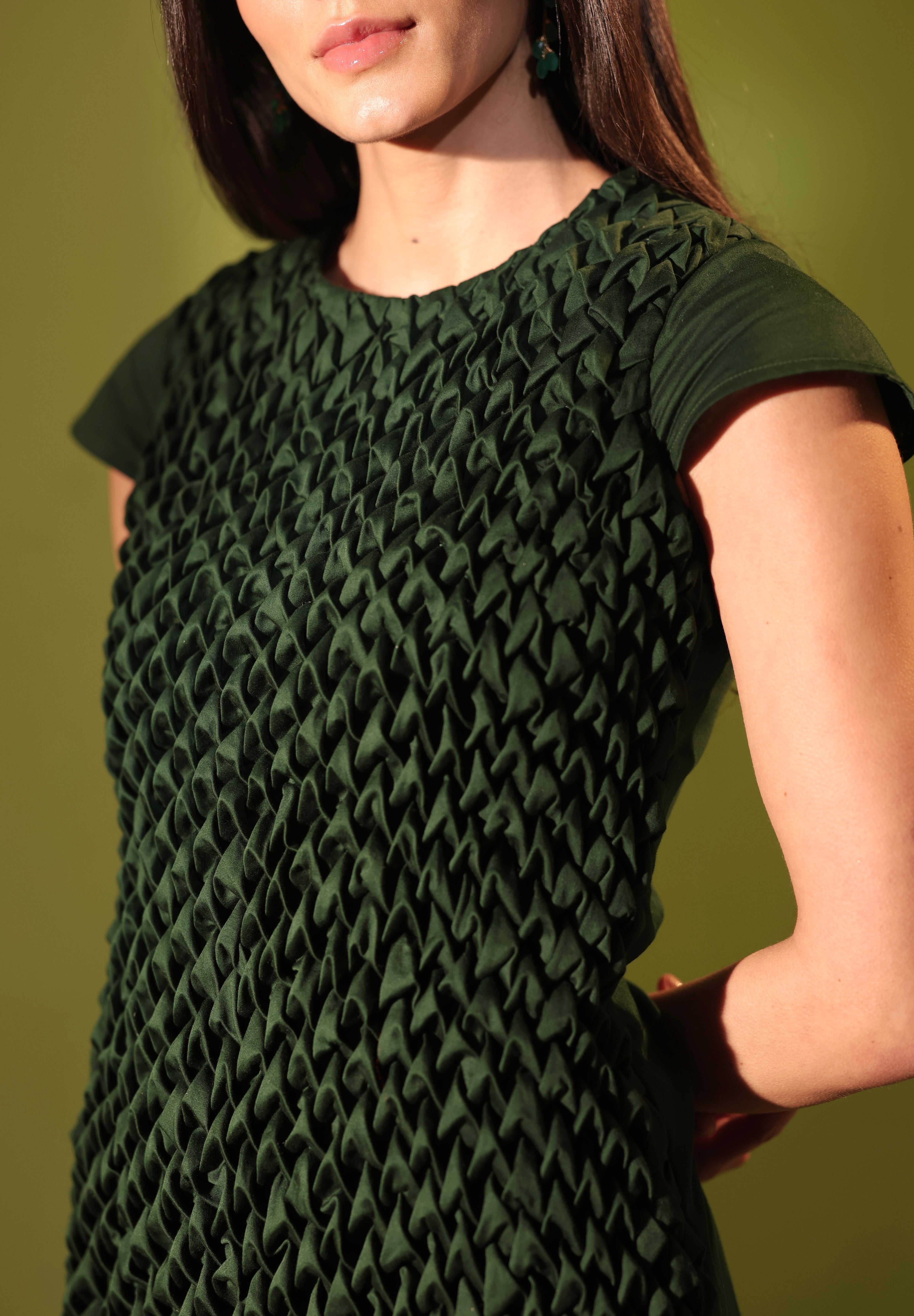 The Emerald Smocked Dress consists of highly intricate handcrafted fabric manipulation throughout the body. The silhouette consists of a simple A-line body, round neck, cap sleeves and a back zipper. The cotton satin fabric is butter soft to the skin, creating both visual interest and structure. Make a statement in this stylish yet comfortable dress, all while basking in the glory of the richness of the royal emerald green colour.