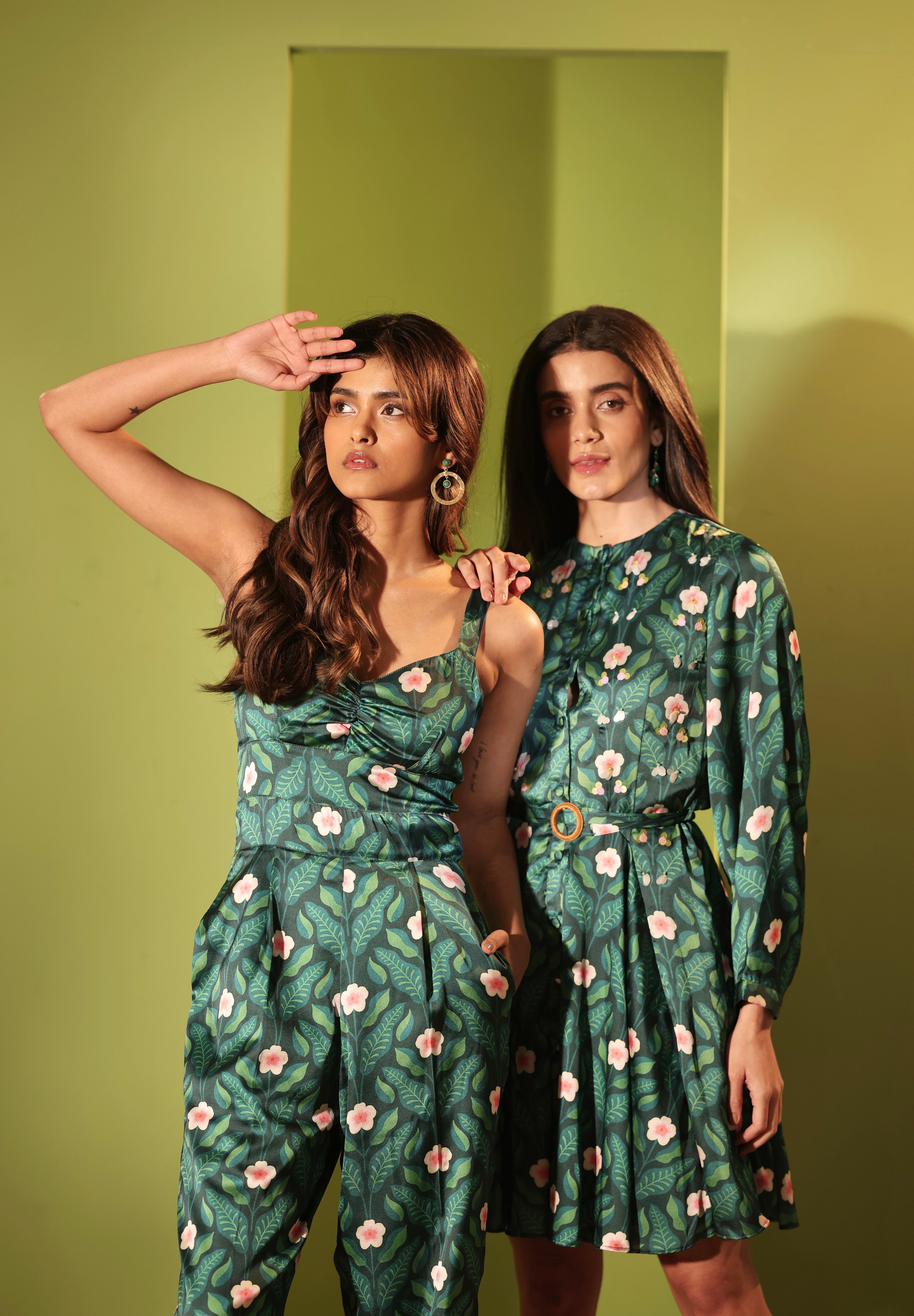 The Enchanted Garden Jumpsuit is lively and vivacious! It features a sculpted bodice, and structured pant legs. This piece brings an air of bold femininity with structure. The print is like an enchanting green secret garden, adorned with delicate pink and white blossoms and finished with pearly accents - this piece captures the romance of nature in full bloom. It has a back zipper, thick straps, fully lined body and pleated trousers. It also has size pockets to embrace the utilitarian nature of a traditional jumpsuit. Wear it as is, or use it as a fun piece to layer and play with!