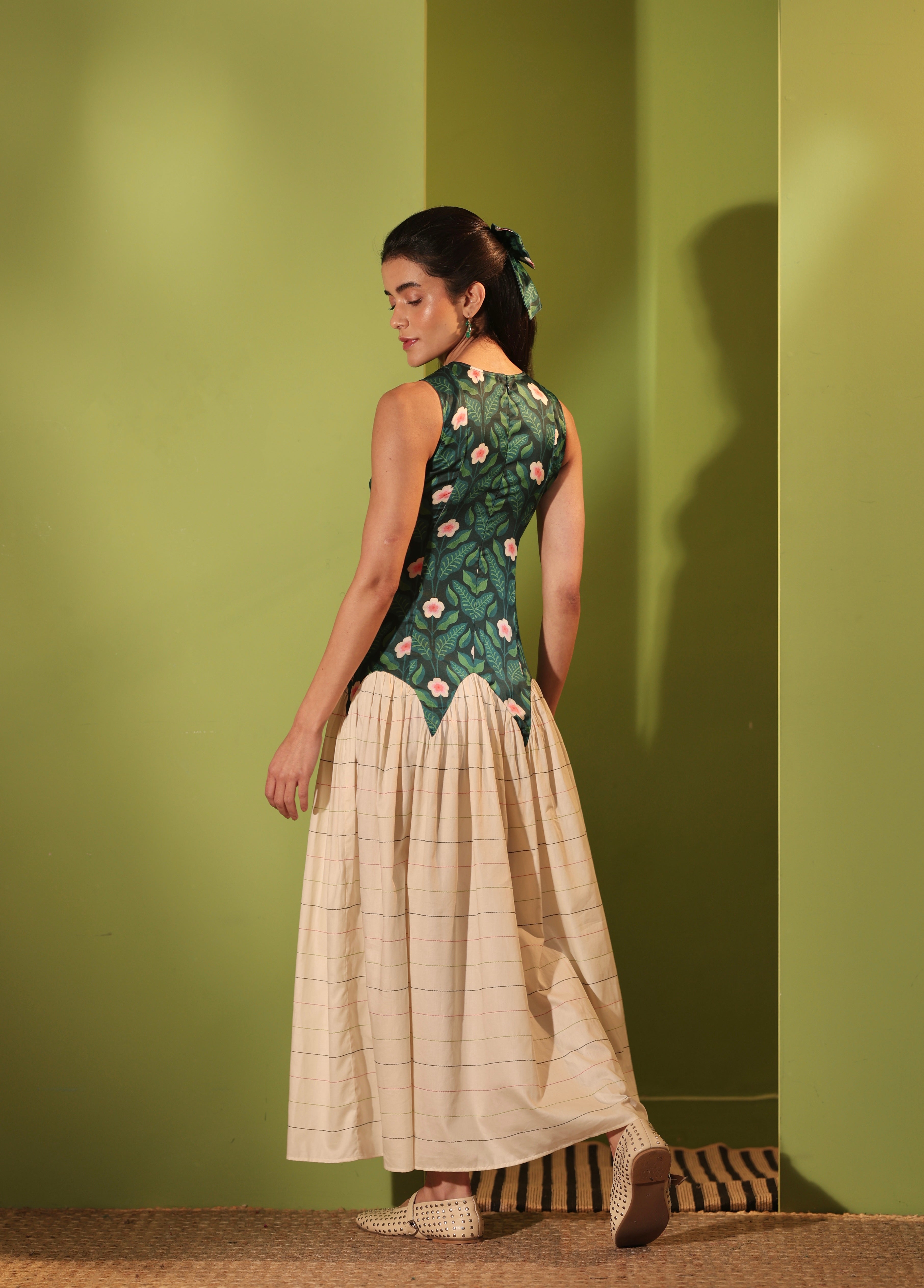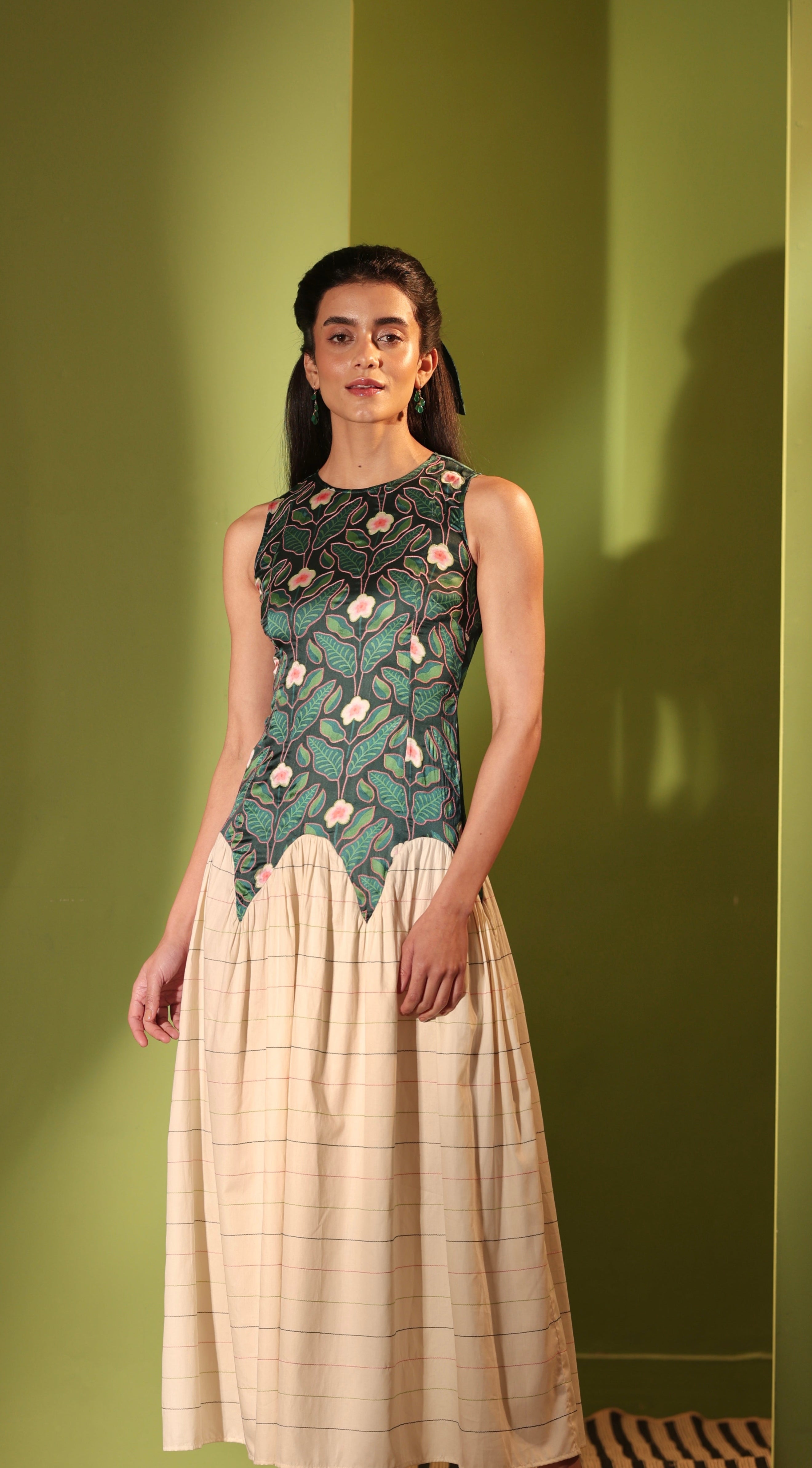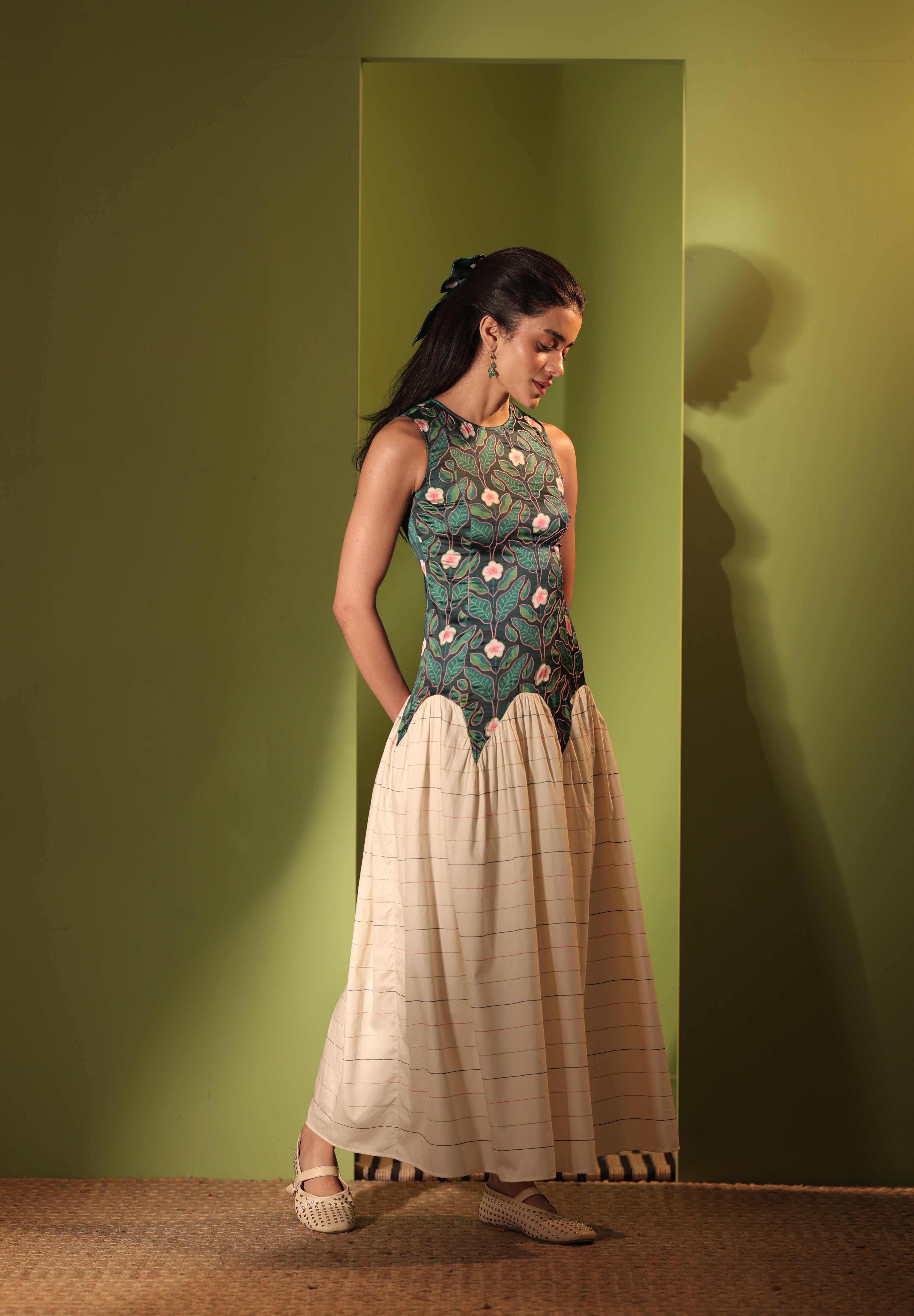 The Rainforest Embellished Midi exudes beauty and confidence. The bodice is fitted with a round neckline and back zipper. It has a bold print reflecting an enchanting forest-like landscape and delicate blossoms. The blossoms and foliage are further highlighted with delicate chain hand embroidery - bringing out their true beauty and fragility. The attached skirt at the bottom has flare and volume. It is further detailed with horizontal line embroidery - which perfectly juxtaposes the floral top. A true masterpiece that celebrates rich artistry.