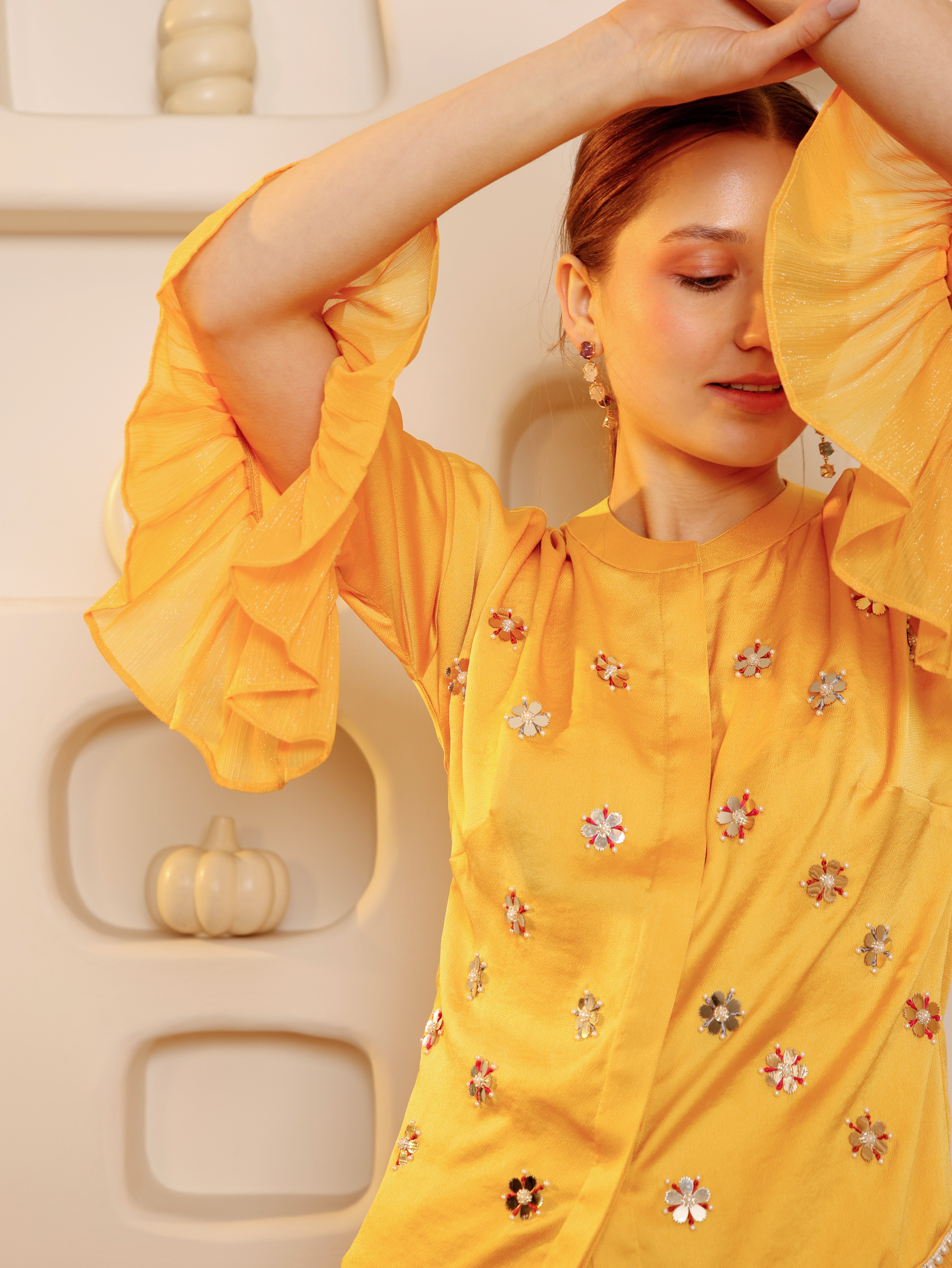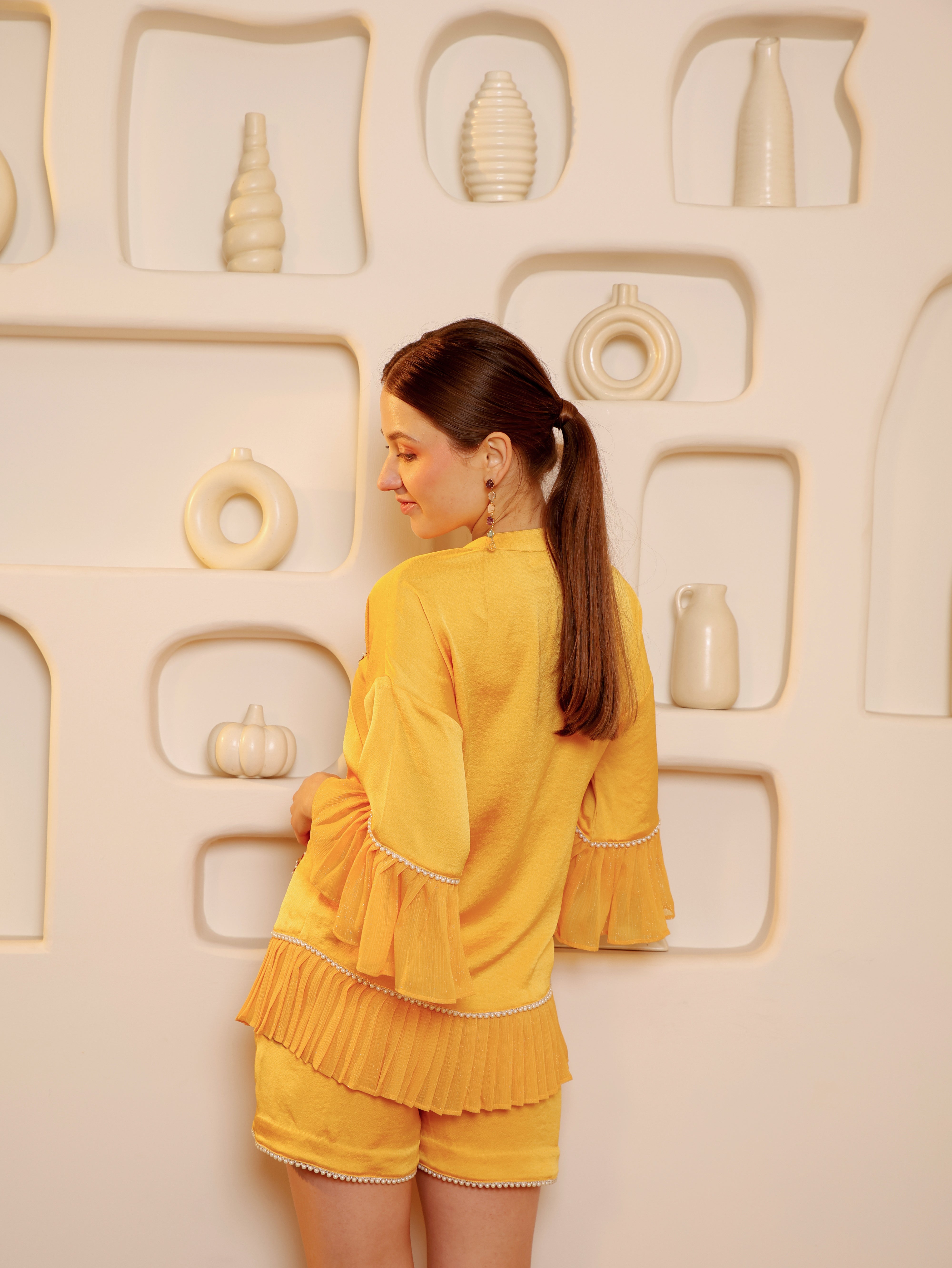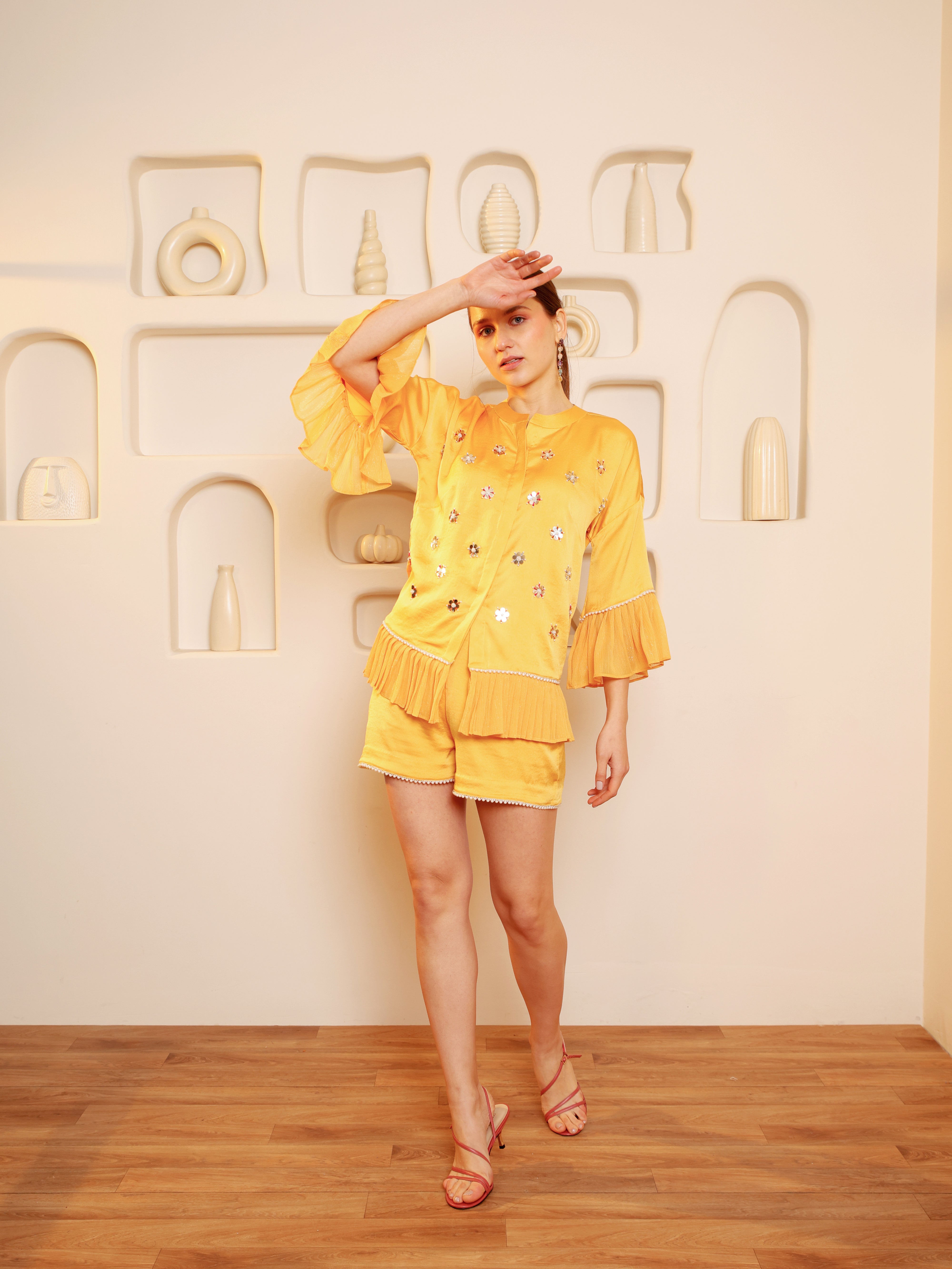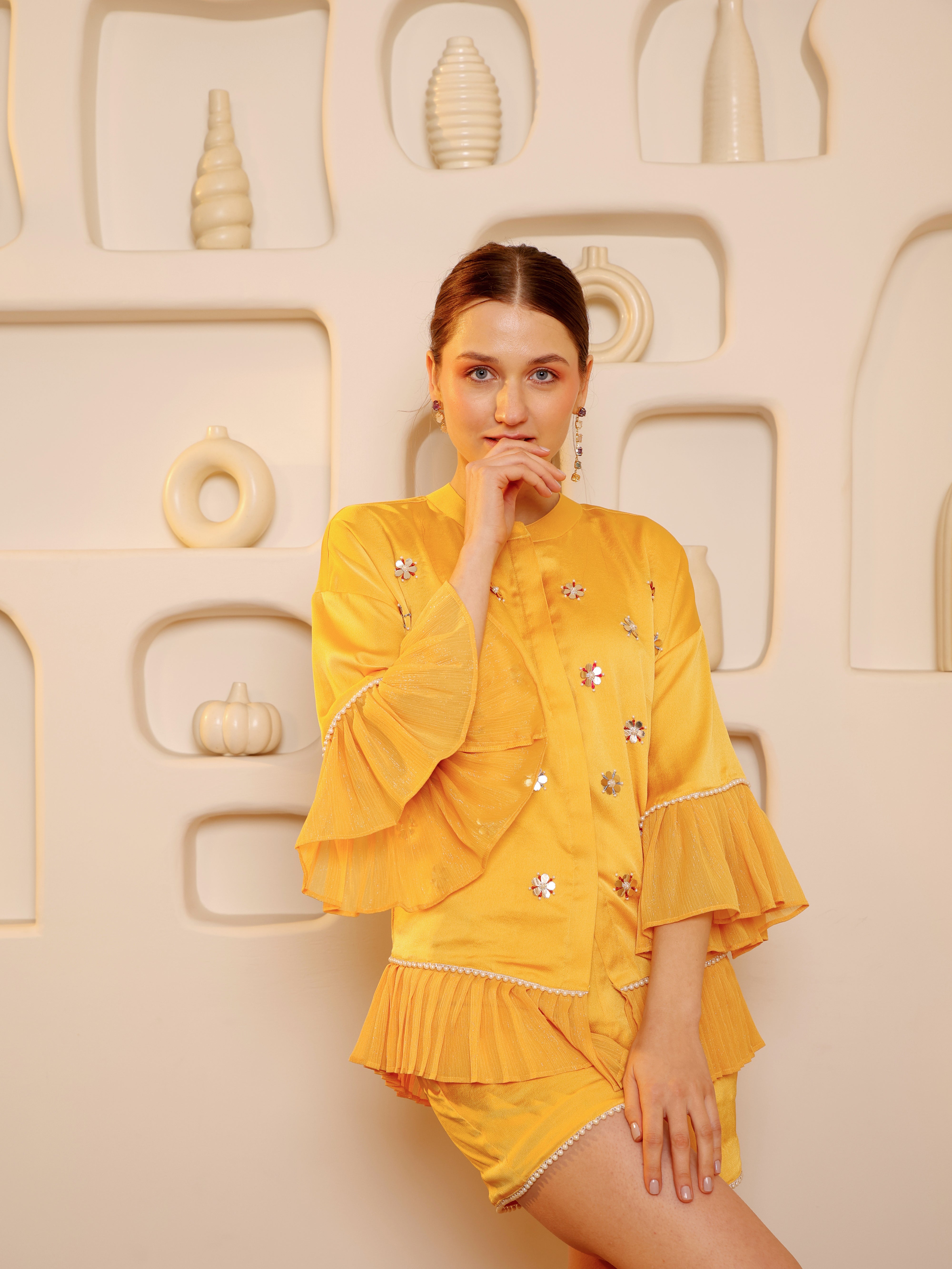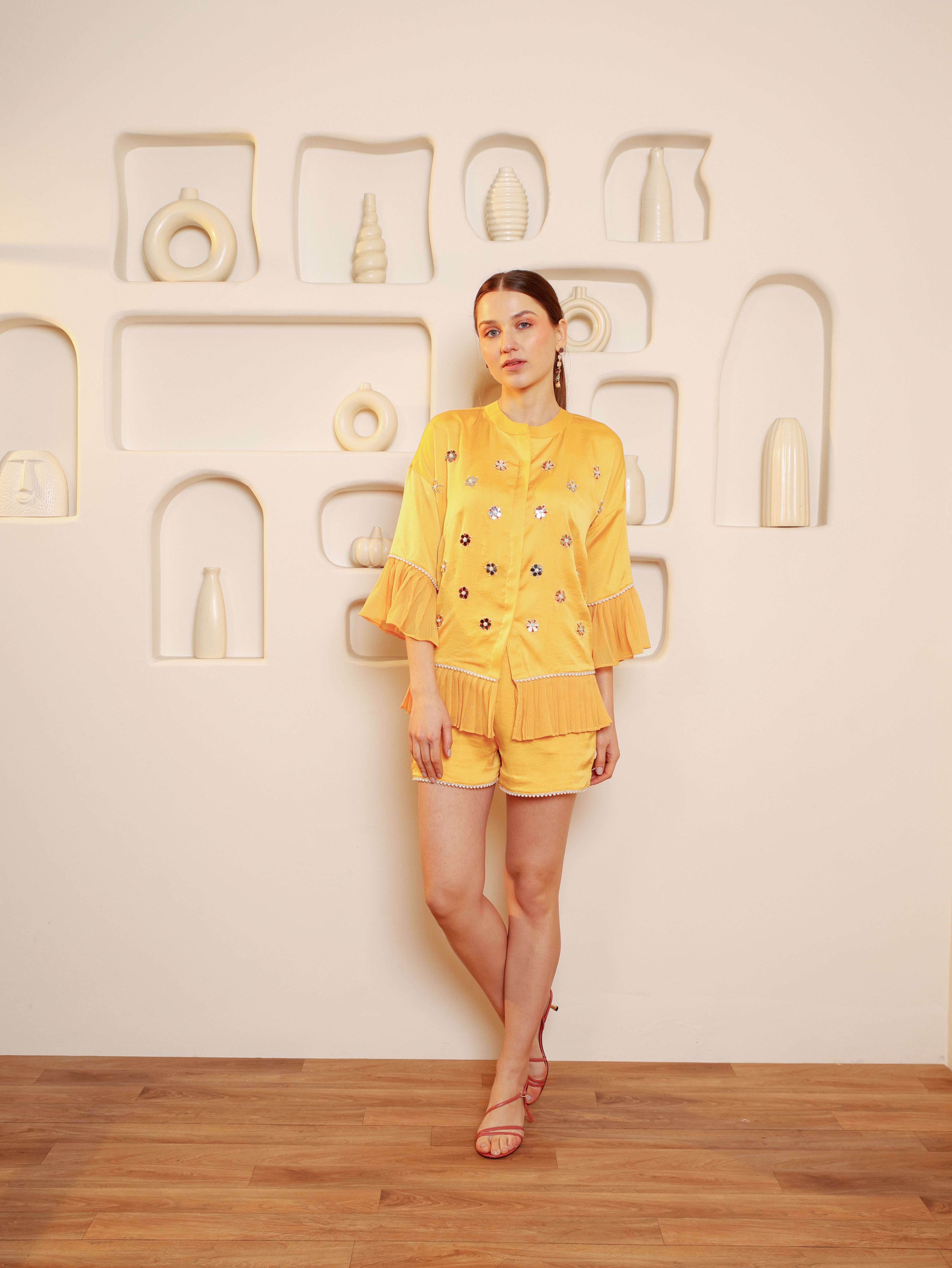The Golden Poppy Co-ord Set is delicately embellished with sequins, beads and pearl trims. The sleeves and hem are circularly trimmed with georgette pleats. The shorts are high-waisted with pockets. The shirt has front buttons and a Chinese collar.