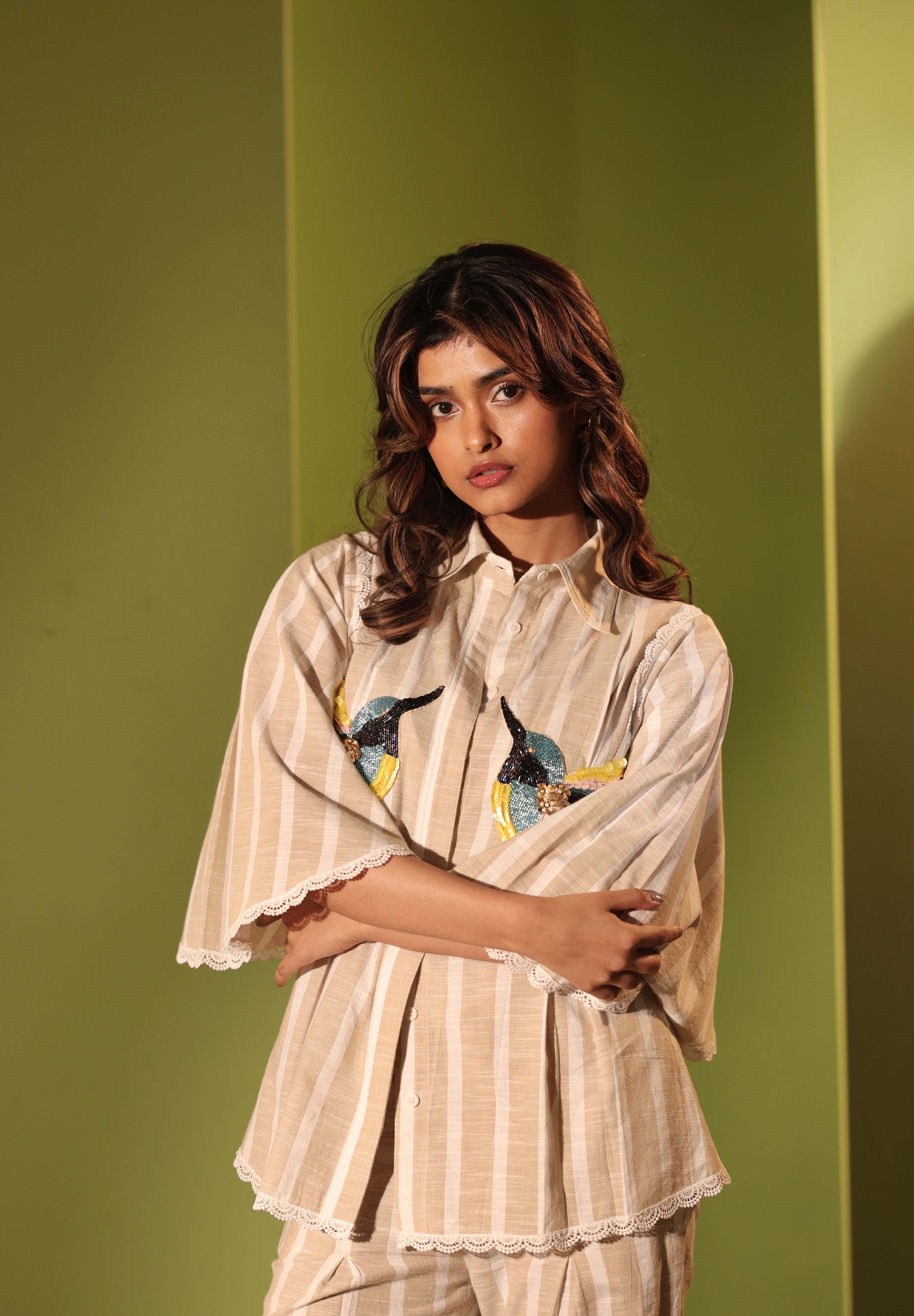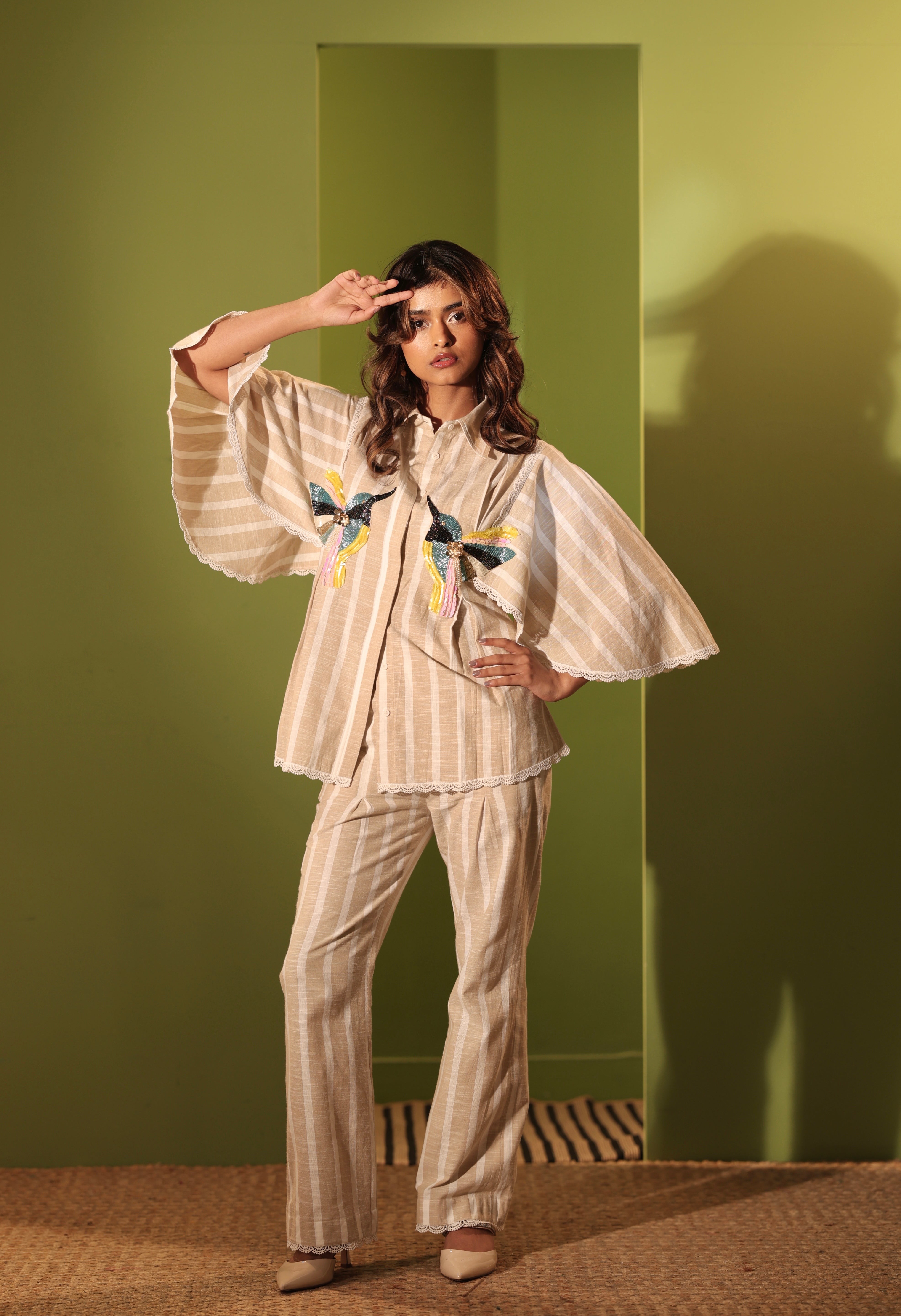 The ivory stripes meet iridescent hand-embroidered hummingbirds, creating a dreamlike co-ord set with scalloped lace trims. The piece reflects the delicate balance of flight and floral harmony found in lush gardens. The shirt has a relaxed fit, with unique pleating details to define the waist. It also features unique oversized sleeves and button closures down the front. Pair it with our matching high-waisted Striped Pants with pleated shaping on the thighs and lace detailing. Wear it with our matching lace bralette to transform it from everyday chic to beachy boho! The bralette has a smocked back for a comfortable fit, as well as adjustable straps.