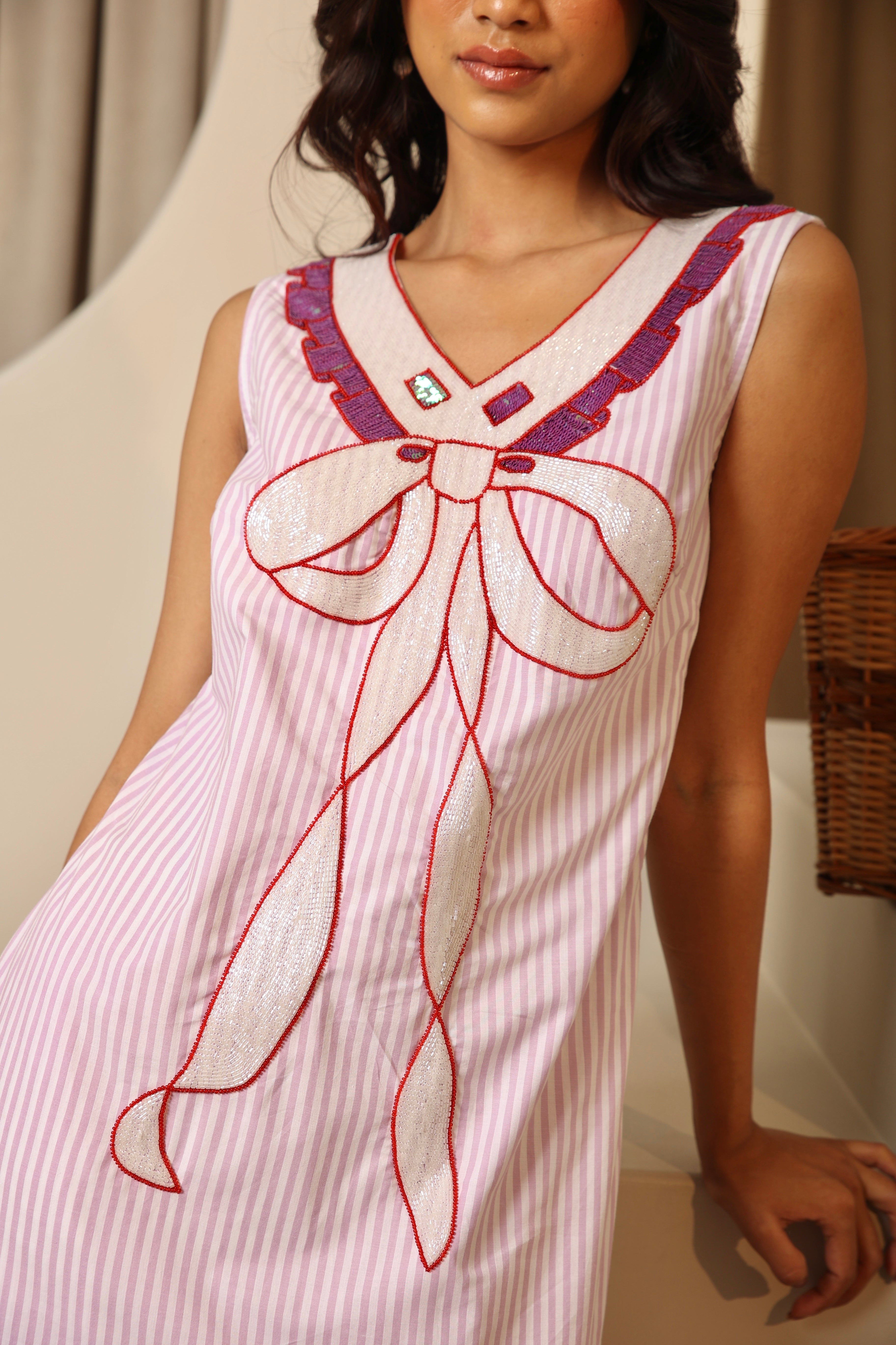 The Lilac Striped Bow Midi has a lilac and ivory striped pattern with a large meticulously beaded bow on the front. It is sleeveless, and features a V-neckline and a ruffled hem. The dress is midi-length with a relaxed fit. The fabric is light and perfect for summer wear. It features a back zipper. Easy to dress up or dress down - get yours now!