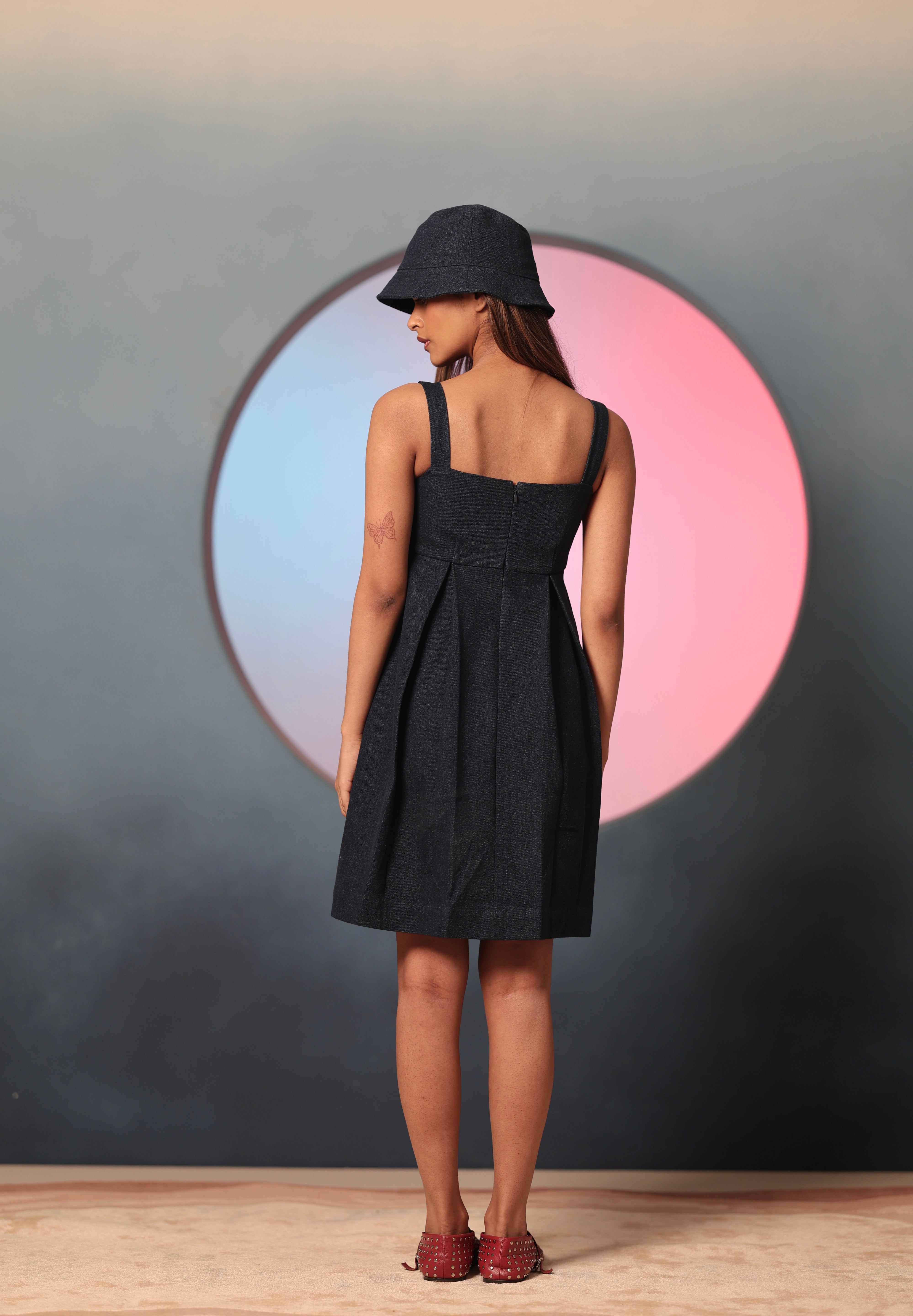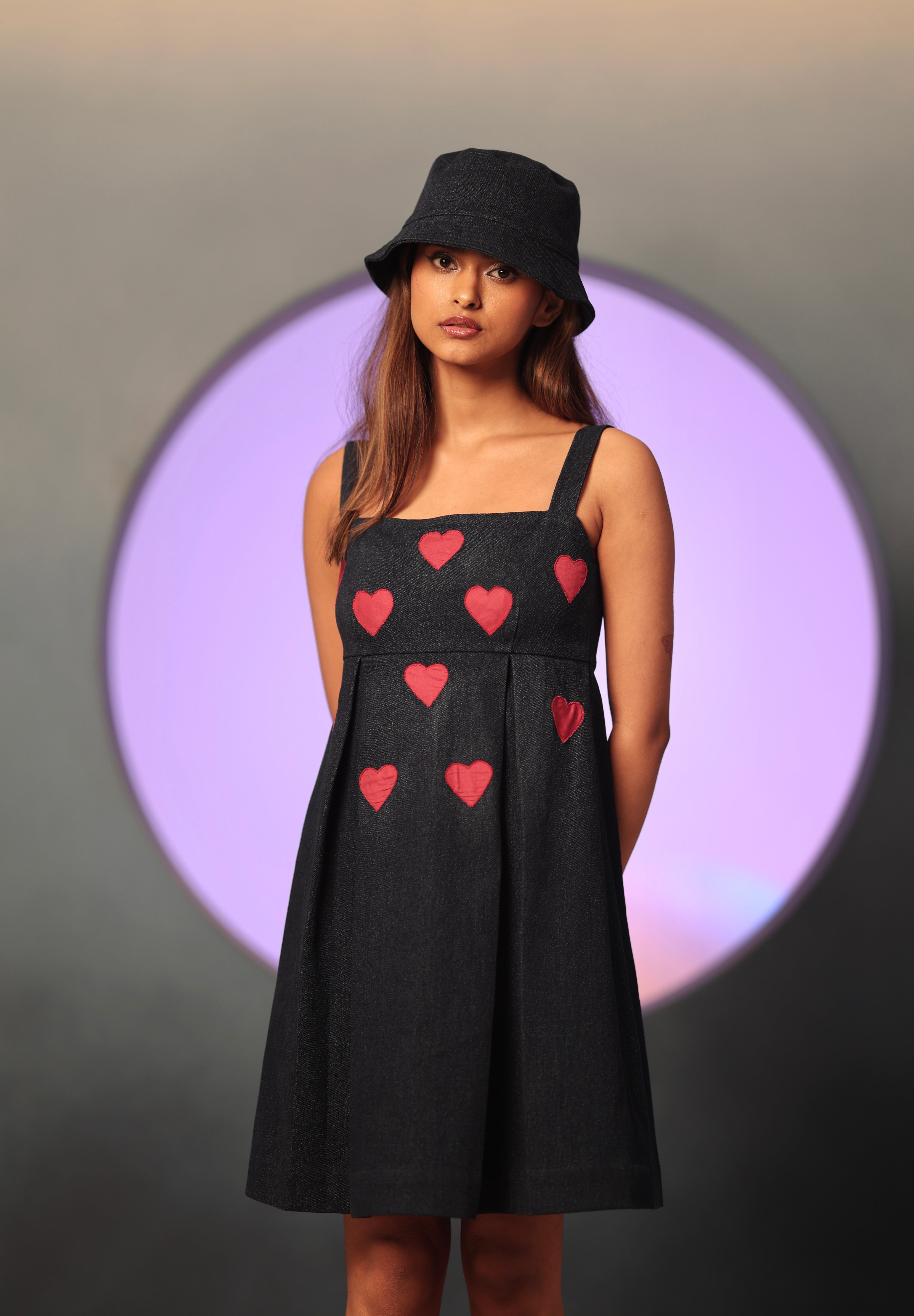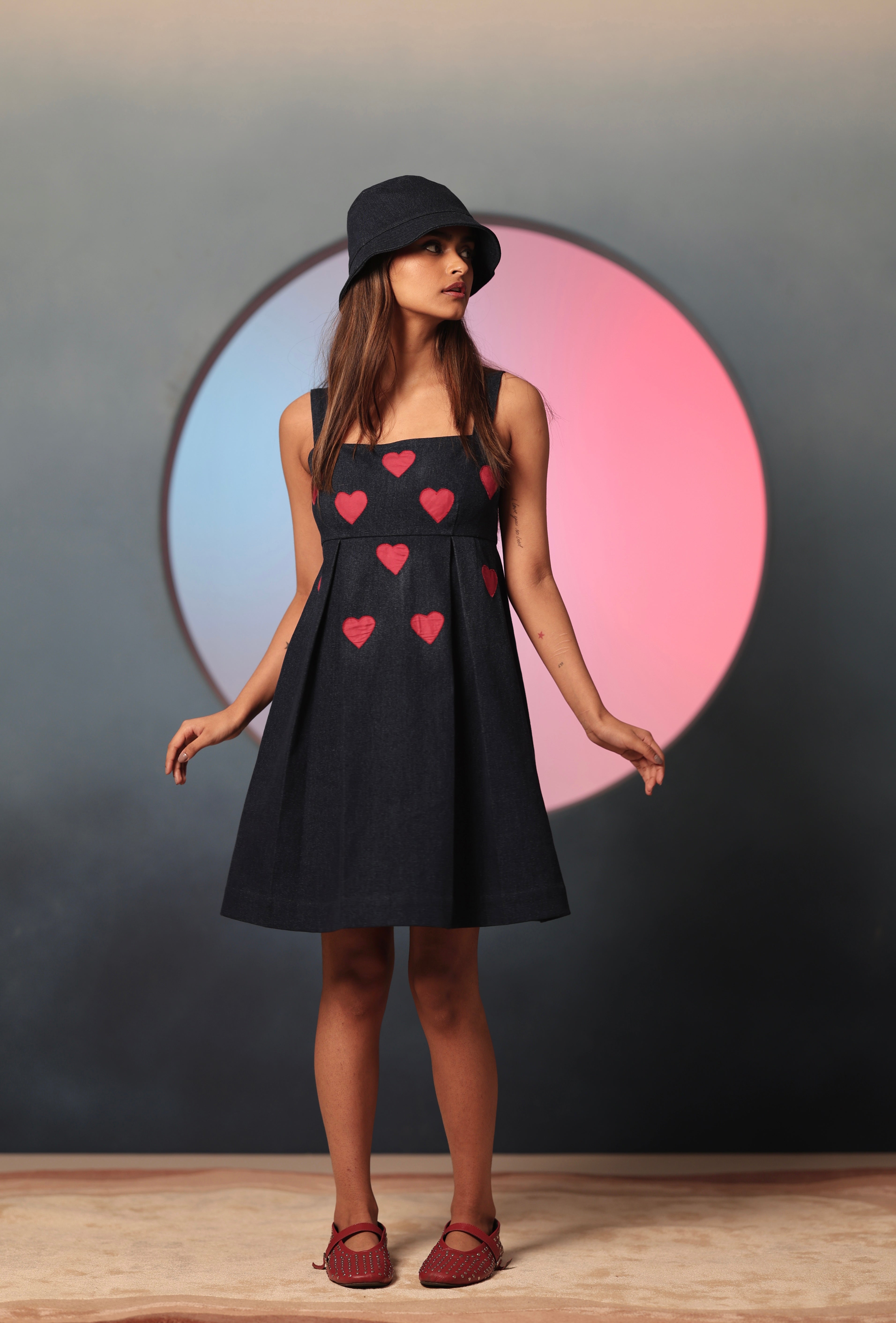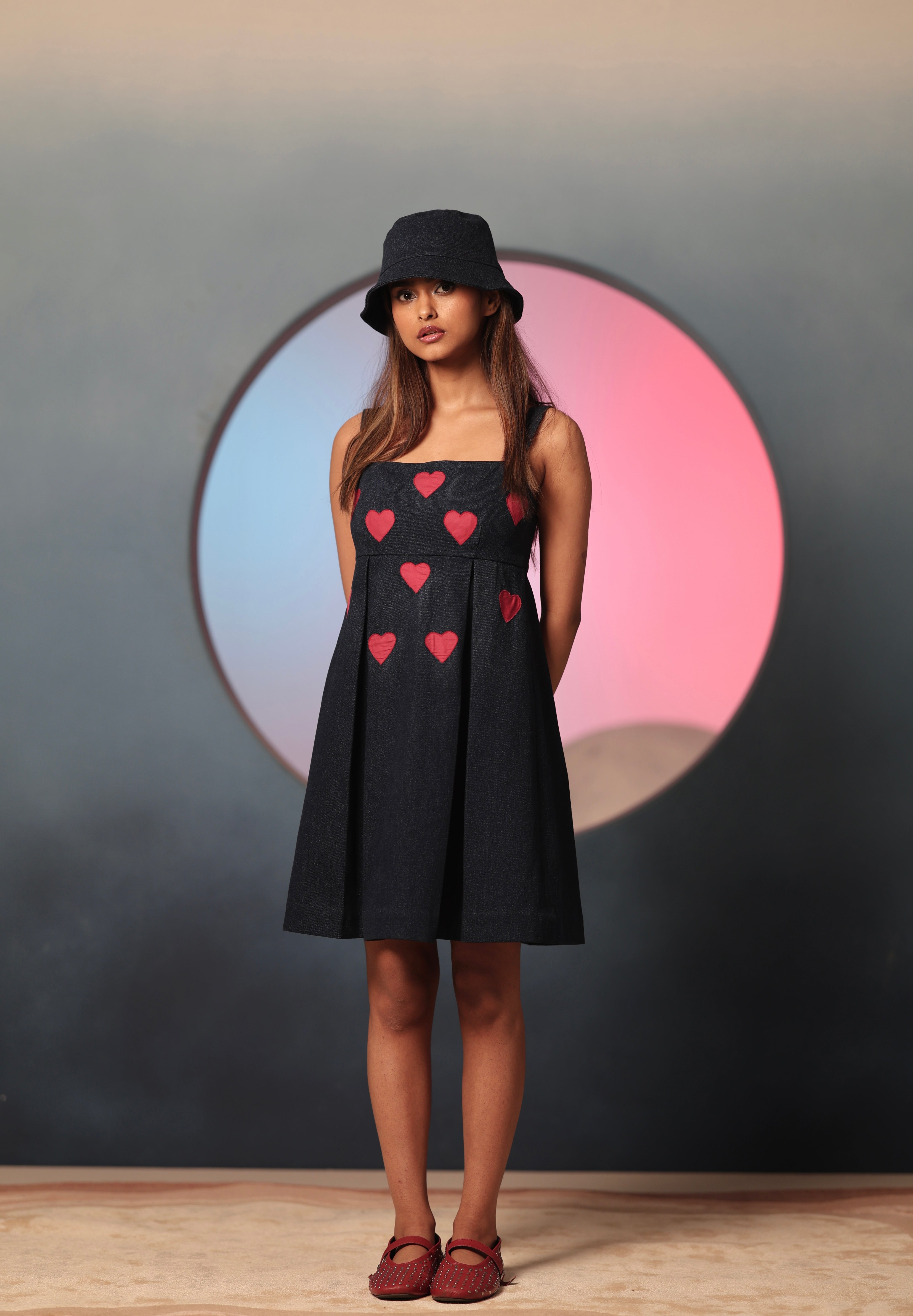 The Little Hearts Denim Mini is the IT Girl dress of the season. It has a fitted bodice, thick straps and a pleated body. Made of a structured and solid denim, it is contrasted with little red patchwork hearts that are hand embroidered on the front of the body. The little hearts add a touch of feminine grace and colour to the look. It features a back zipper.