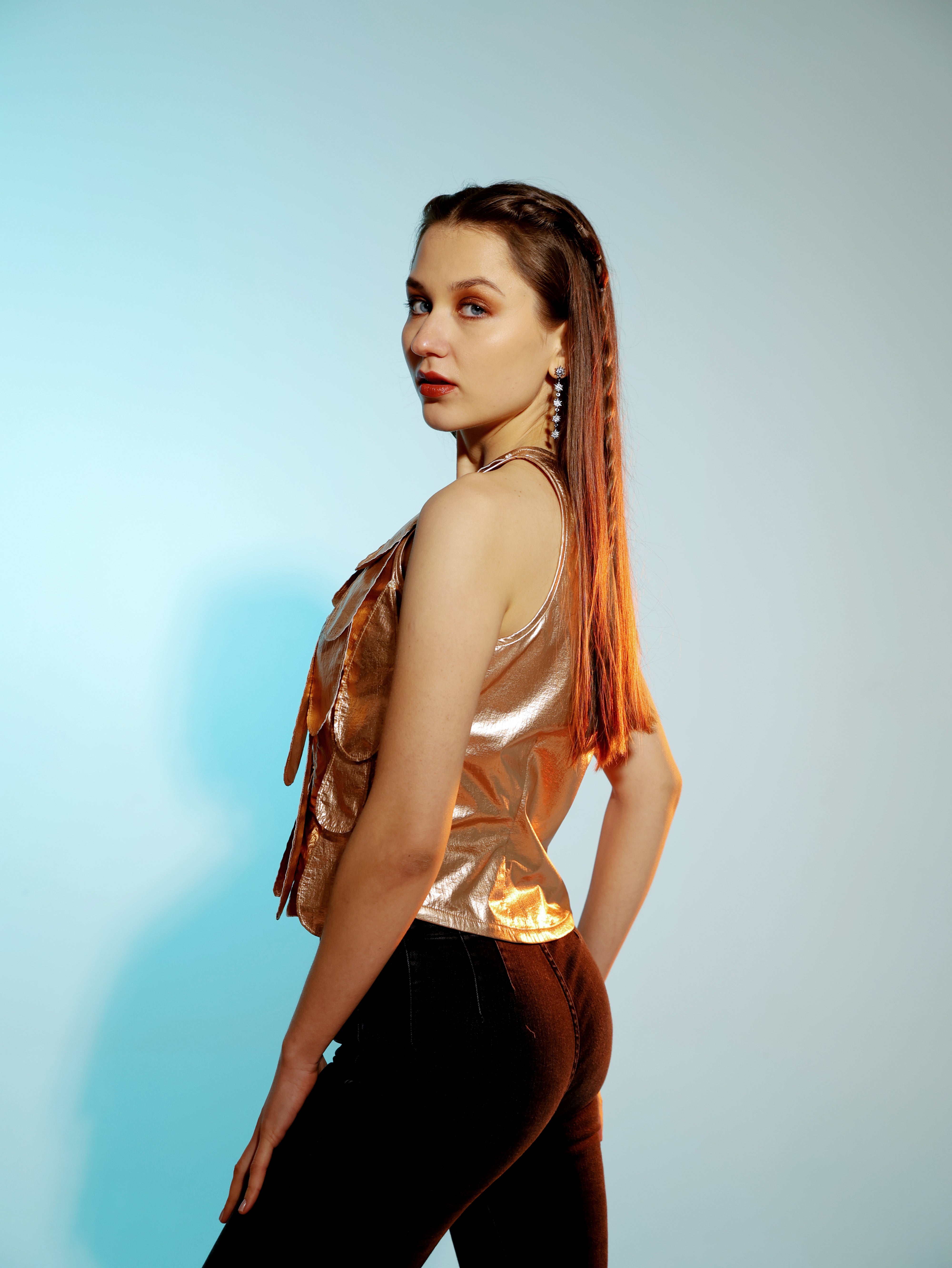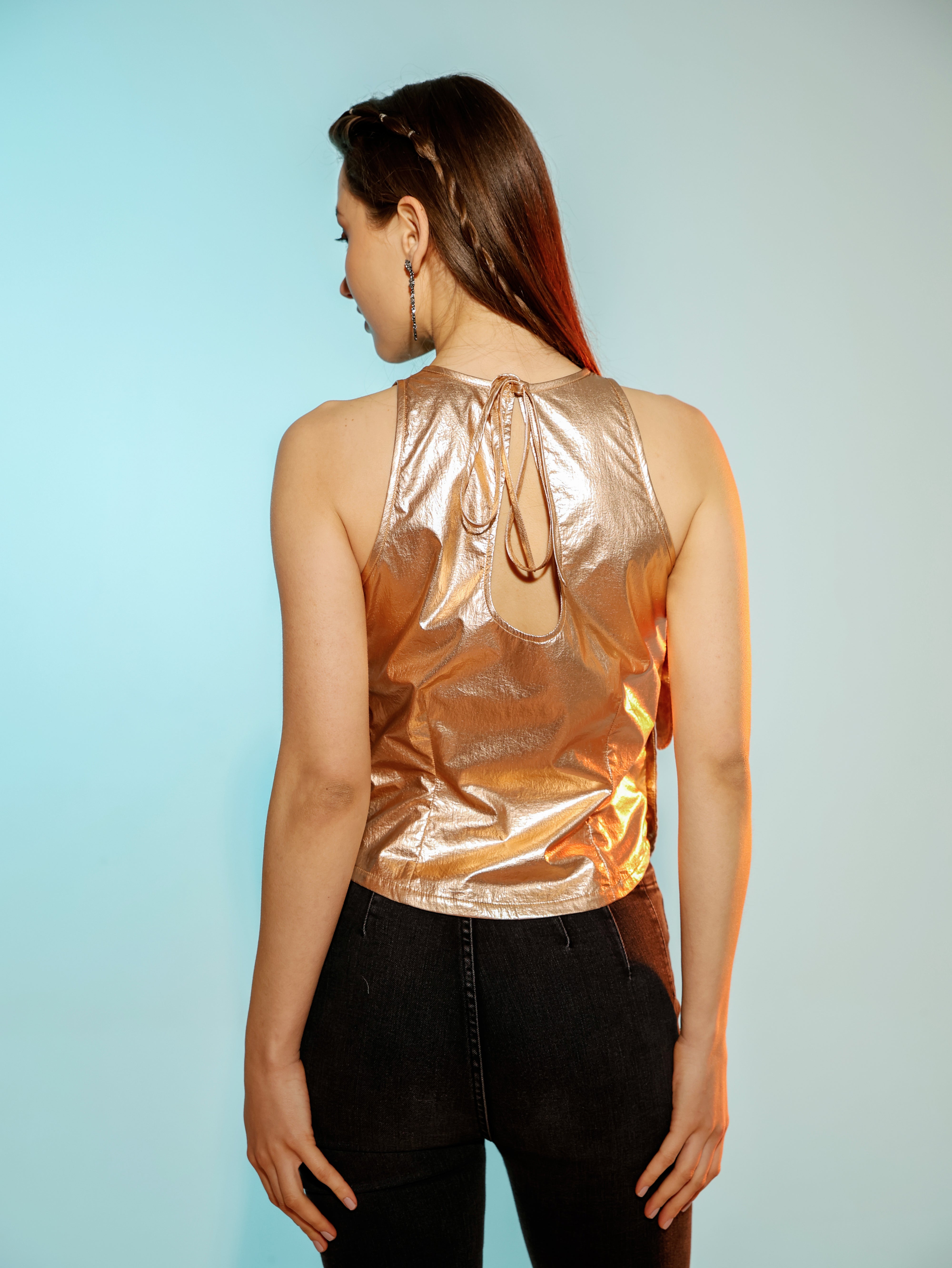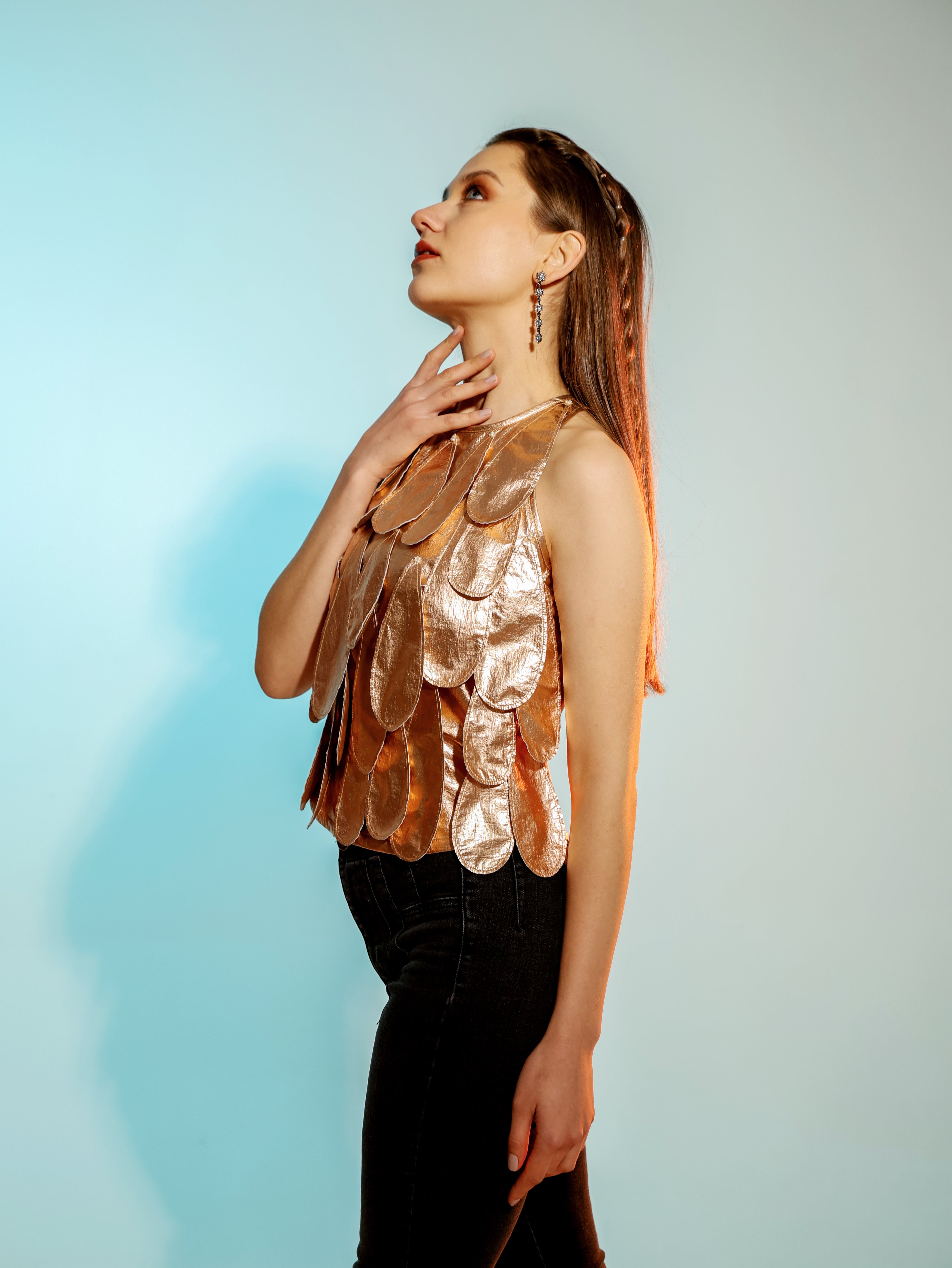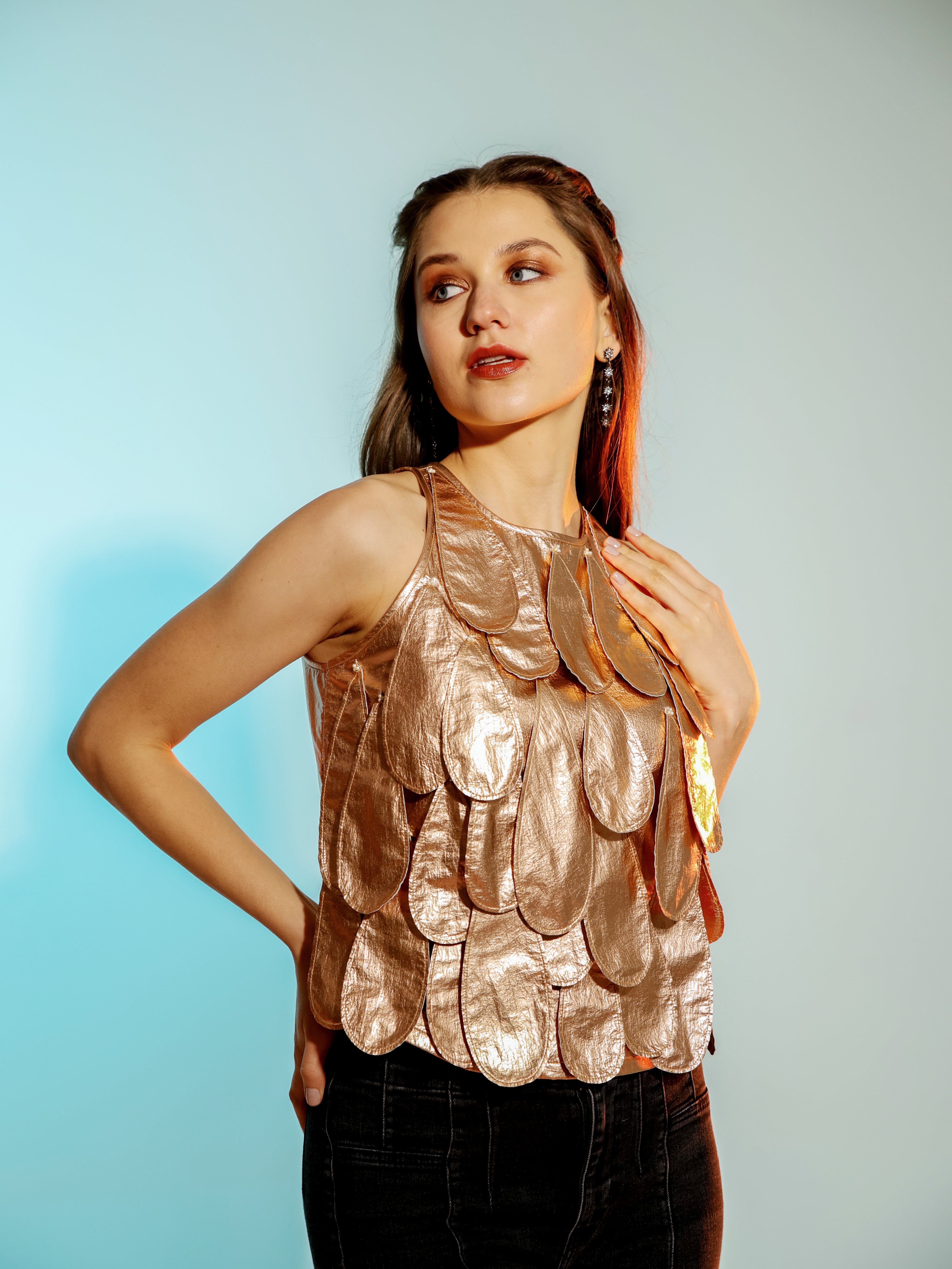 The Metallic Petal Drop Halter top is the piece you need in your closet to wear to a night out in the city. Embellished with hand-cut petal detailing, It has a tie up detail at the back keyhole and a side zipper.