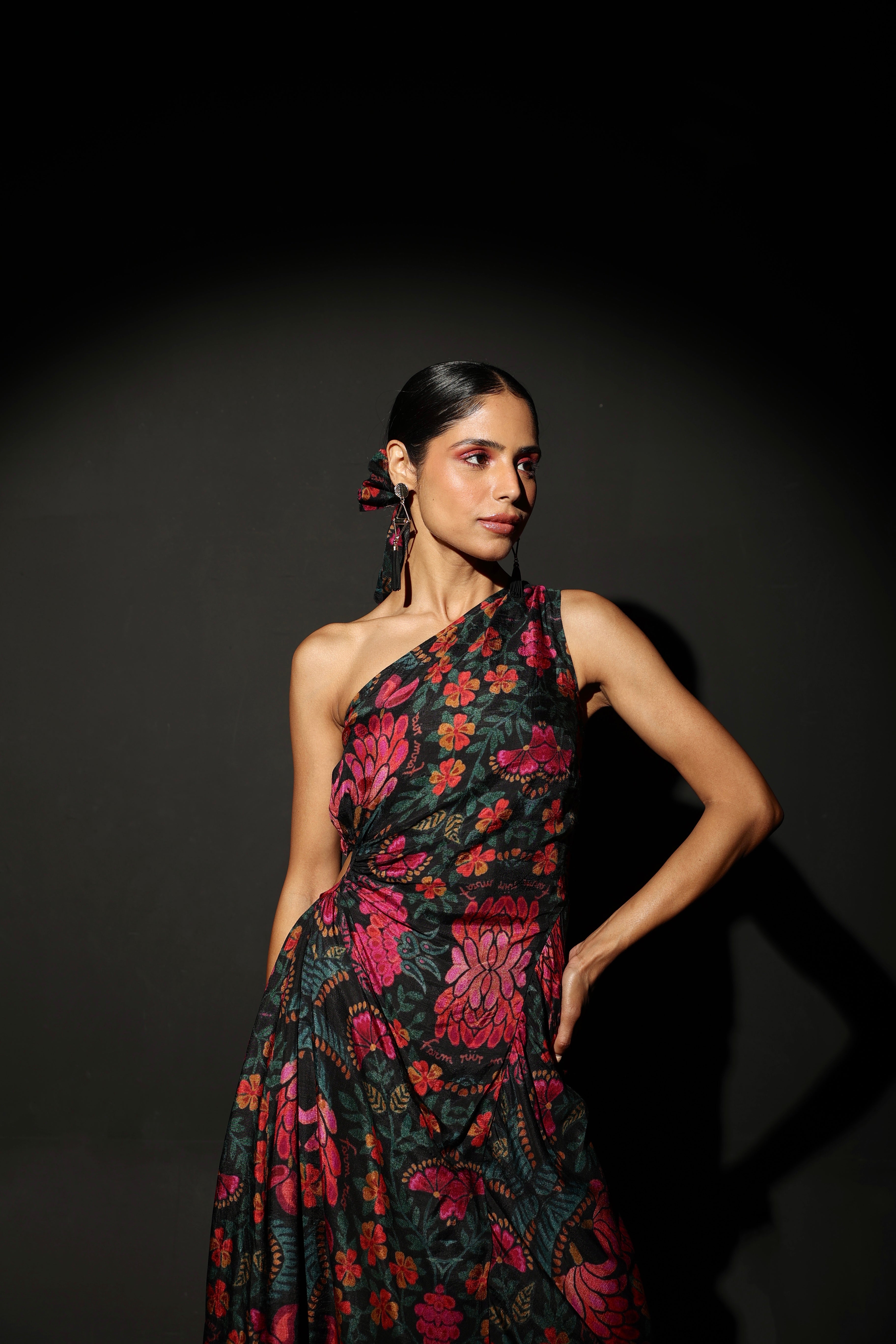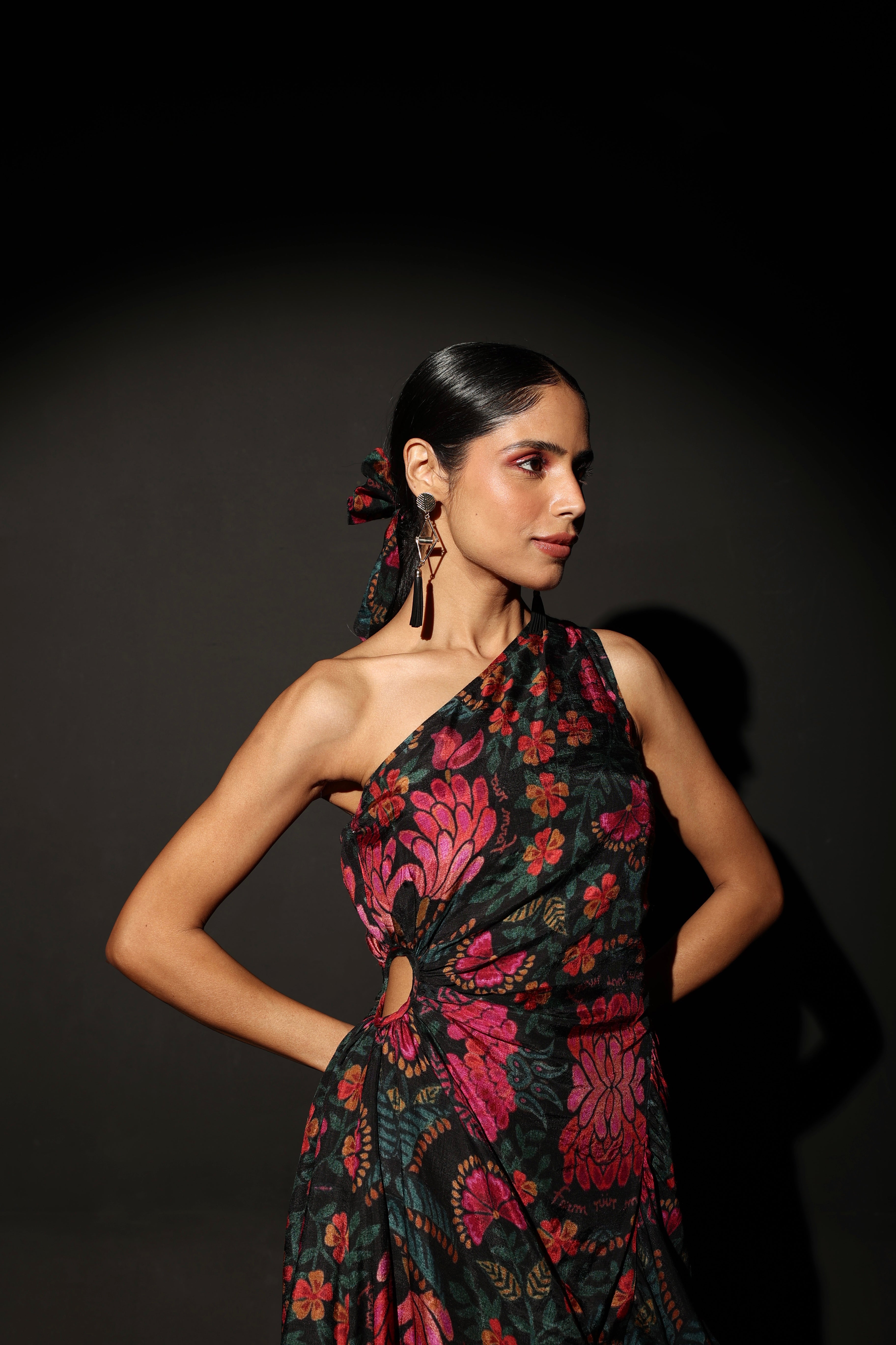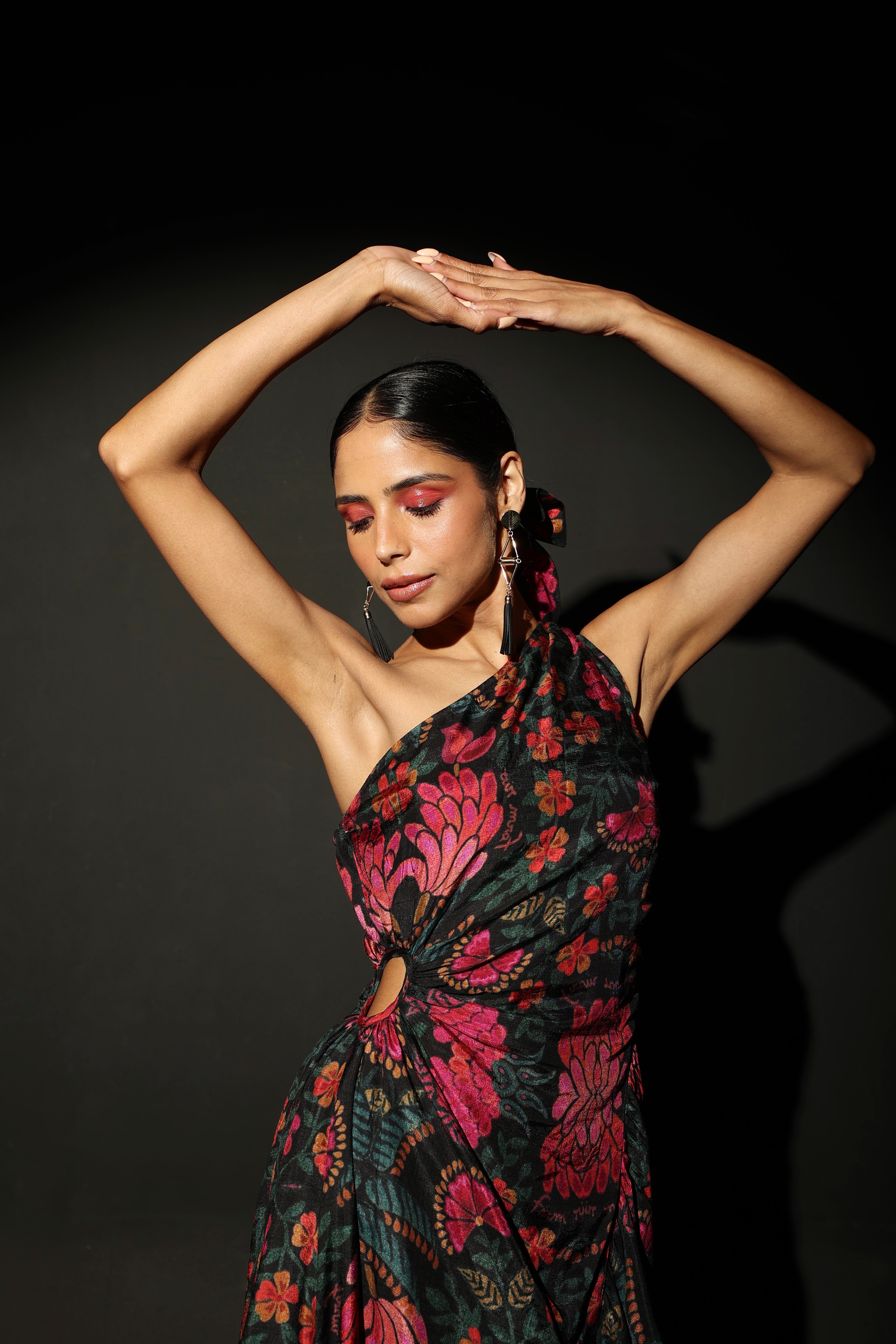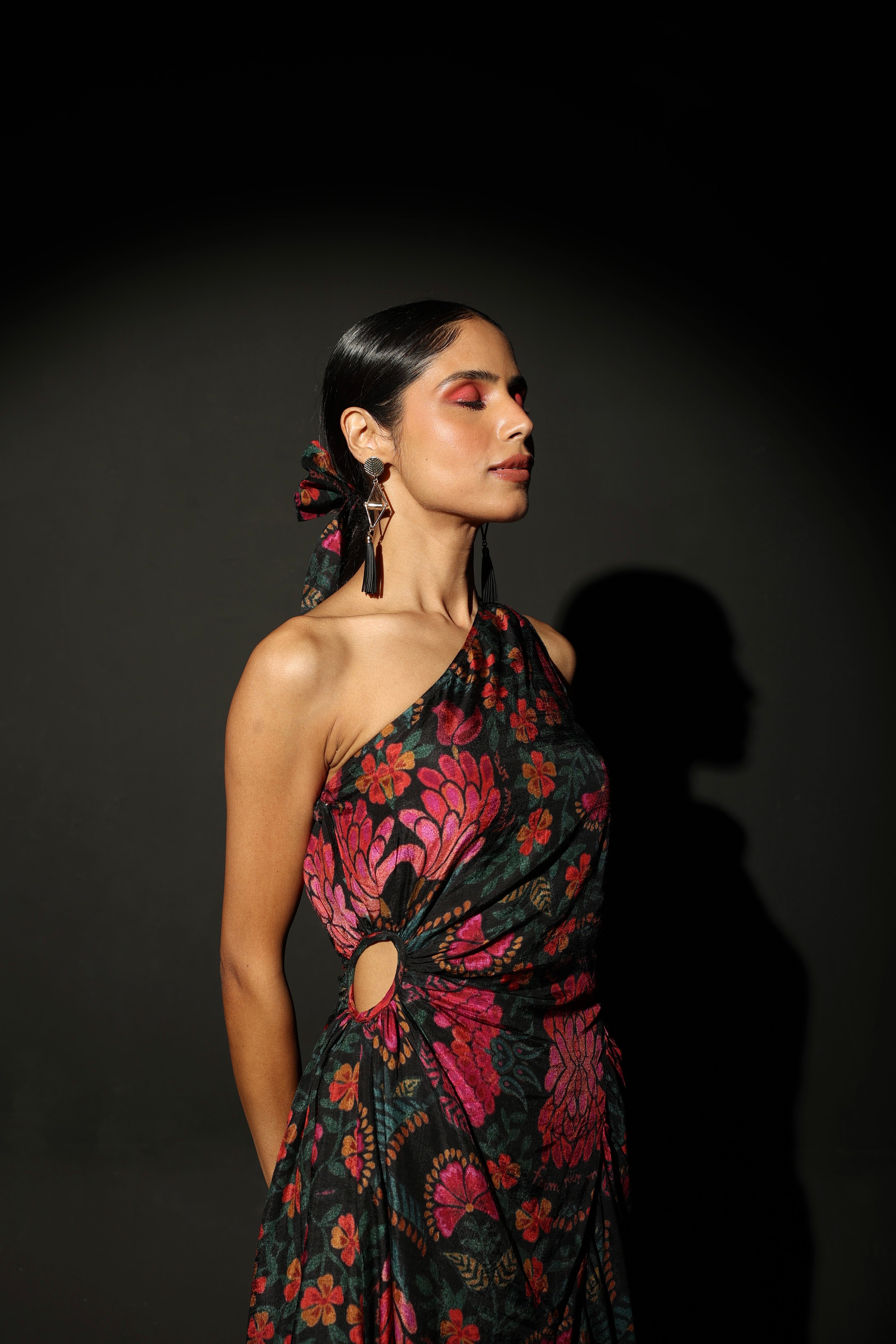 The Midnight Bloom One Shoulder Midi is nothing short of magic! It has a black base with a vibrant floral pattern in shades of pink, red, orange, and green. The floral design is bold and eye-catching. It has an asymmetric neckline with a pleated shoulder. It has a ruched, circular cut-out detail at the waist, adding a modern and stylish touch. The fabric is medium-weight and butter soft on the skin. The silhouette is flattering and sophisticated. It features a side zipper.
