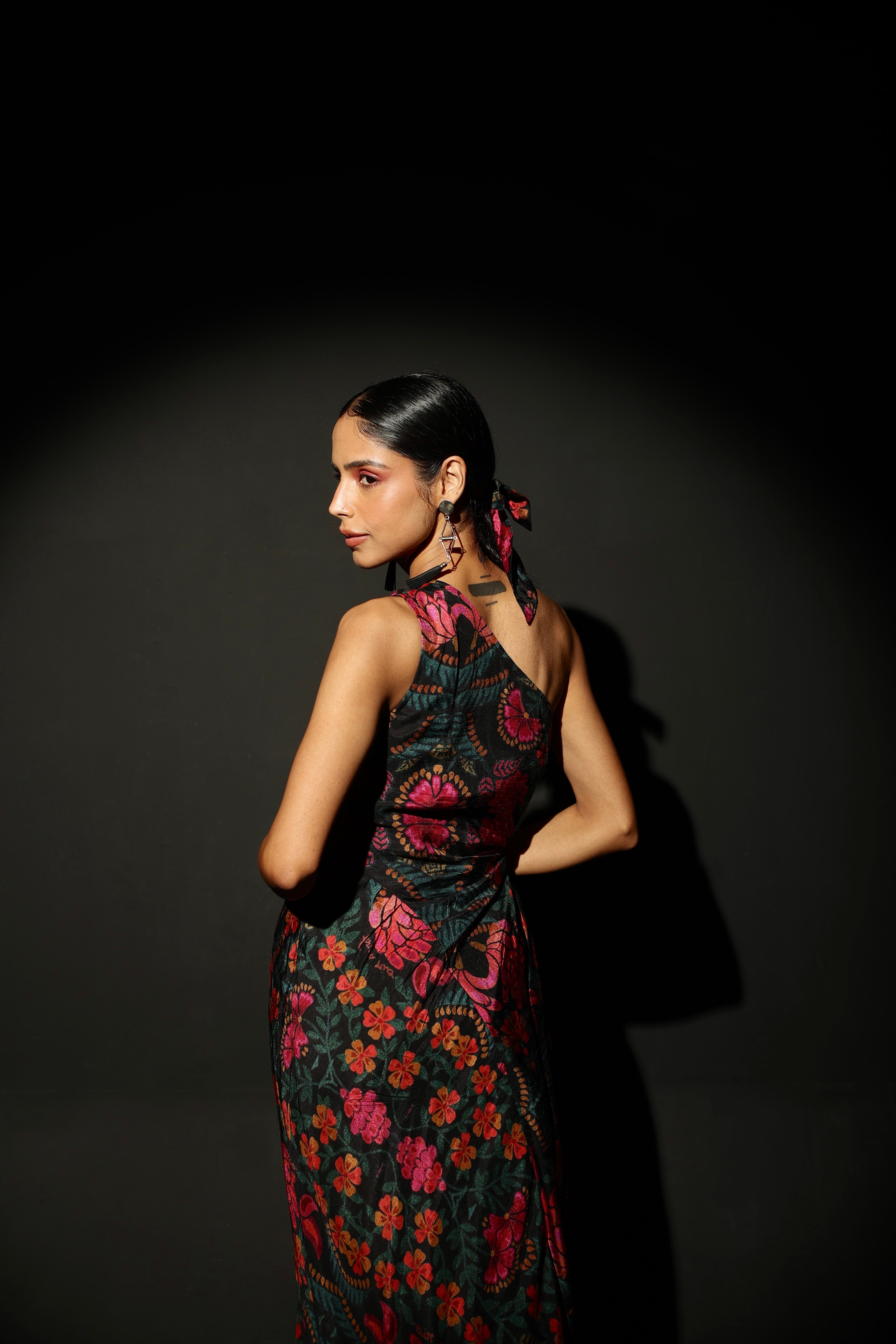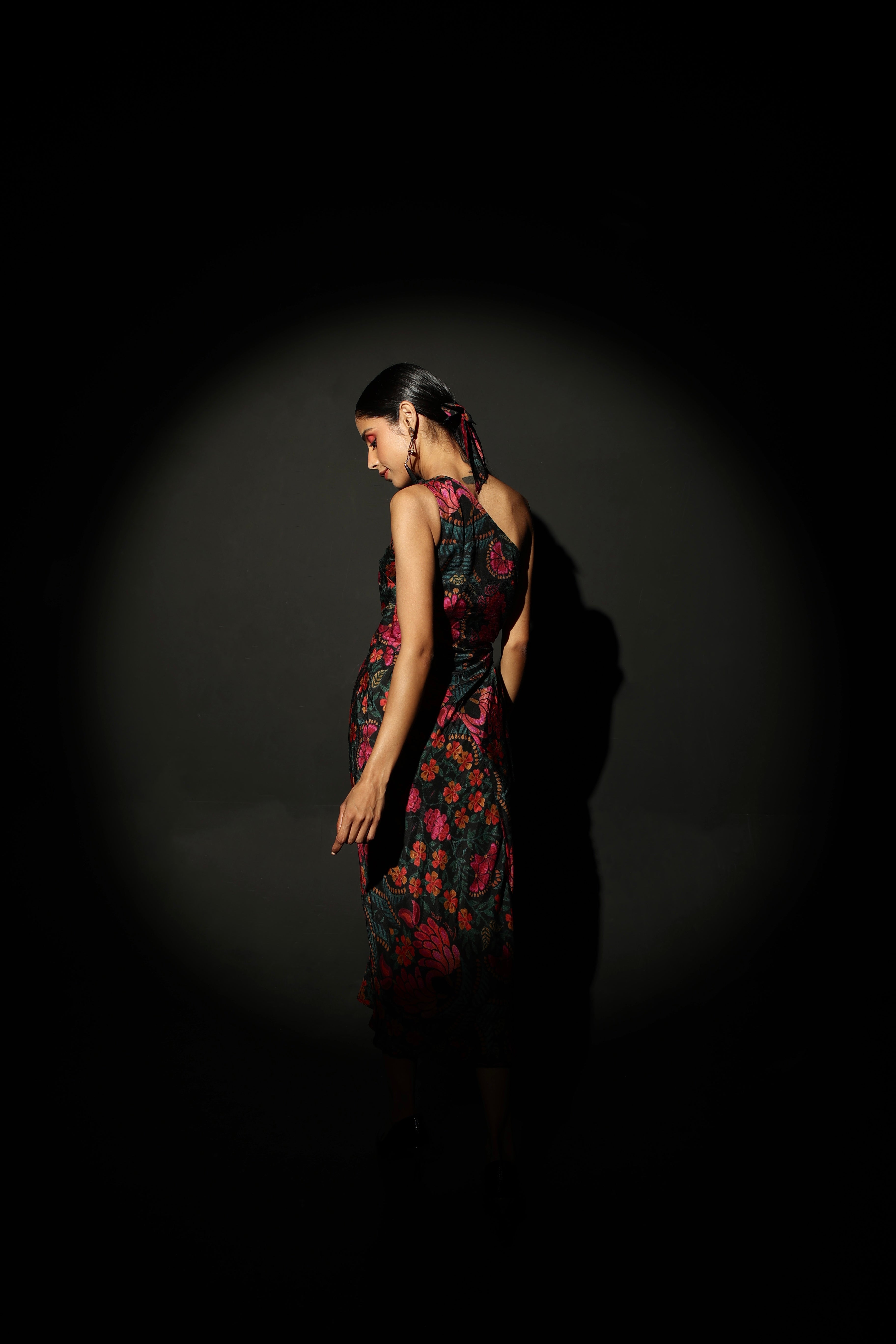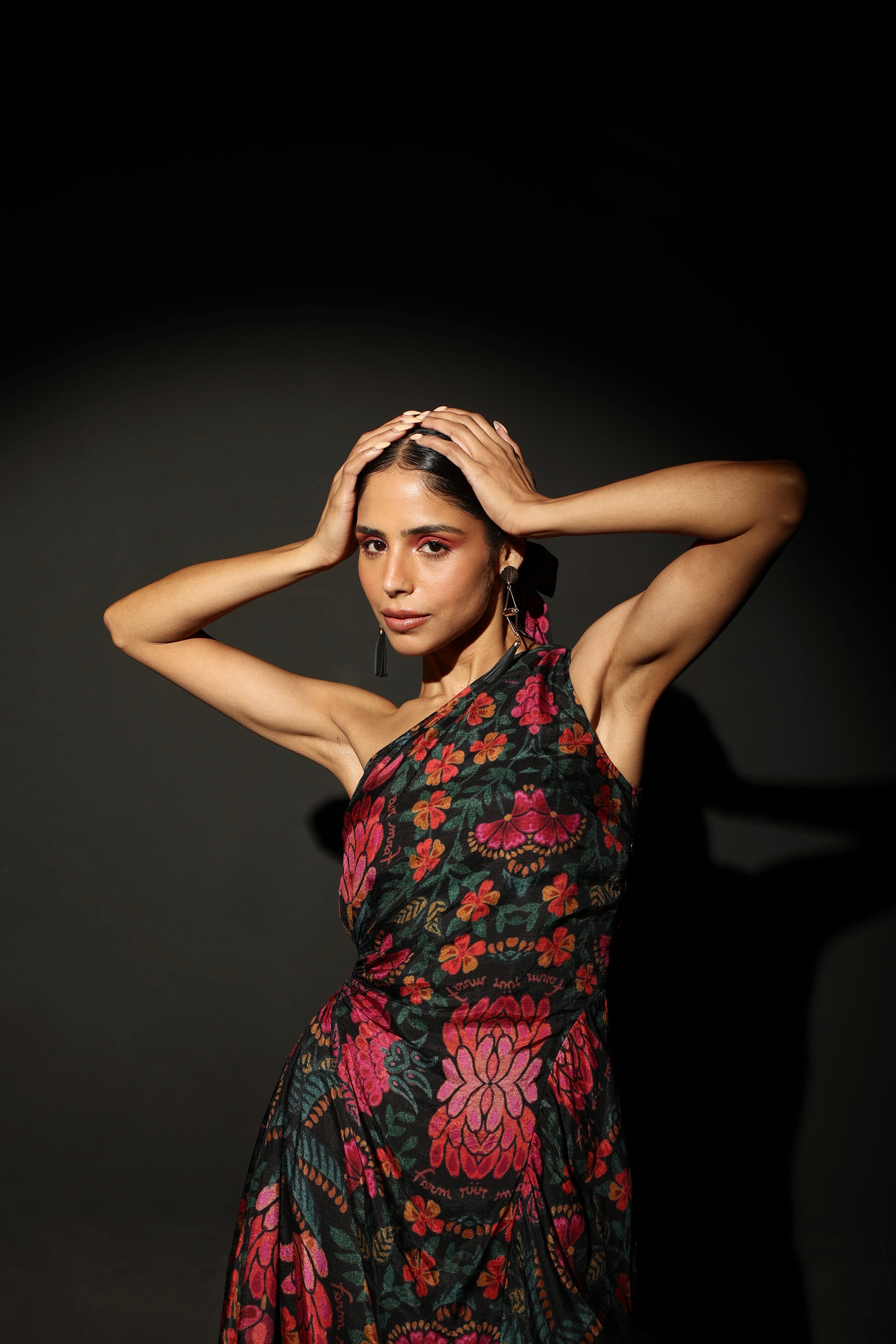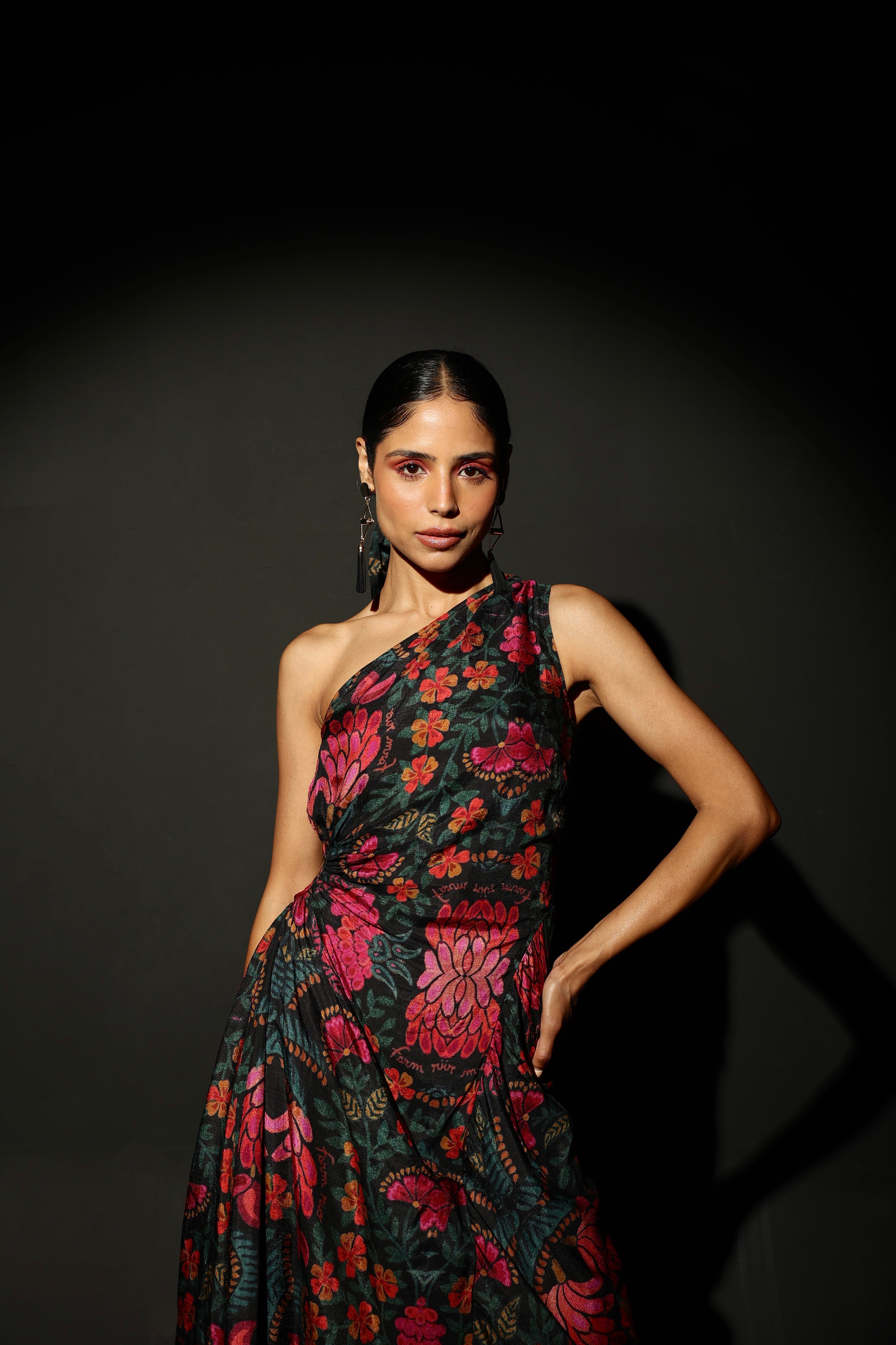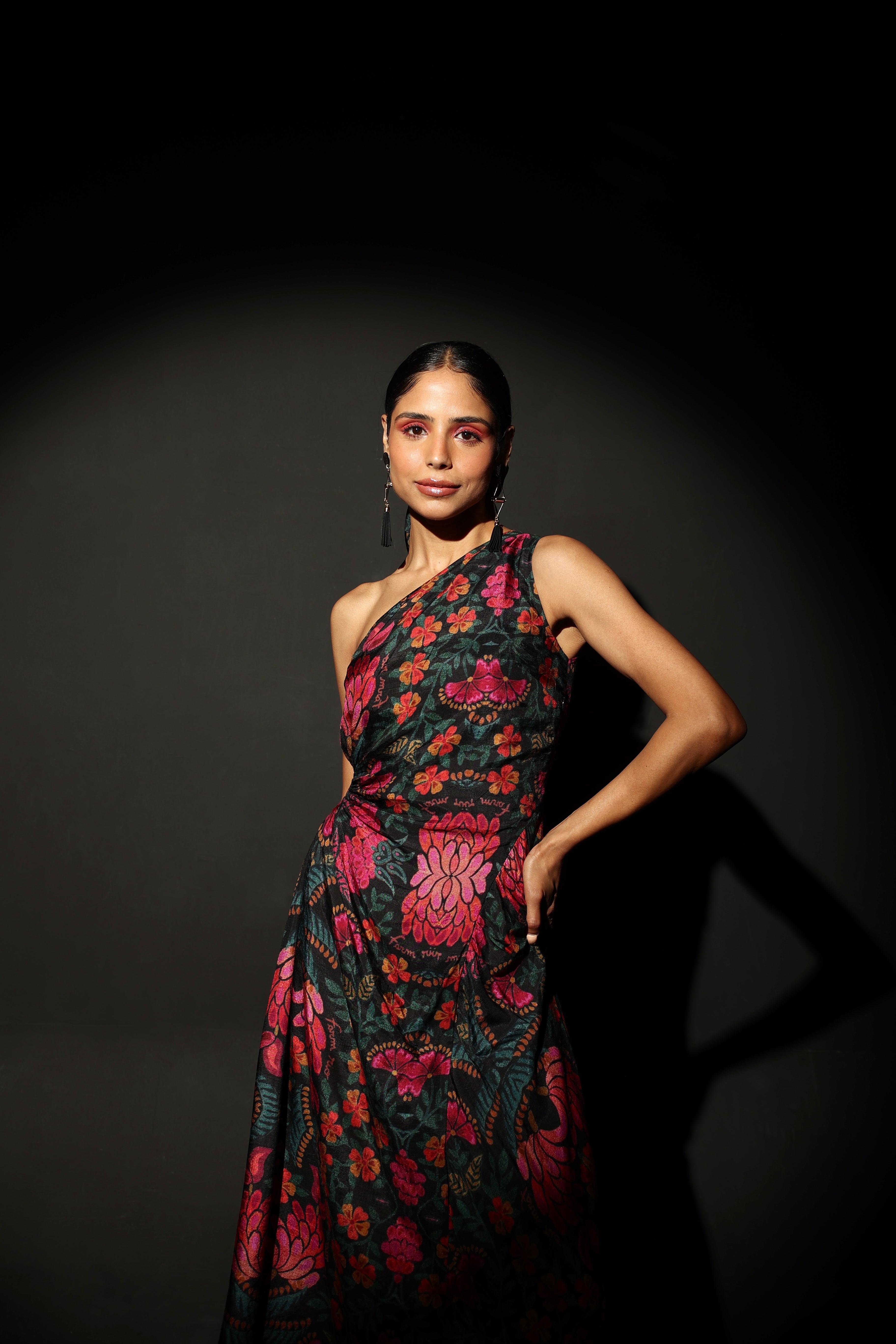 The Midnight Bloom One Shoulder Midi is nothing short of magic! It has a black base with a vibrant floral pattern in shades of pink, red, orange, and green. The floral design is bold and eye-catching. It has an asymmetric neckline with a pleated shoulder. It has a ruched, circular cut-out detail at the waist, adding a modern and stylish touch. The fabric is medium-weight and butter soft on the skin. The silhouette is flattering and sophisticated. It features a side zipper.