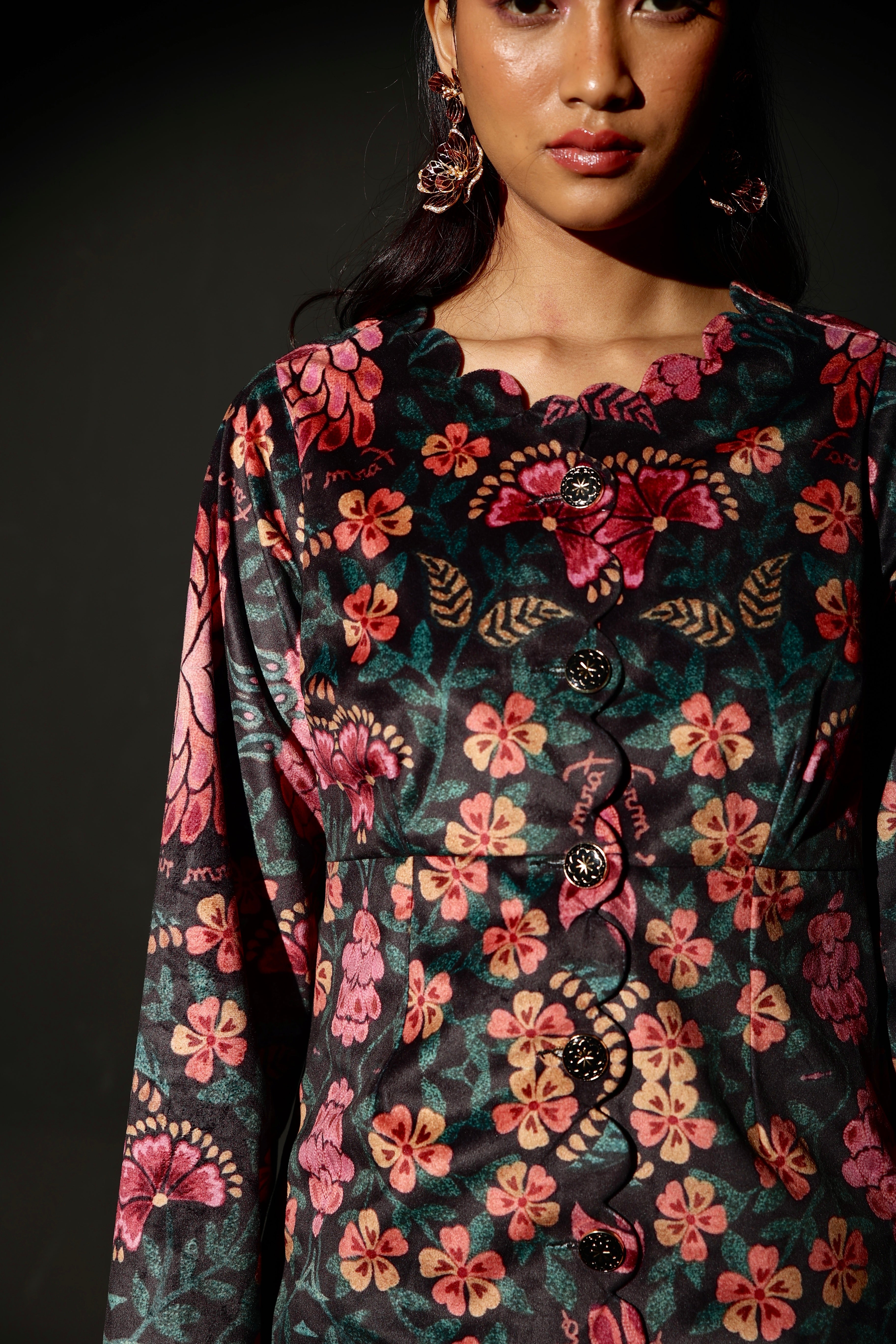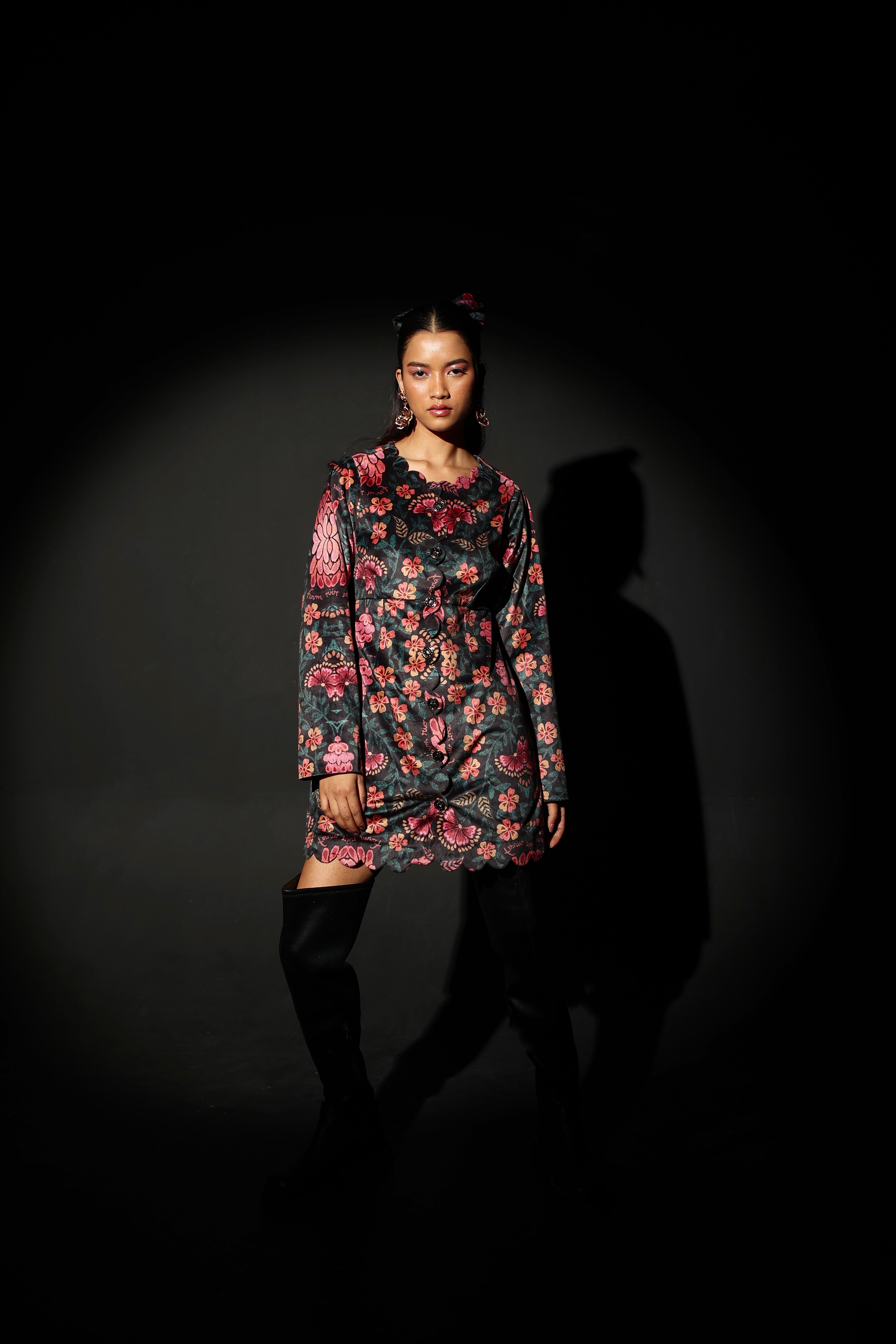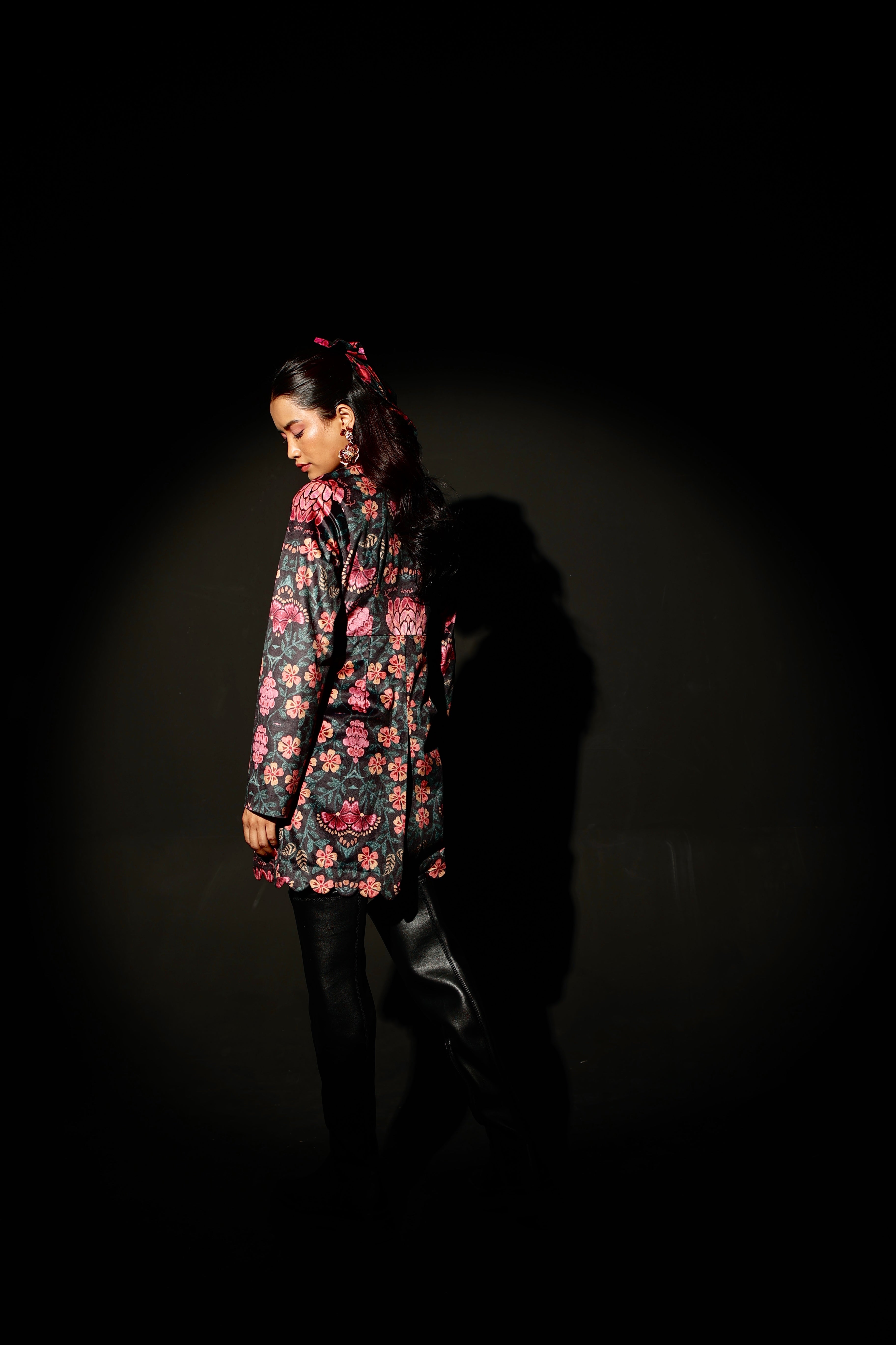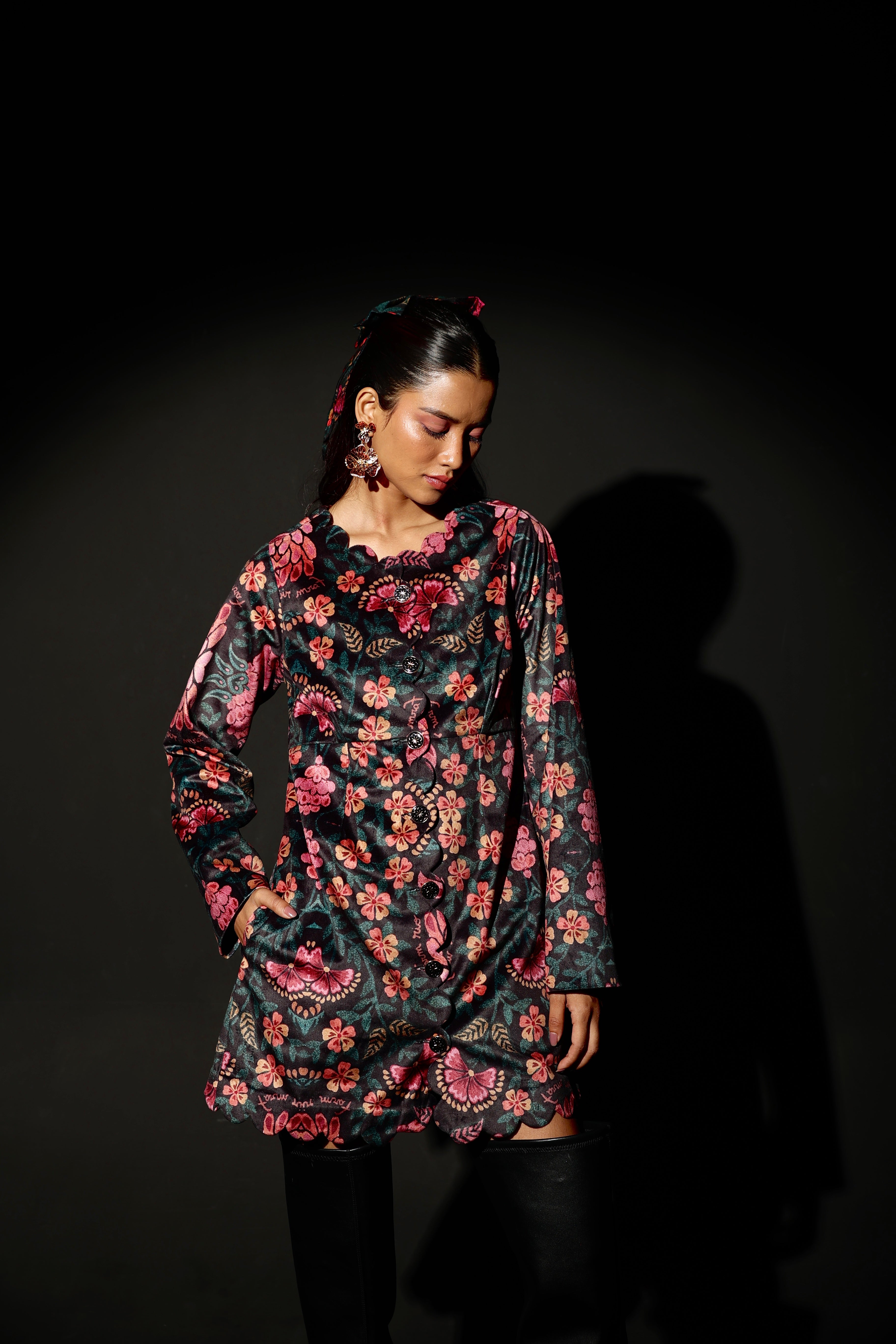 The Midnight Bloom Scalloped Jacket is everything your midnight dreams are made of! It has a black base with a vibrant floral pattern in shades of pink, red, orange, and green. The floral design is bold and eye-catching. It is a fitted jacket with long sleeves, a narrow waist and a high neckline. The jacket features scalloped edges, which adds an edge to the otherwise feminine, floral look. It has side pockets, and statement black and golden buttons down the front. It is also fully lined. Stylish and smart - it's not a want but a need!
