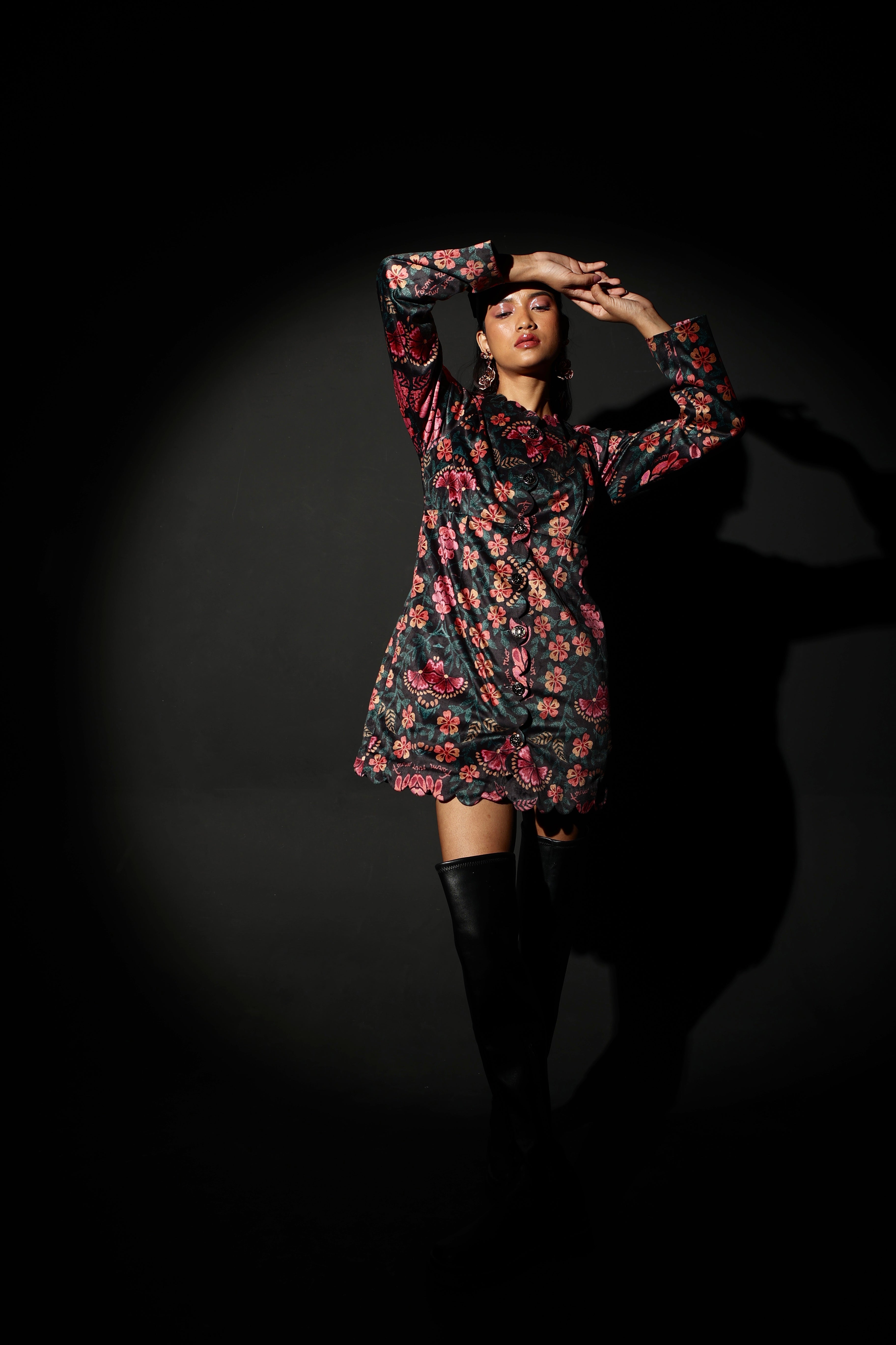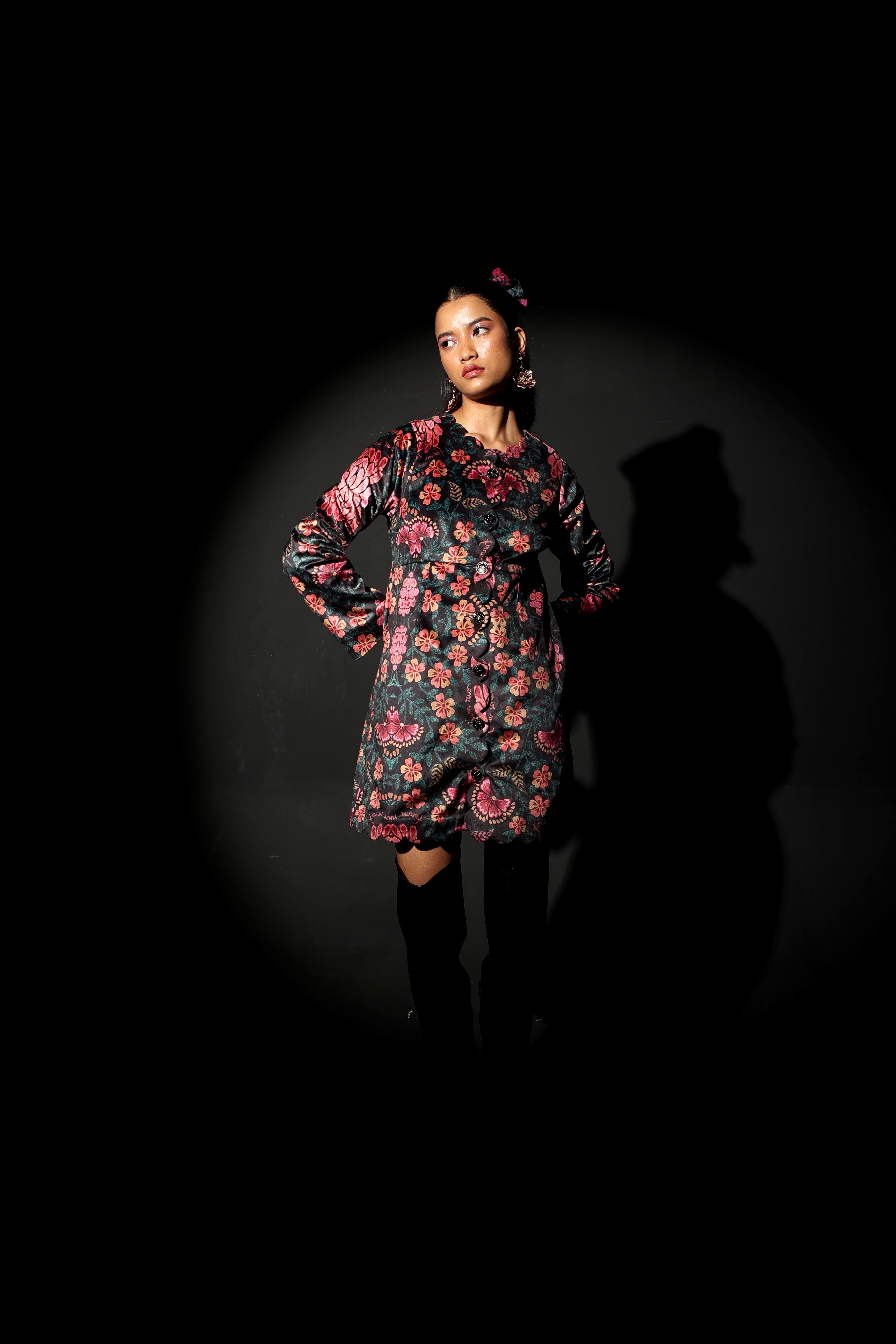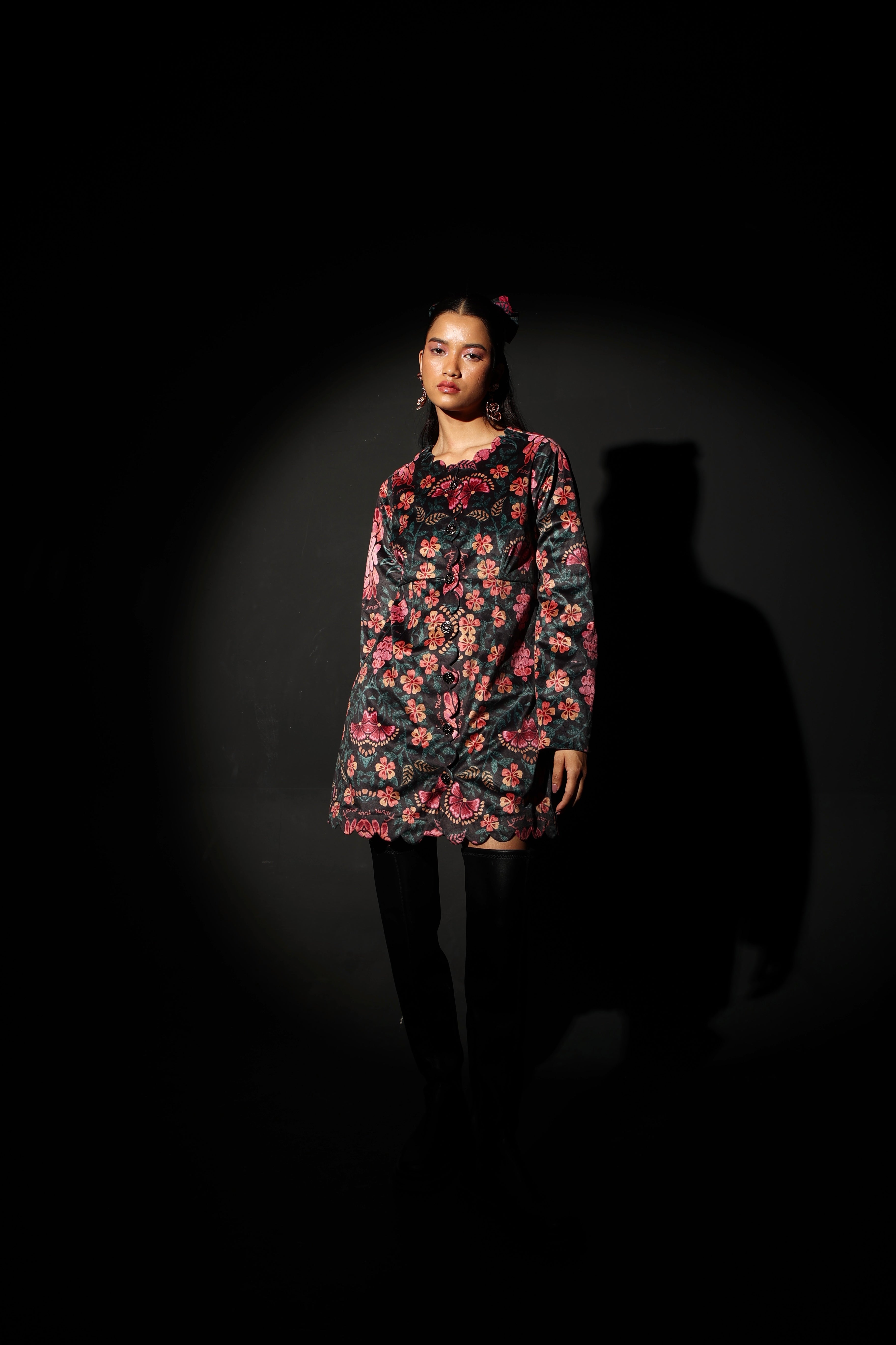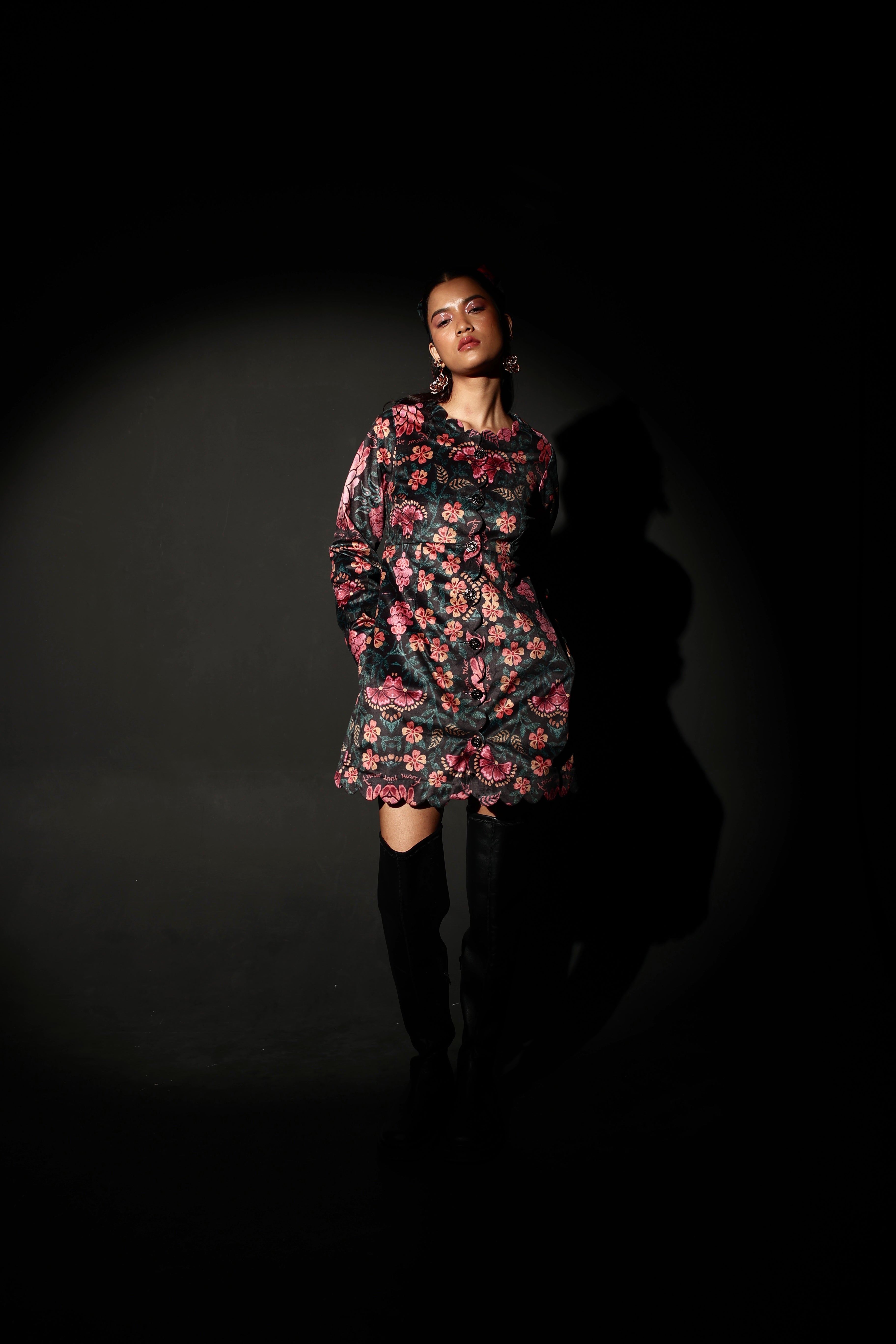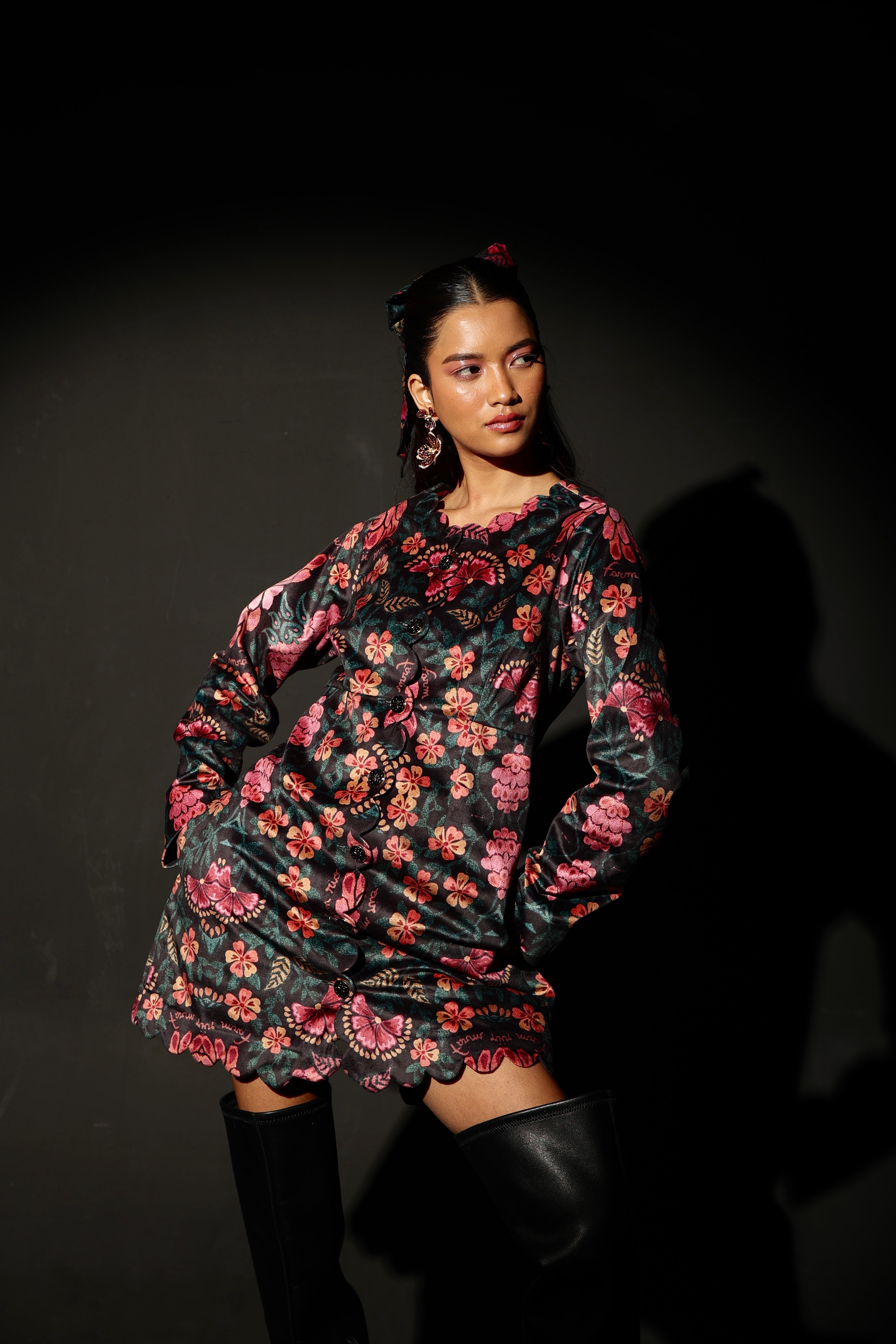 The Midnight Bloom Scalloped Jacket is everything your midnight dreams are made of! It has a black base with a vibrant floral pattern in shades of pink, red, orange, and green. The floral design is bold and eye-catching. It is a fitted jacket with long sleeves, a narrow waist and a high neckline. The jacket features scalloped edges, which adds an edge to the otherwise feminine, floral look. It has side pockets, and statement black and golden buttons down the front. It is also fully lined. Stylish and smart - it's not a want but a need!