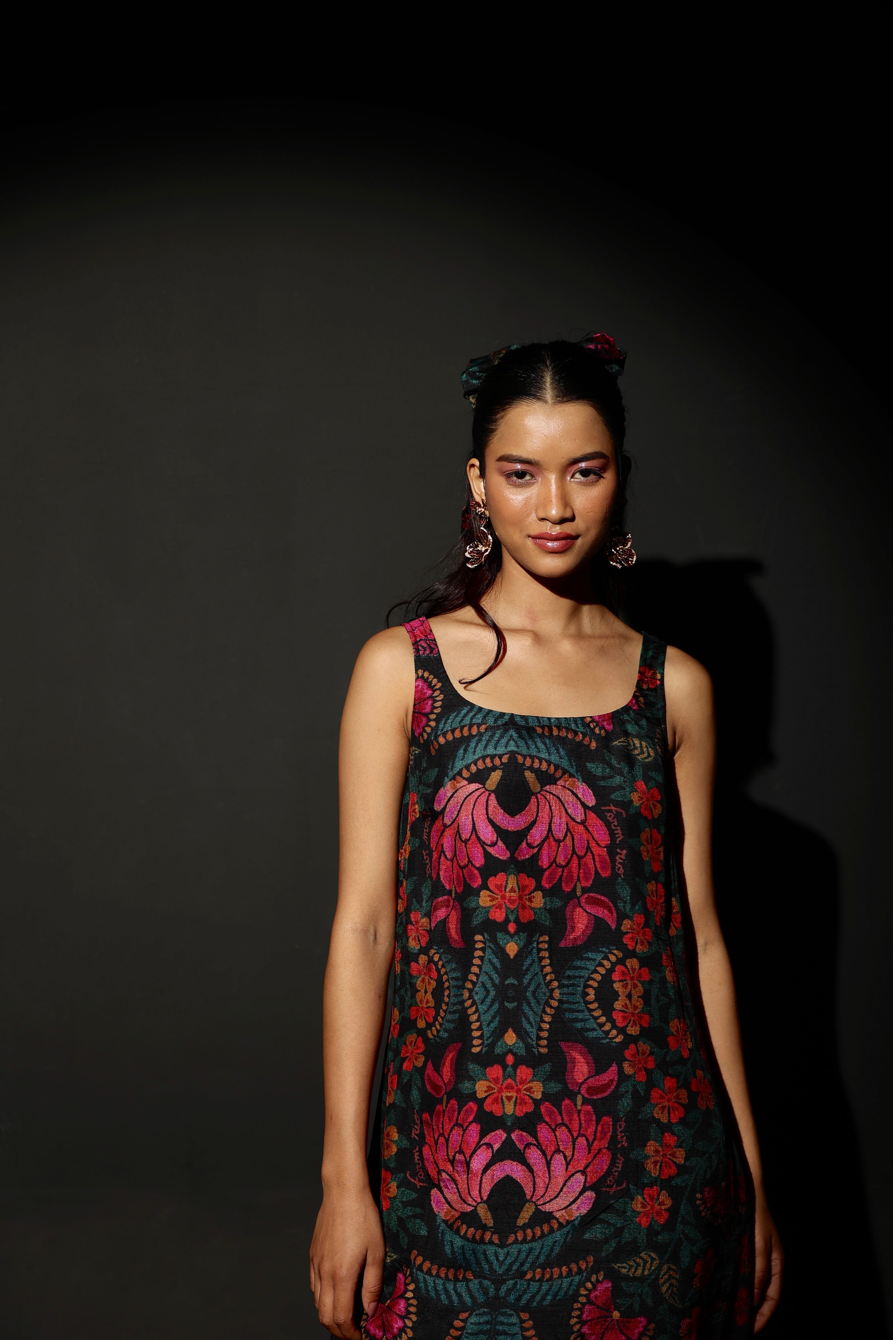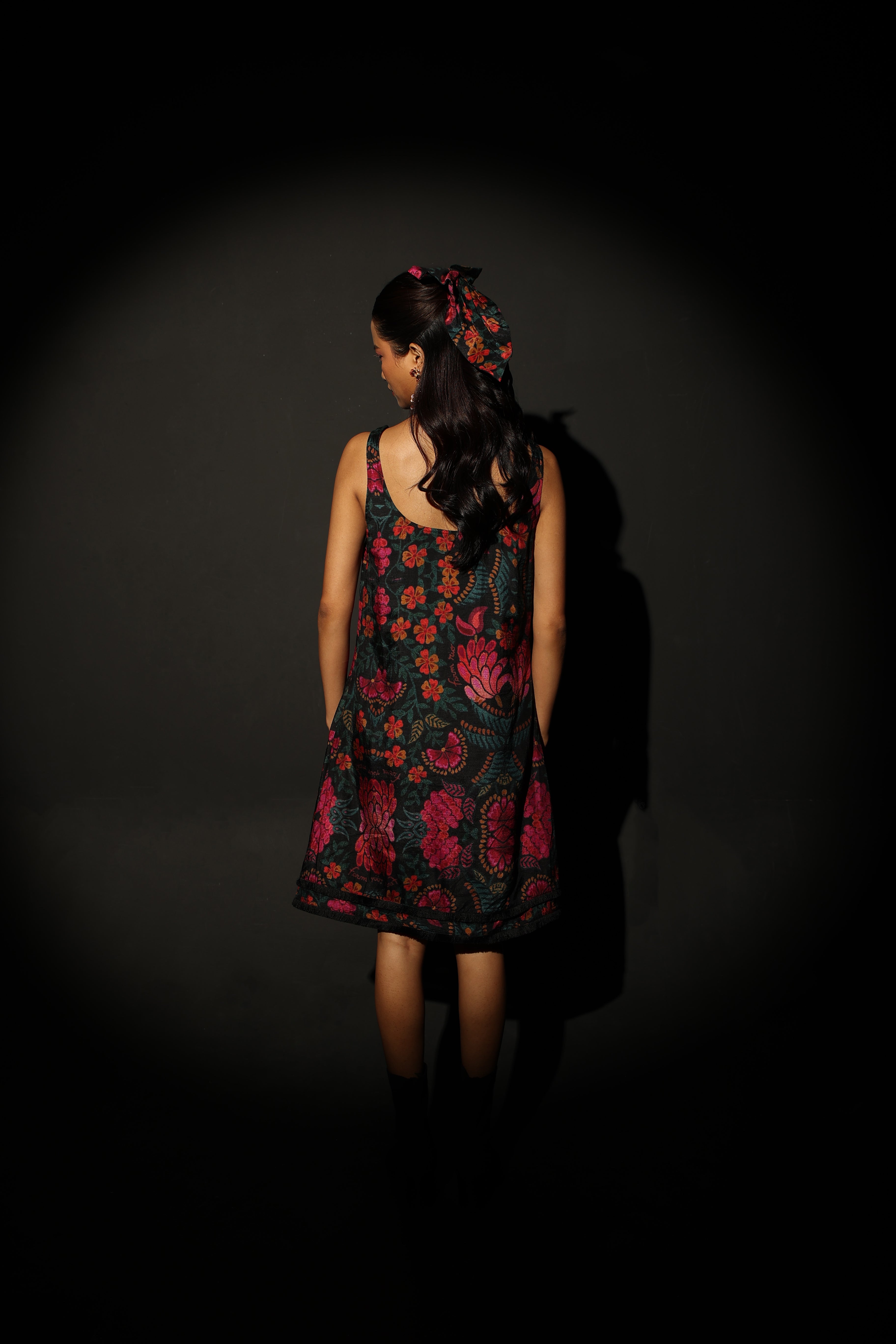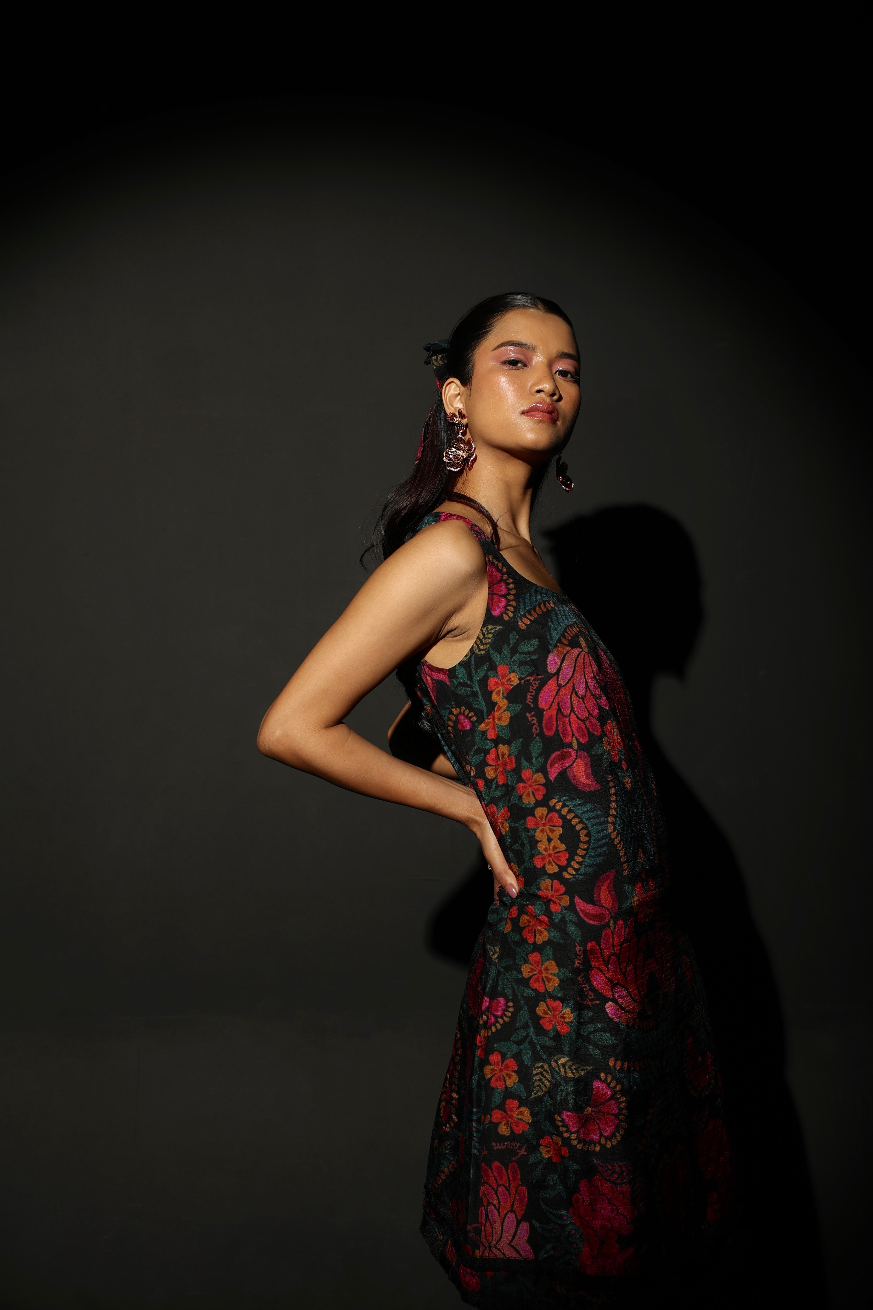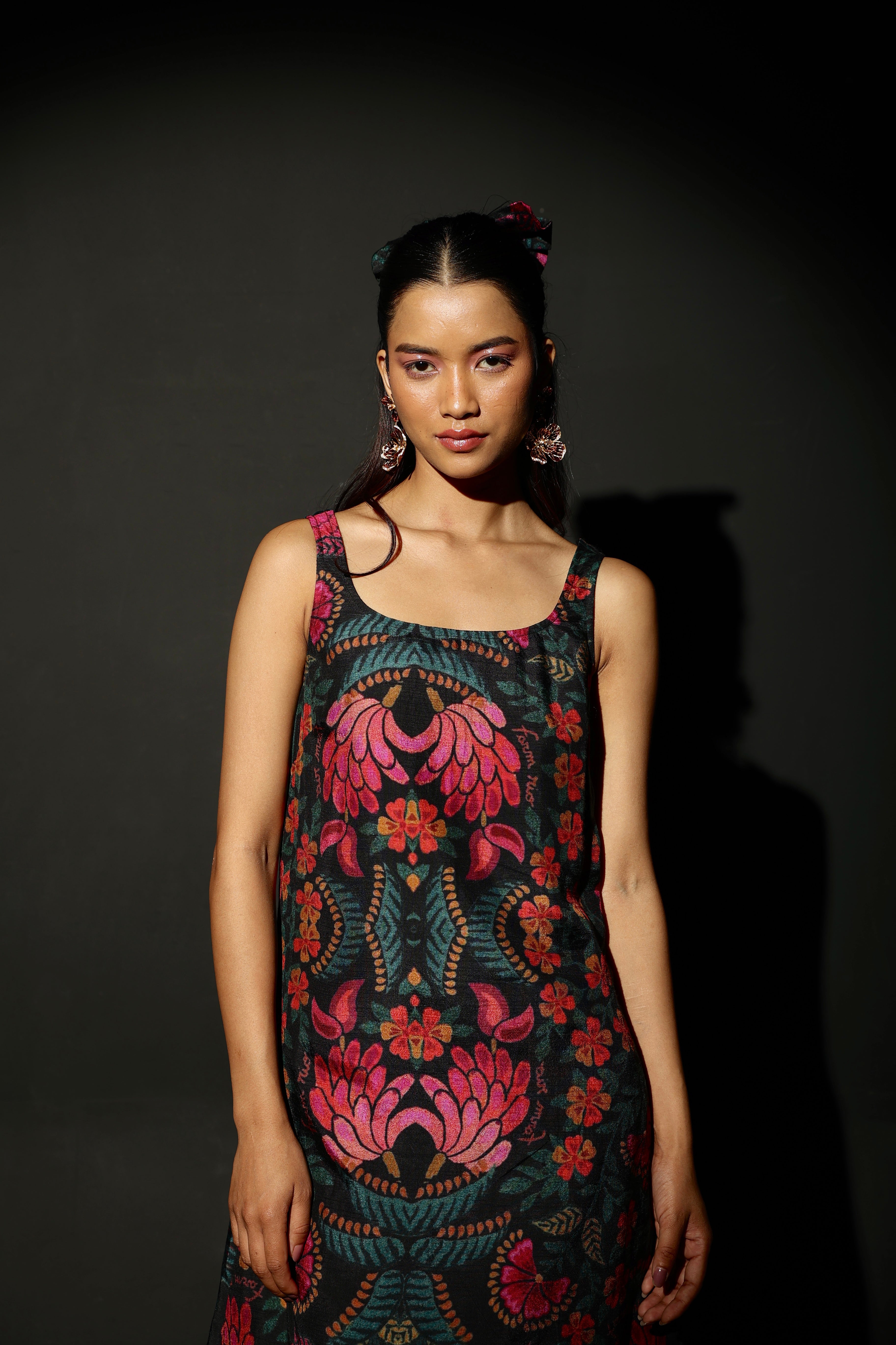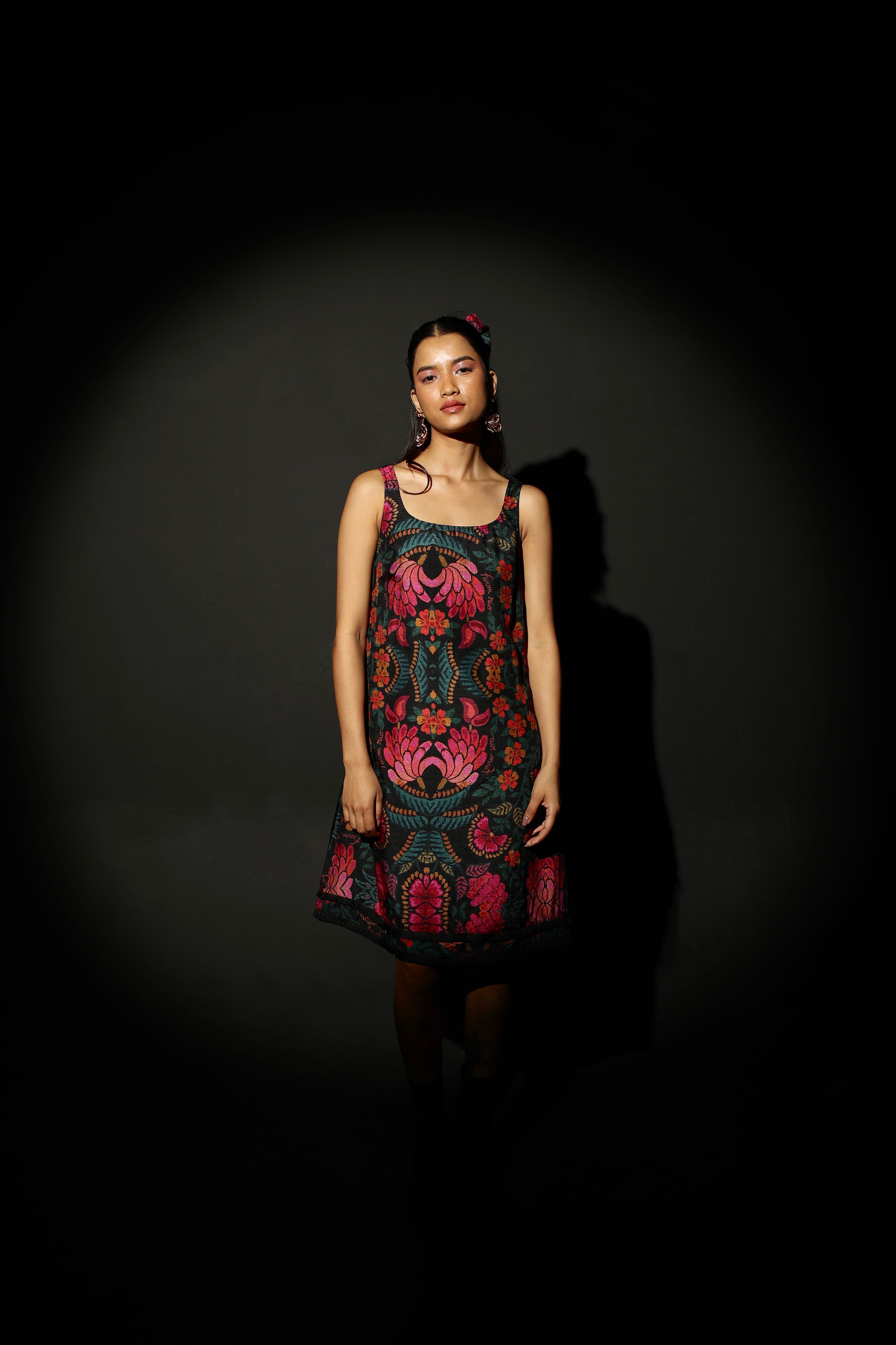 The Midnight Bloom Strappy Mini has a black base with a vibrant floral pattern in shades of pink, red, orange, and green. The floral design is bold and eye-catching. It has a square neckline and a straight silhouette. The black fringe detailing at the hem adds an element of fun and flare! The fabric is medium-weight and butter soft on the skin - it is also fully lined. The silhouette is flattering and sophisticated. It features a side zipper.