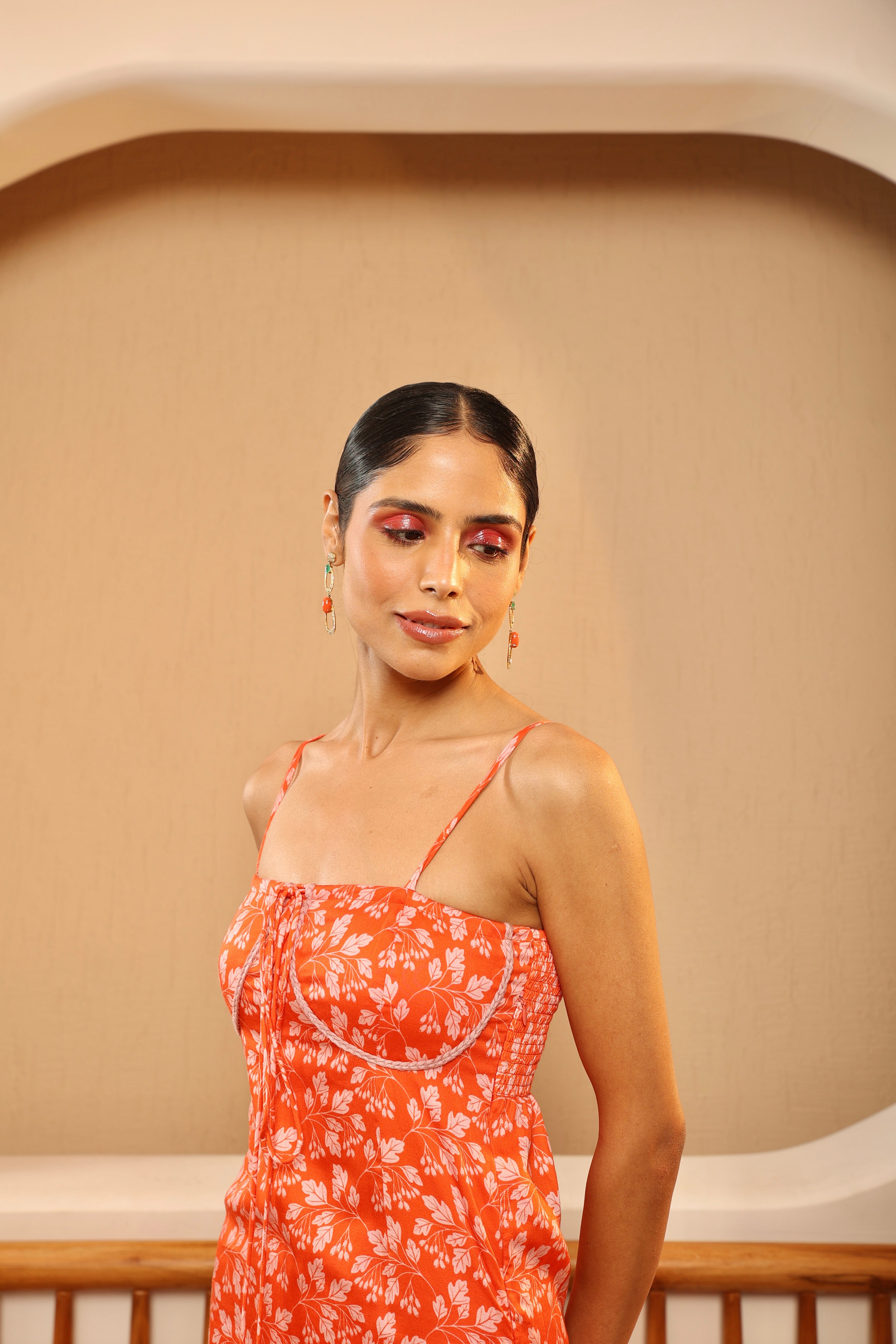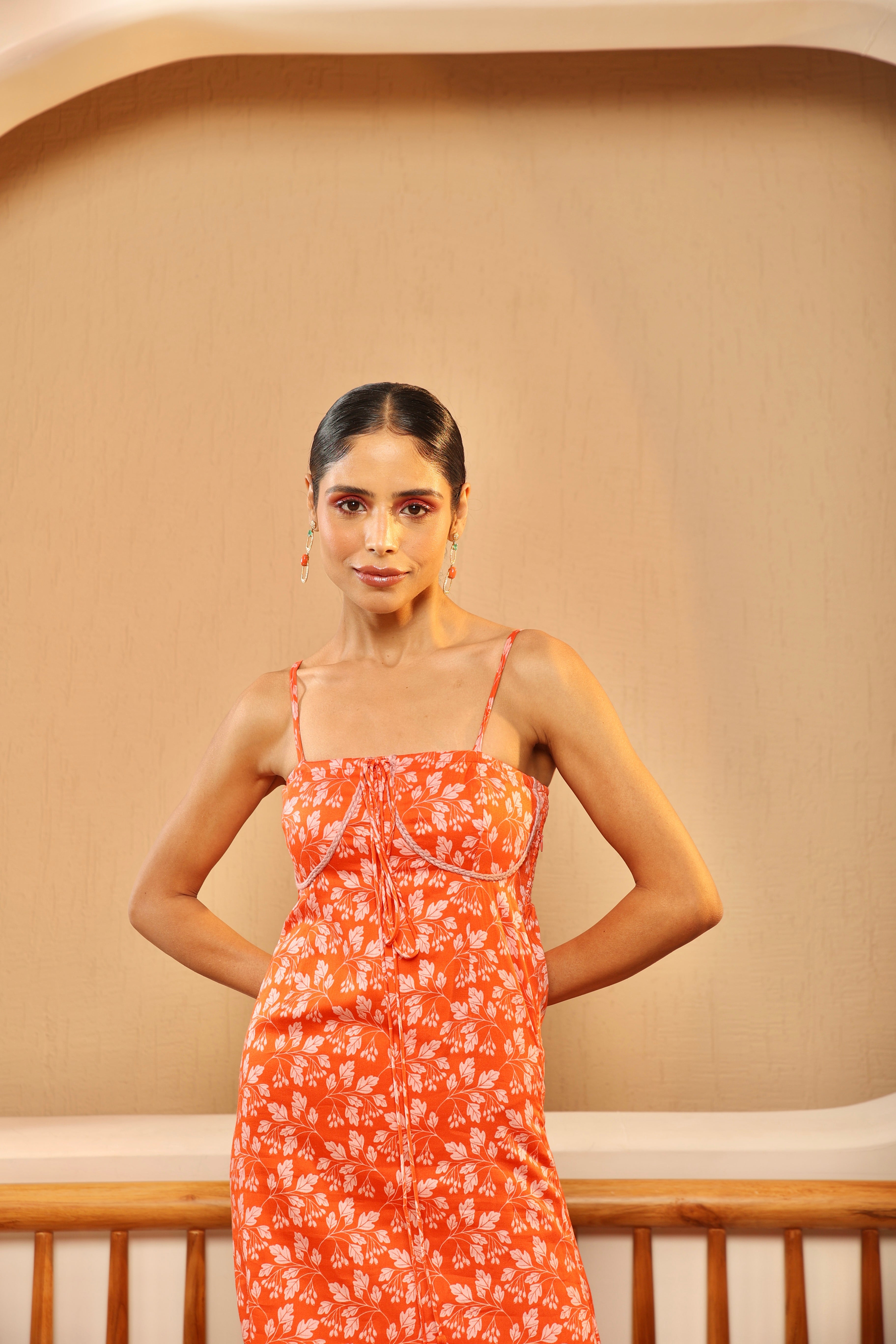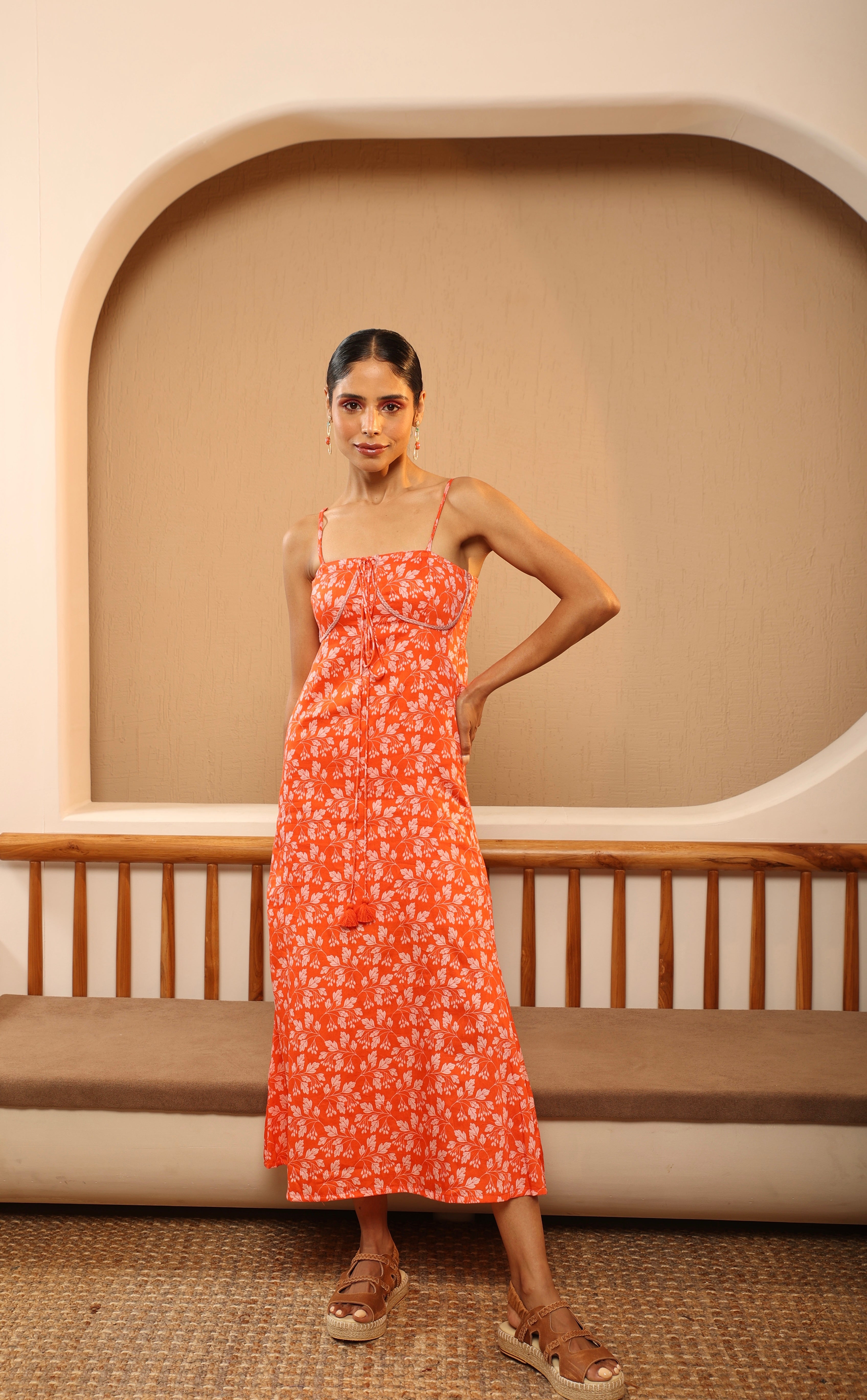 The Orange Soda Strappy Midi has a bright orange base with a delicate baby pink floral print. It has thin straps with a fitted bust, and a straight cut body that flares out at the hem. It is embellished with a decorative, braided string tie at the bust, which adds a flattering element of interest. The fabric is lightweight and flowy, ideal for warm weather. The dress features a smocked back. Perfect for a sundowner - to make you look like a sunset dream!