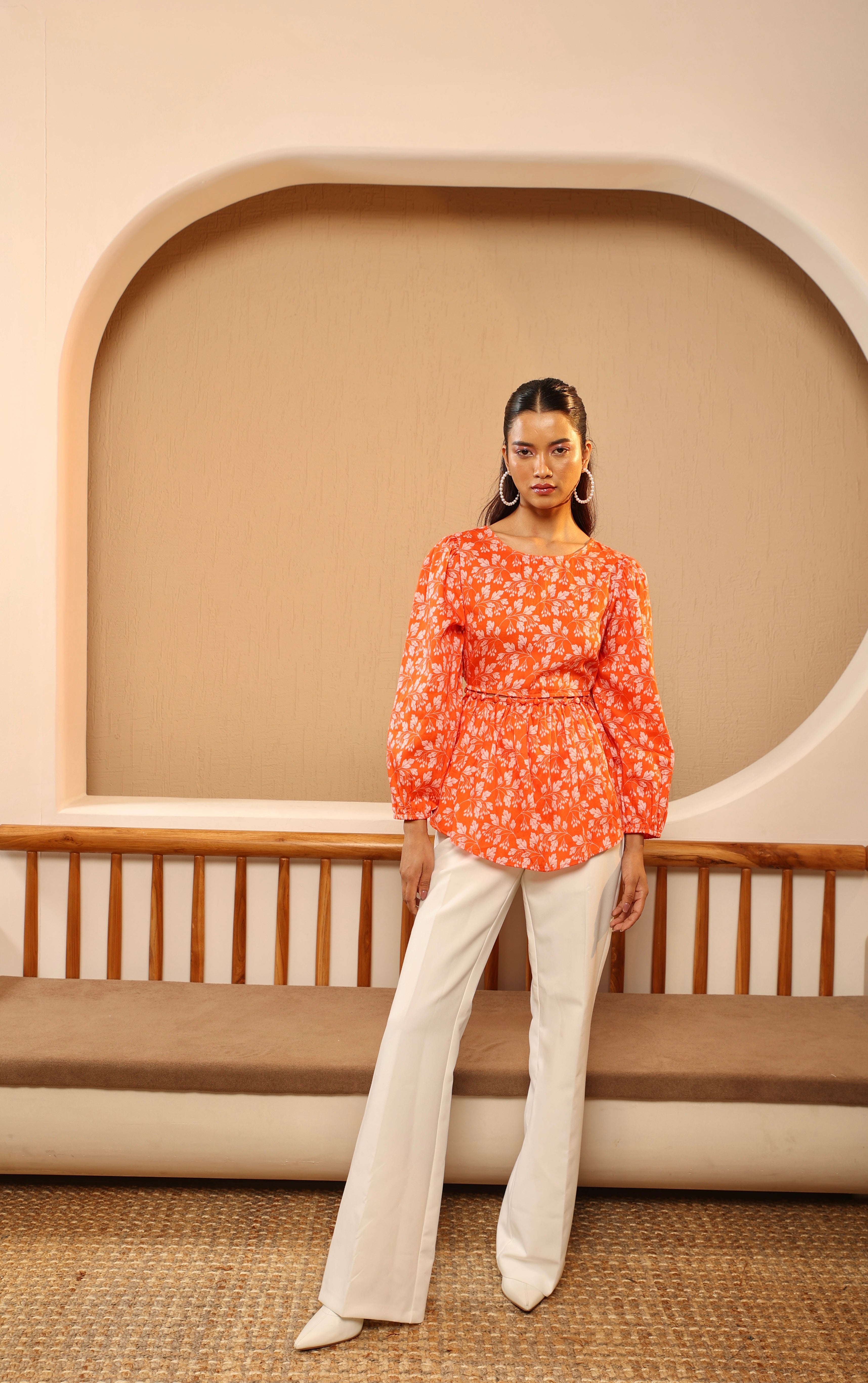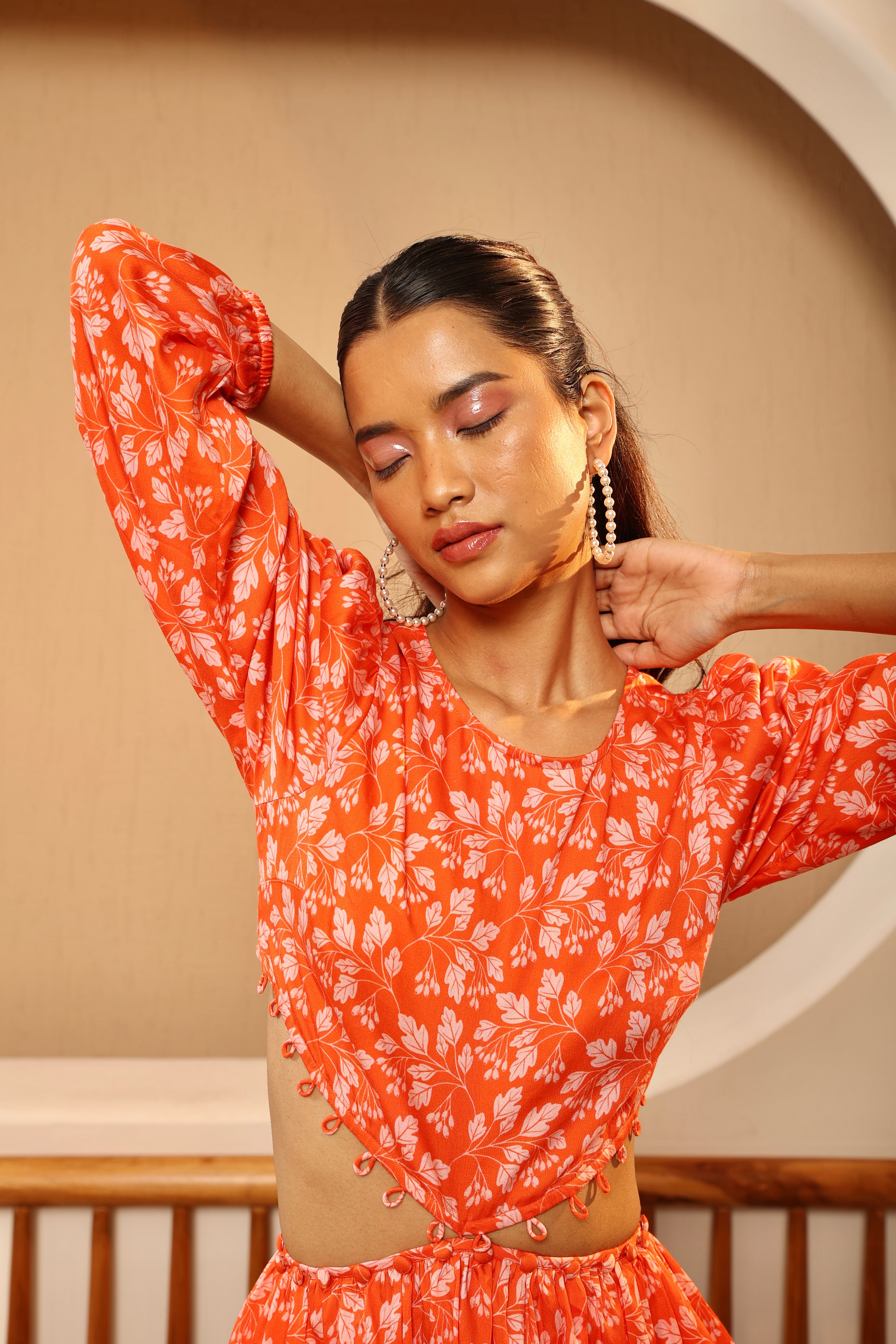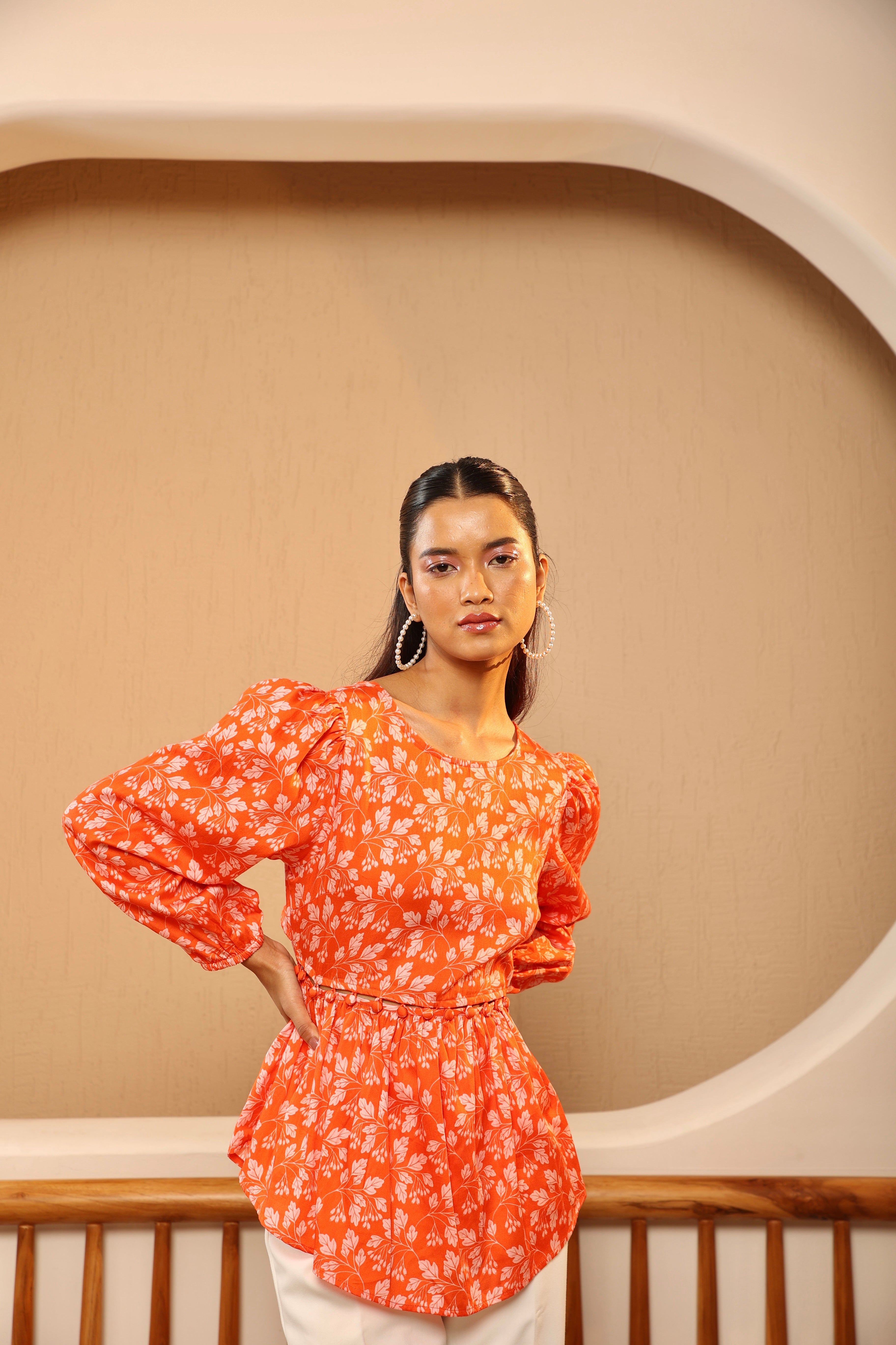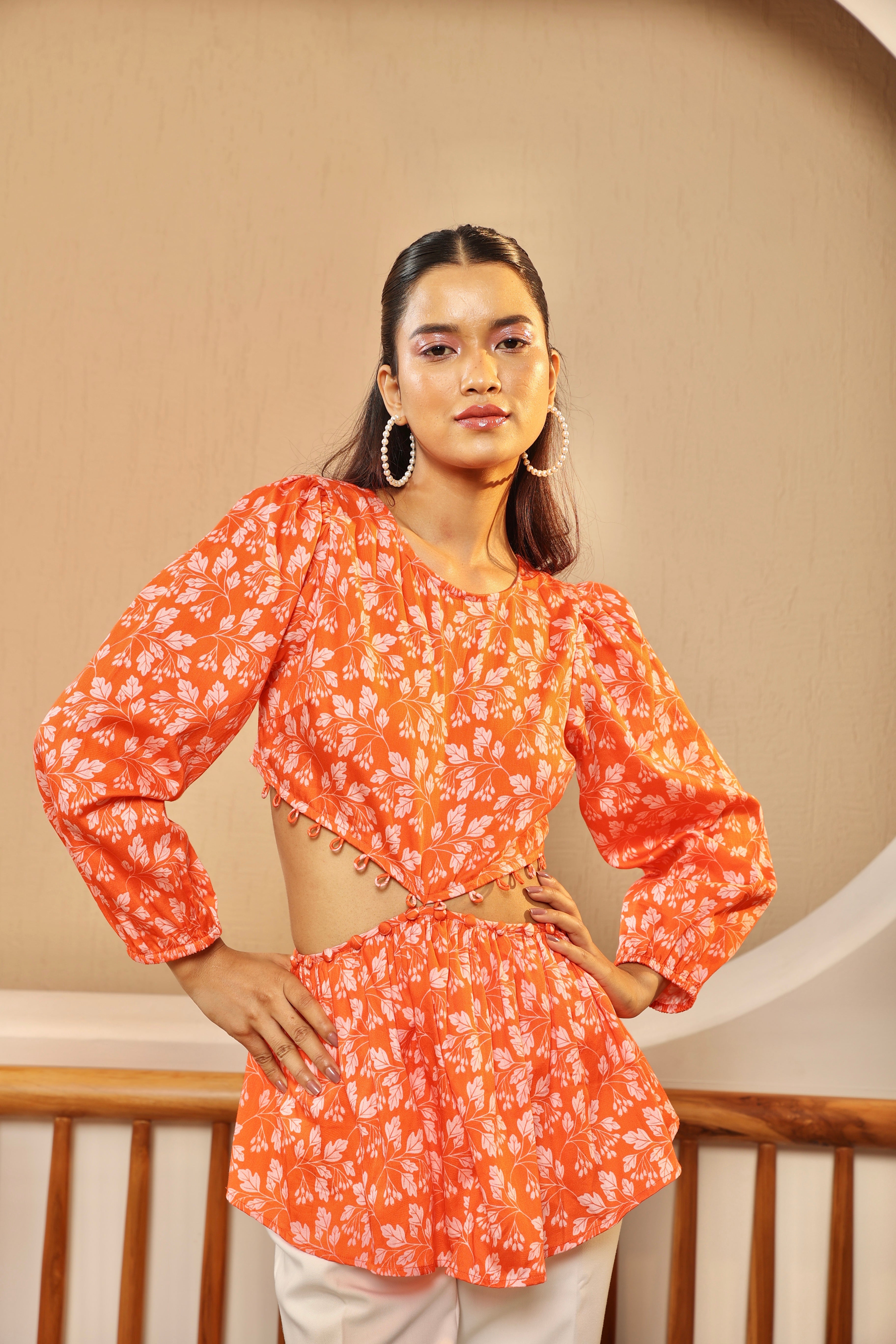 The Orange Soda Waist Cut-out Top is playful and vibrant! It has a bright orange base with a delicate baby pink floral print. It has long sleeves, a round neckline, and a peplum waist. The waist has tasteful cut-outs lined with cloth button closures. The top can be styled with the buttons open or closed. The fabric is lightweight and flowy, ideal for warm weather. It has a side zipper and an elasticated waist for comfort and ease.