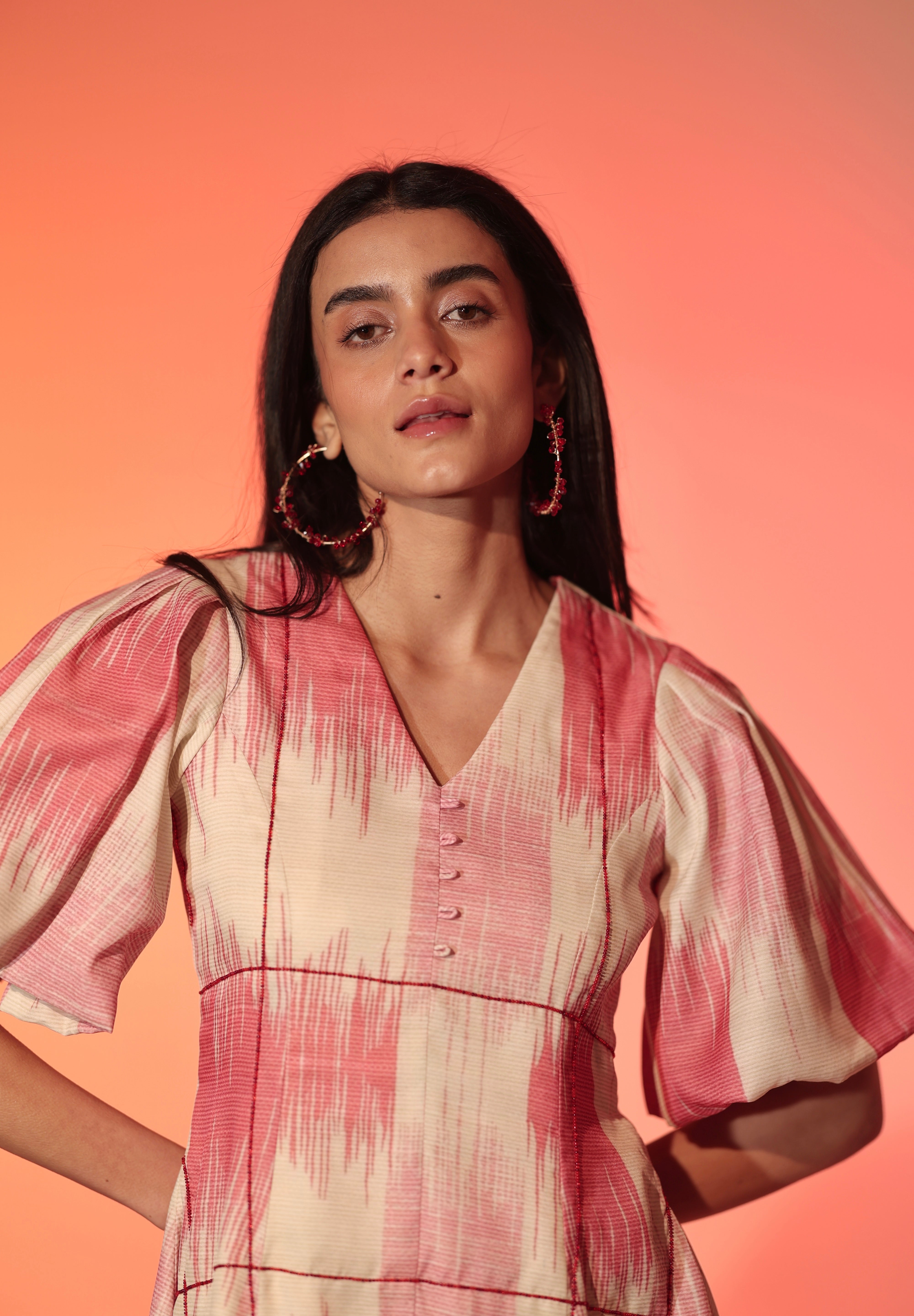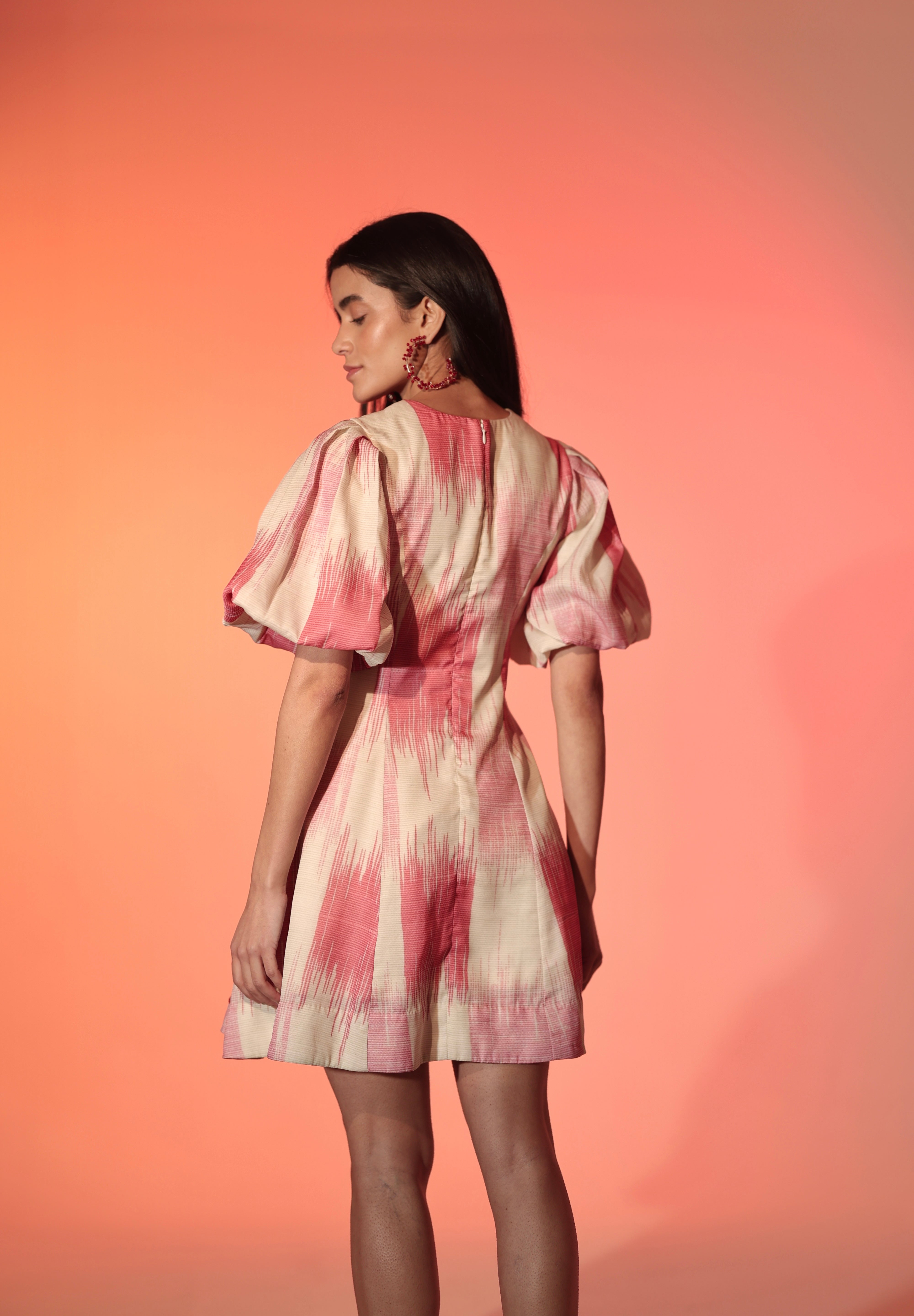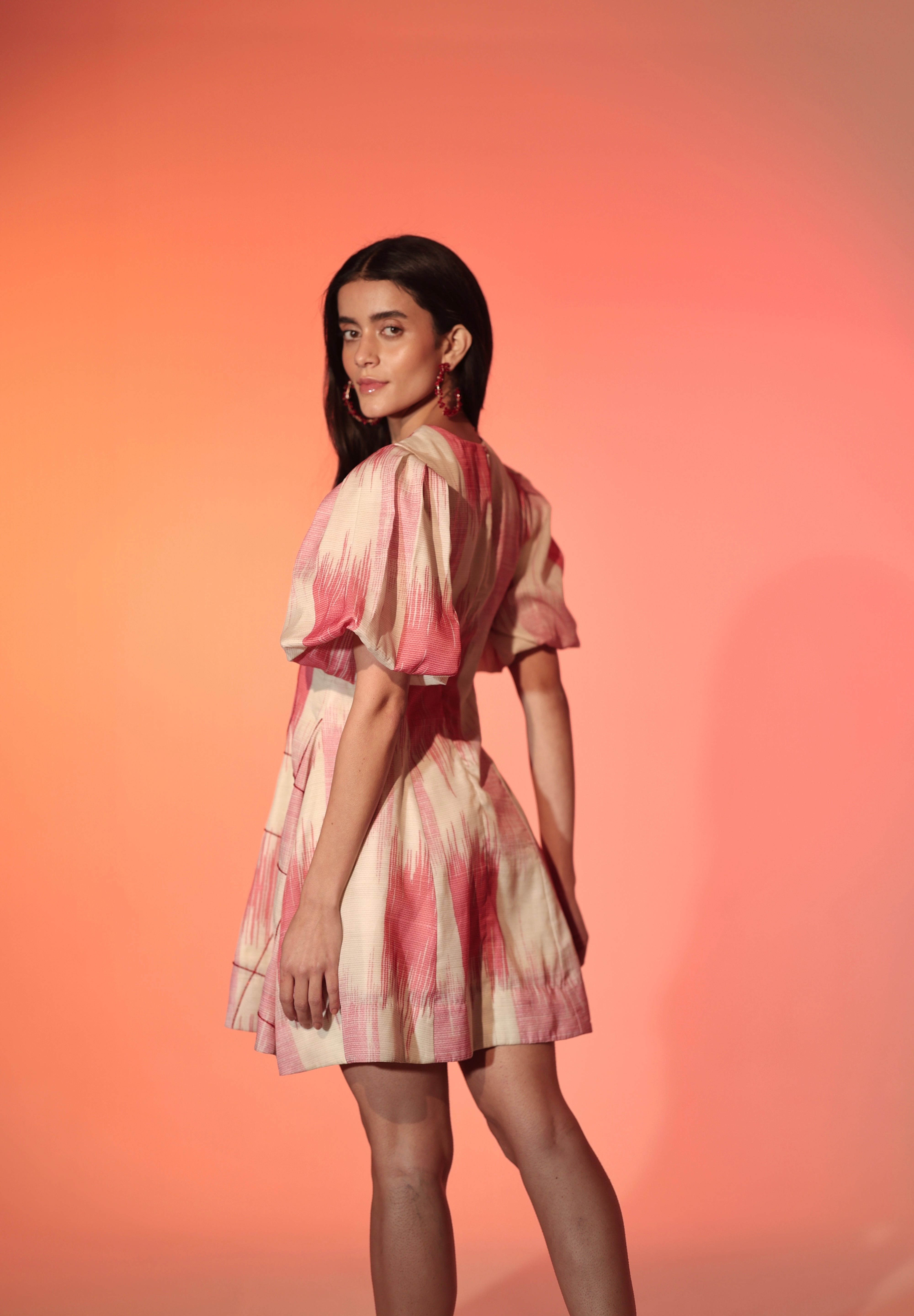 The Pink Ripple Beaded Mini is a playful yet elegant puff-sleeve dress, reminiscent of vibrant blossoms. The print is bold and beautiful, further embellished with red beaded grids. The breezy yet structured silhouette creates a look that is effortlessly bold yet soft - perfect for twirling through secret garden pathways. The dress is fully lined with a back zipper.