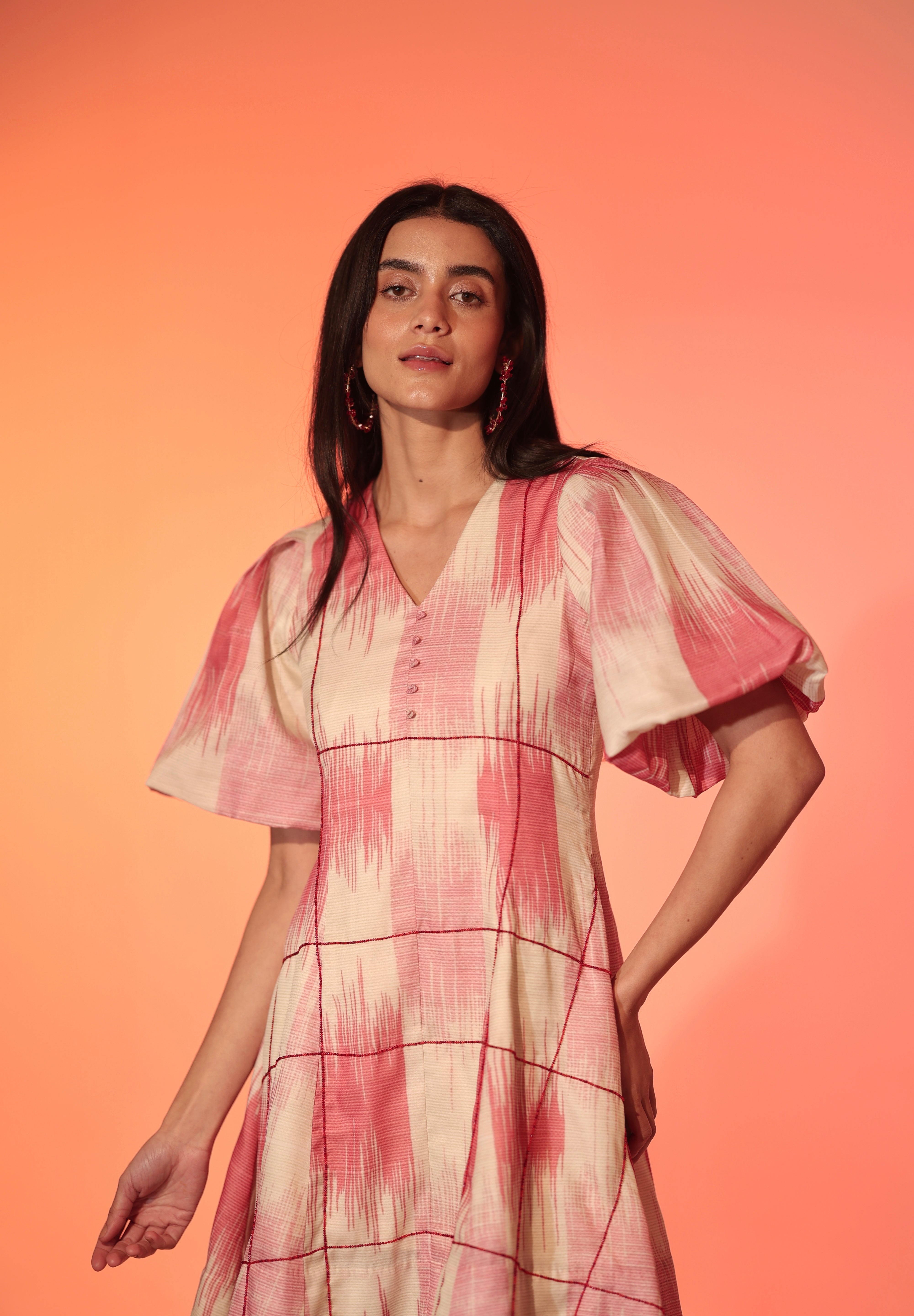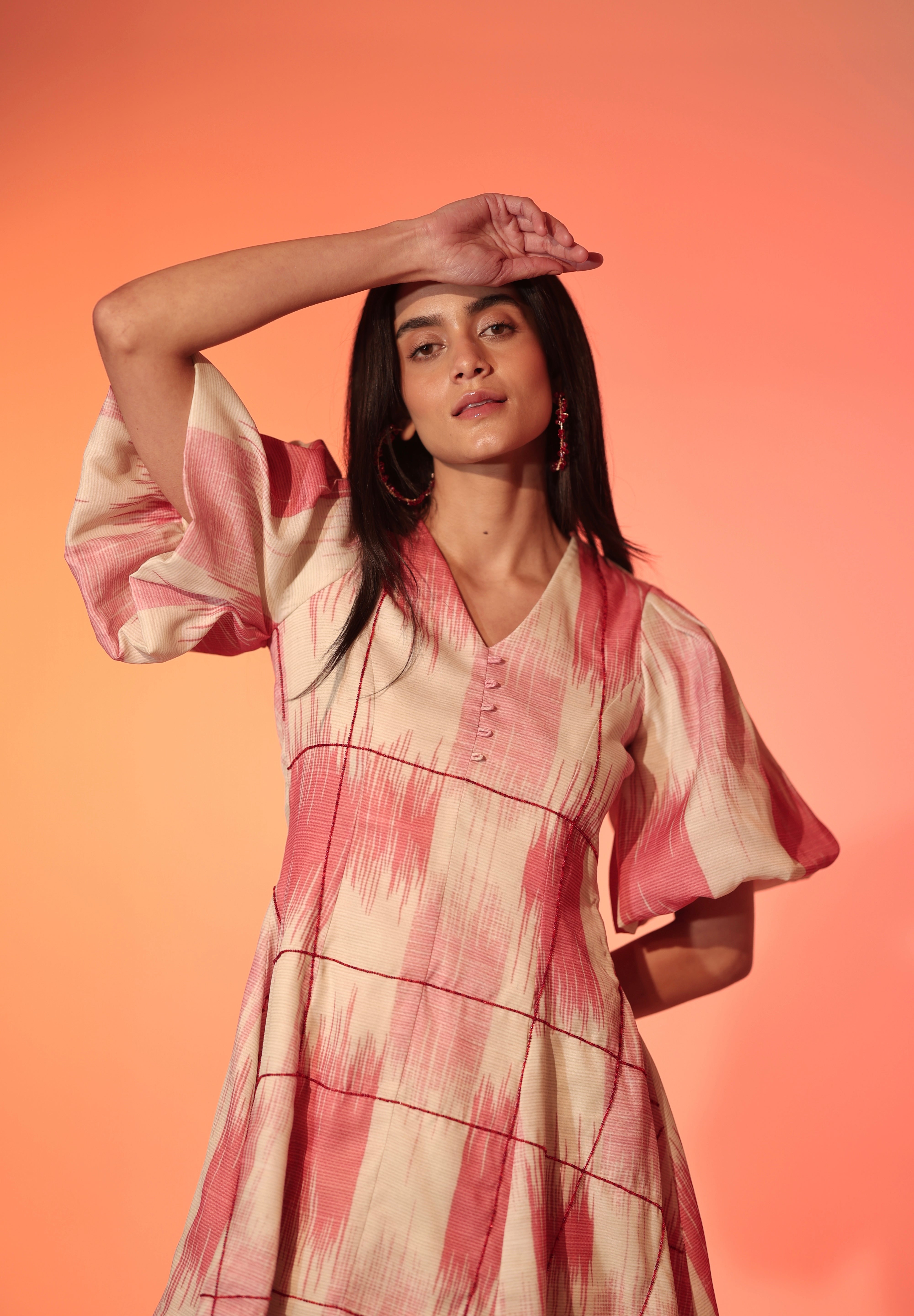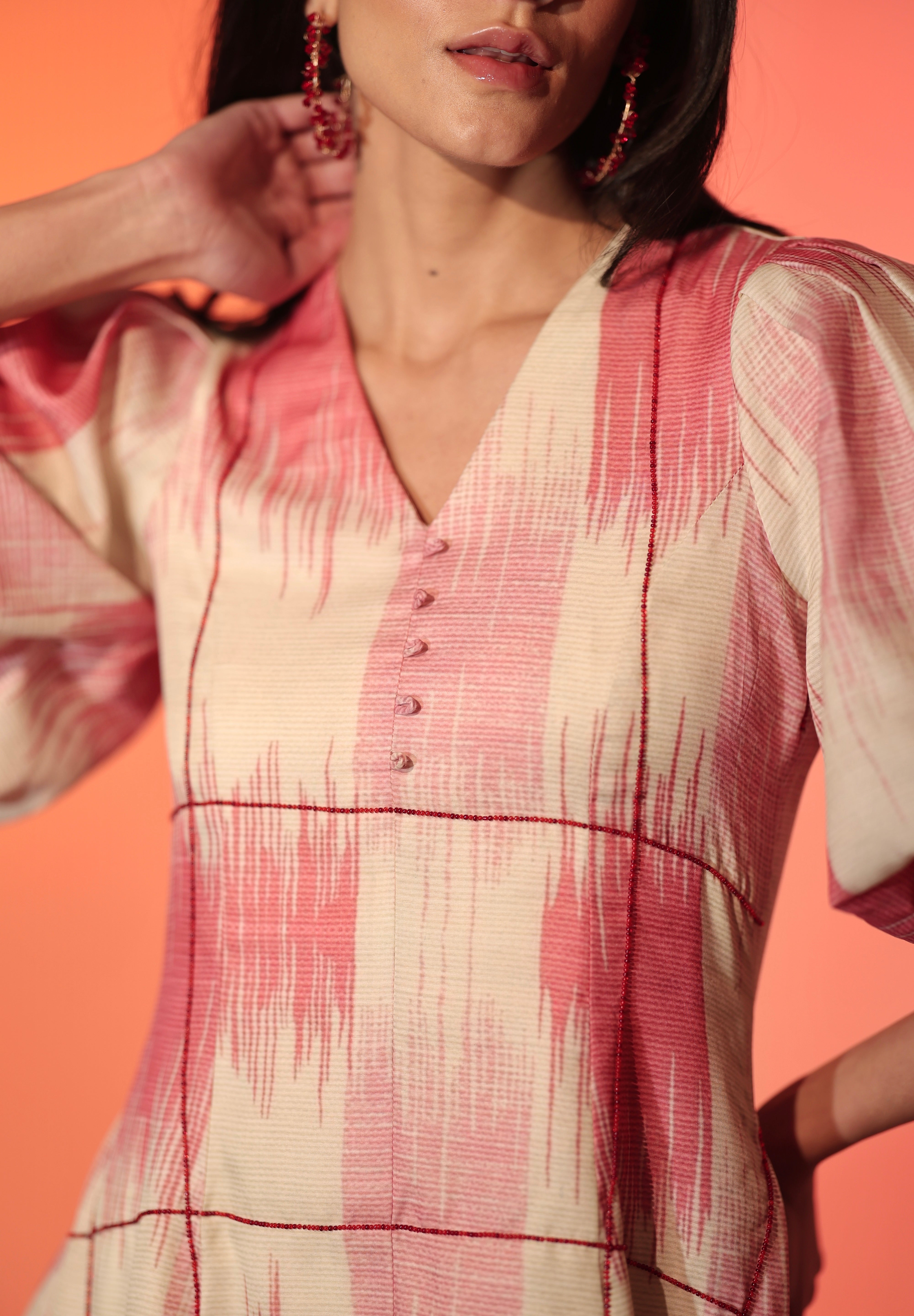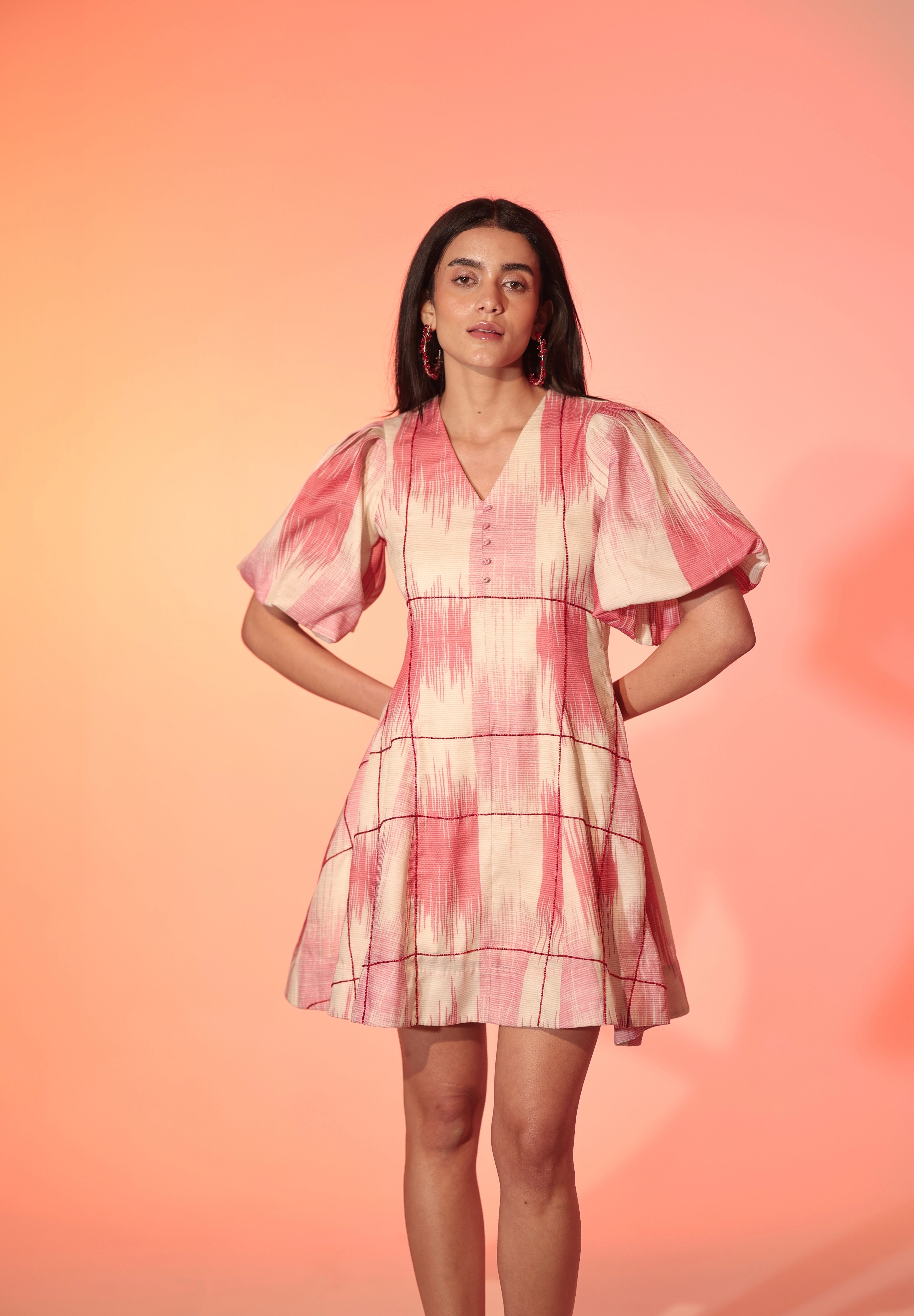 The Pink Ripple Beaded Mini is a playful yet elegant puff-sleeve dress, reminiscent of vibrant blossoms. The print is bold and beautiful, further embellished with red beaded grids. The breezy yet structured silhouette creates a look that is effortlessly bold yet soft - perfect for twirling through secret garden pathways. The dress is fully lined with a back zipper.