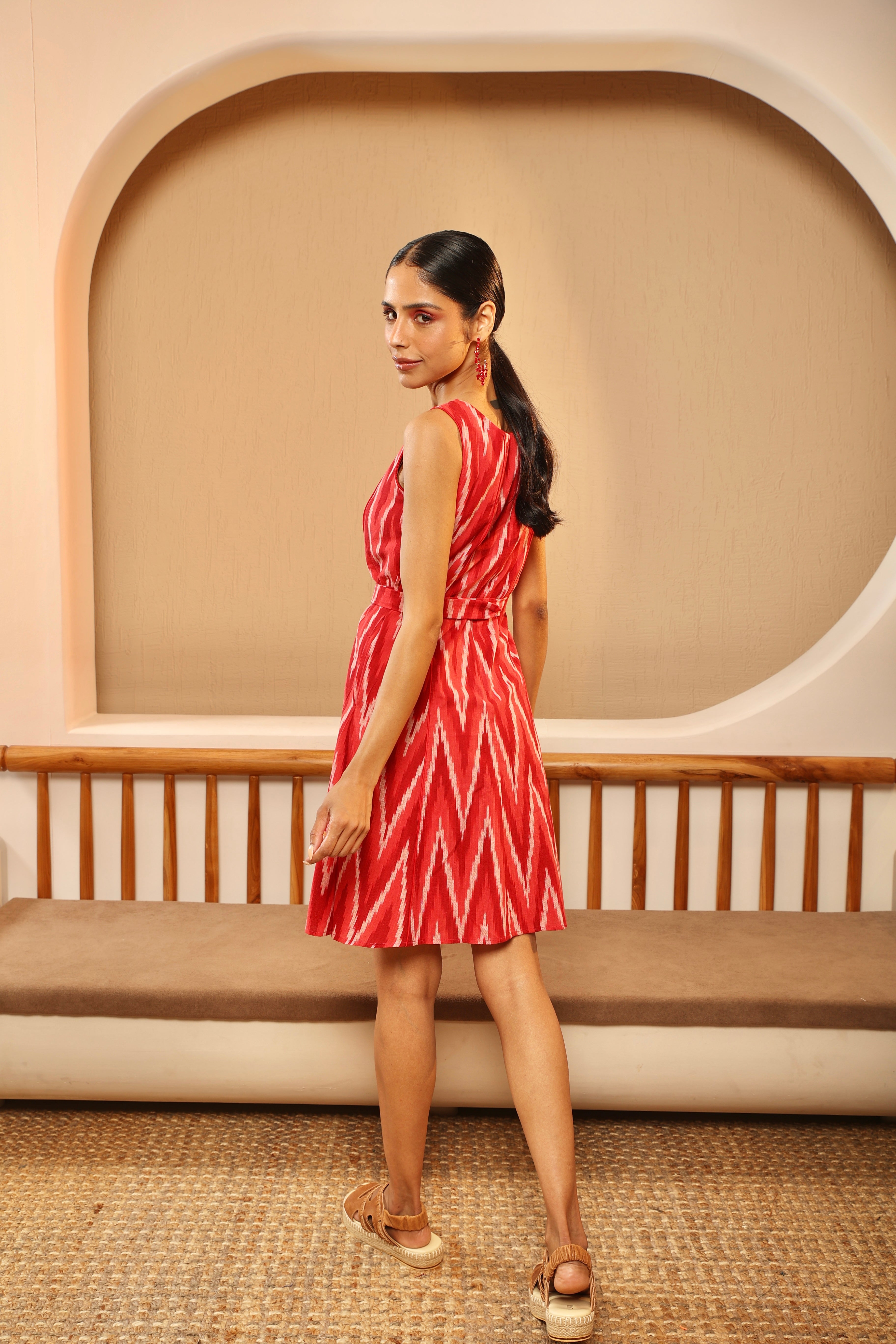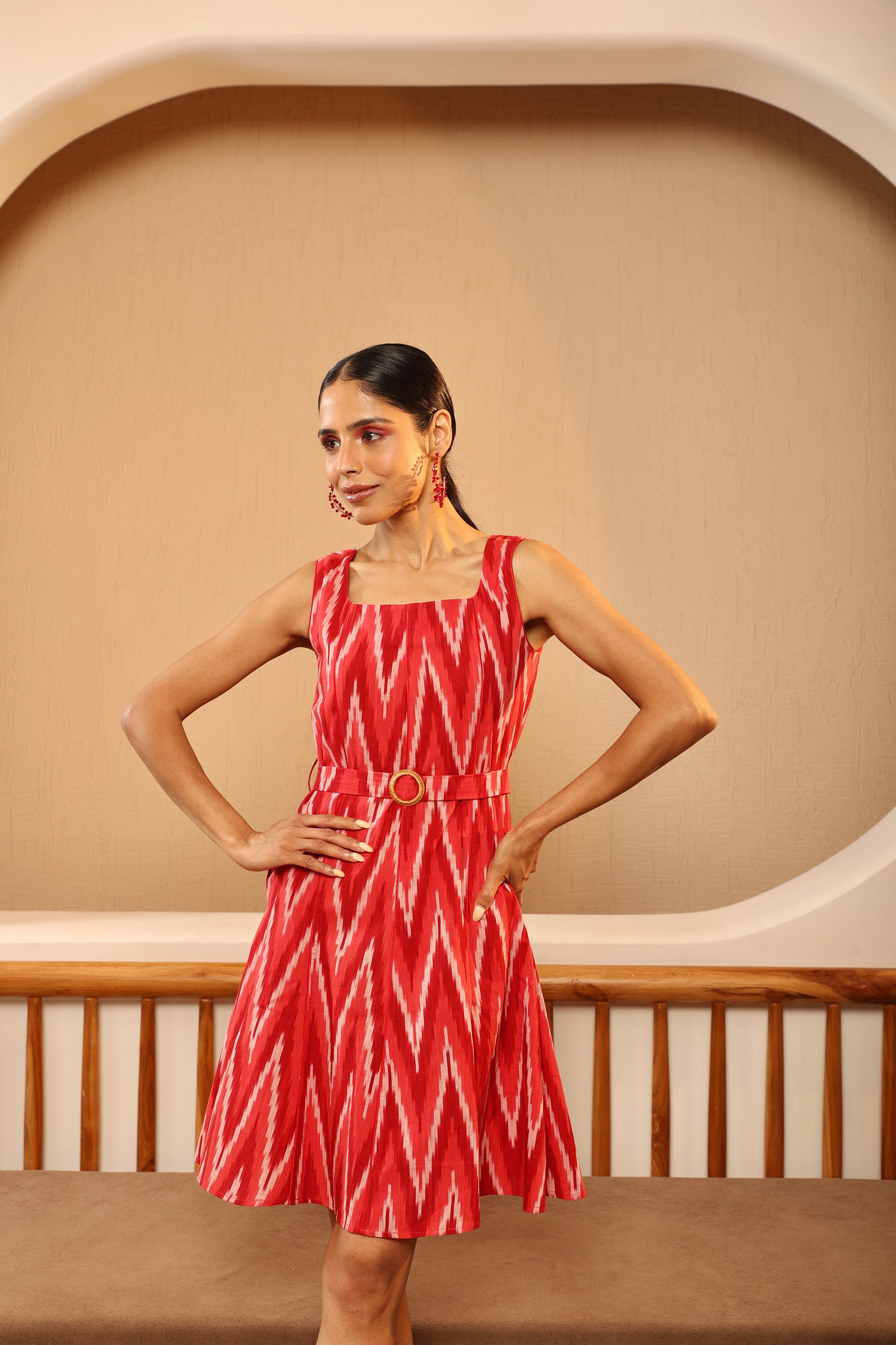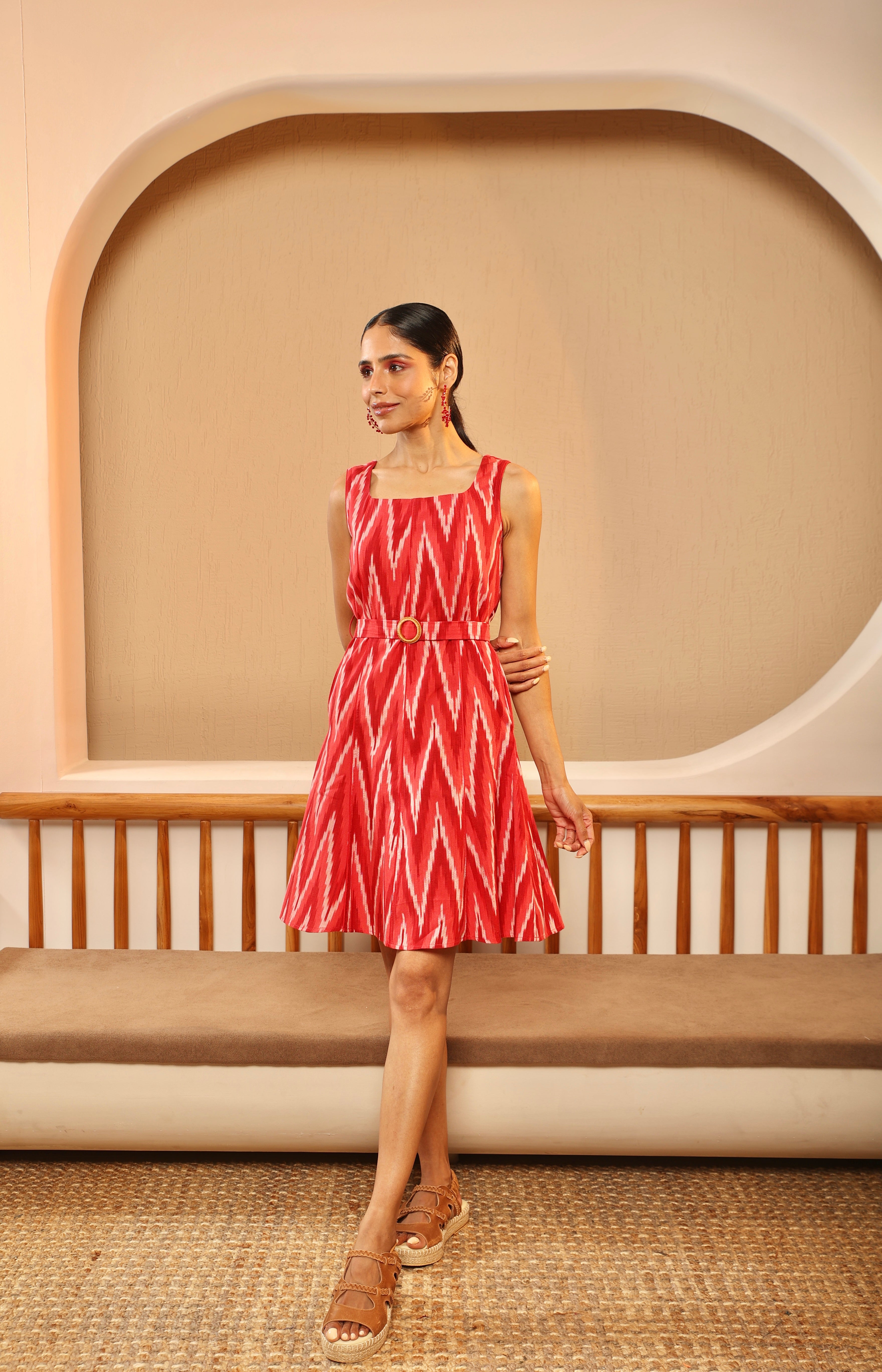 The Ruby Red Belted Mini is playful and pretty! It has a striking red base with a bold chevron pattern running vertically. It is sleeveless, with a square neckline and has a fit-and-flare silhouette. The dress has delicate piping details throughout the body to give it the most flattering fit. It also includes a matching belt with a circular buckle to accentuate the waist. It features a back zipper.