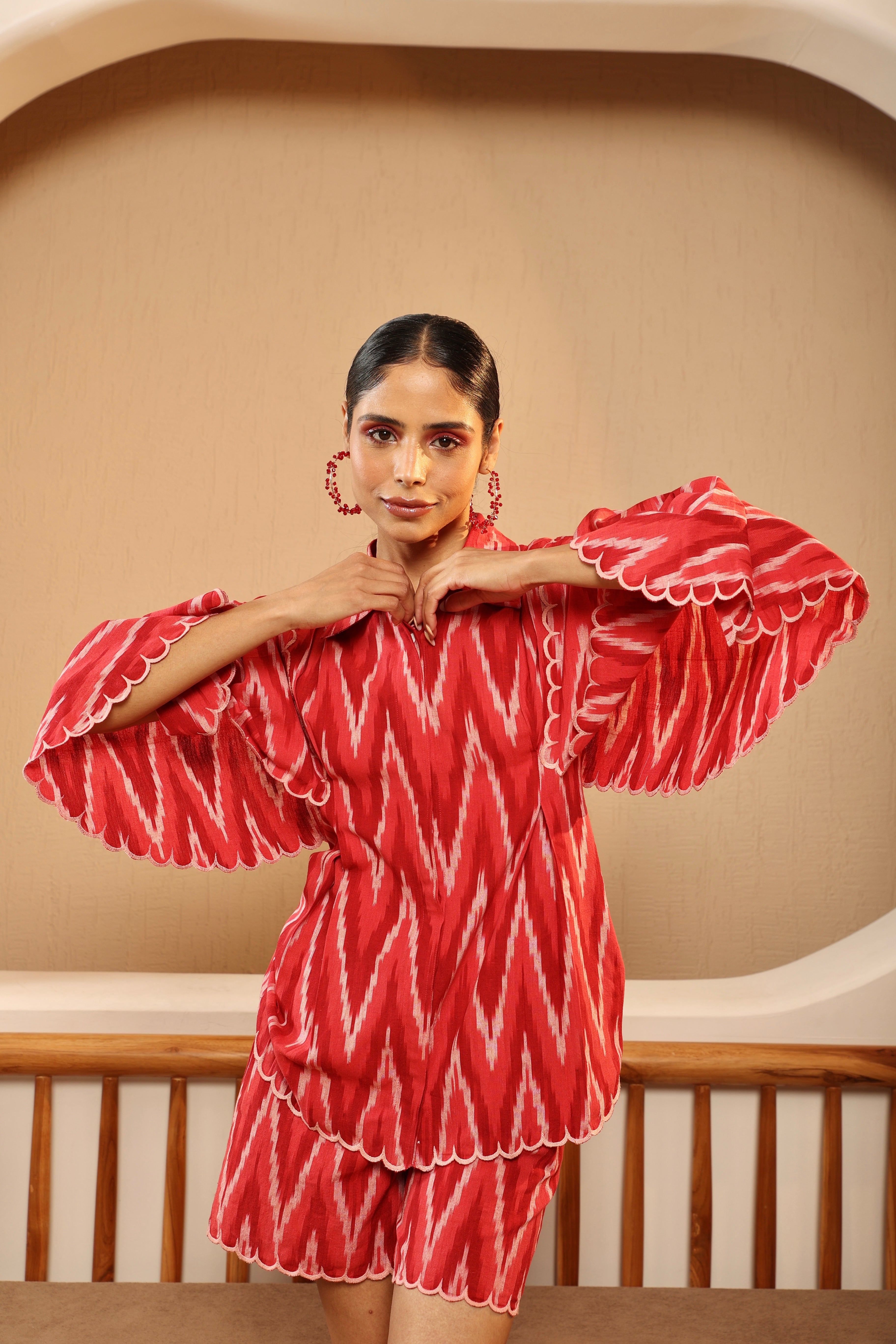 The Ruby Red Scalloped Set has a striking red base with a bold chevron pattern running vertically. It includes a Red Ikat shirt with a matching bralette and shorts. The Shirt has a relaxed fit with unique oversized sleeves. The sleeves and hem feature embroidered scallop detailing. It has a button down front. The bralette is fitted with a smocked back, adjustable straps and a scalloped, hand embroidered hem. The shorts are high waisted with a waistband, side zipper and buckle closure. It also features a scalloped, hand embroidered hem. The set is easy, breezy and vibrant. Perfect for a beach vacation, and easy to style as separates to create different fun looks! Buy it as a set or as separates.
