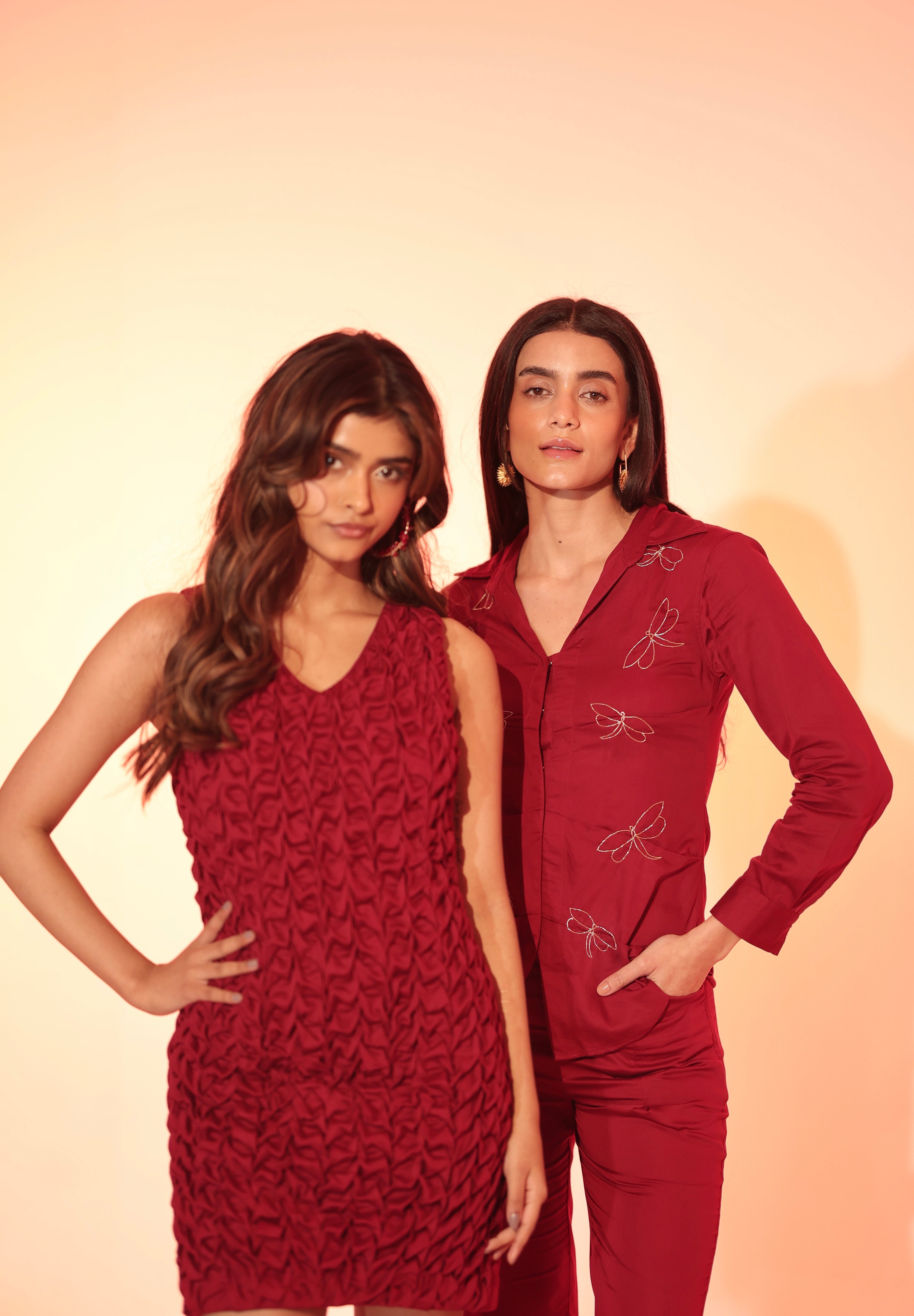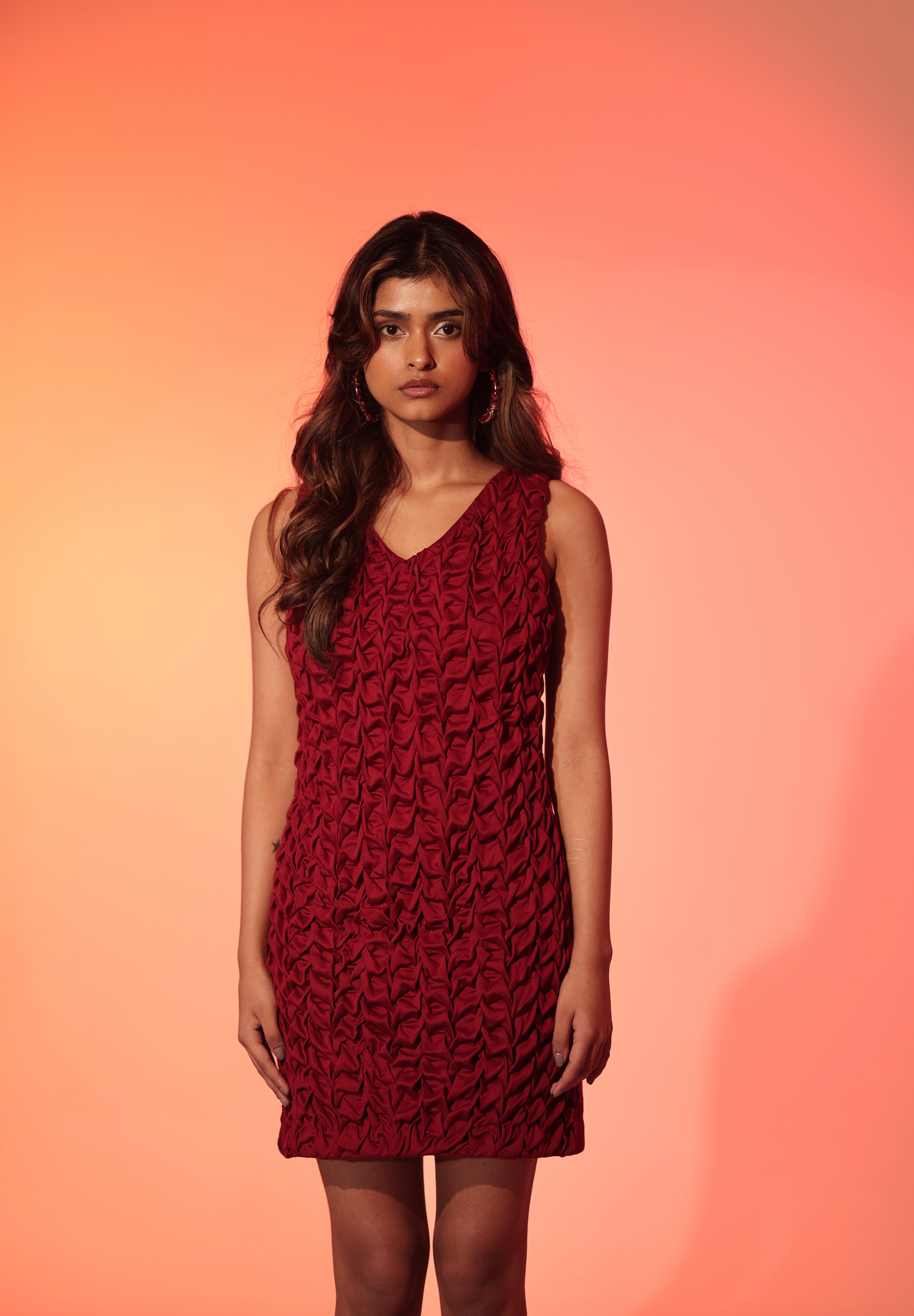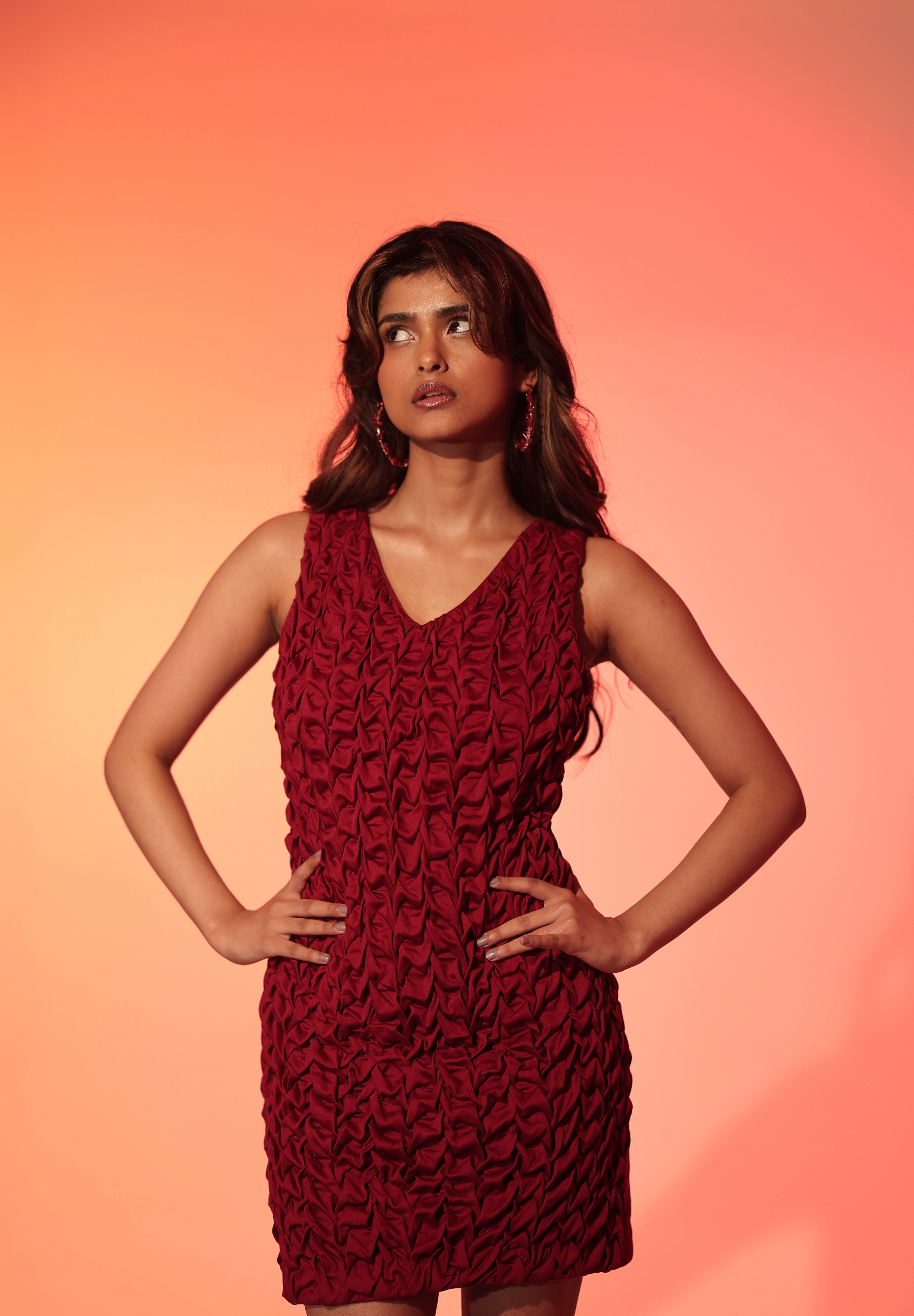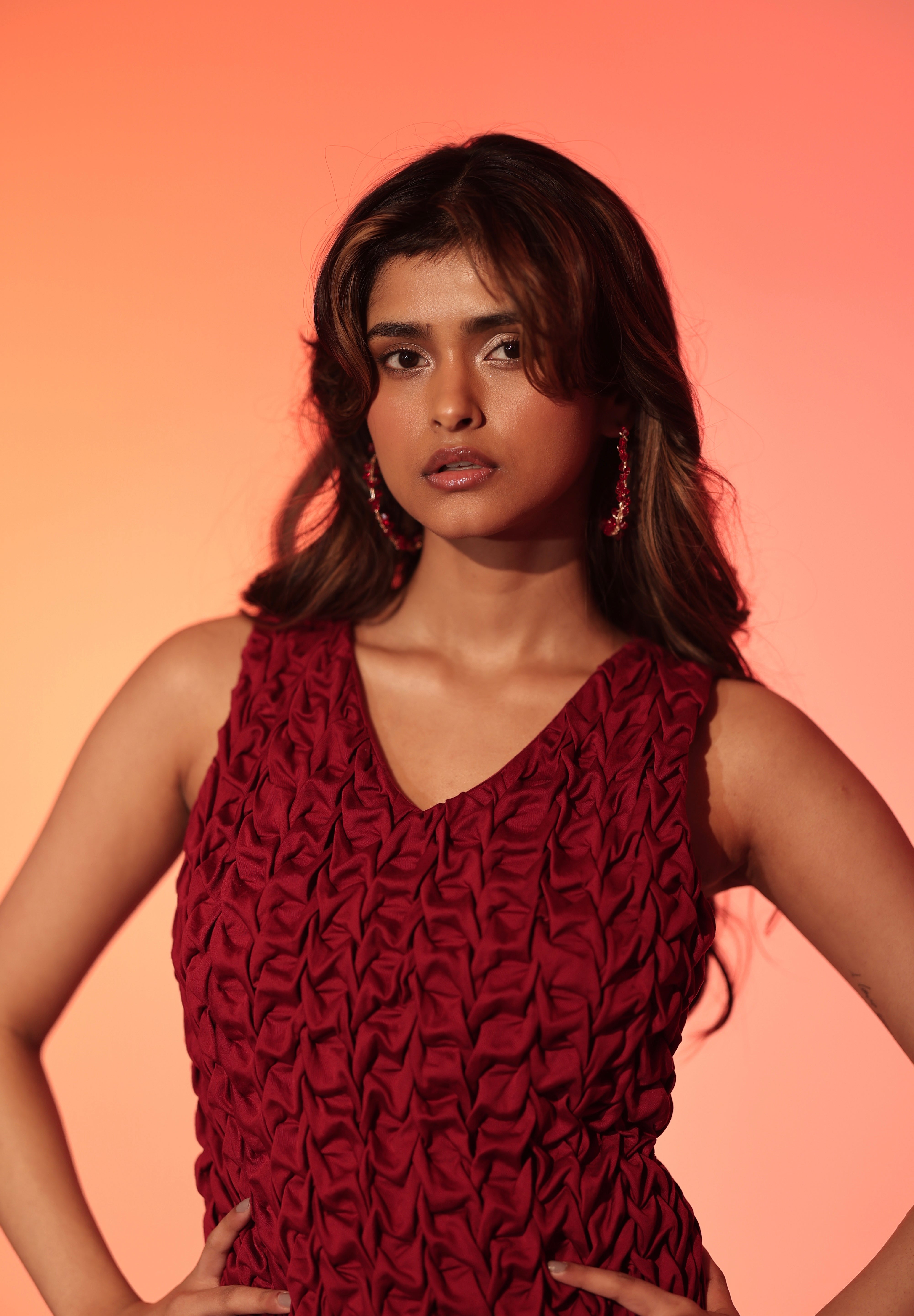 The Ruby Smocked Dress consists of highly intricate handcrafted fabric manipulation throughout the body. The silhouette hugs the body in a flattering manner, it is sleeveless, has a V-neck, and a back zipper. The cotton satin fabric is butter soft to the skin, creating both visual interest and structure. Make a statement in this stylish yet comfortable dress, all while looking striking and fiery in the bold burgundy!