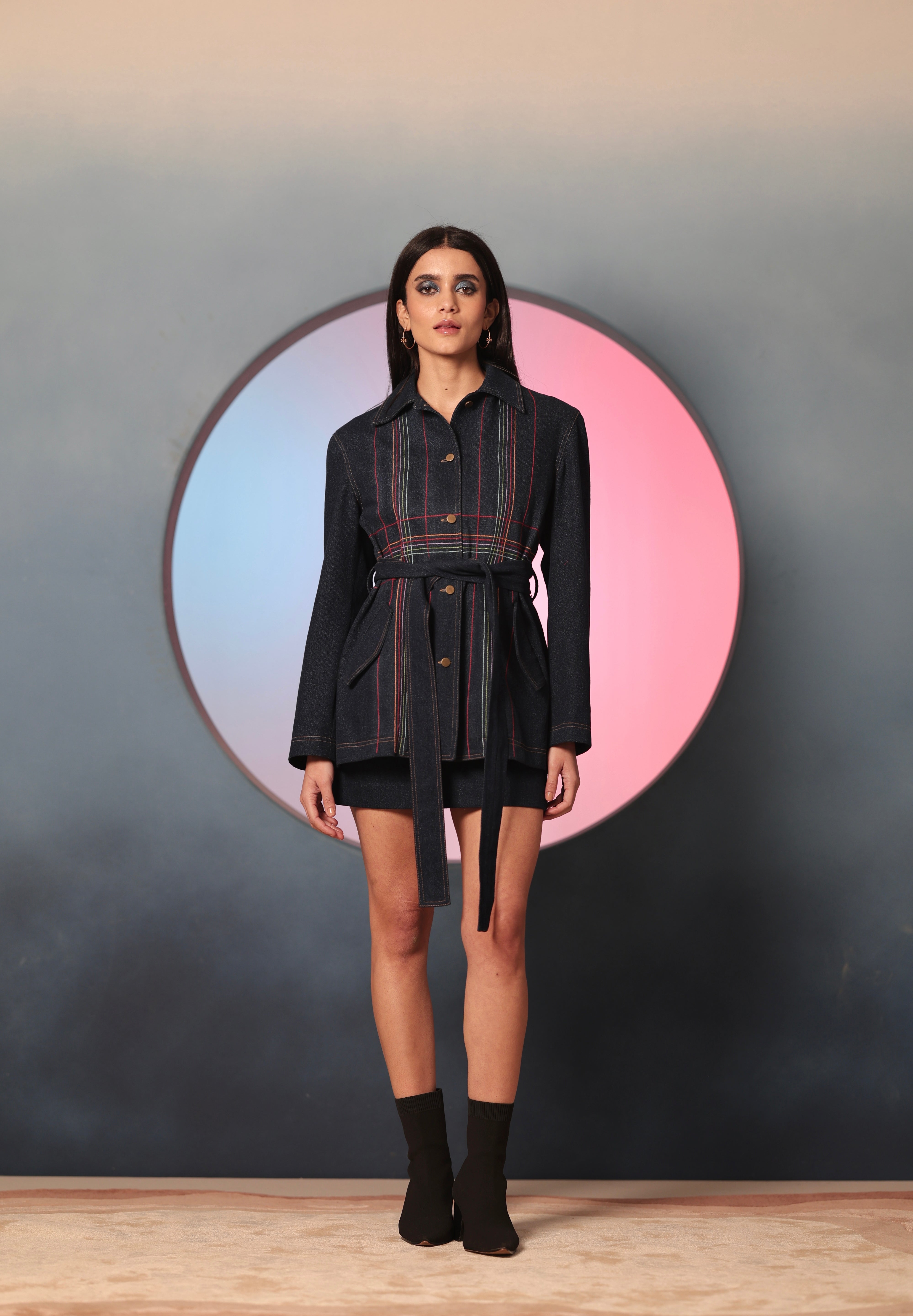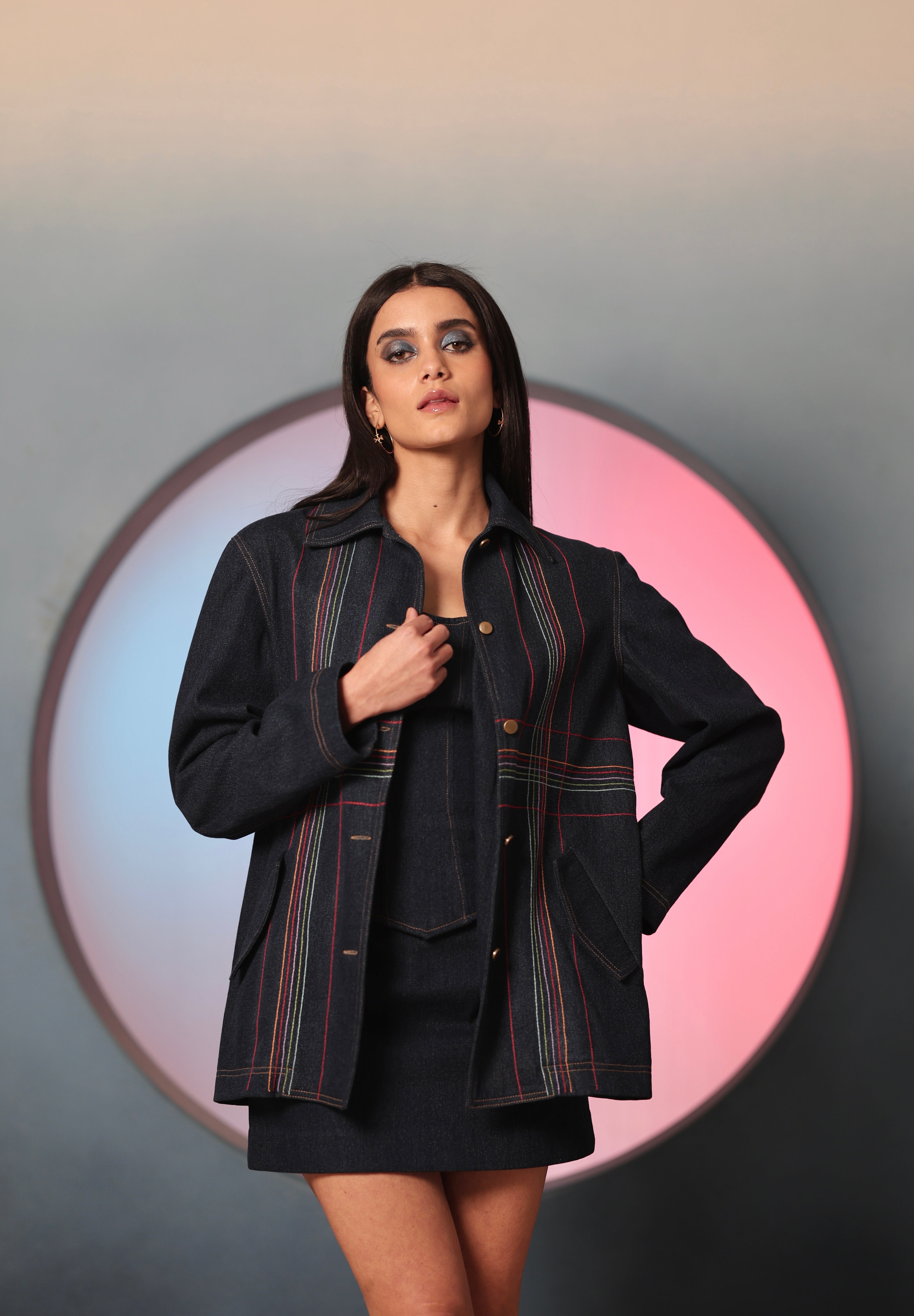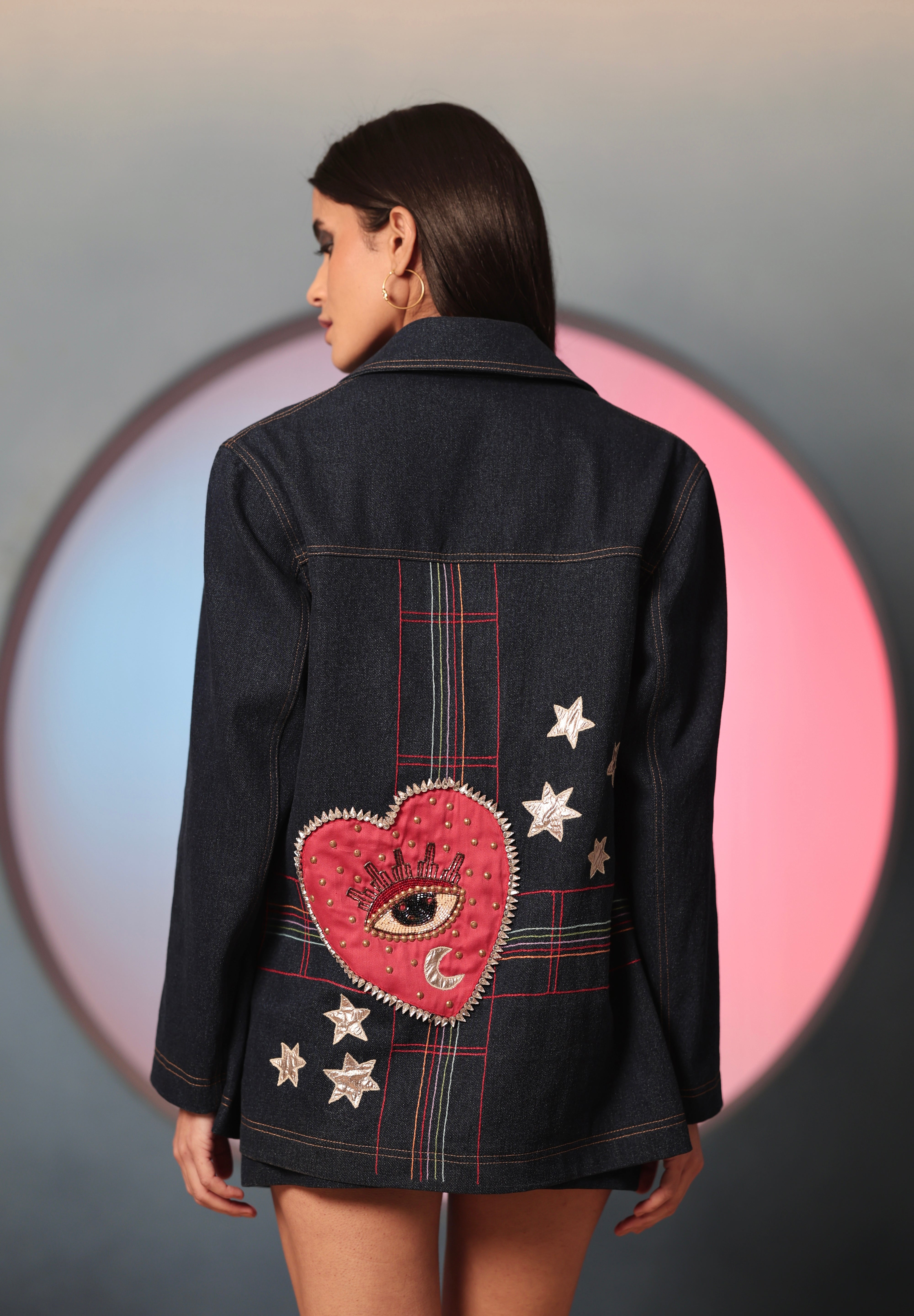The Starlit Galaxy Oversized Denim Jacket blends celestial and whimsical elements to create a magical mirage. The dark denim is embellished with hand embroidery and motifs to create a textural landscape. The jacket has an oversized fit with the option of cinching it at the waist with an added belt. It has metallic buttons down the front. Pair it with our Dark Wash Denim Mini Skirt and Dark Wash Denim Corset Top to look super chic and straight out of a 90’s film!