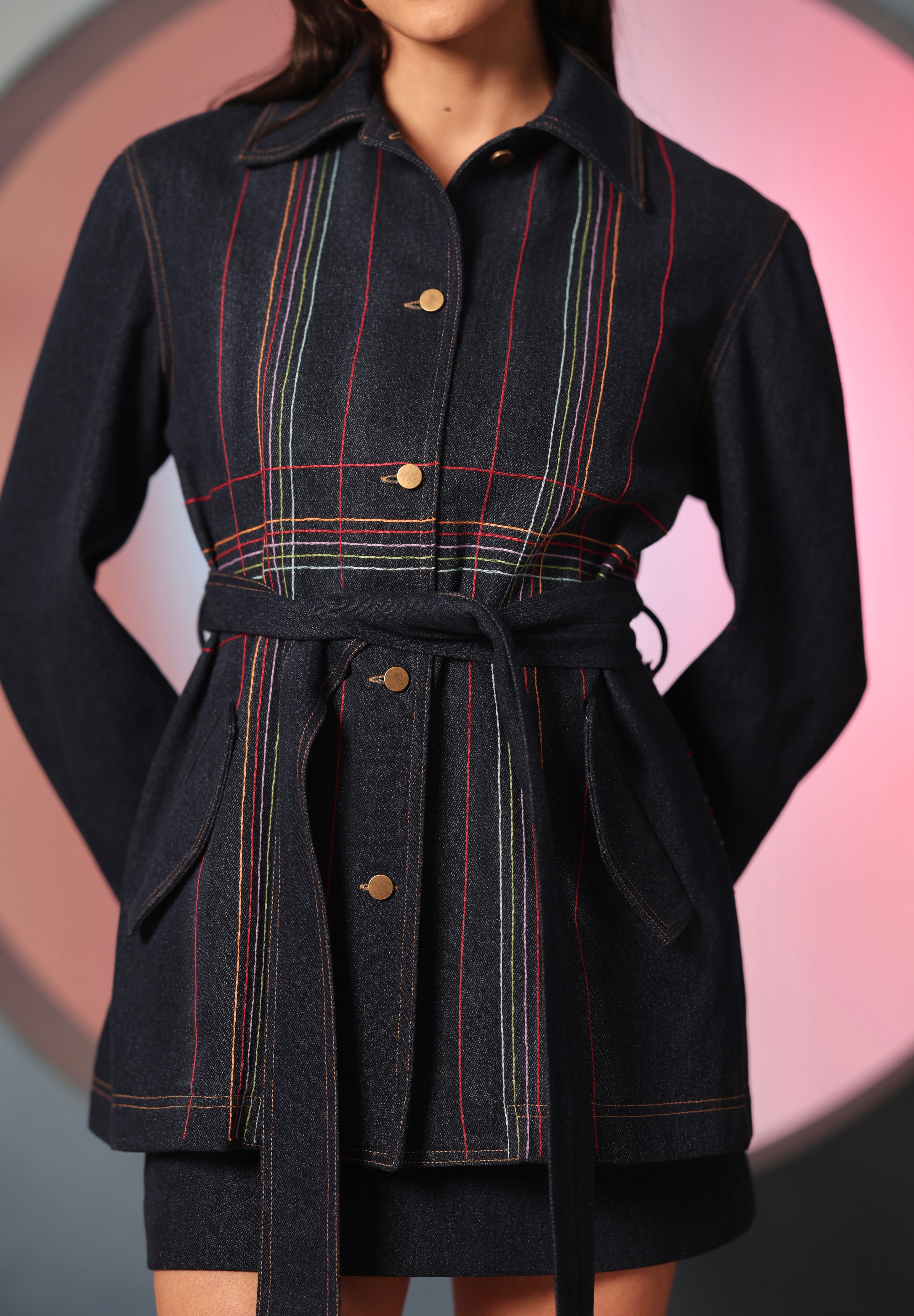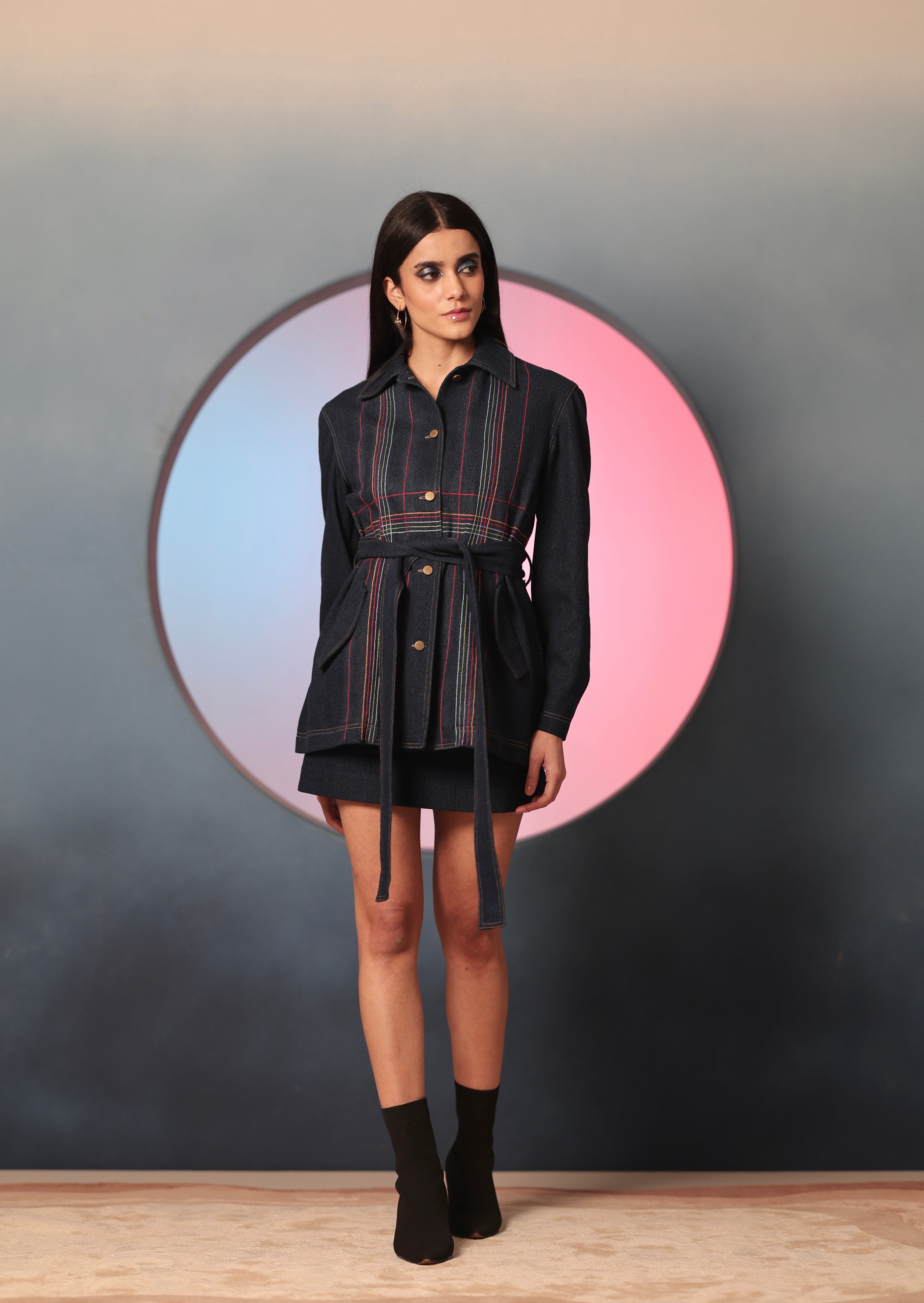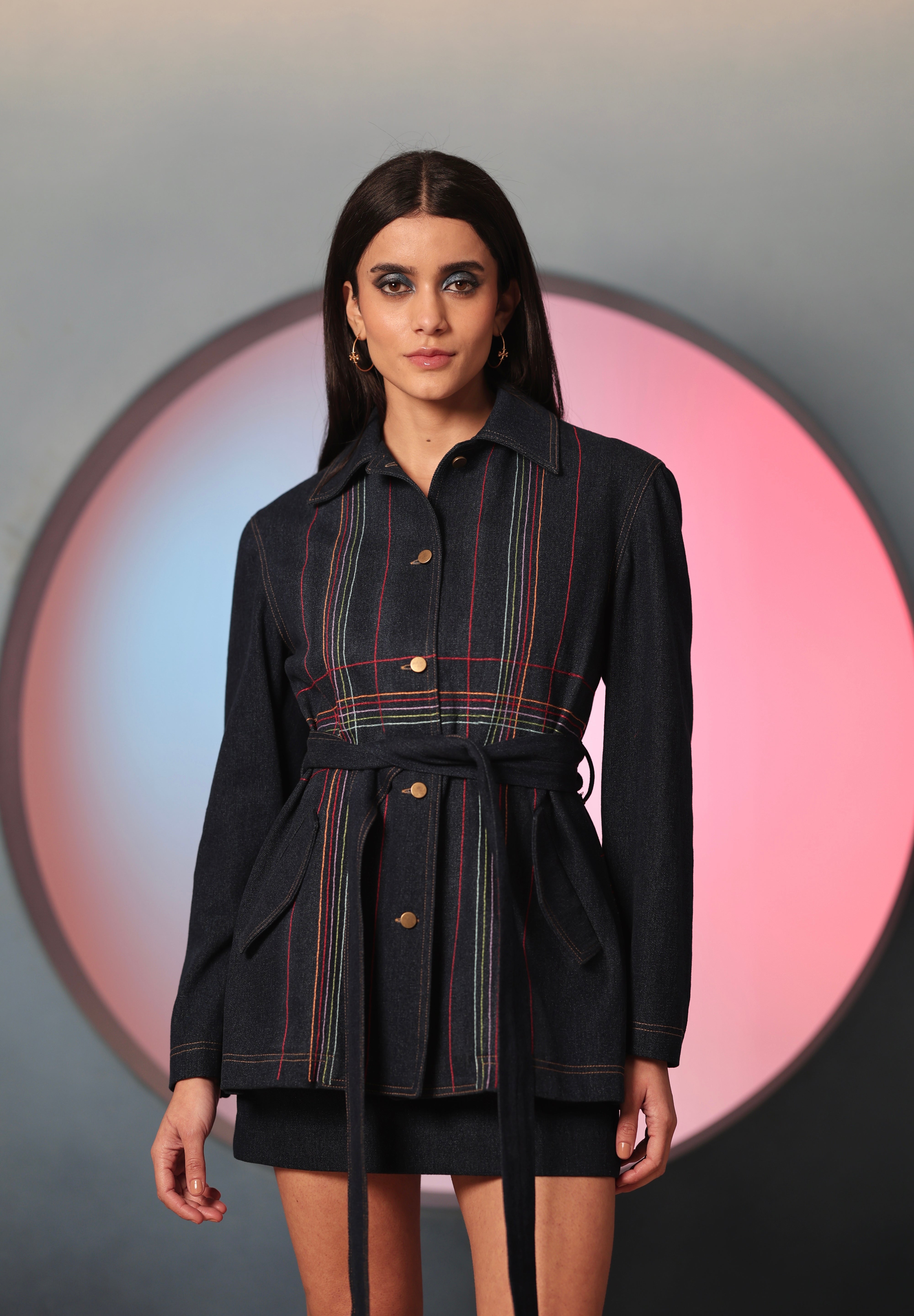 The Starlit Galaxy Oversized Denim Jacket blends celestial and whimsical elements to create a magical mirage. The dark denim is embellished with hand embroidery and motifs to create a textural landscape. The jacket has an oversized fit with the option of cinching it at the waist with an added belt. It has metallic buttons down the front. Pair it with our Dark Wash Denim Mini Skirt and Dark Wash Denim Corset Top to look super chic and straight out of a 90’s film!