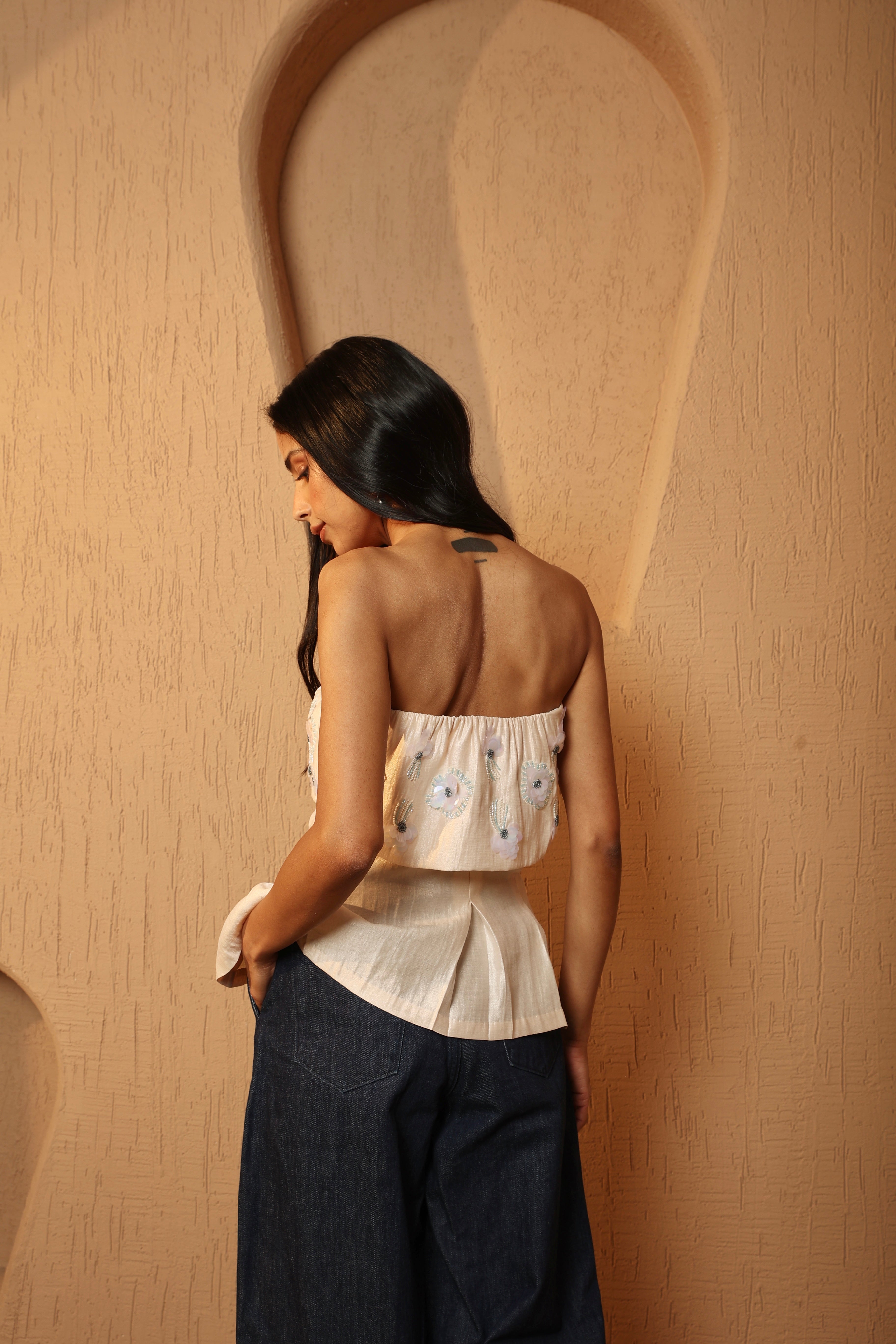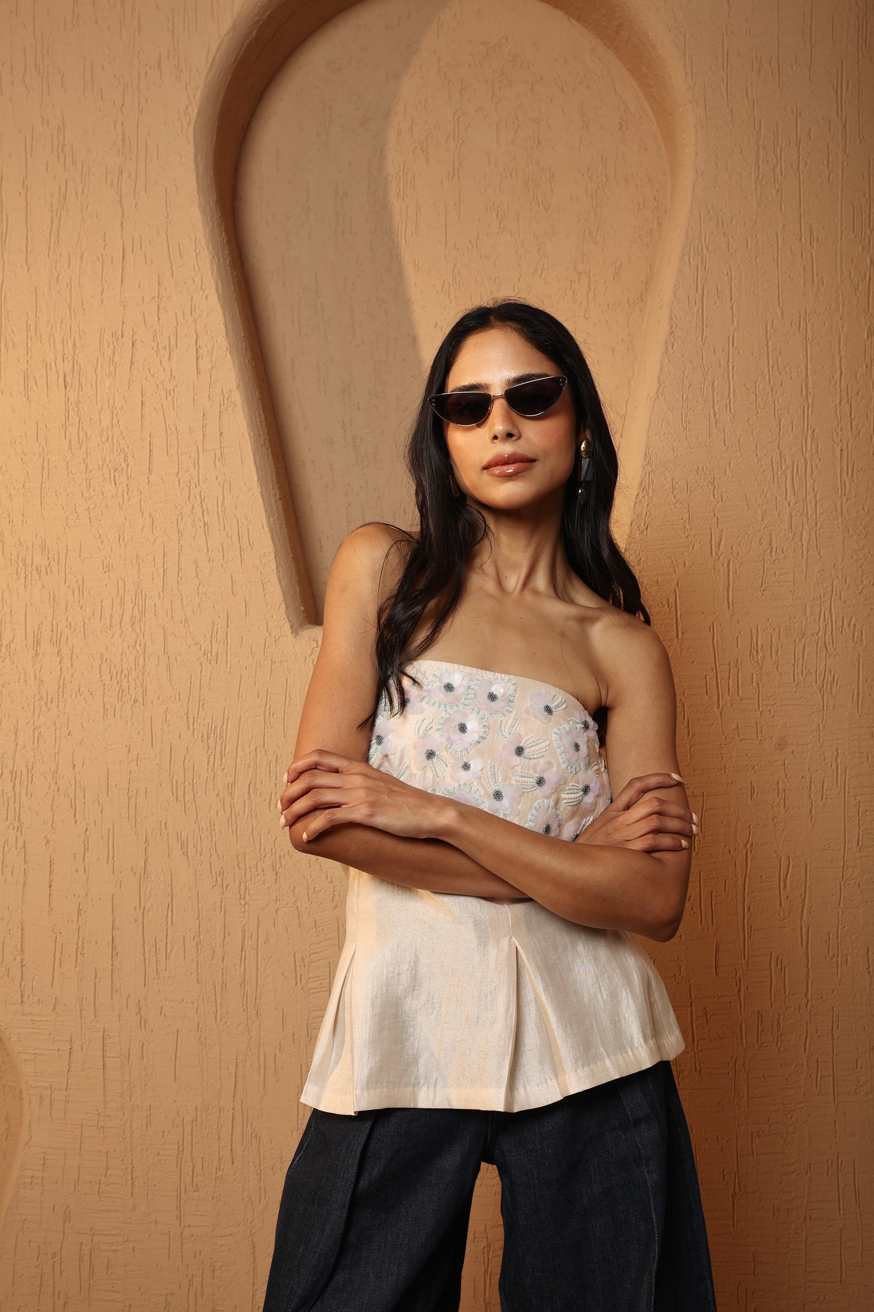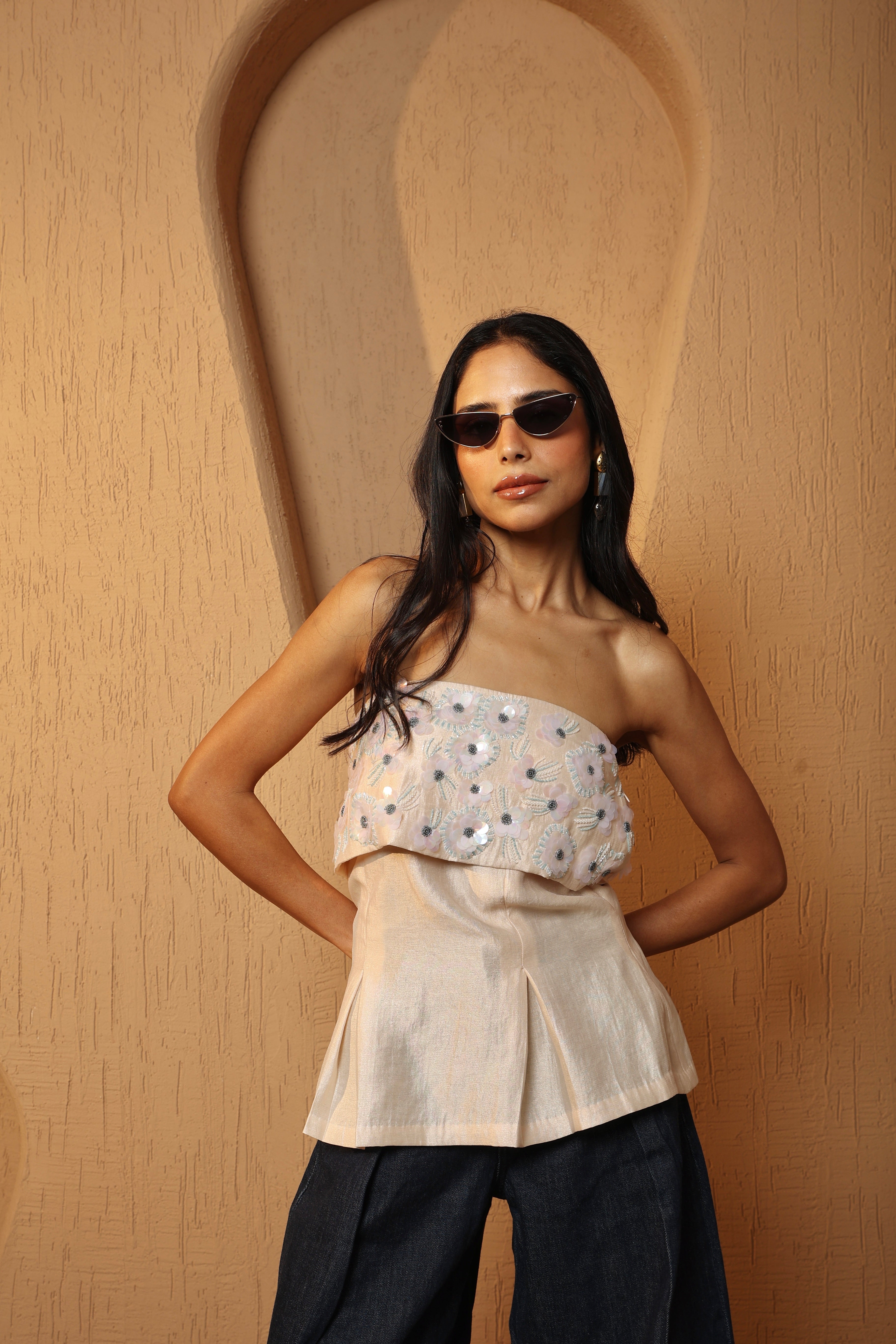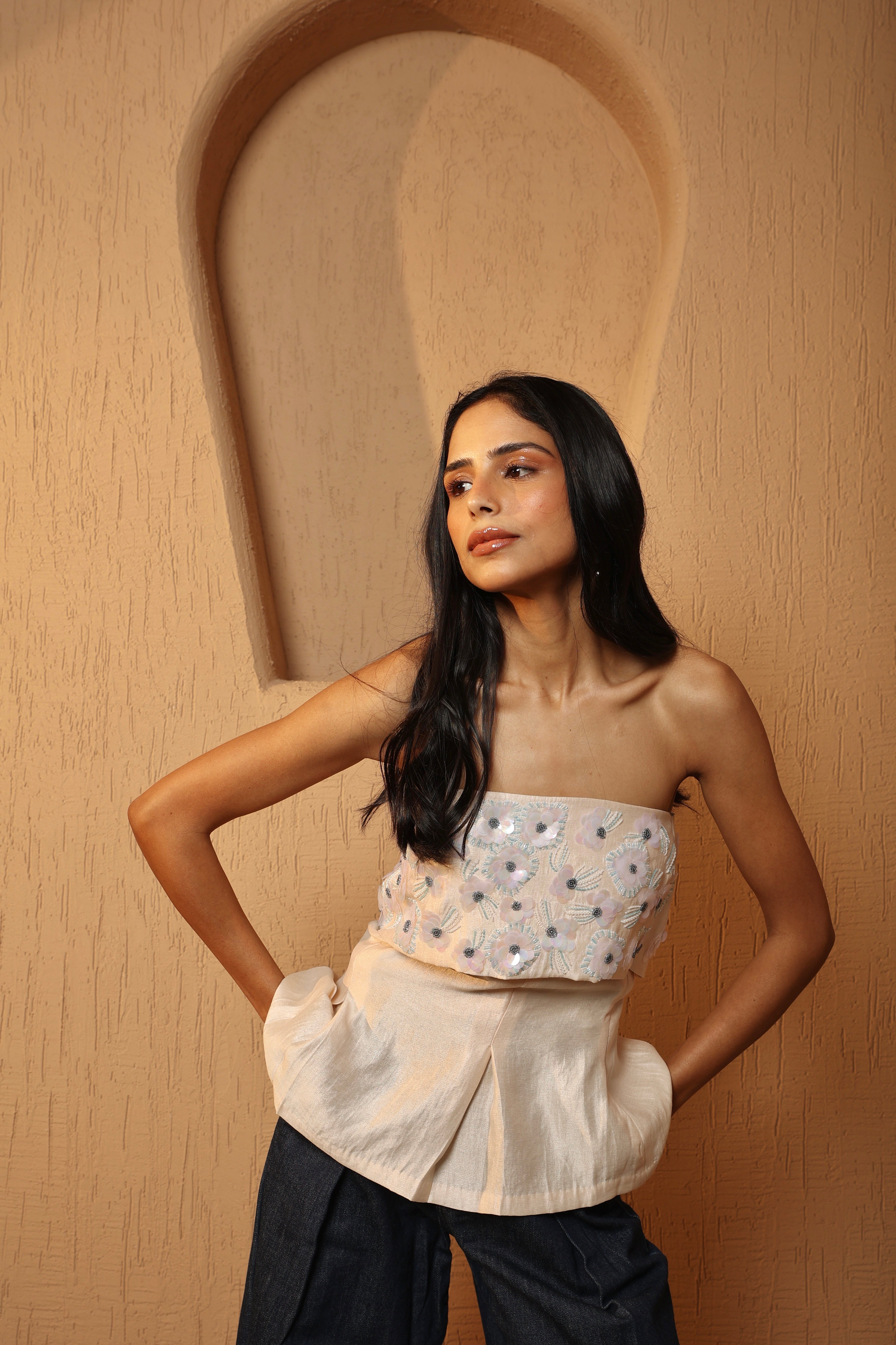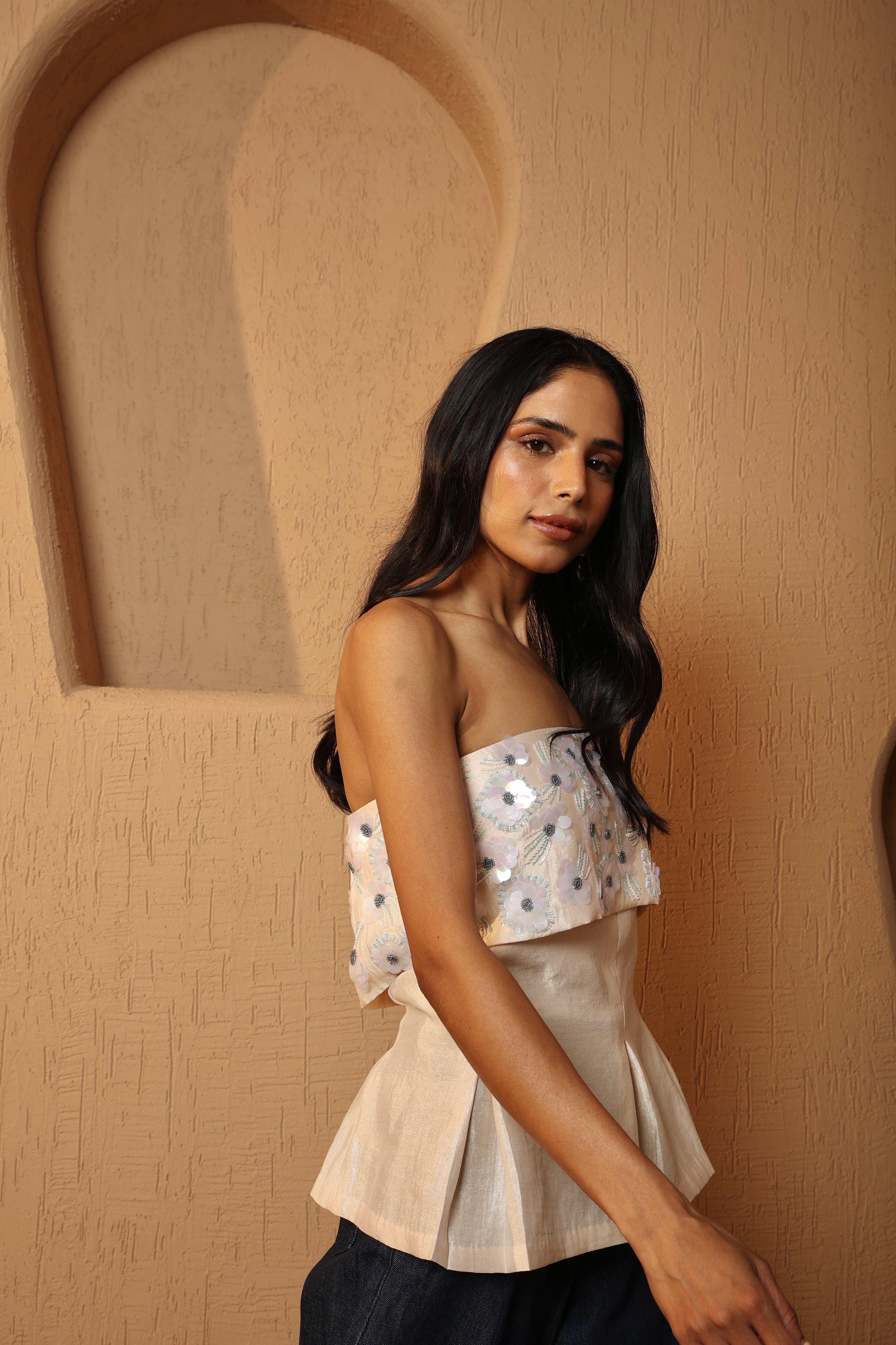 The Strapless Sherbet Embellished Top features rich sequins and beadwork in tones of ivory and blue on the top half. It has a flattering fit achieved through creative construction on the bottom half - cinching at the waist and flaring out elegantly.