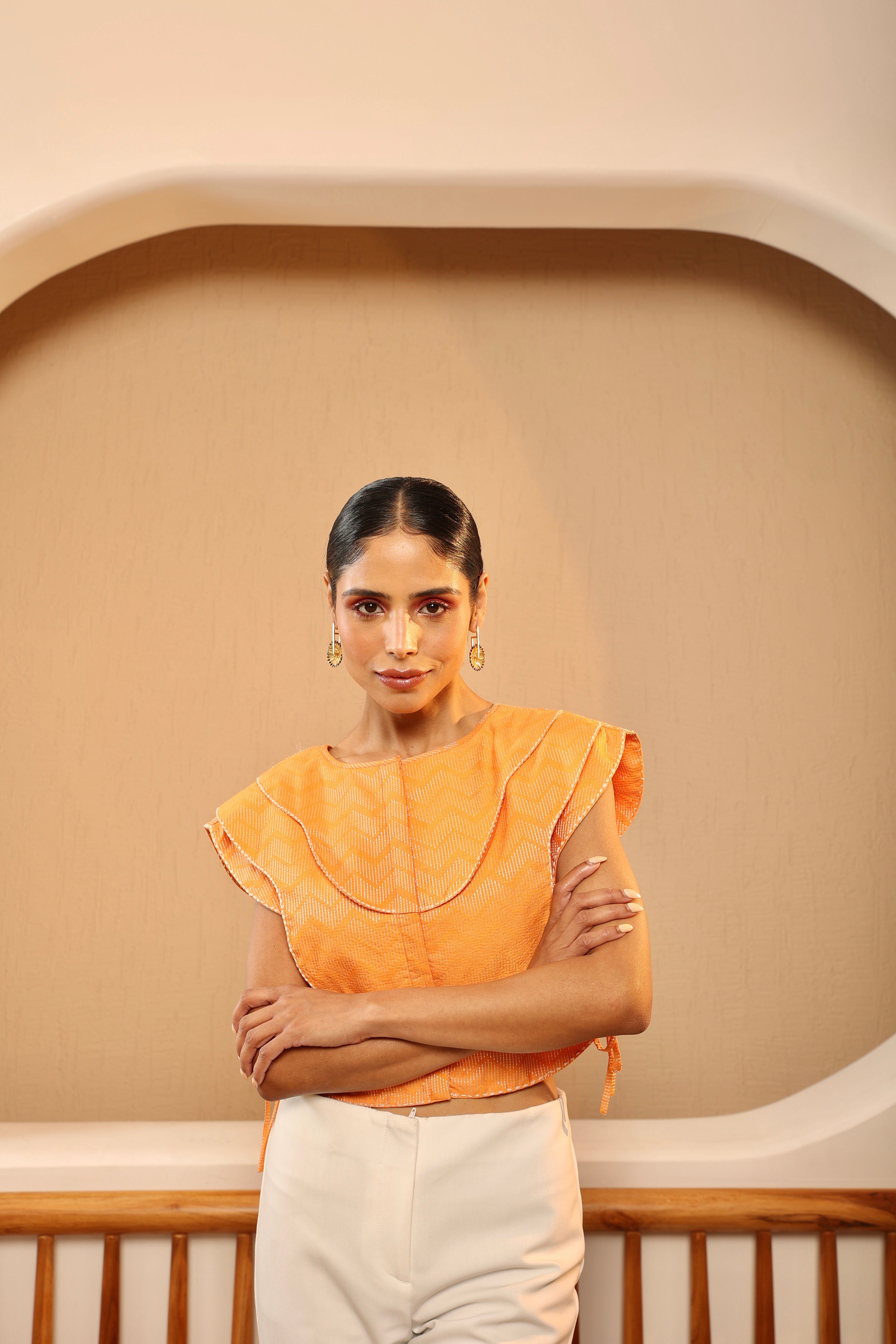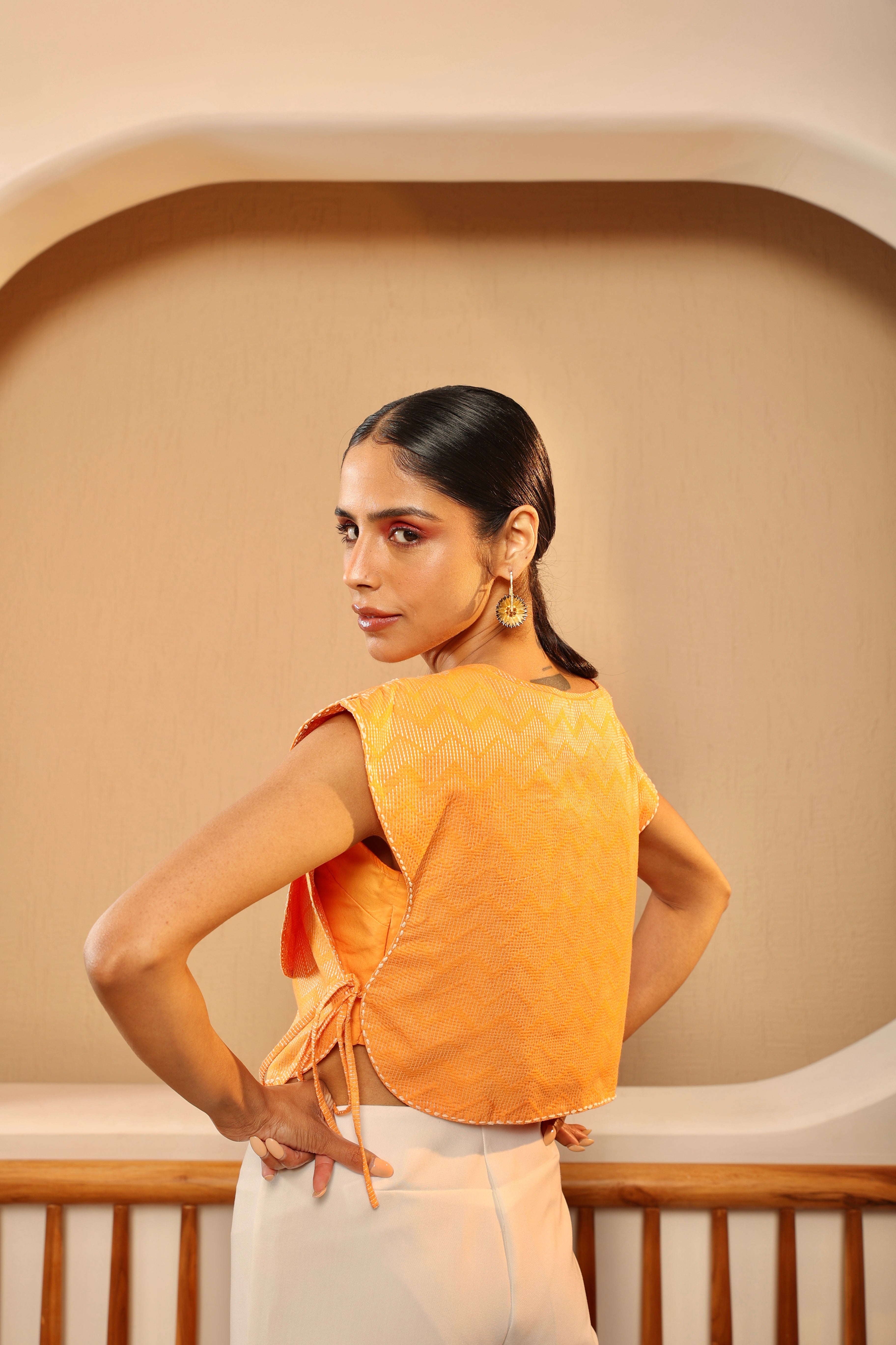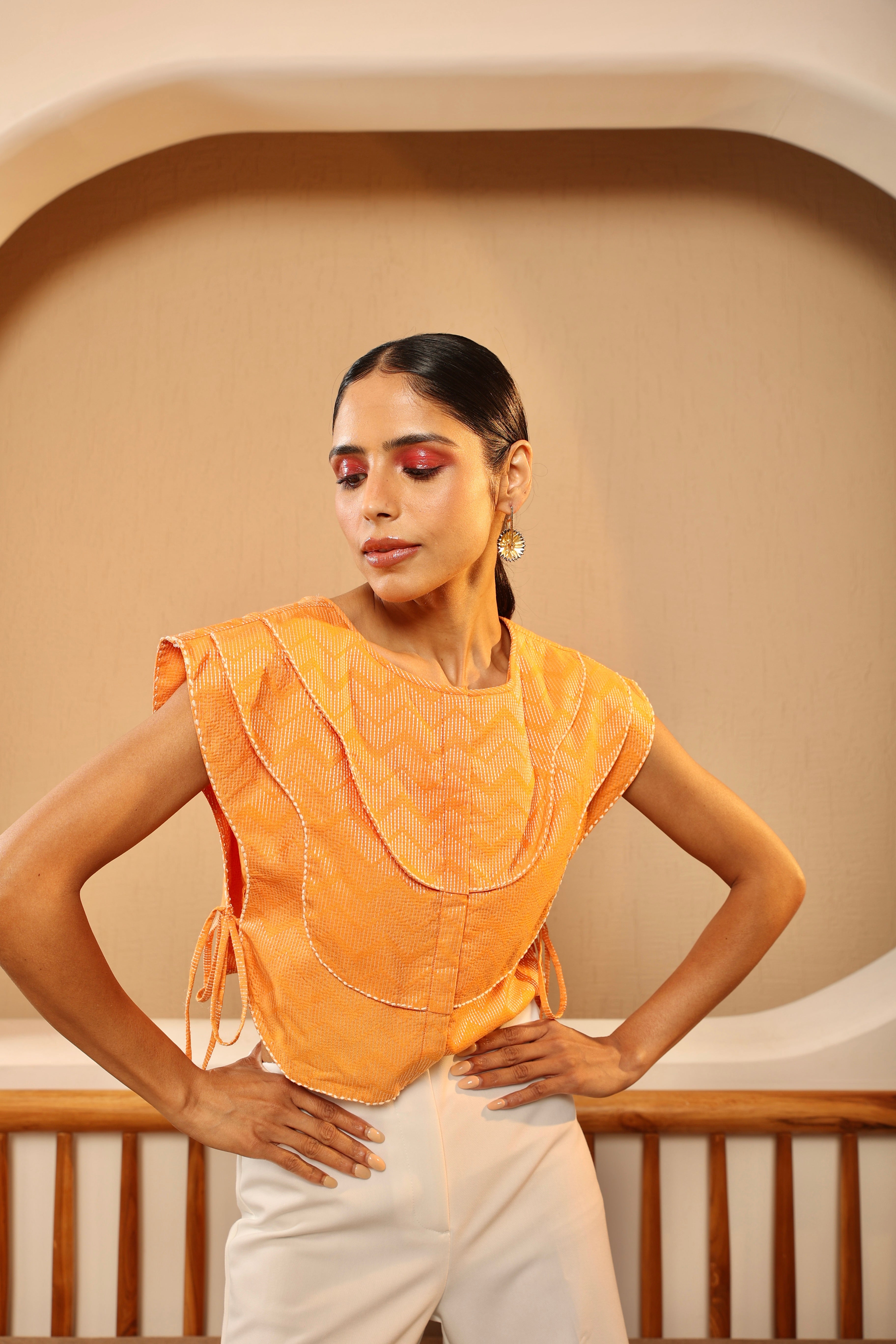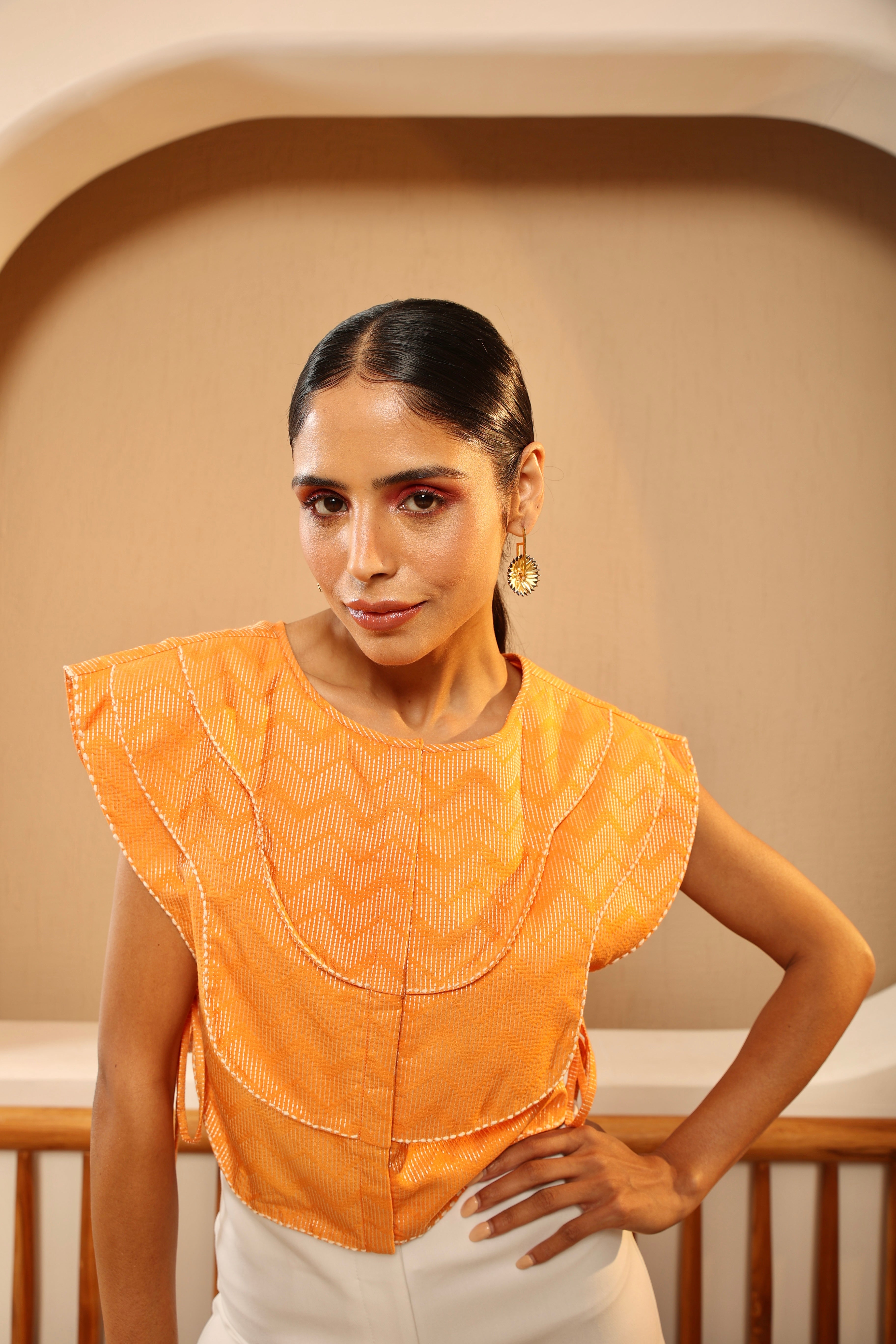 The Tangerine Paneled Jacket features a vibrant orange base with all over ivory embroidery. With three meticulously crafted panels - it offers a flattering, relaxed fit. It has unique tie details on the side and an attached soft crop top on the inside for comfortable wear. Style it as a statement piece and look effortlessly chic!