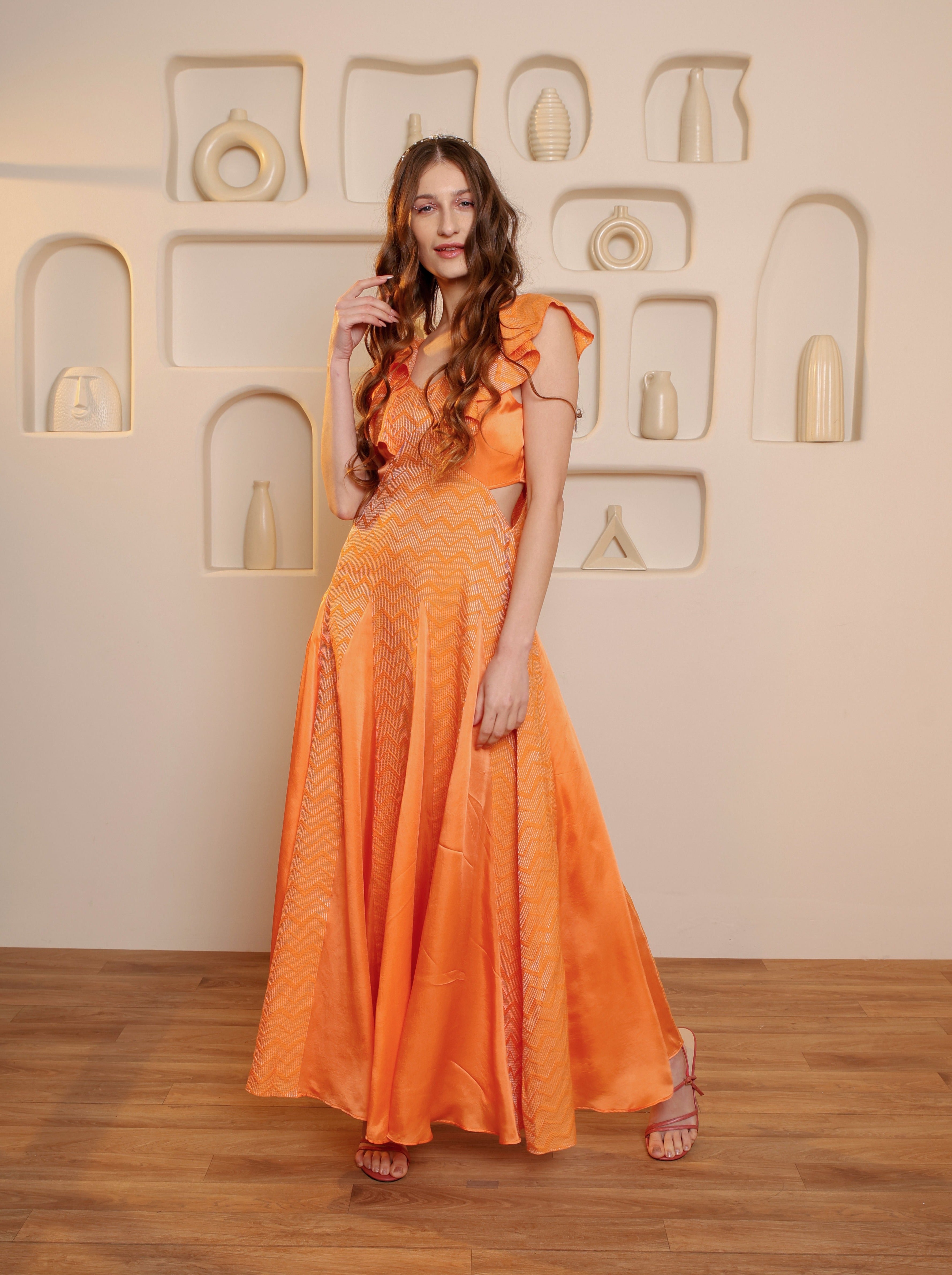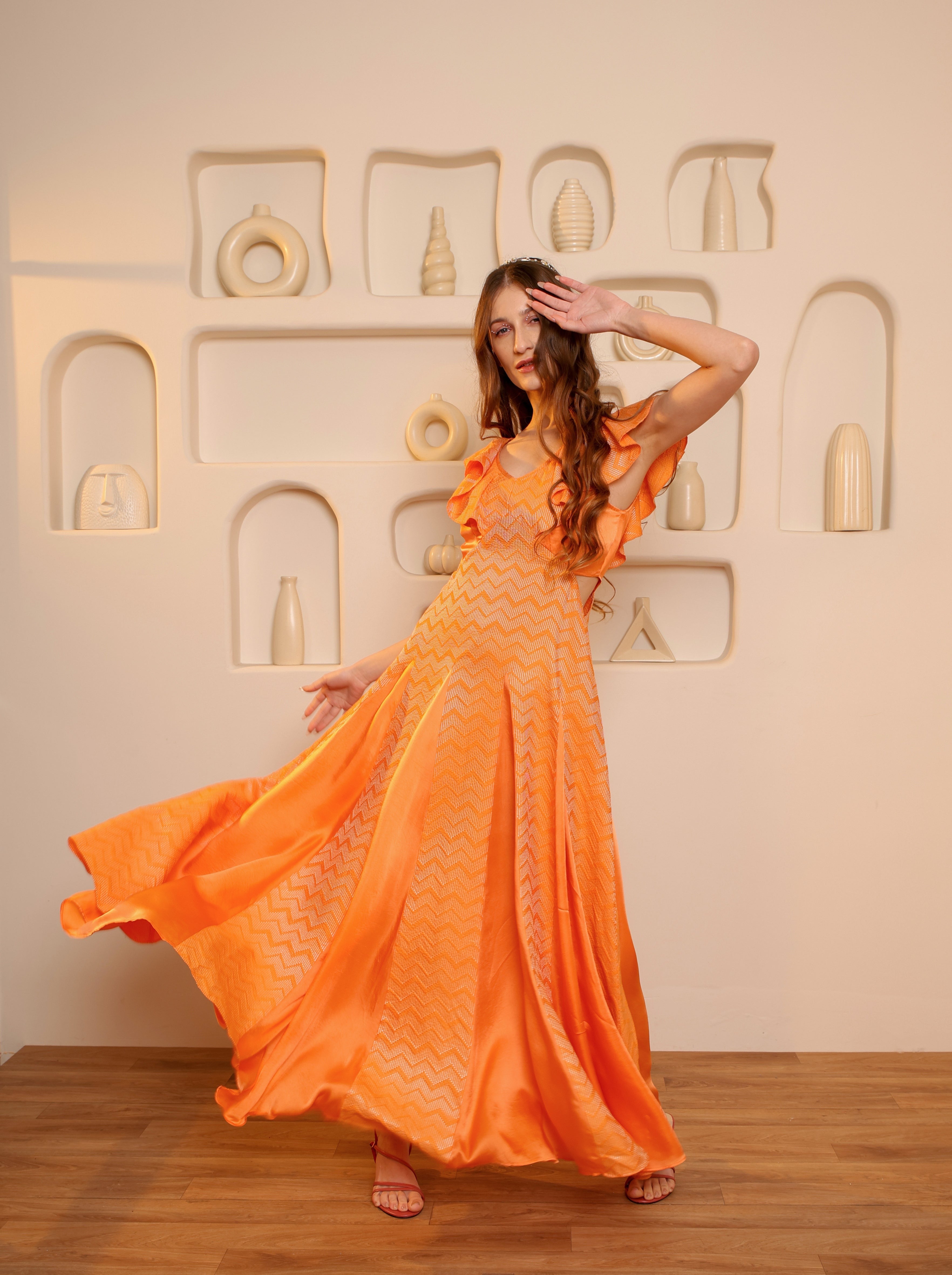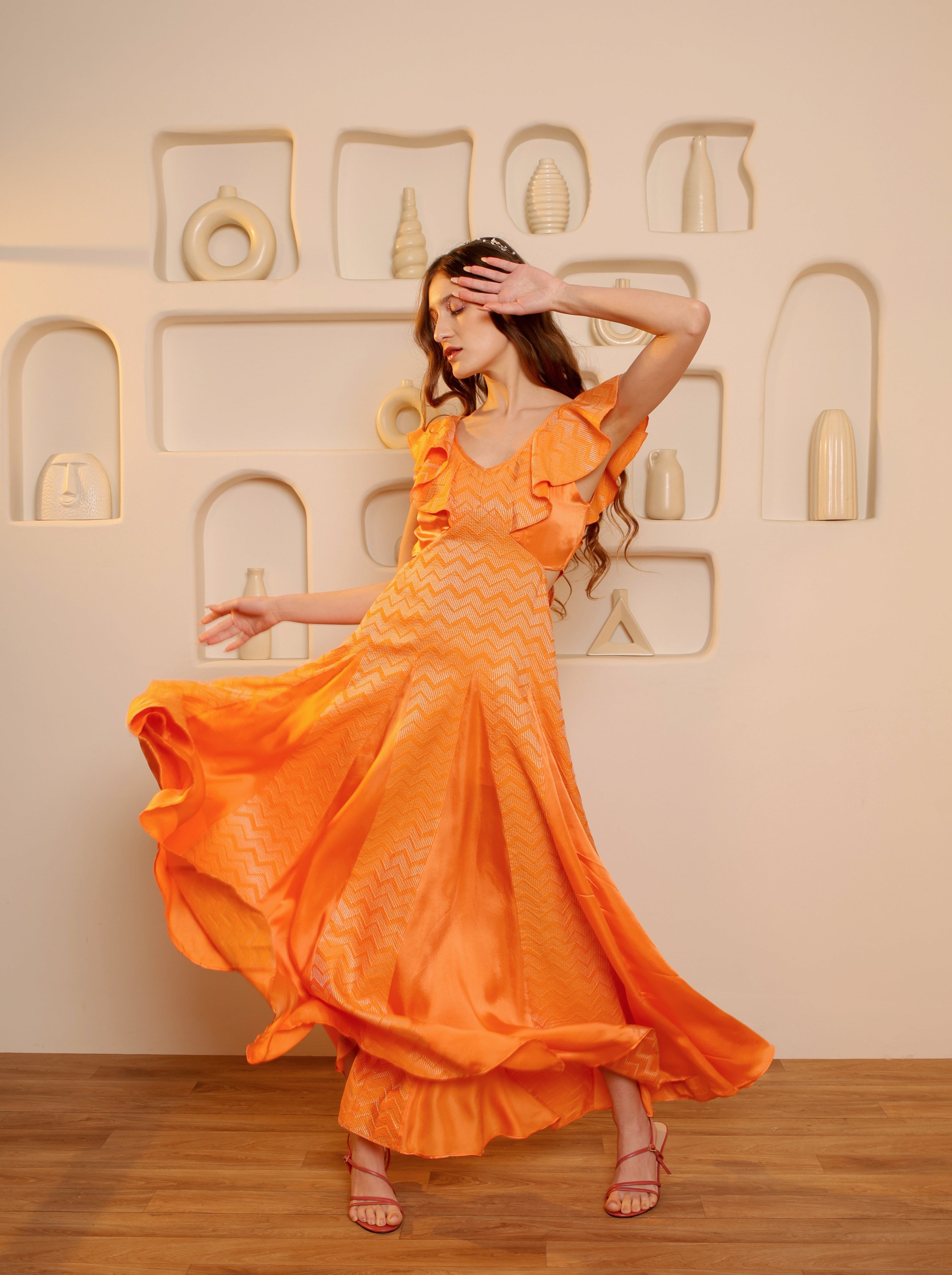 The Tangerine Ruffle Midi Dress is versatile and meant to draw eyes! It is made of a gorgeous orange and white embroidered fabric. The inserts form a gathered bottom, complimenting the ruffled neck detail. It has a back zipper.