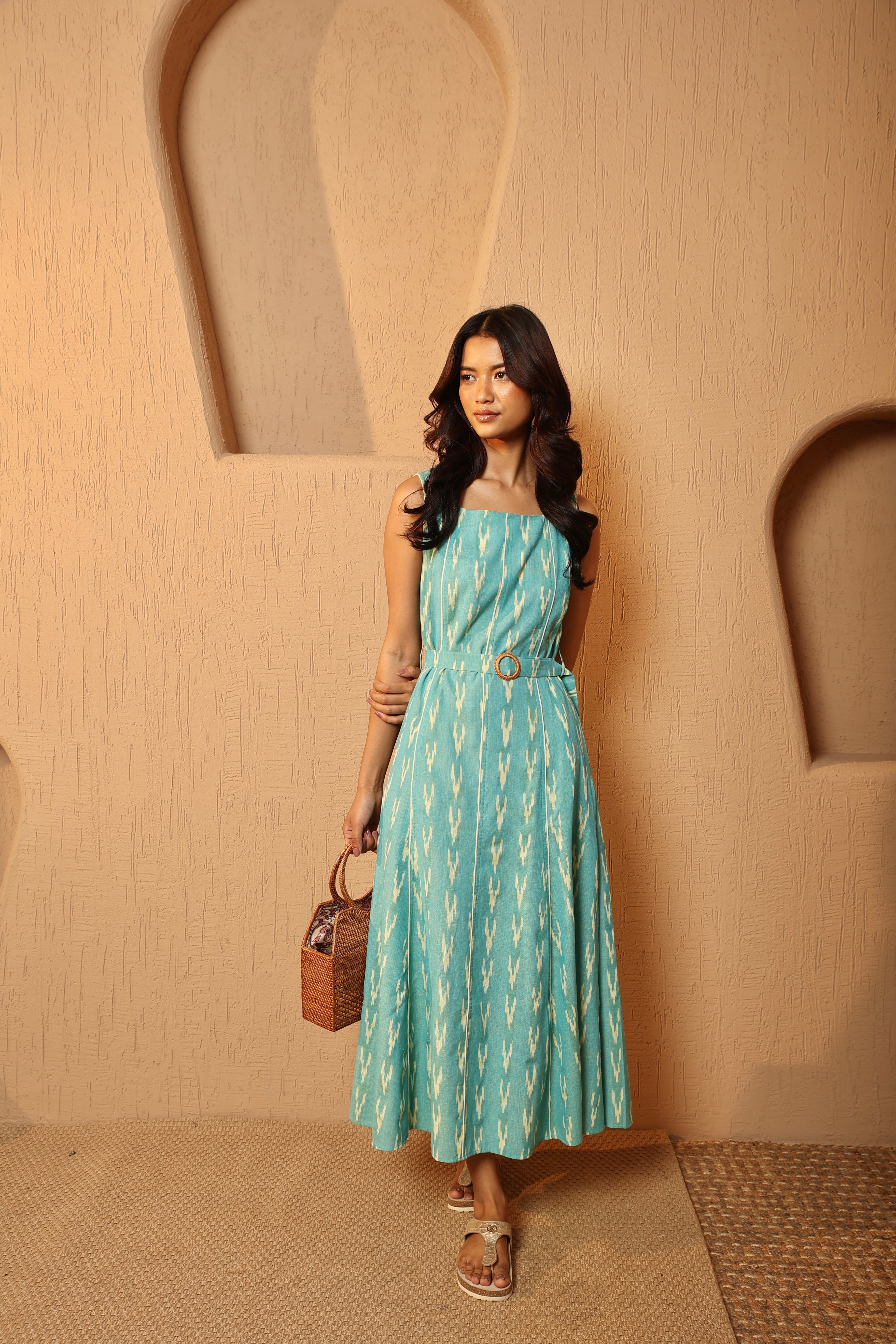 The Teal Wash Belted Midi has a teal base with a modern Ikat weave in butter yellow. The dress is sleeveless with a square neckline, and has a fit-and-flare silhouette. The dress has delicate piping details throughout the body to give it the most flattering fit. It also includes a matching belt with a circular buckle to accentuate the waist. It features a back zipper.