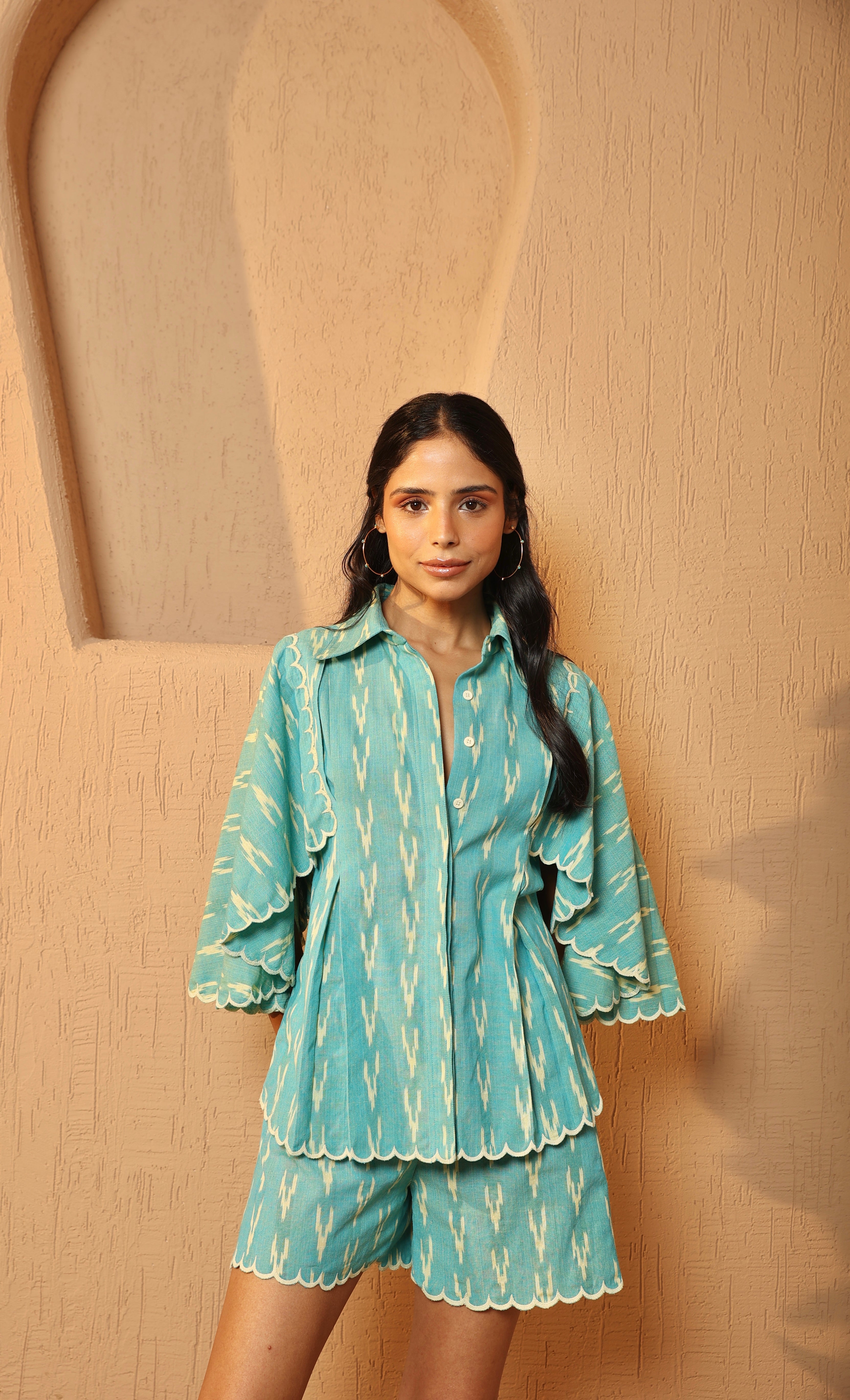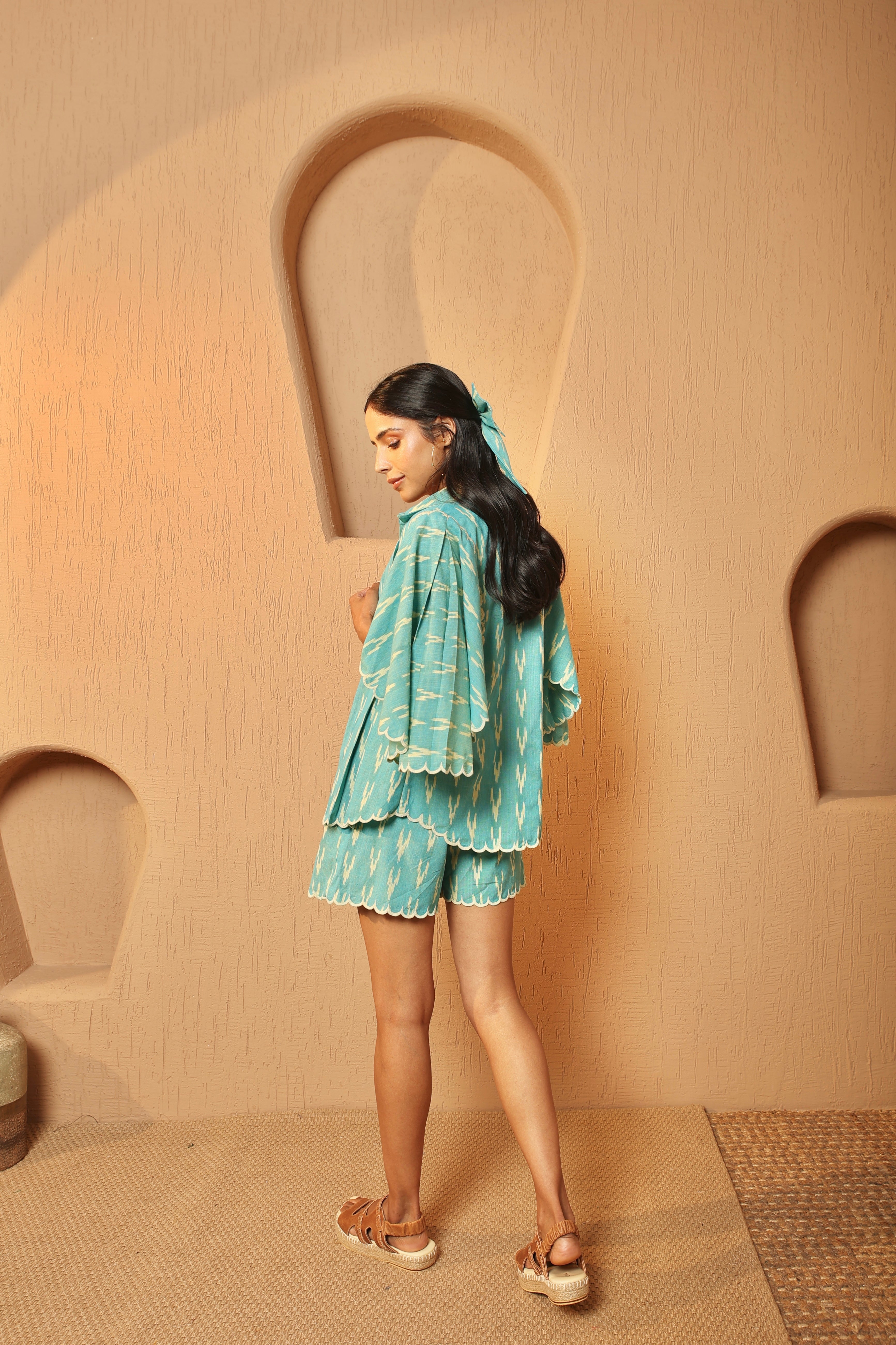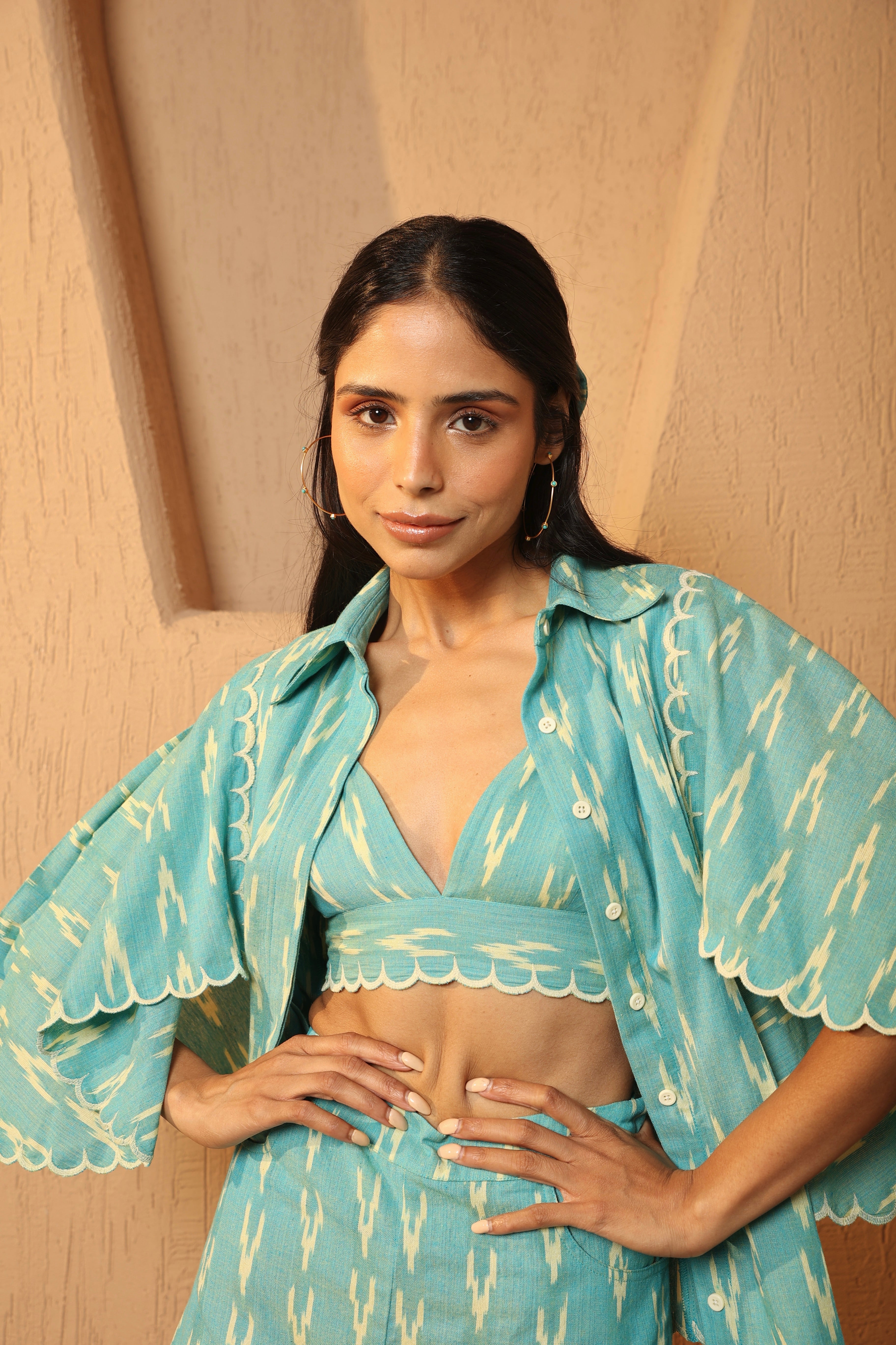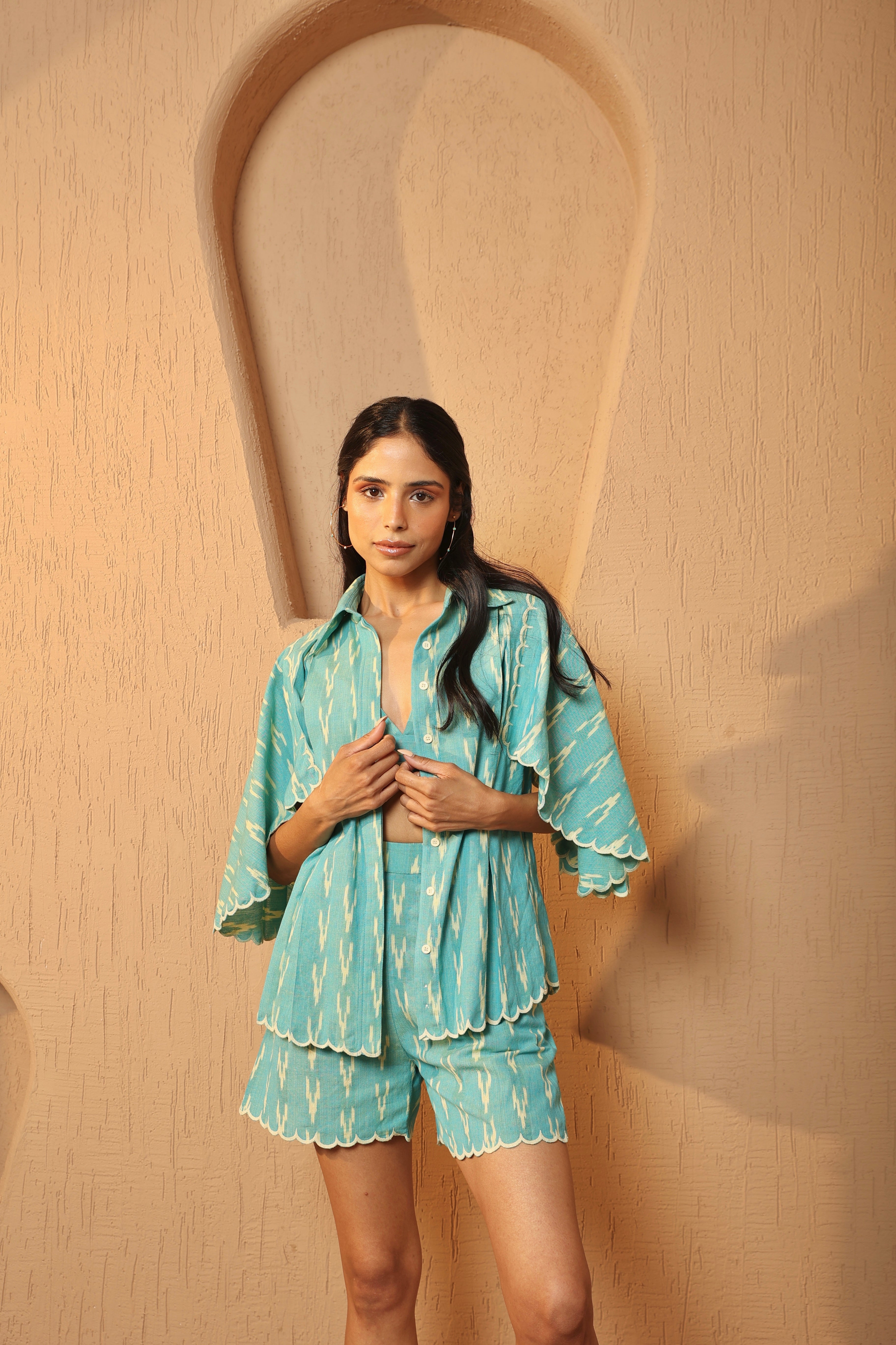 The Teal Wash Belted Set has a teal base with a modern Ikat weave in butter yellow. It includes an Ikat shirt with a matching bralette and shorts. The Shirt has a relaxed fit with unique oversized sleeves. The sleeves and hem feature embroidered scallop detailing. It has a button down front. The bralette is fitted with a smocked back, adjustable straps and a scalloped, hand embroidered hem. The shorts are high waisted with a waistband, side zipper and buckle closure. It also features a scalloped, hand embroidered hem. The set is easy, breezy and vibrant. Perfect for a beach vacation, and easy to style as separates to create different fun looks! Buy it as a set or as separates.