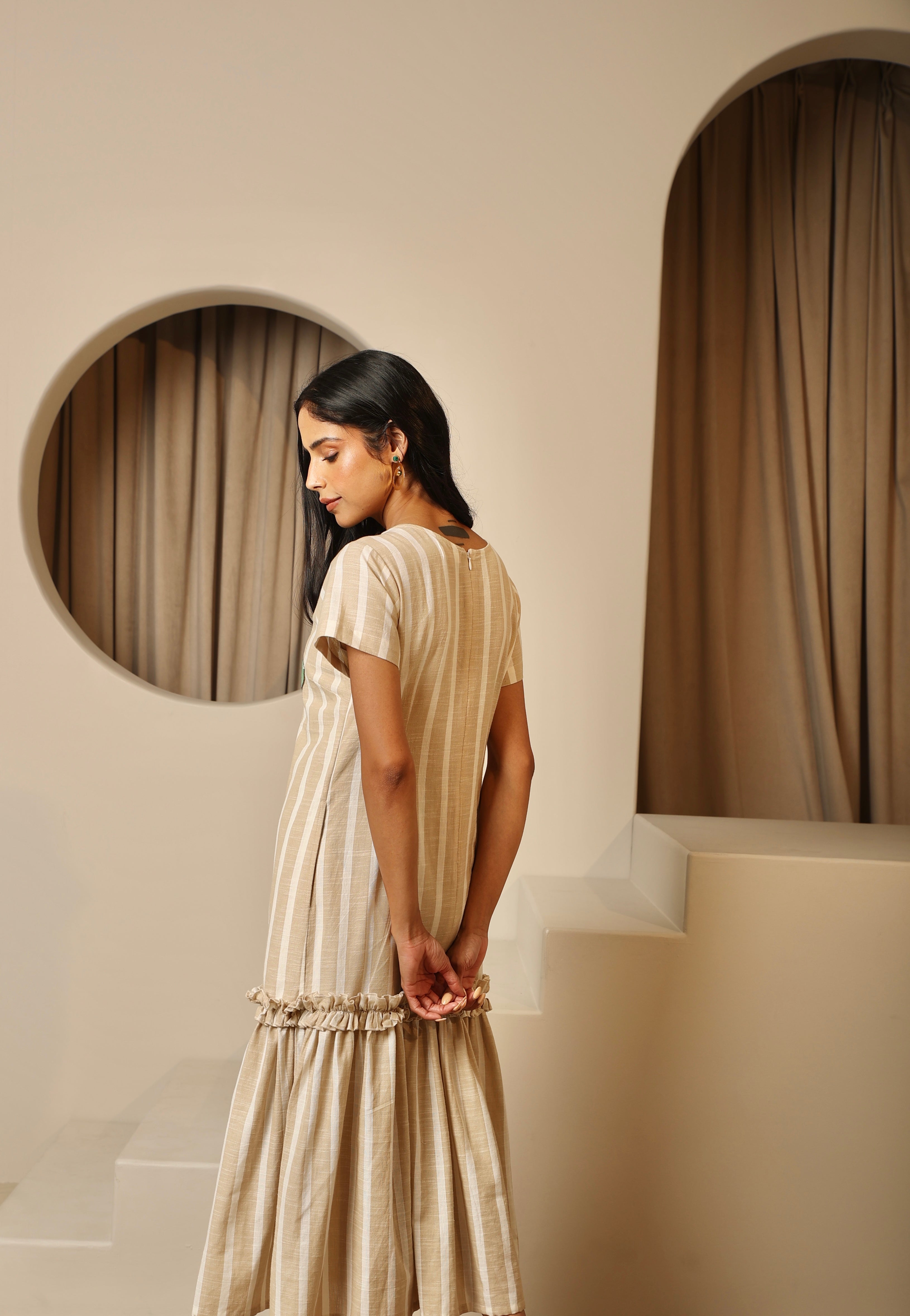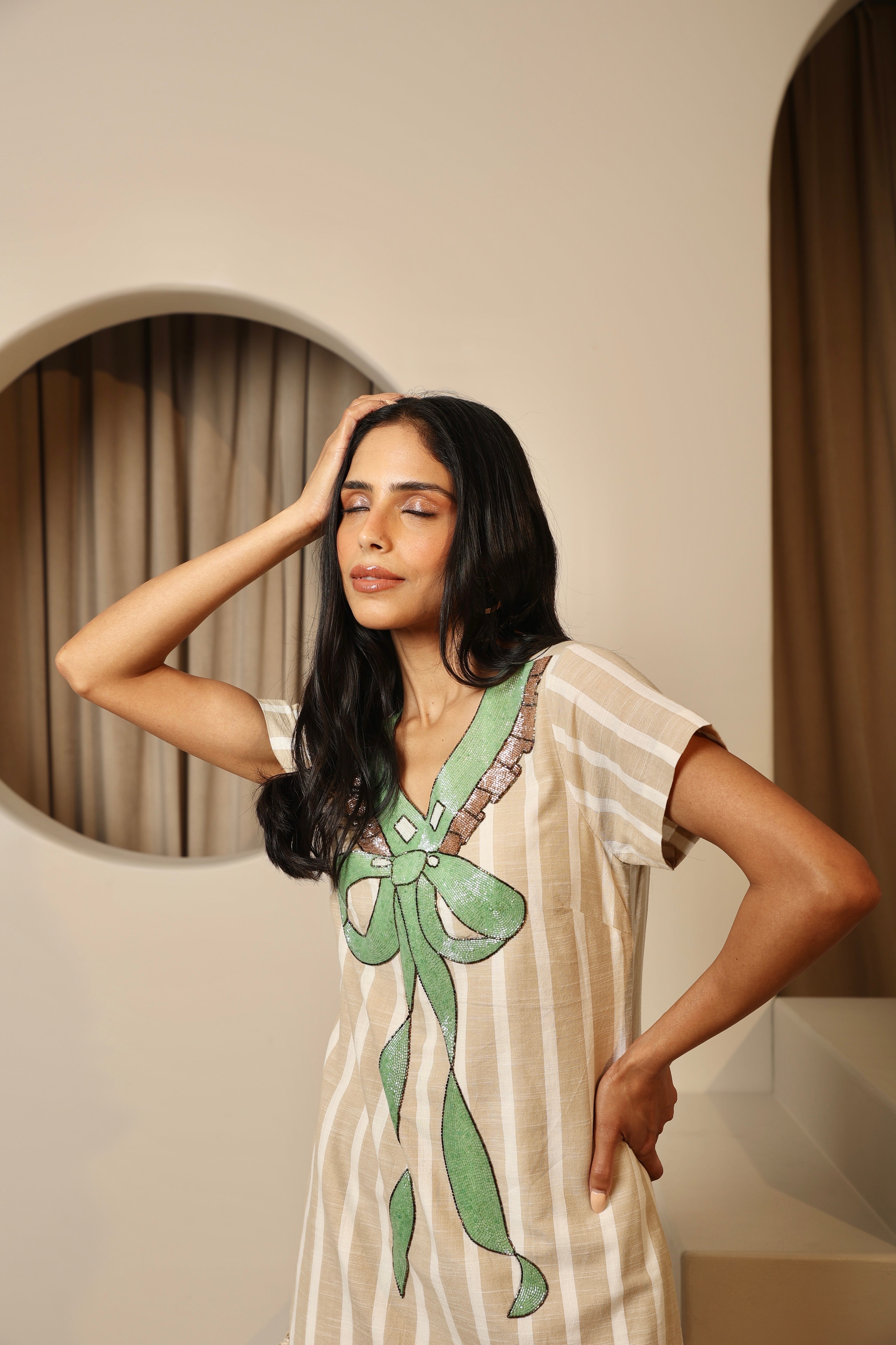 The Tuscan Striped Bow Midi has an ecru and ivory striped pattern with a large meticulously beaded bow on the front. It features a V-neckline, short sleeves and a ruffled hem. The dress is midi-length with a relaxed fit. The fabric is light and perfect for summer wear. It features a back zipper. Easy to dress up or dress down - get yours now!
