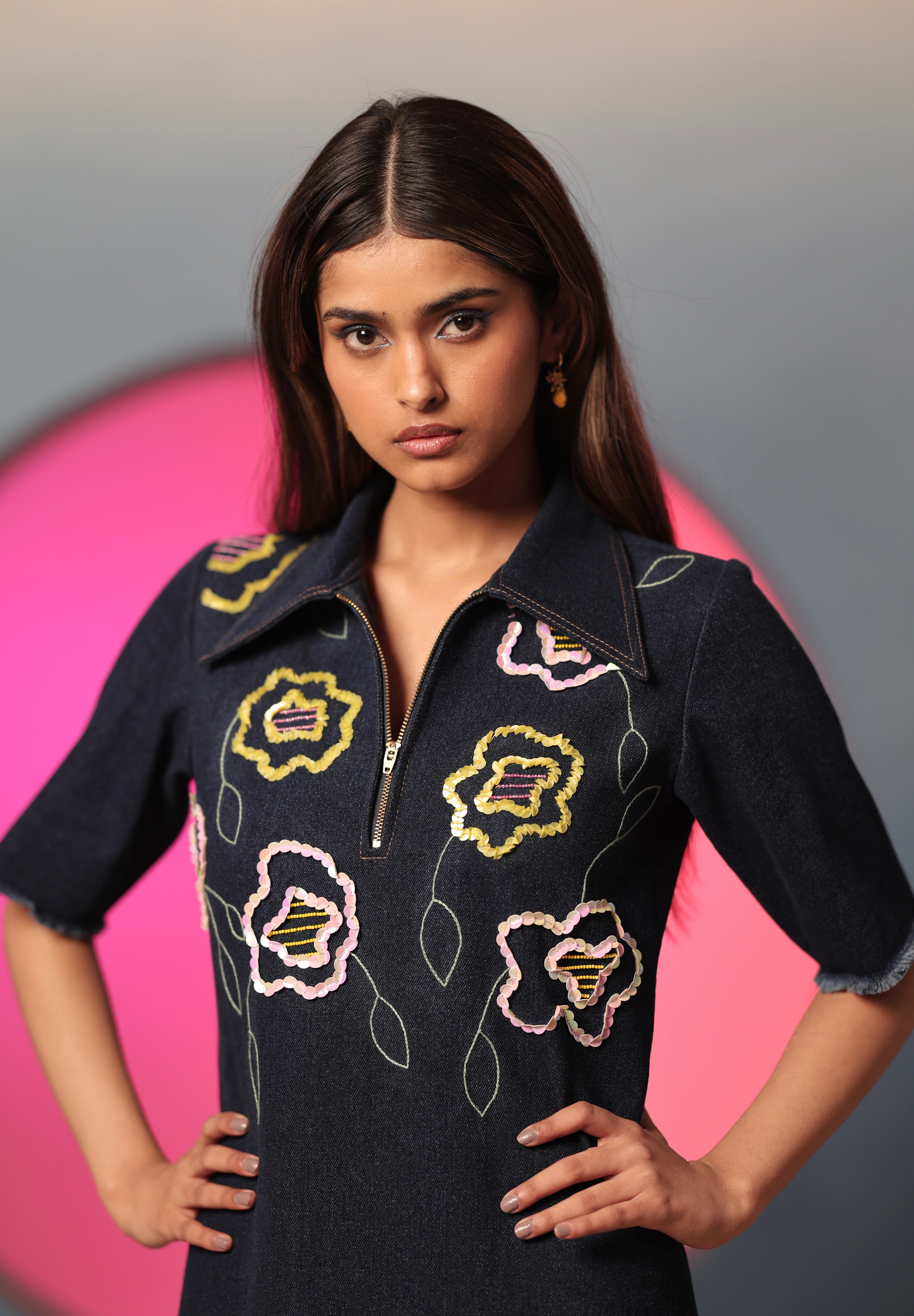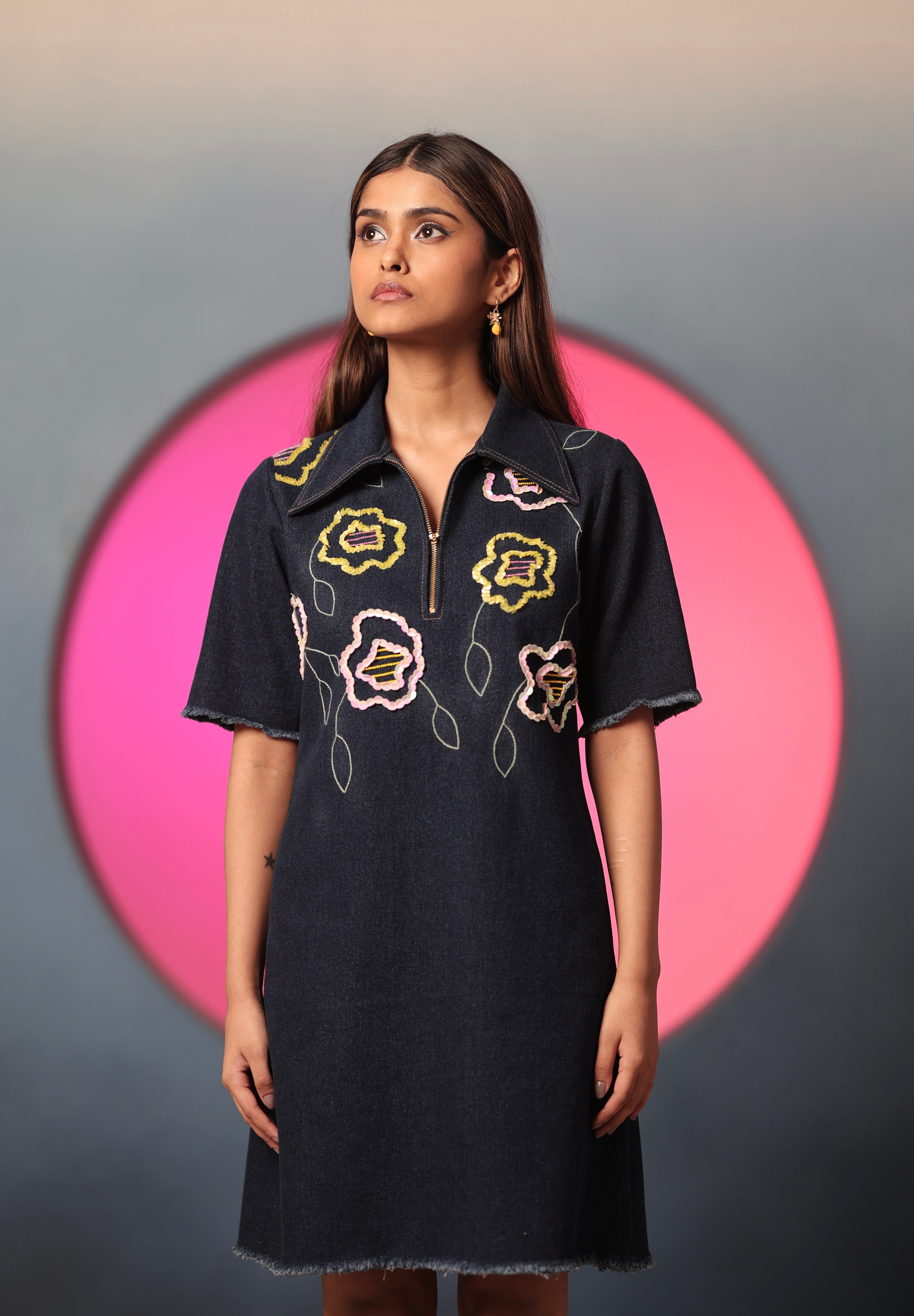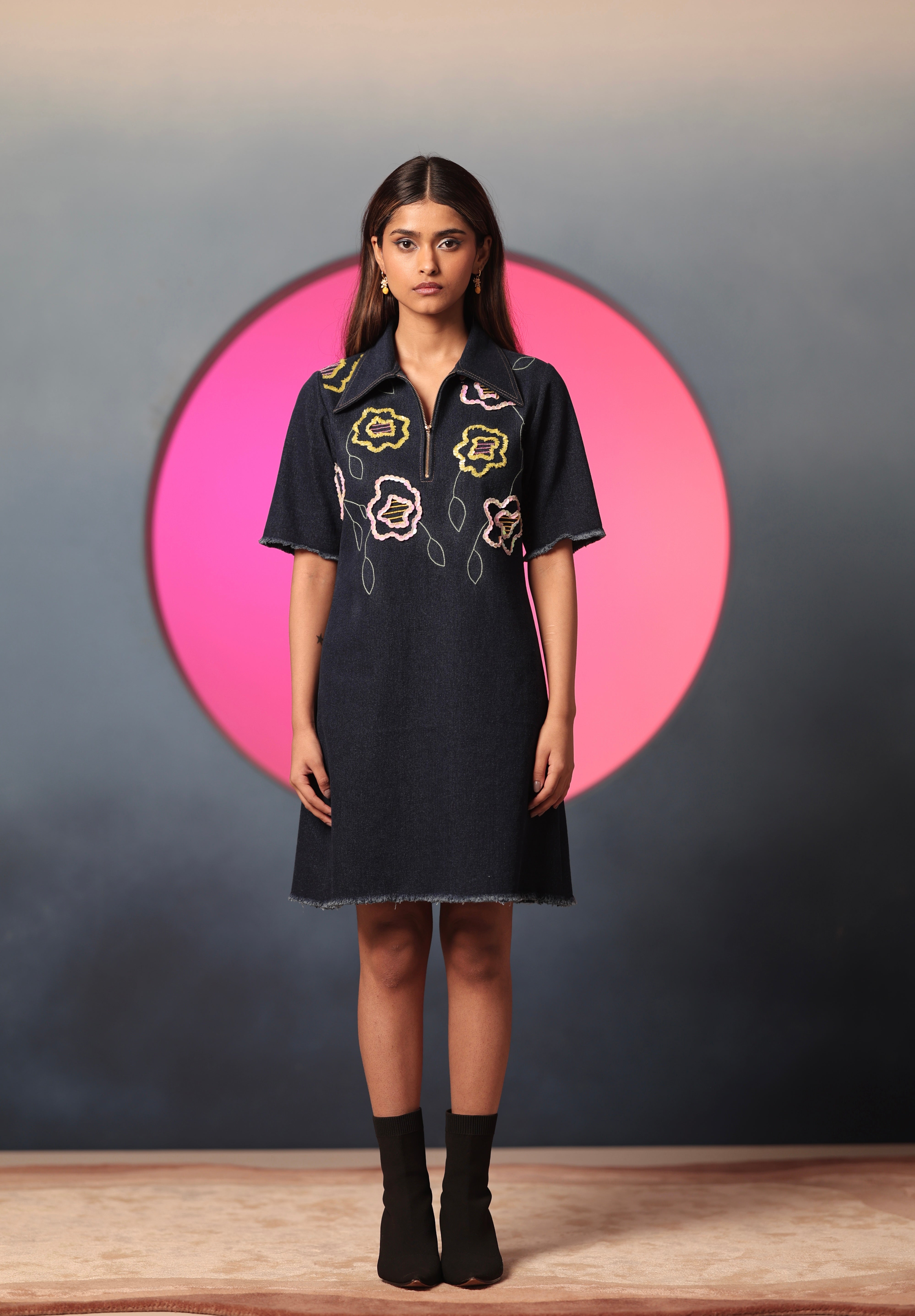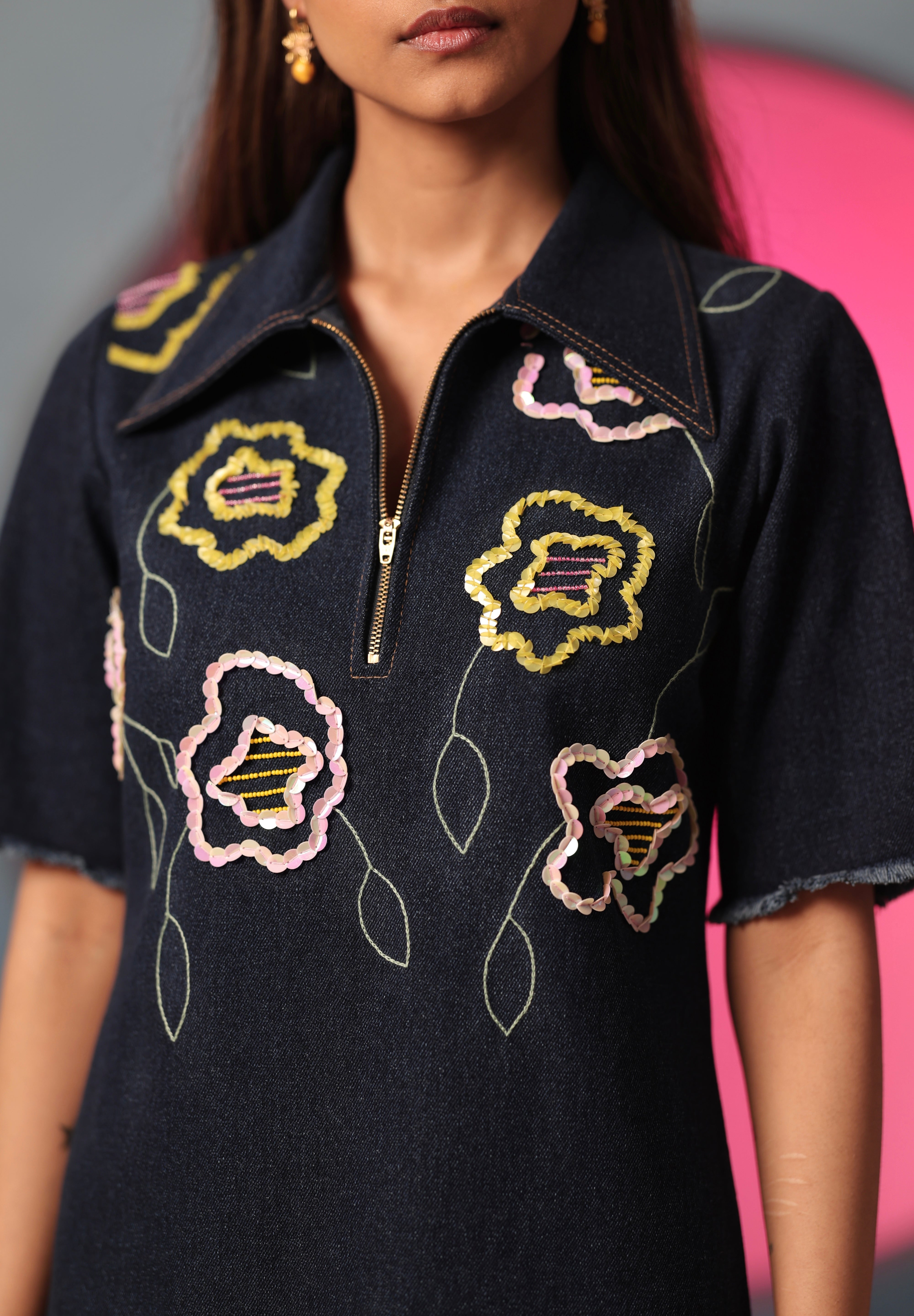 The dark denim meets embroidered pastel florals in this short-sleeved dress, creating a striking blend of rugged and soft. The subtle floral embroidery recalls wildflowers sprouting unexpectedly in the heart of a garden. The dress has a straight silhouette, with a front zipper, contrast stitching and fringed up hem. Look effortlessly fashionable in this modern ensemble embracing vintage romance.