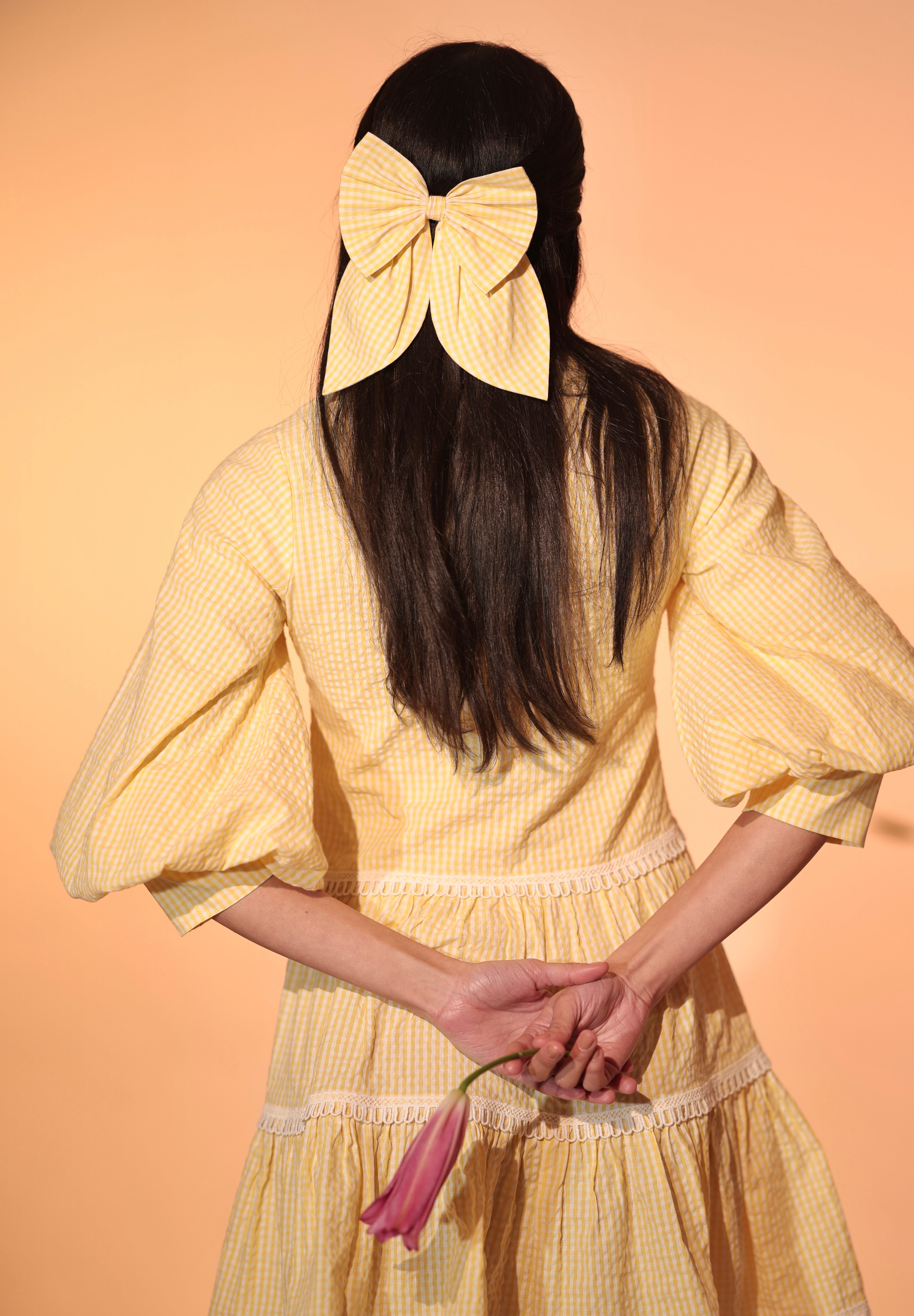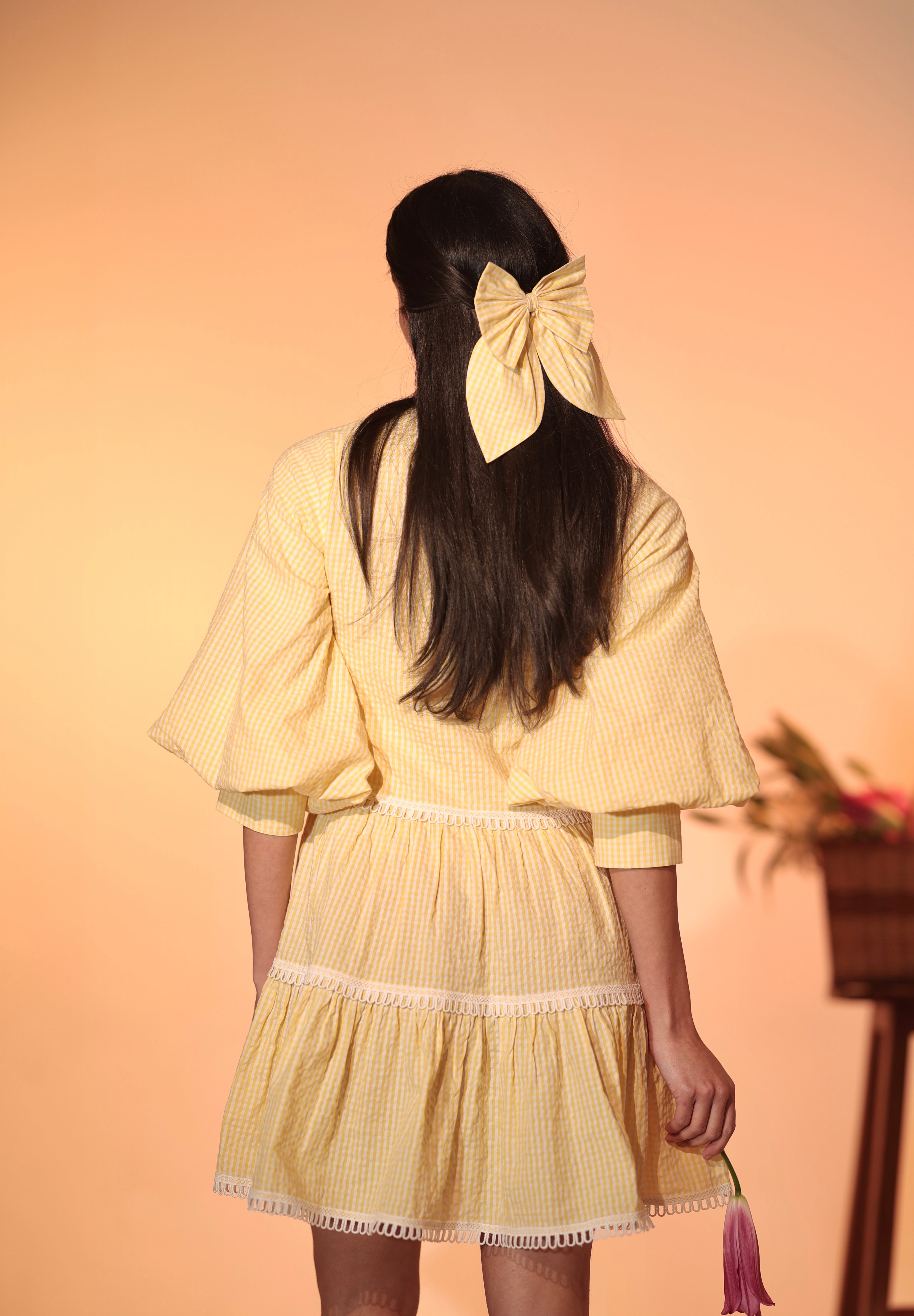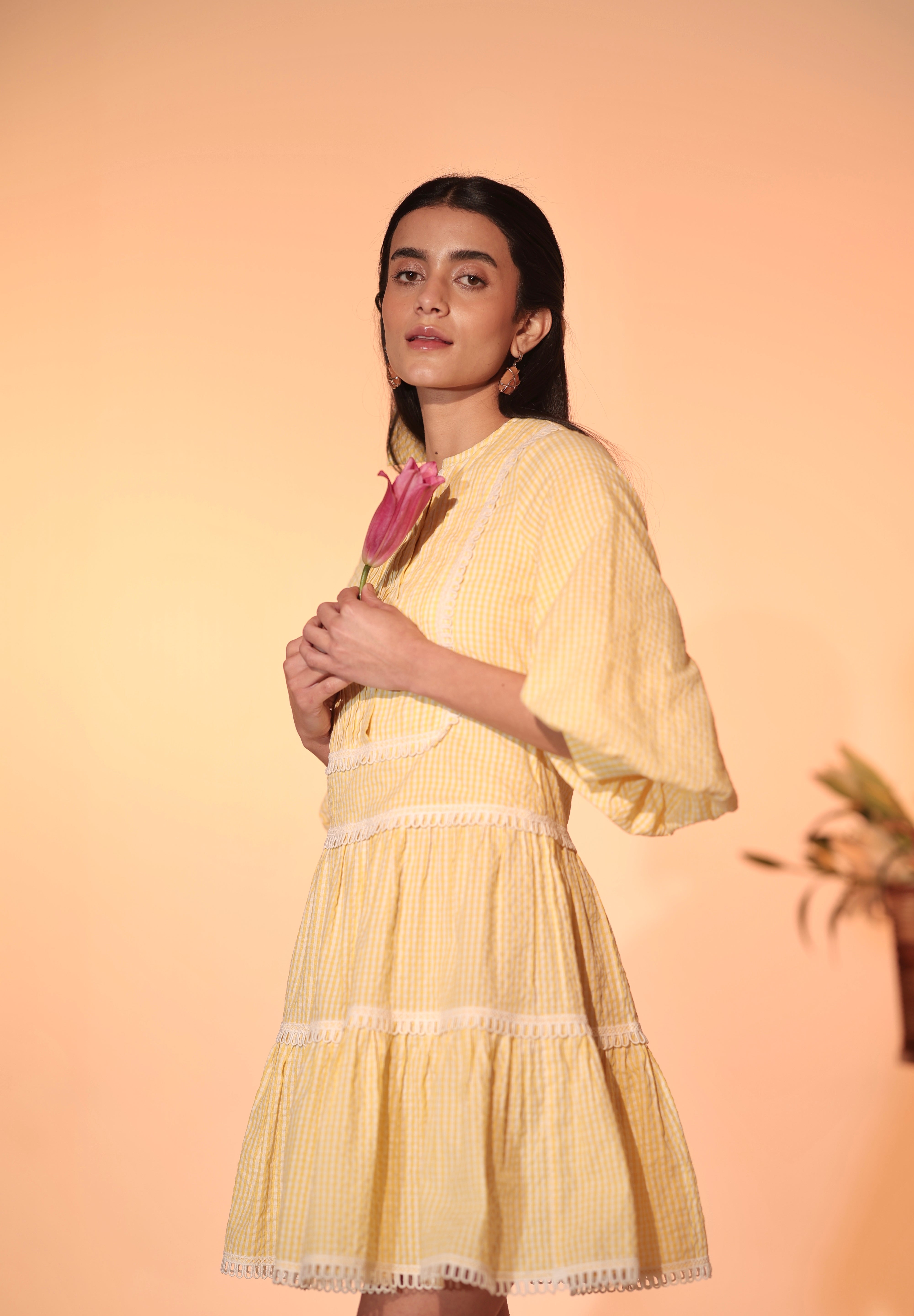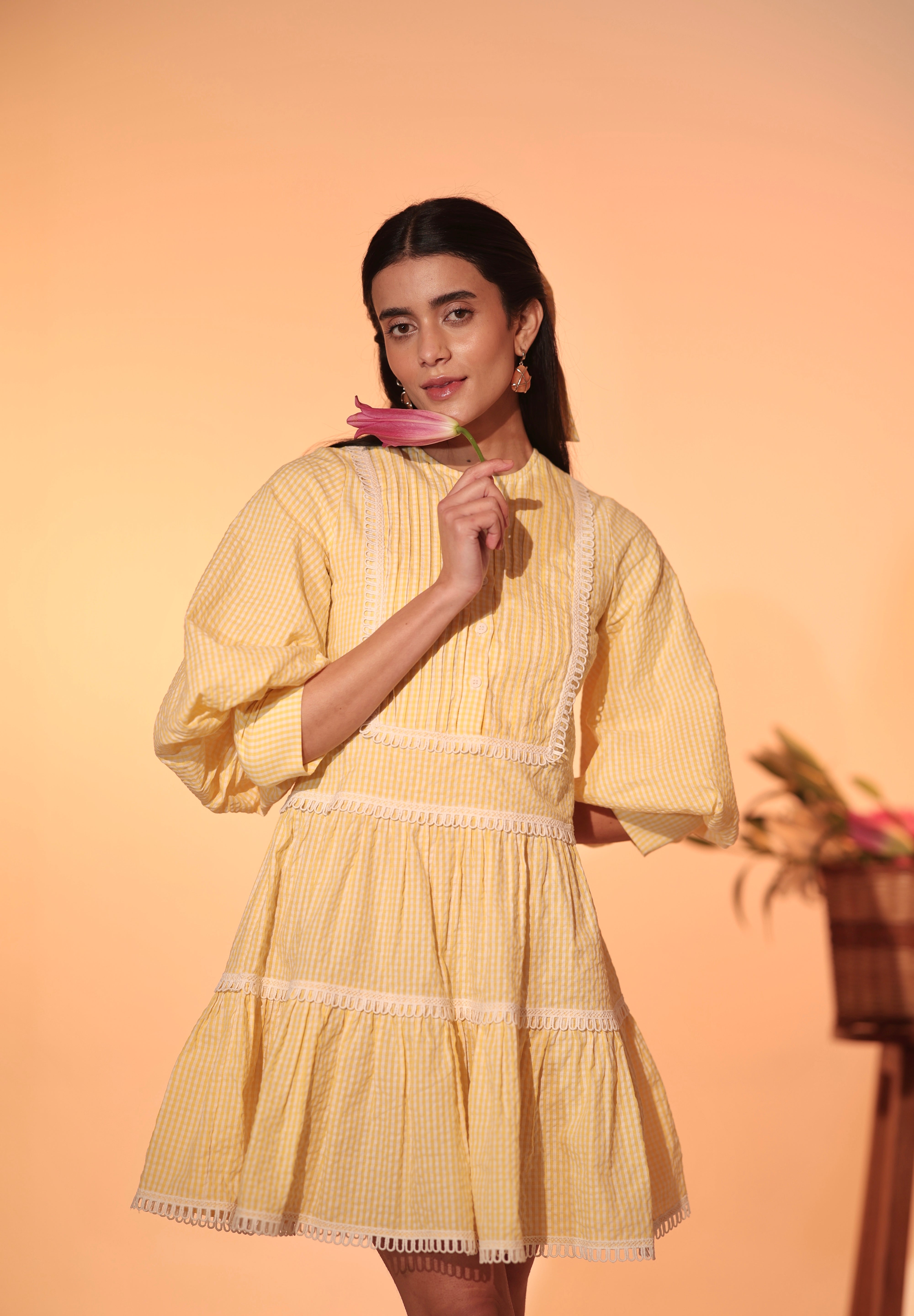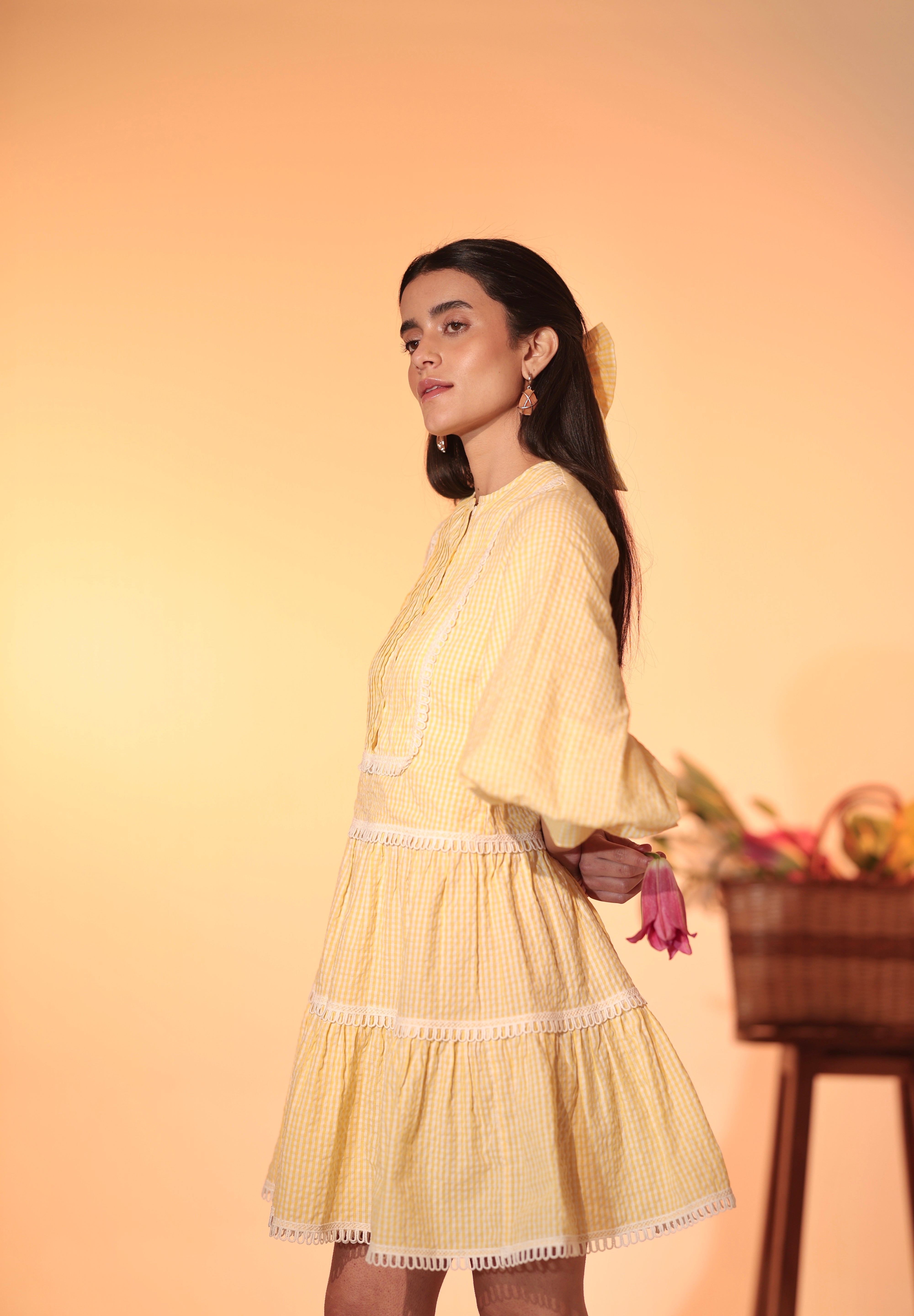 The soft gingham in a buttery yellow hue makes this dress feel like golden sunlight. The tiered skirt and puffed sleeves add a playful touch, while the delicate lace trims whisper vintage charm. The front has pintucked details and buttons. The Yellow Gingham Sunshine Mini is perfect for daytime adventures and warm evening strolls!